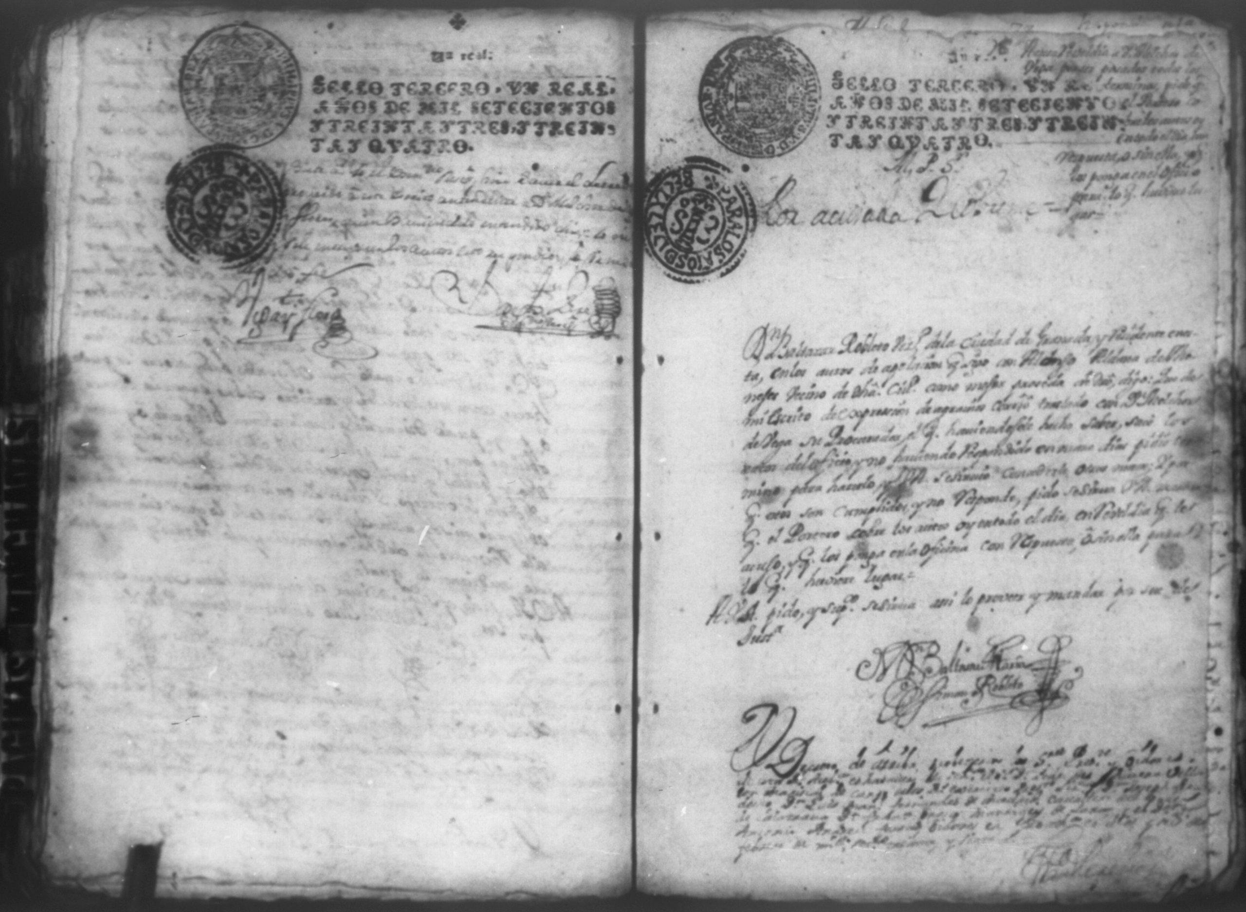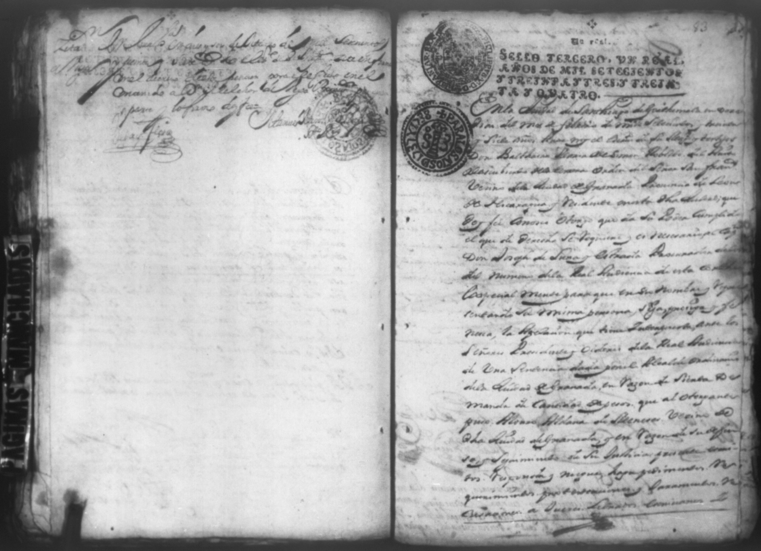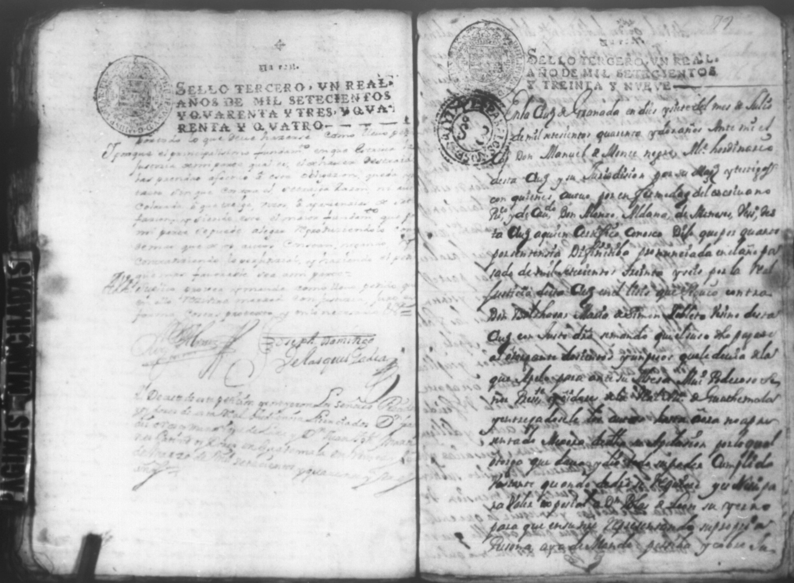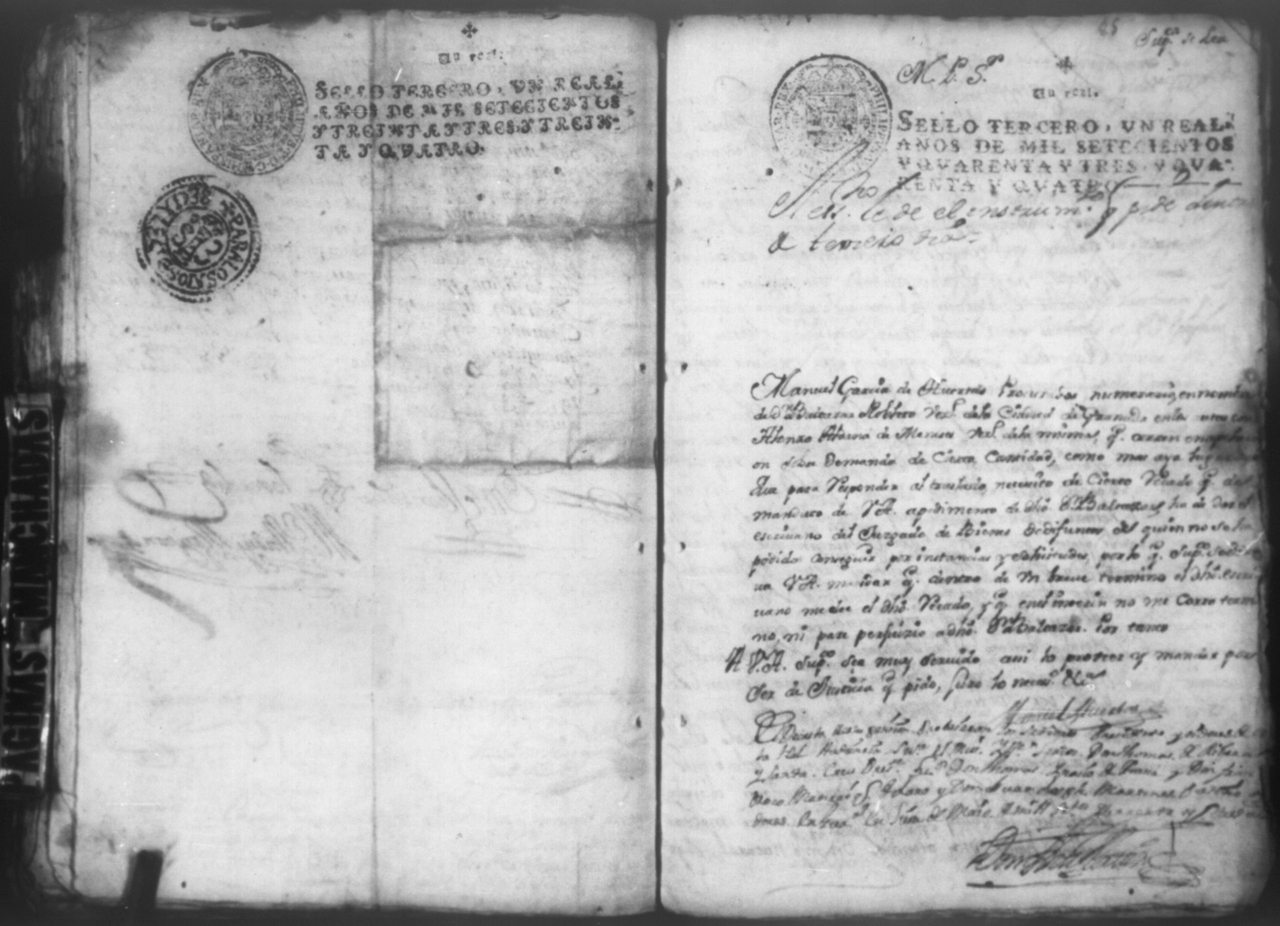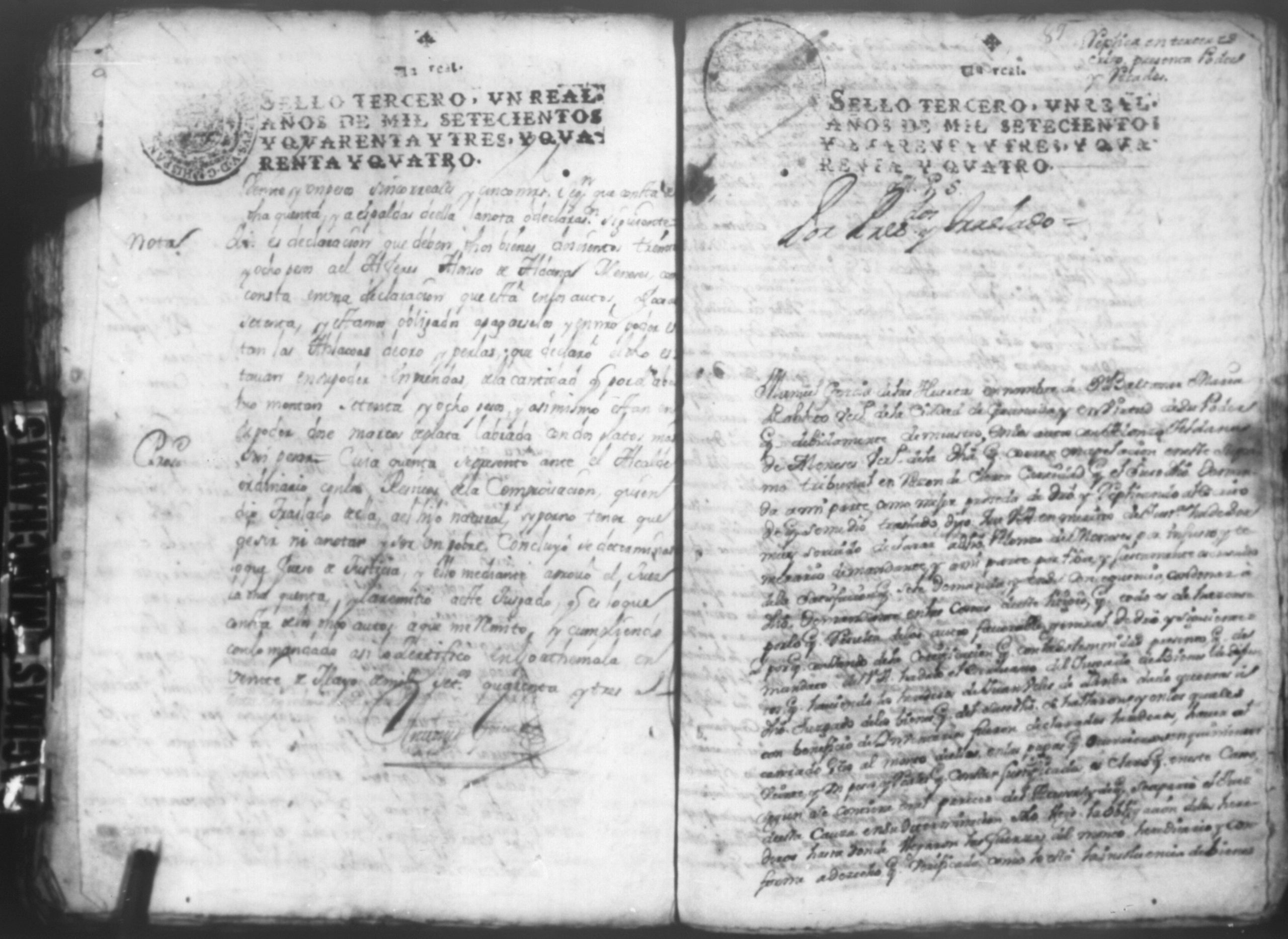 Temática: Granada año de 1743. El Alferez Alonzo Aldana de Meneses pide y demanda a Don Baltazar Maria de Simon Robleto el pago de docientos quince pesos, como Albacea del Licenciado Don Simon Baesa Guerra de la Vega, Clerigo Presbitero que fue de este obispado a el Capitan