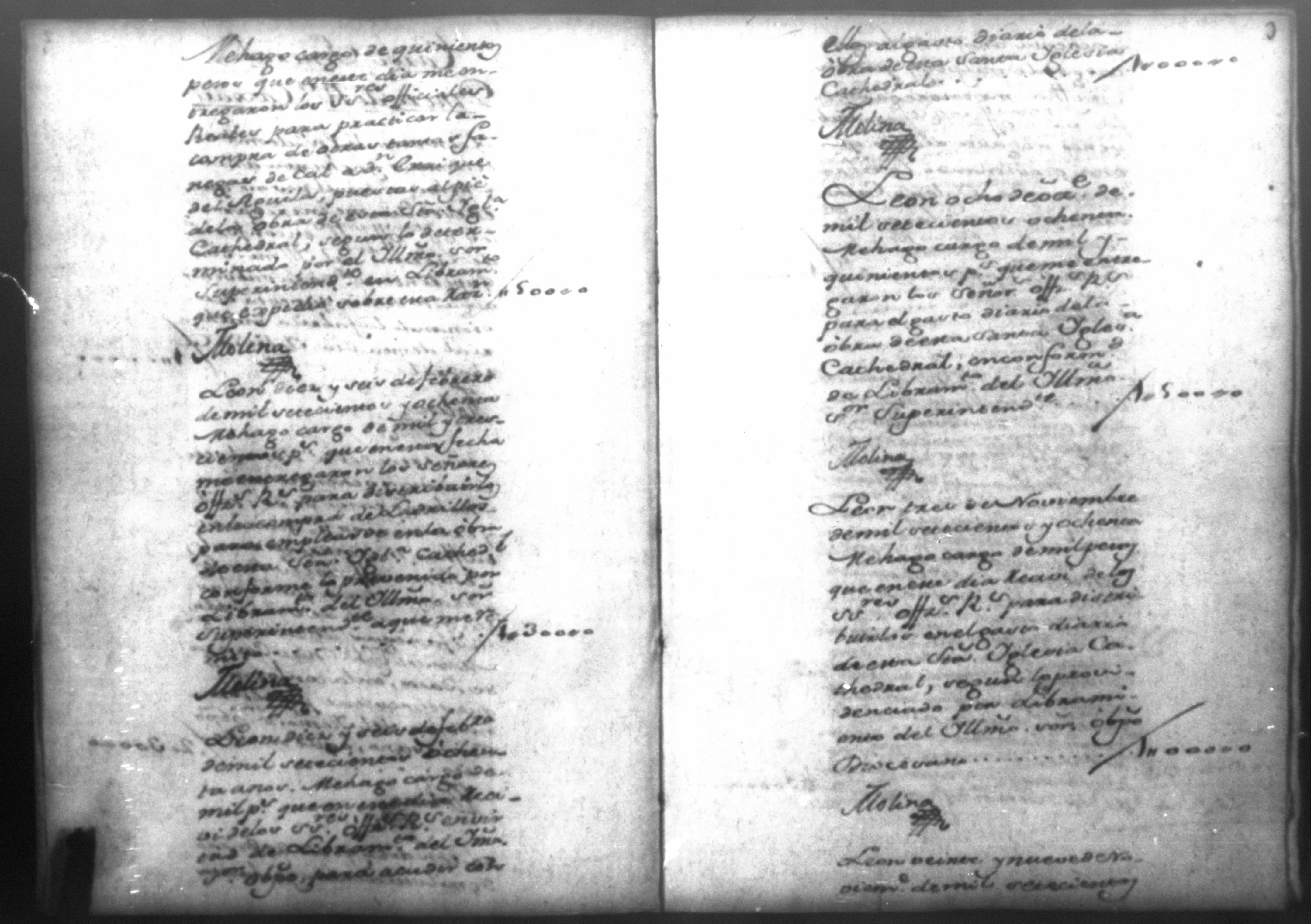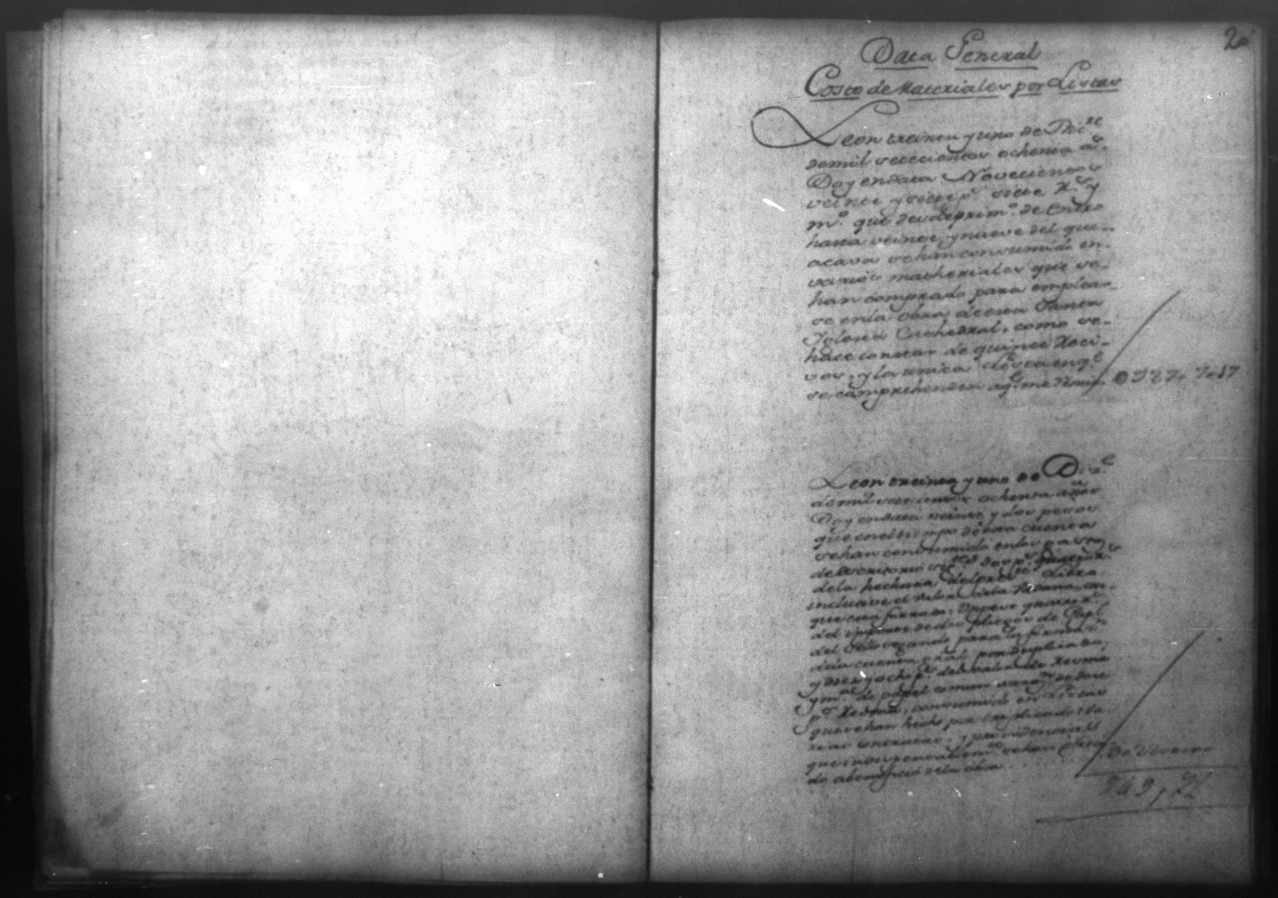 Temática: Libro numerado con Cuarenta y cinco foxas para el asiento de cargo, y data perteneciente a la economia de la Fabrica matherial de esta Santa Yglesia Cathedral que administro cuyas partidas iran cierta y verdaderas; lo que Juro a Dios Nuestro señor y una señal de su Santa Cruz y lo firmo en esta ciudad de Leon en dos de enero de mil setecientos y ochenta años. Manuel Joseph de [Molina]