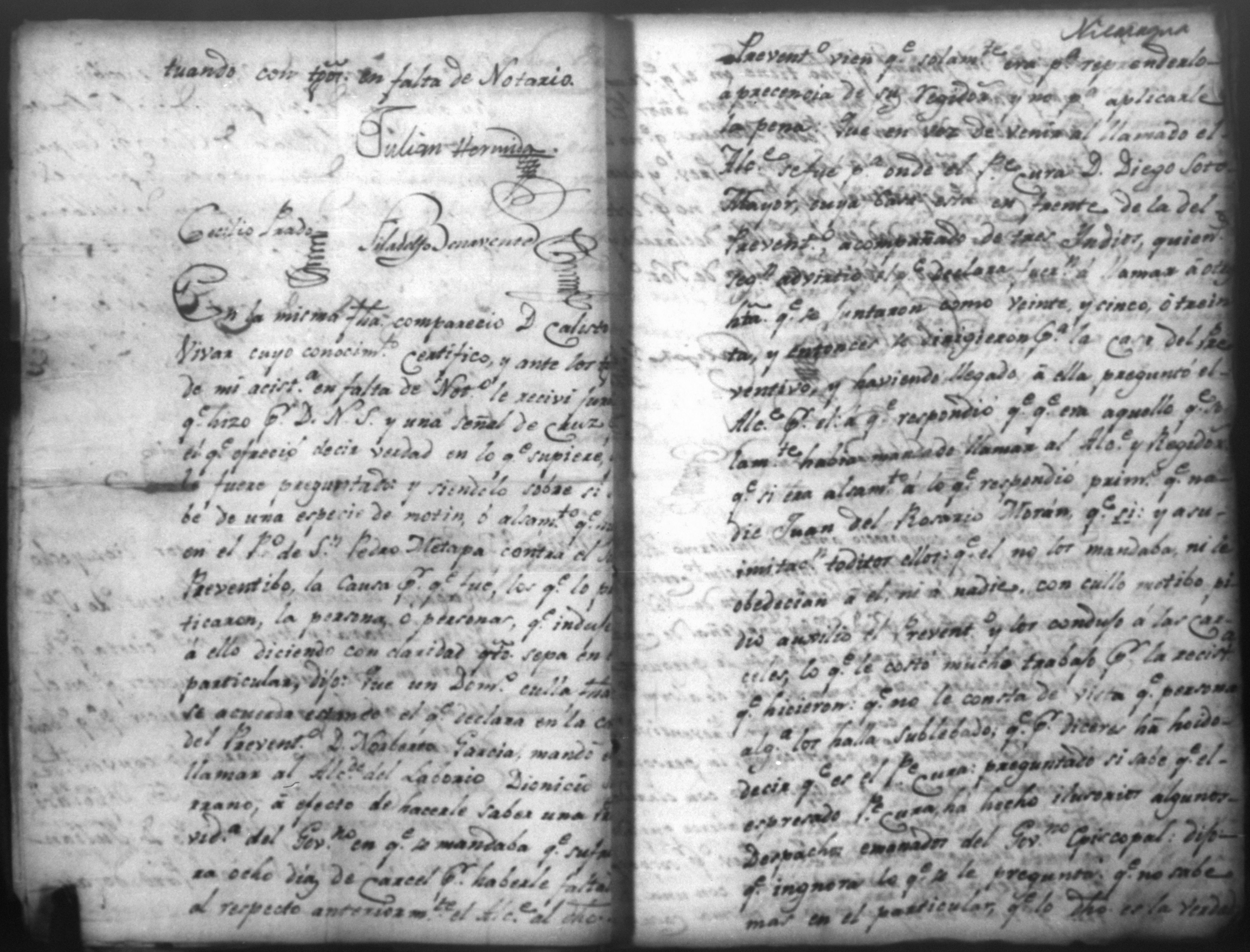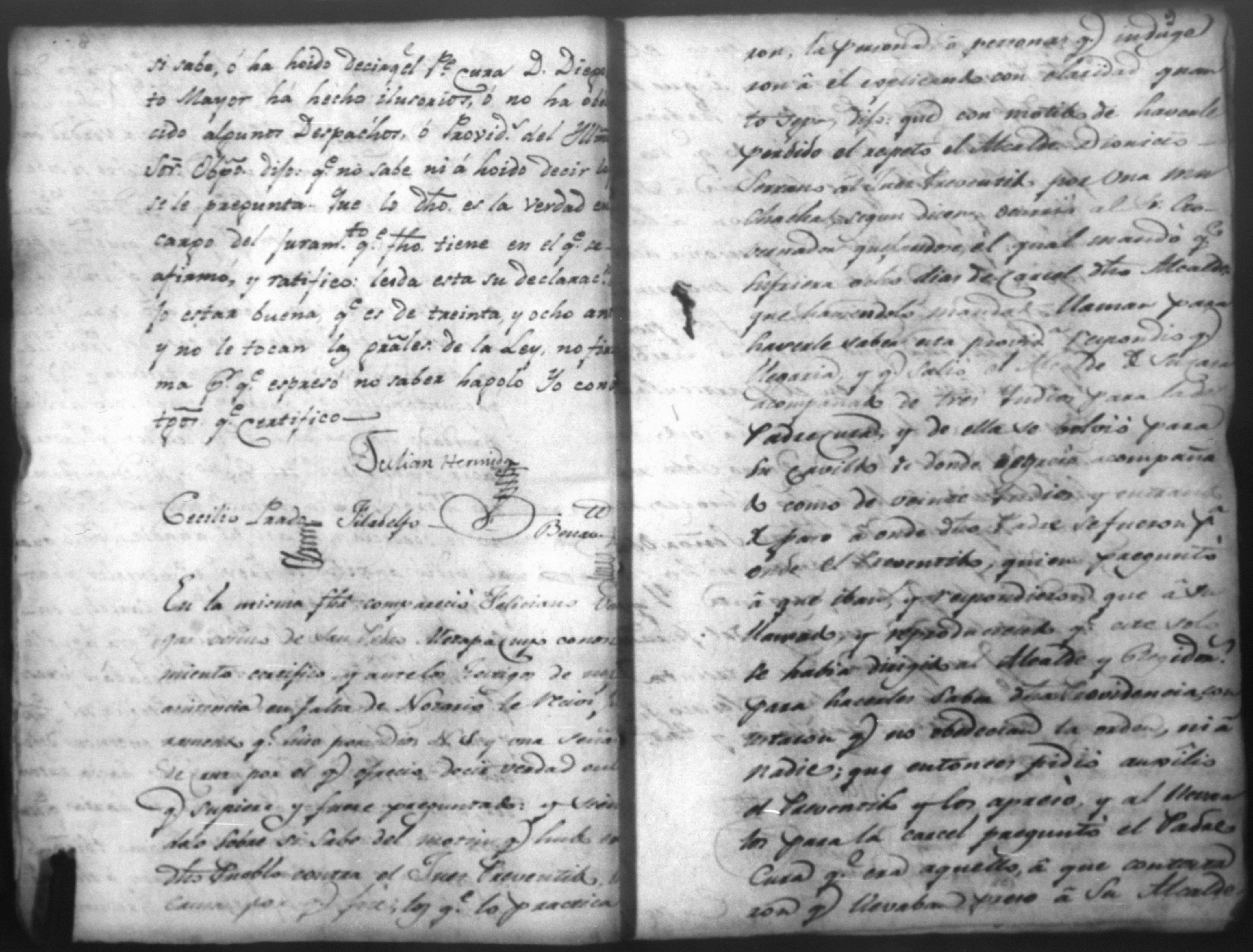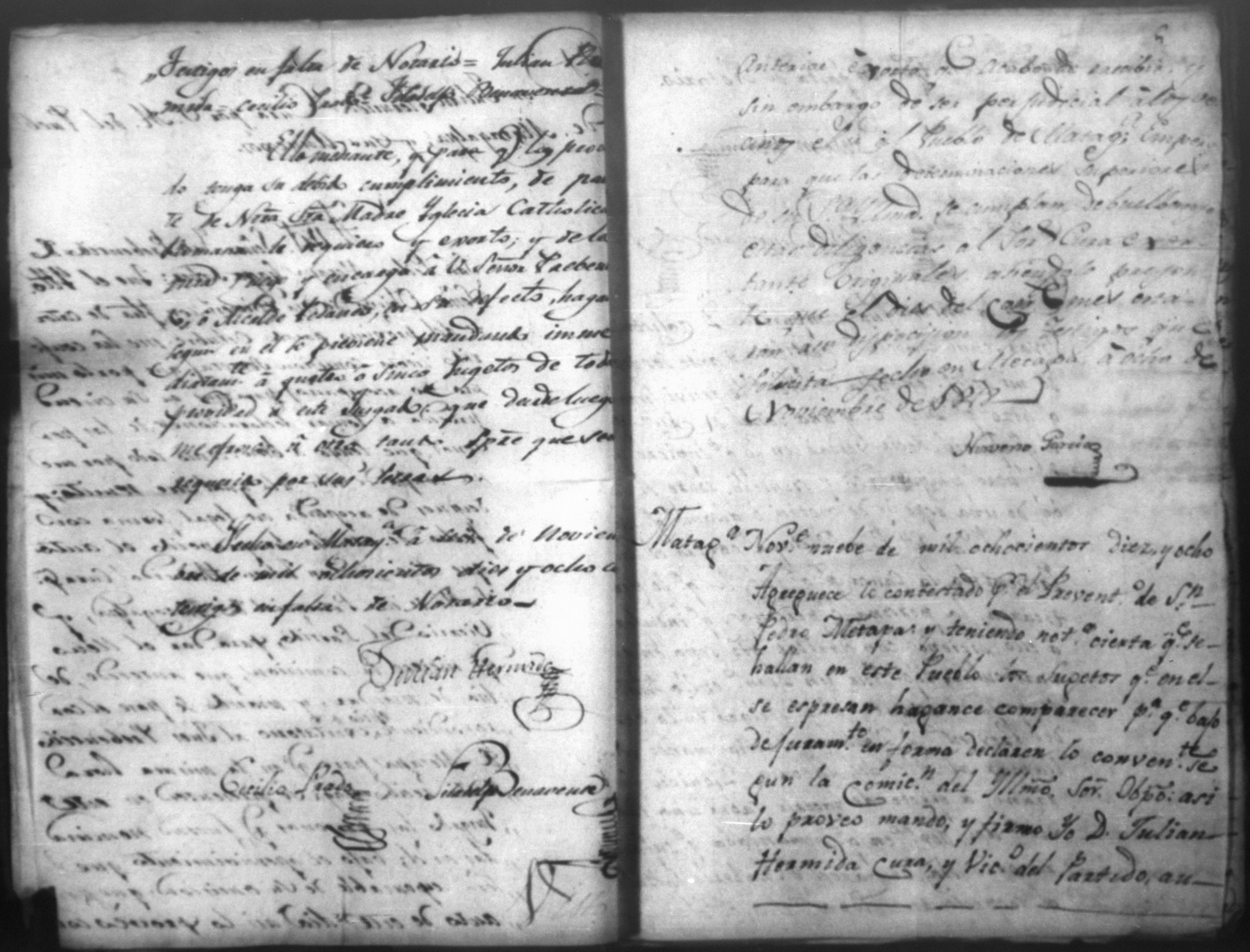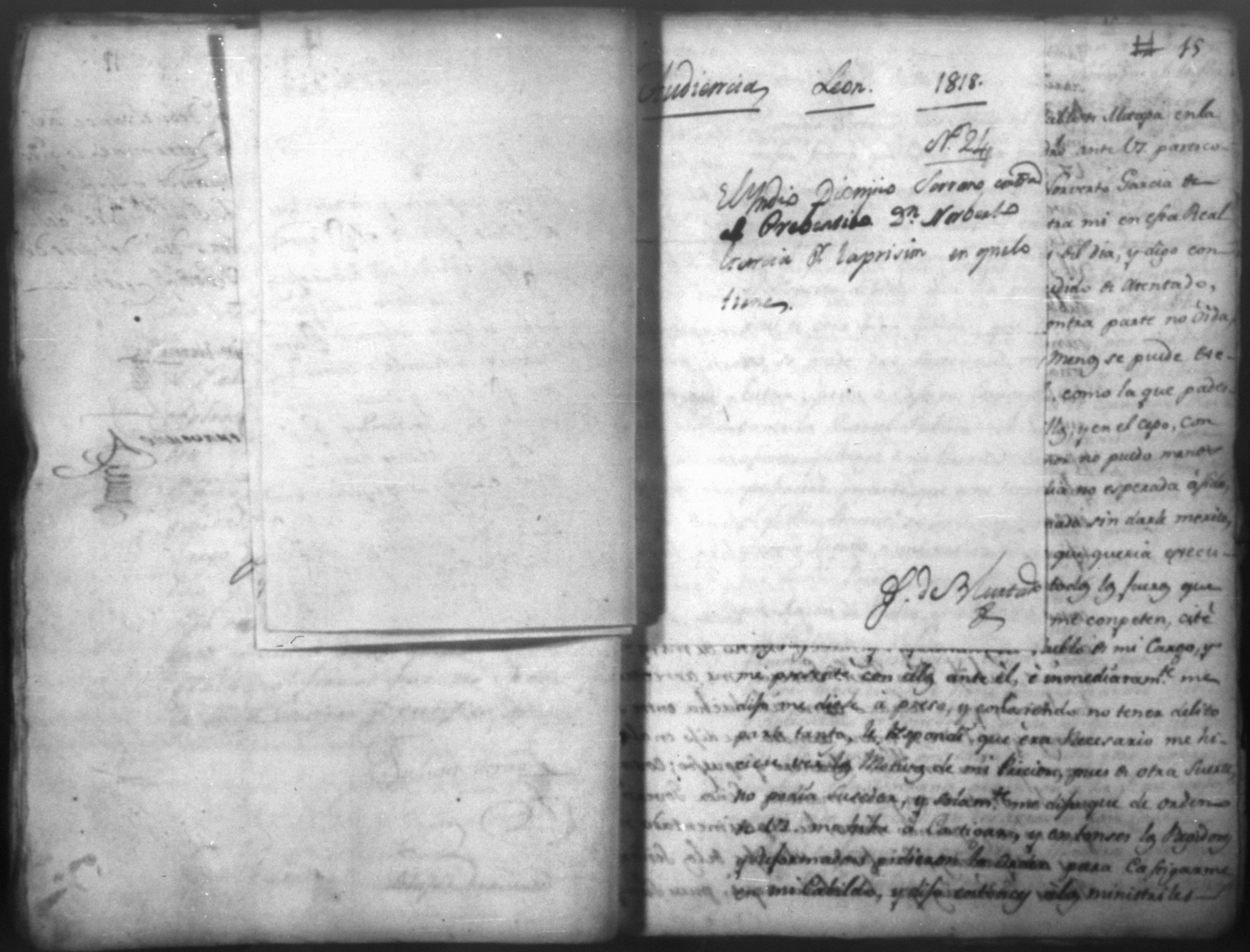 Temática: Audiencia Leon 1818. El Indio Dionicio Cerrano, contra el Presbitero Norberto Garcia por la prisión en que lo tiene. Relator: Ugalde. Firmas: Hurtado, Morán, Manuel Beltranena, Julian Montenegro.