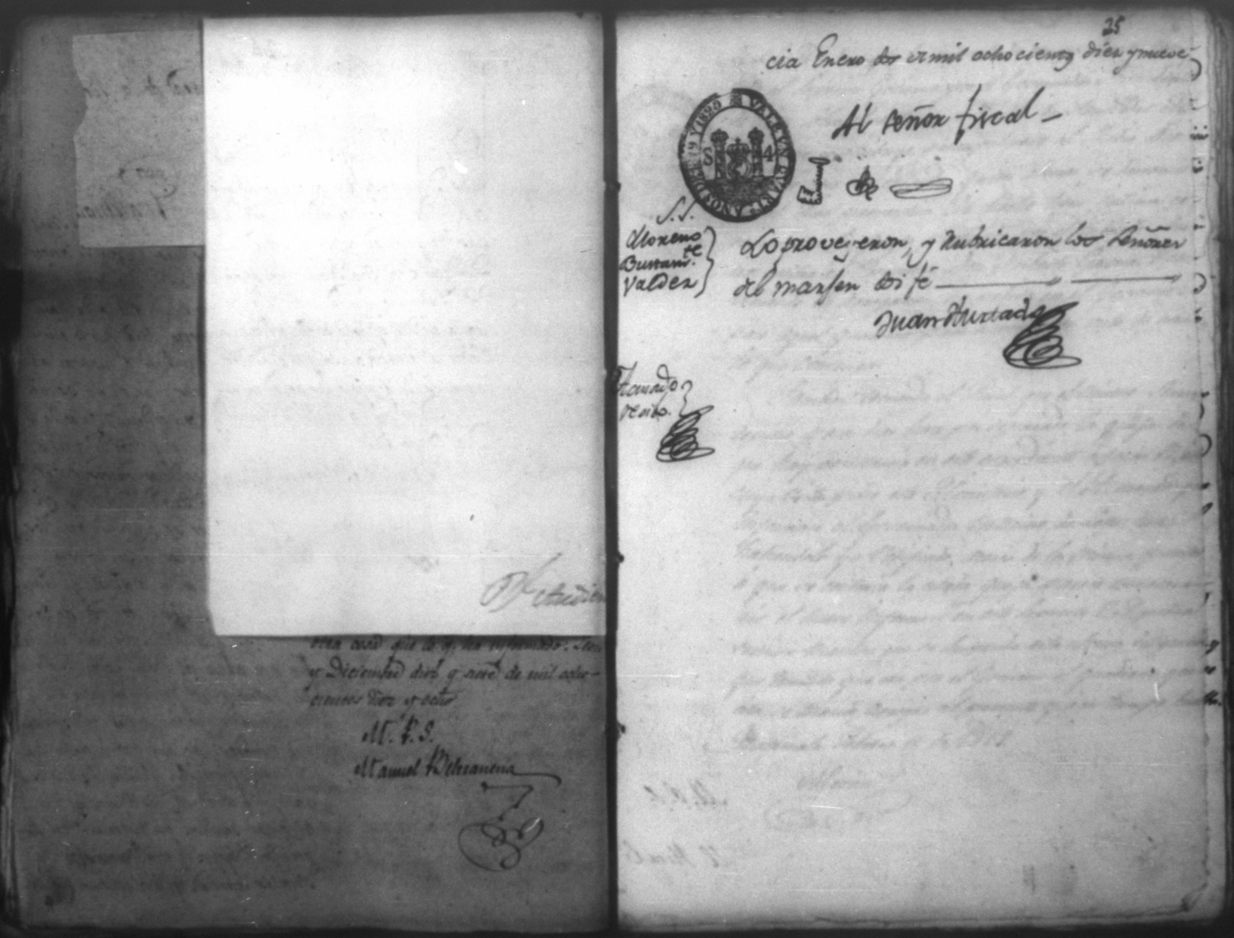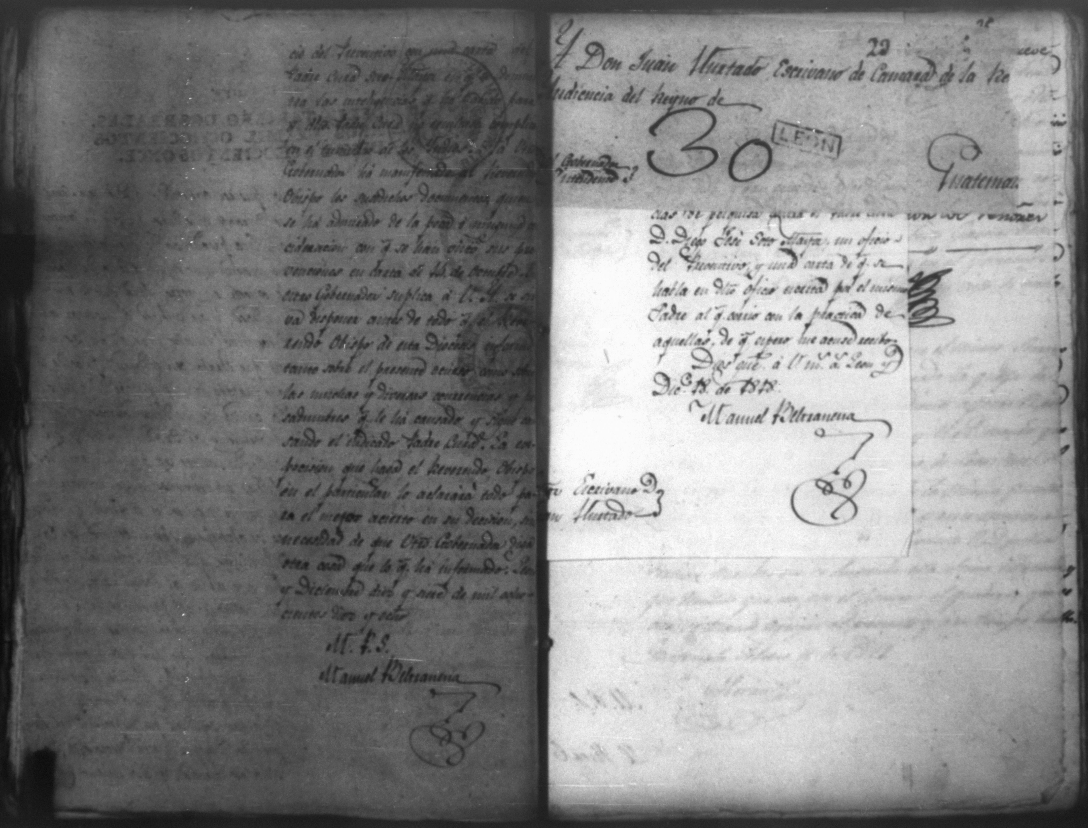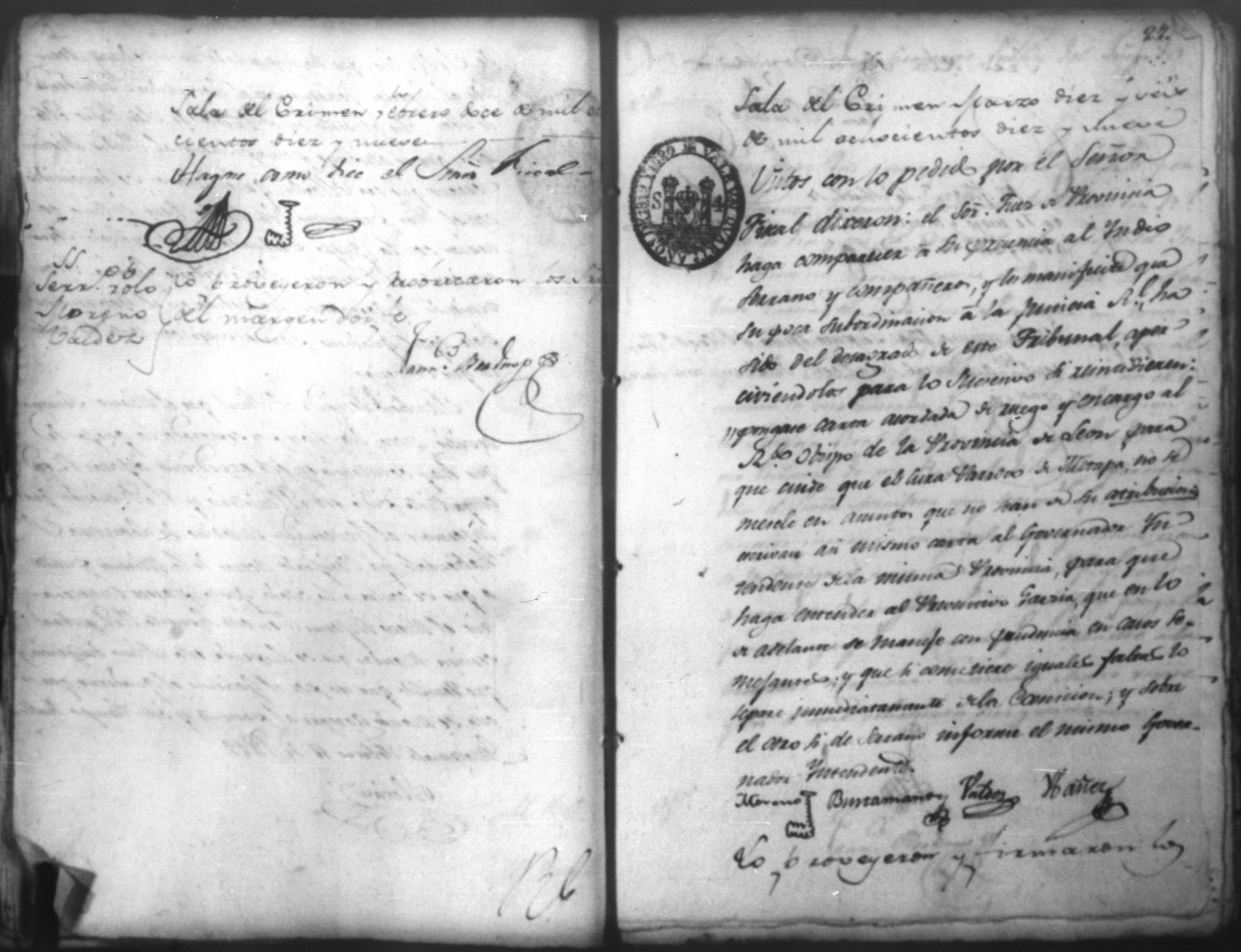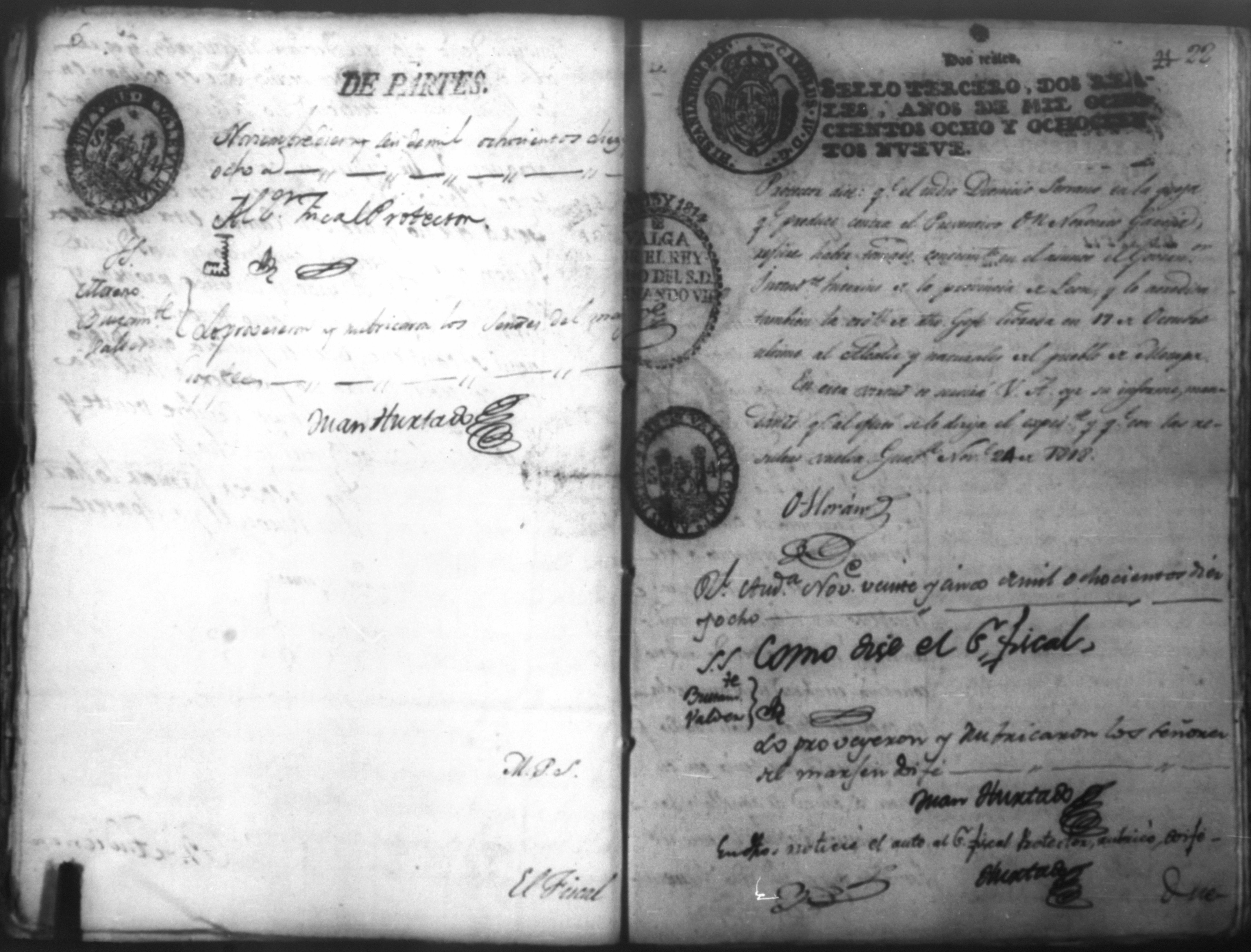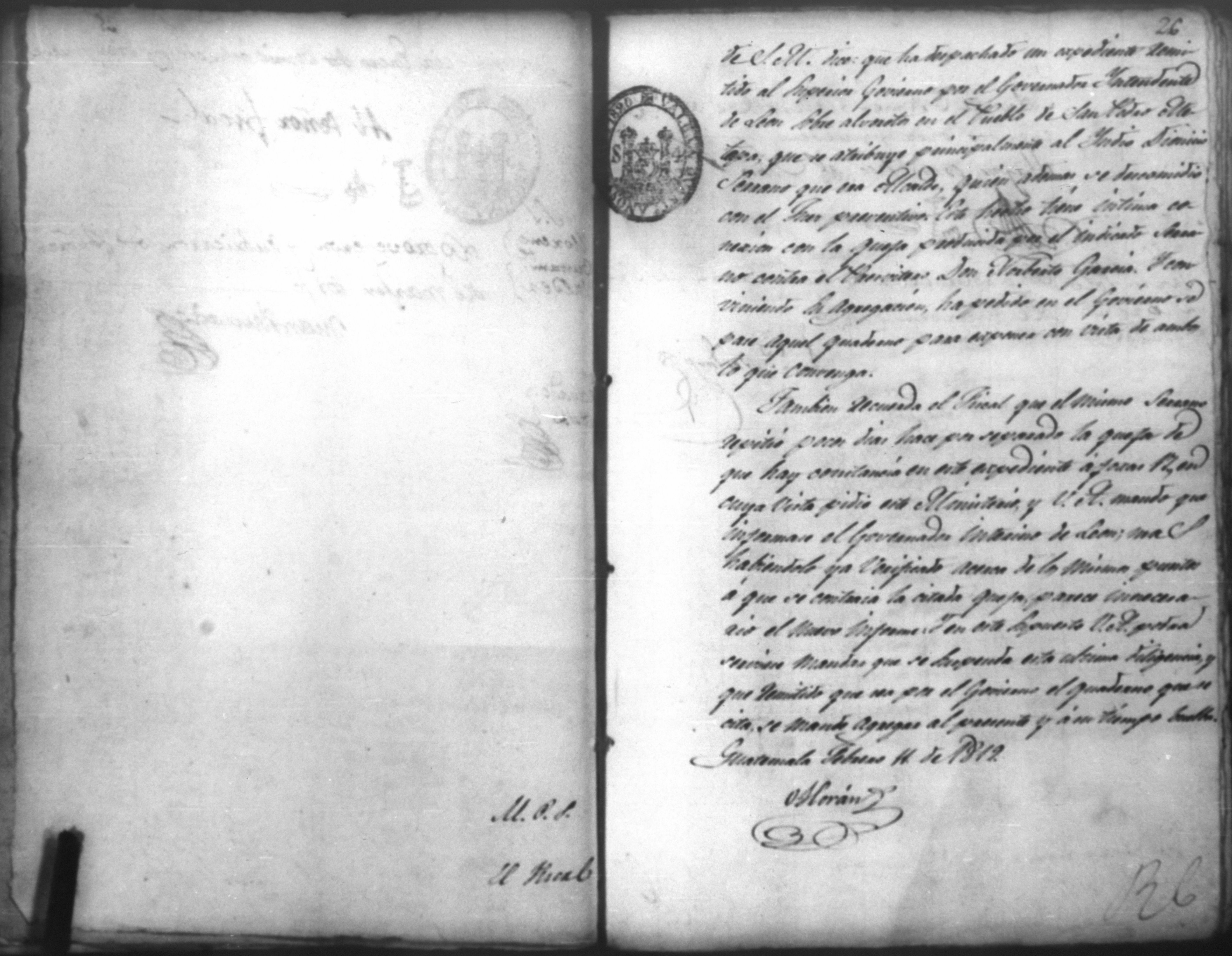 Temática: Audiencia Leon 1818. El Indio Dionicio Cerrano, contra el Presbitero Norberto Garcia por la prisión en que lo tiene. Relator: Ugalde. Firmas: Hurtado, Morán, Manuel Beltranena, Julian Montenegro.