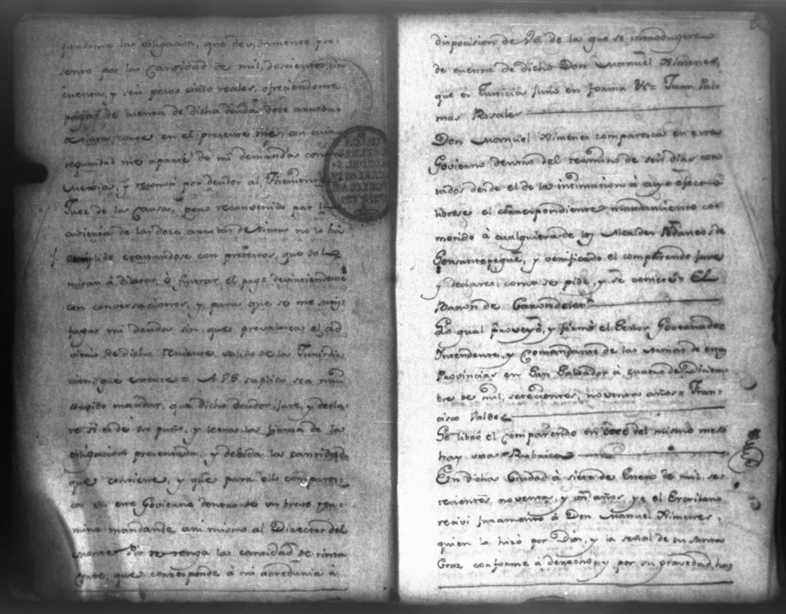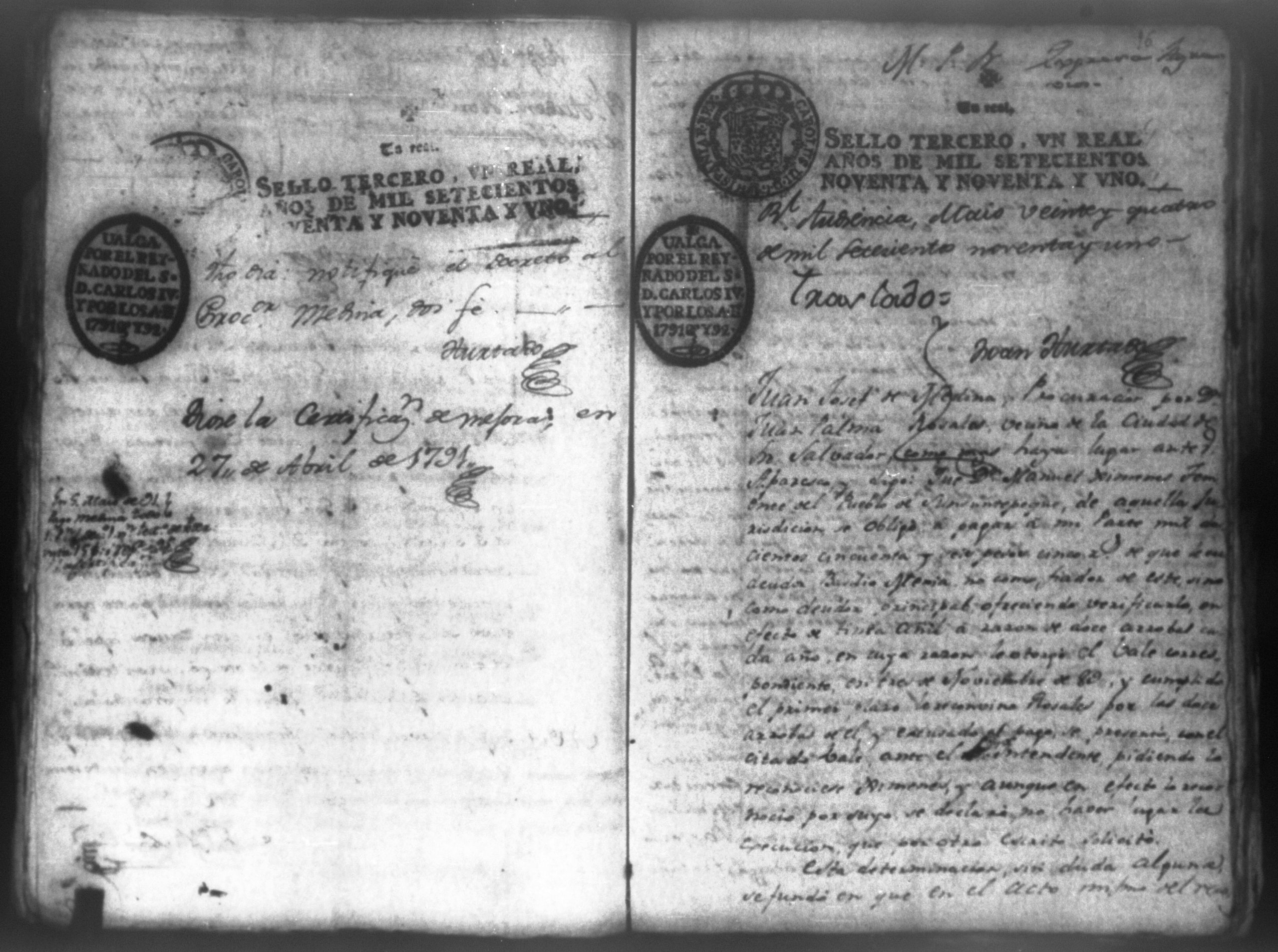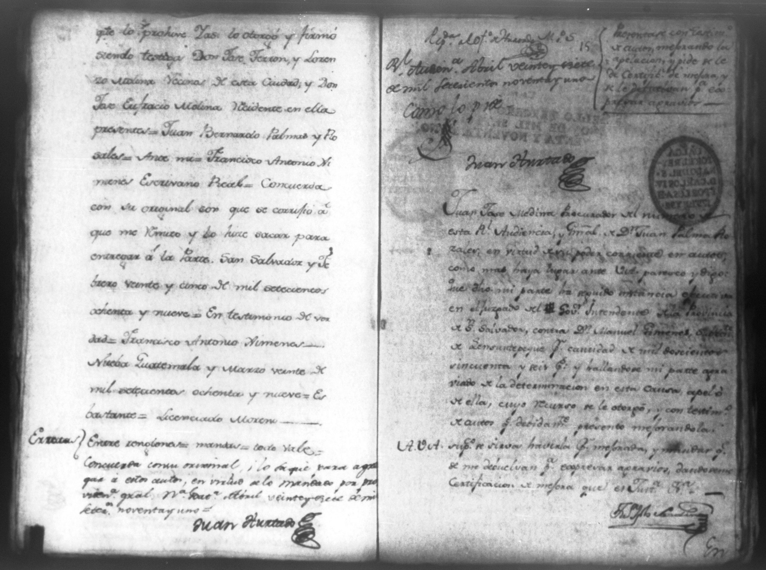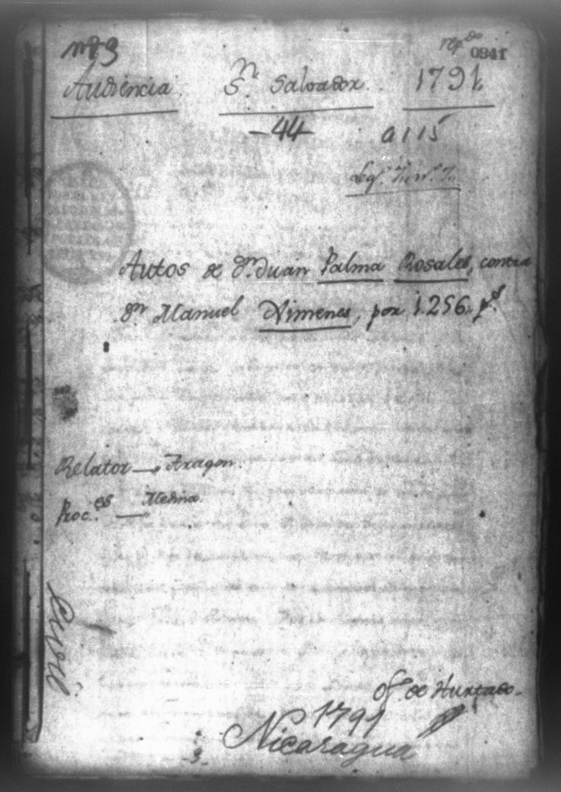 Temática: "Juan Jose Medina Procurador del numero de esta Real Audiencia, y General de Don Juan Palma Rozales, en virtud de su poder [corriente] en autos, como mas haya lugar ante Vuestra Alteza paresco y digo: que dicho mi parte ha seguido instancia efectiva en el Juzgado del Governador Intendente de la Provincia de San Salvador, contra Don Manuel Gimenes, Subteniente de Sunsuntepeque por cantidad de mil doscientos sincuenta y seis pesos y hallandose mi parte agraviado de la determinacion en esta causa apeló de ella, cuyo recurso se le otorgó, y con testimonio de autos y debidamente presento mejorandola. A Vuestra Alteza suplico se sirva haverla por mejorada y mandar que se me debuelva para expresar agravios, dandoseme certificacion de mejora [...]" (Extracto del folio 15, imagen 19)