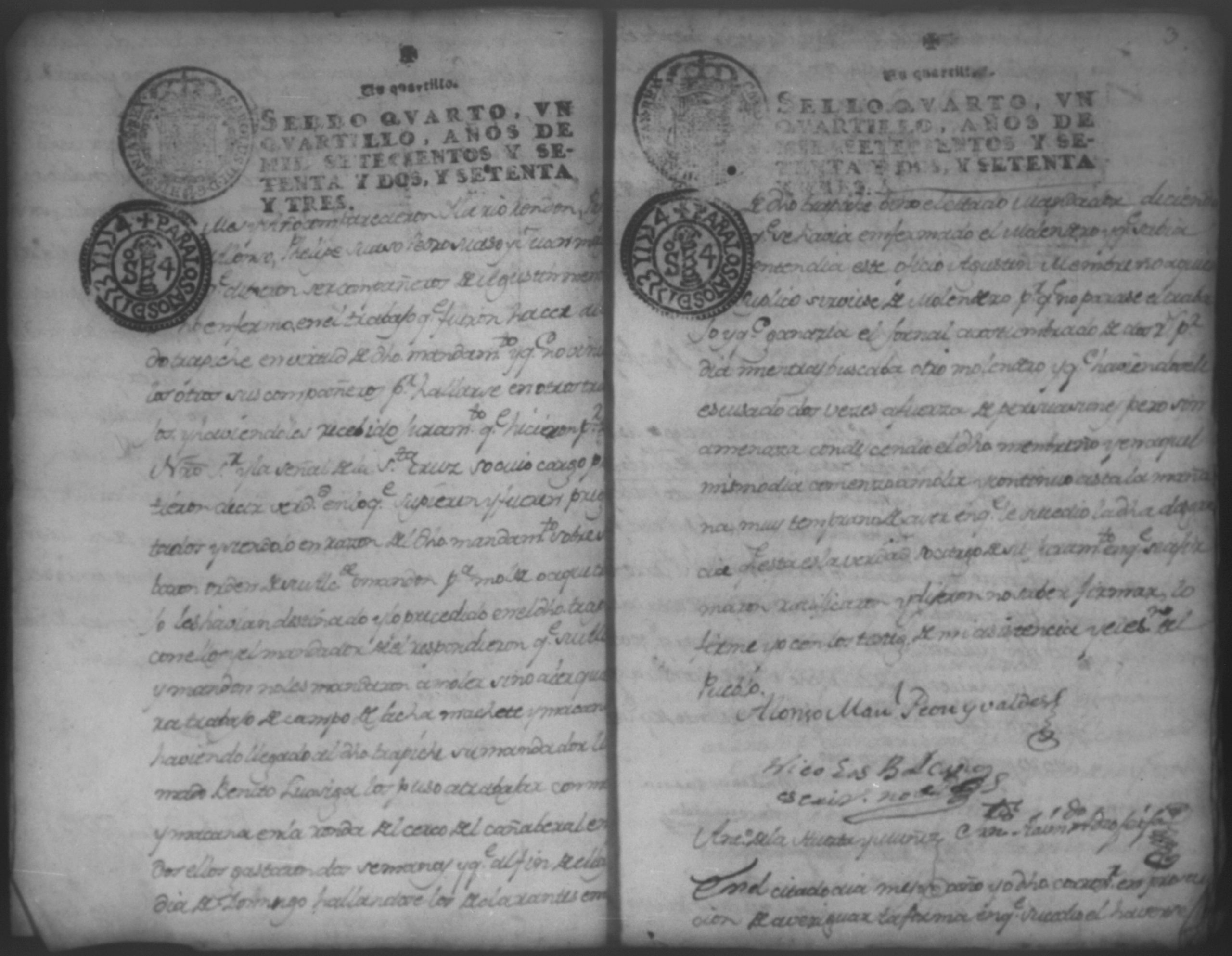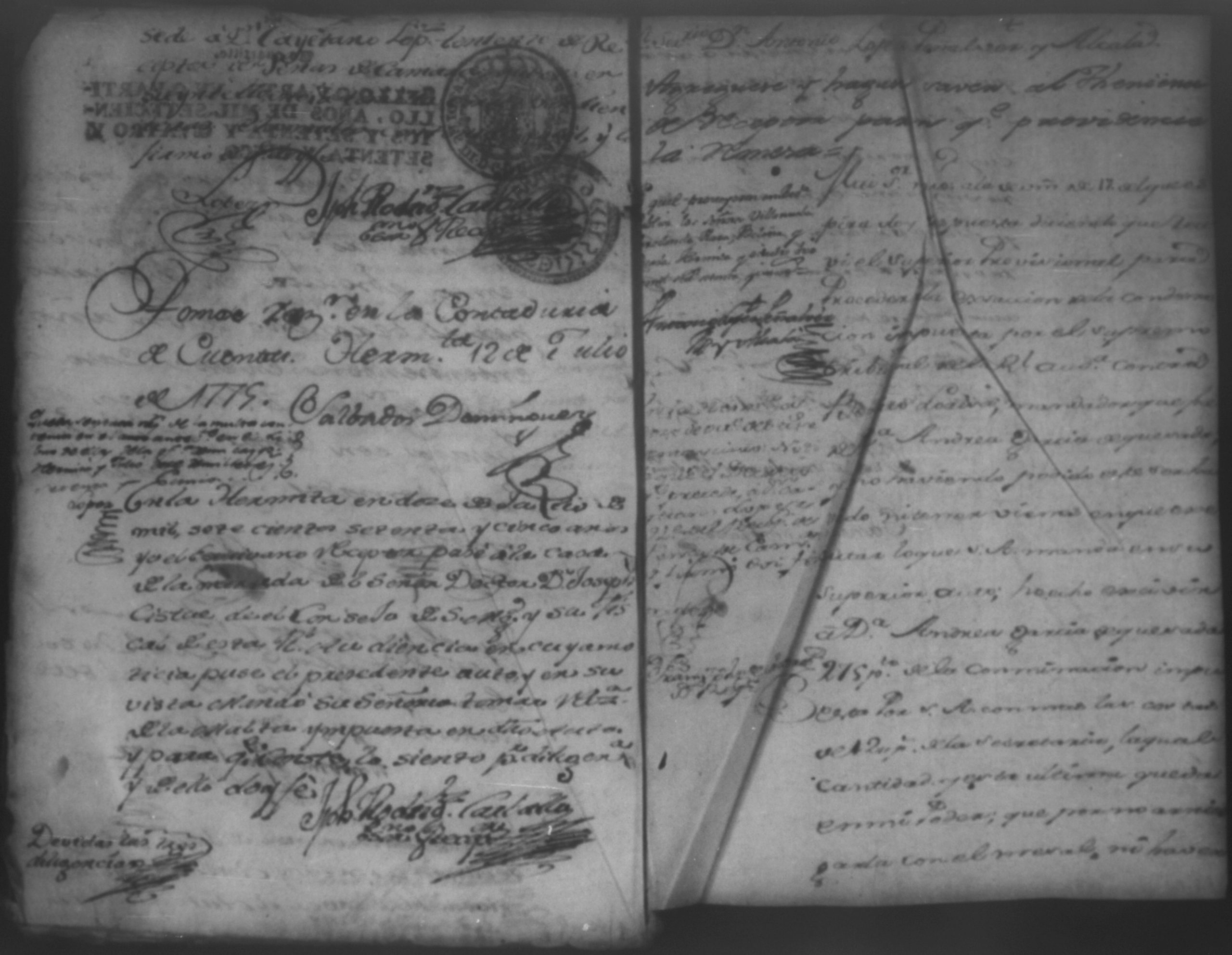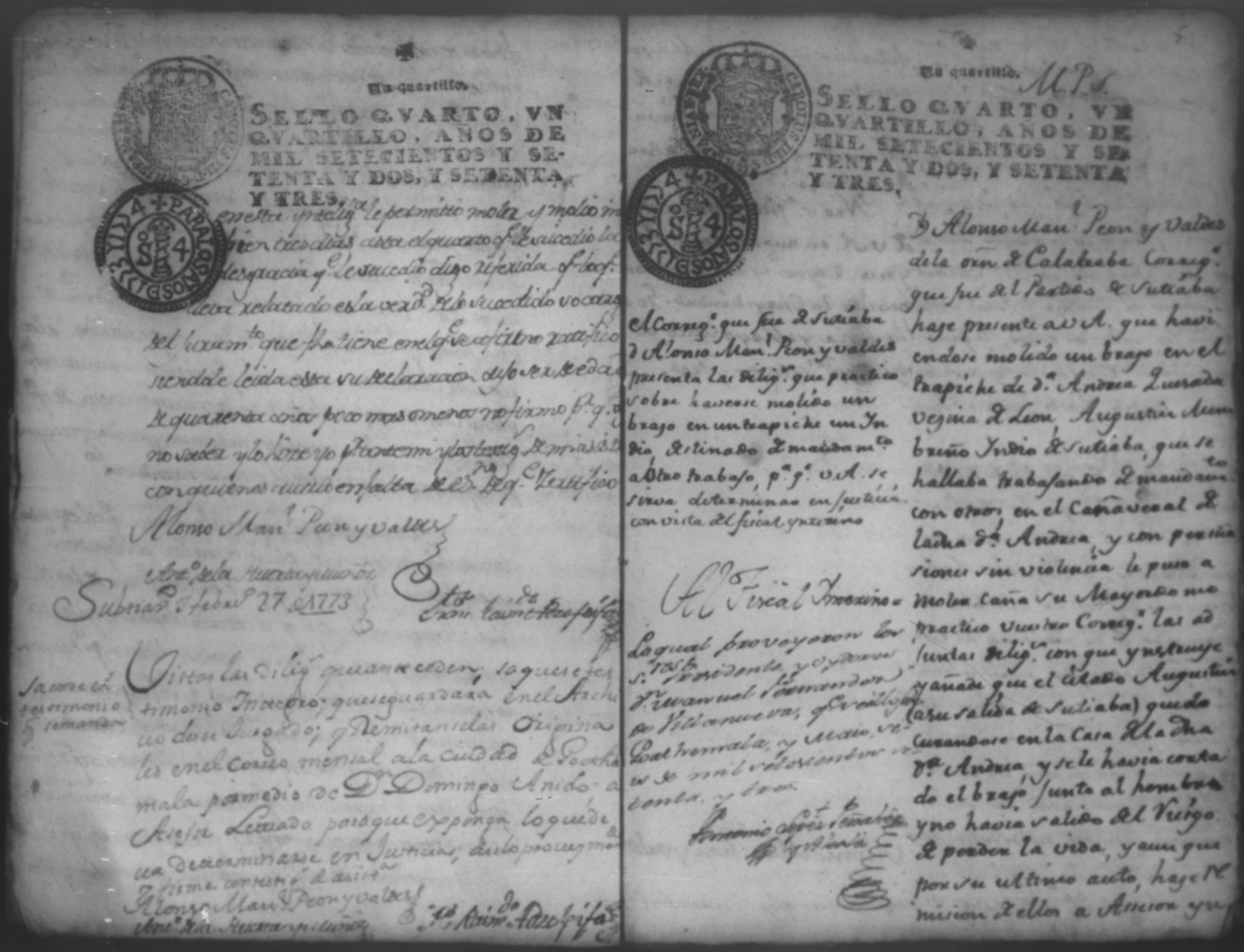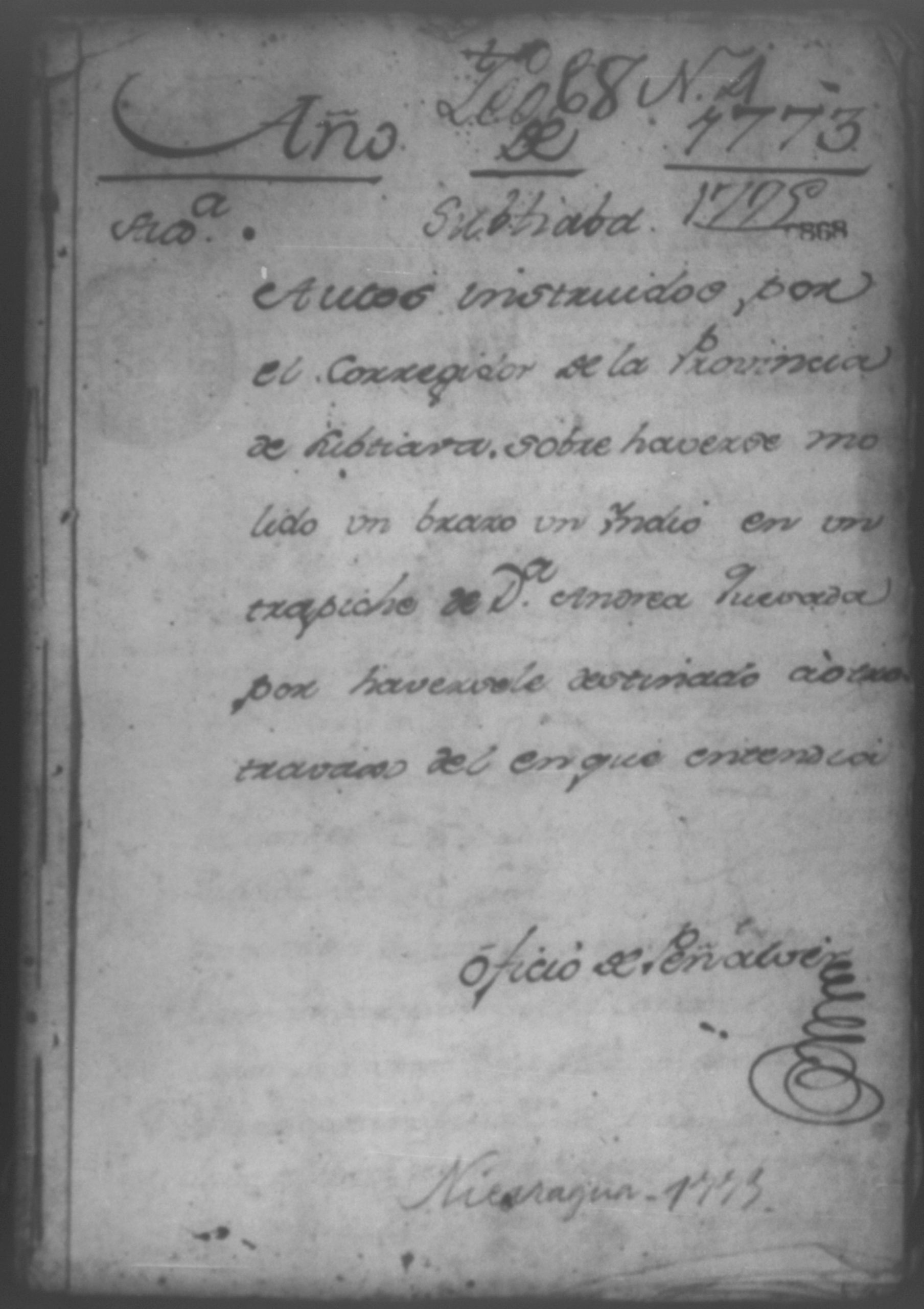 Temática: Año de 1773. Autos instruidos por el Corregidor de la Provincia de Subtiava sobre haberse molido un brazo un yndio en un trapiche de Doña Andrea Quesada por habersele destinado a otro trabaxo del en que entendia.