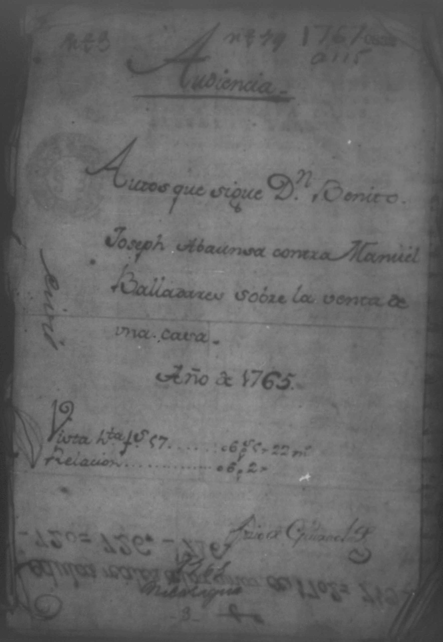 Temática: Año 1767. Audiencia. Autos que sigue Don Benito Joseph Abaunsa contra Manuel Balladares sobre la venta de una casa.