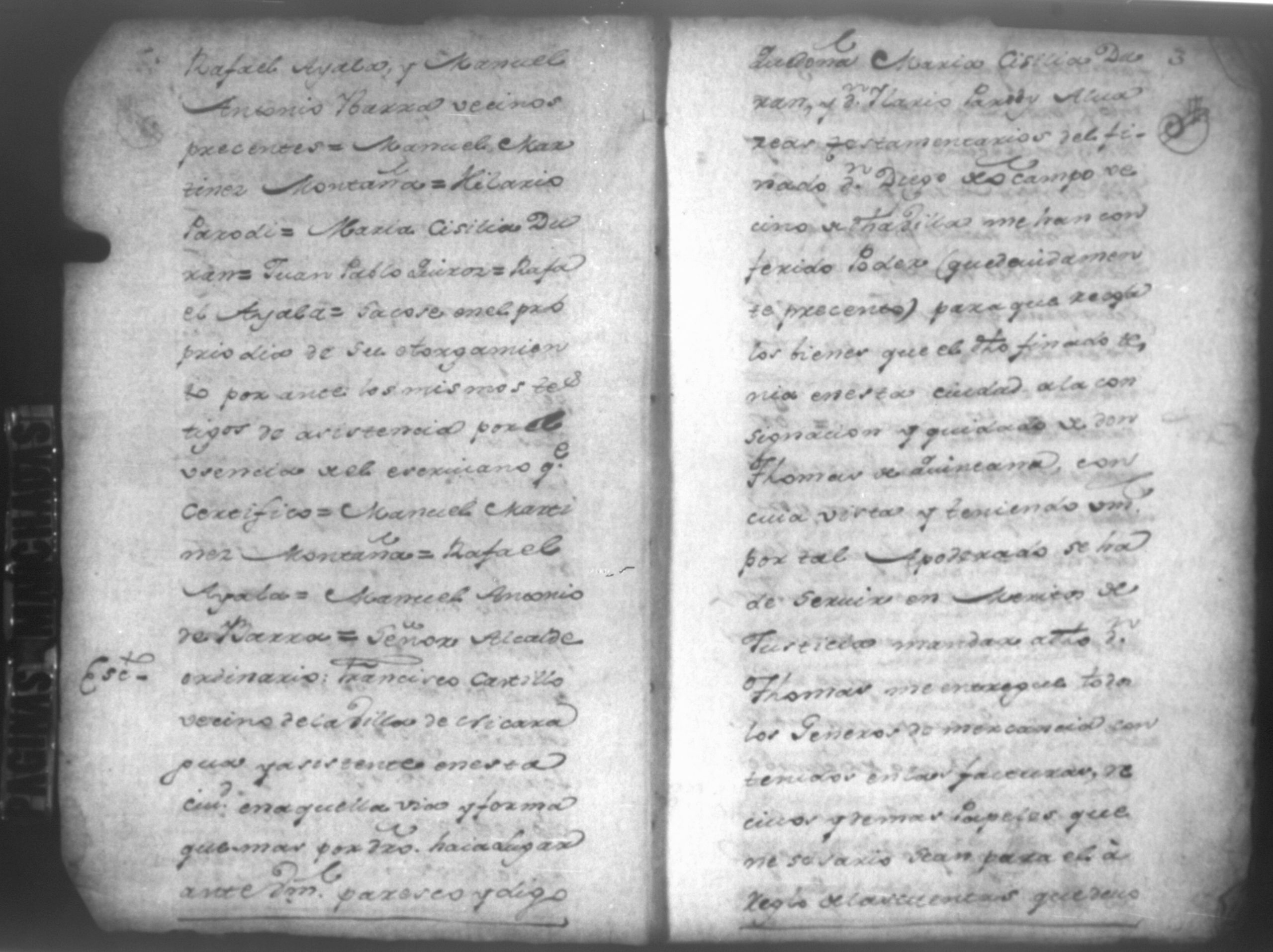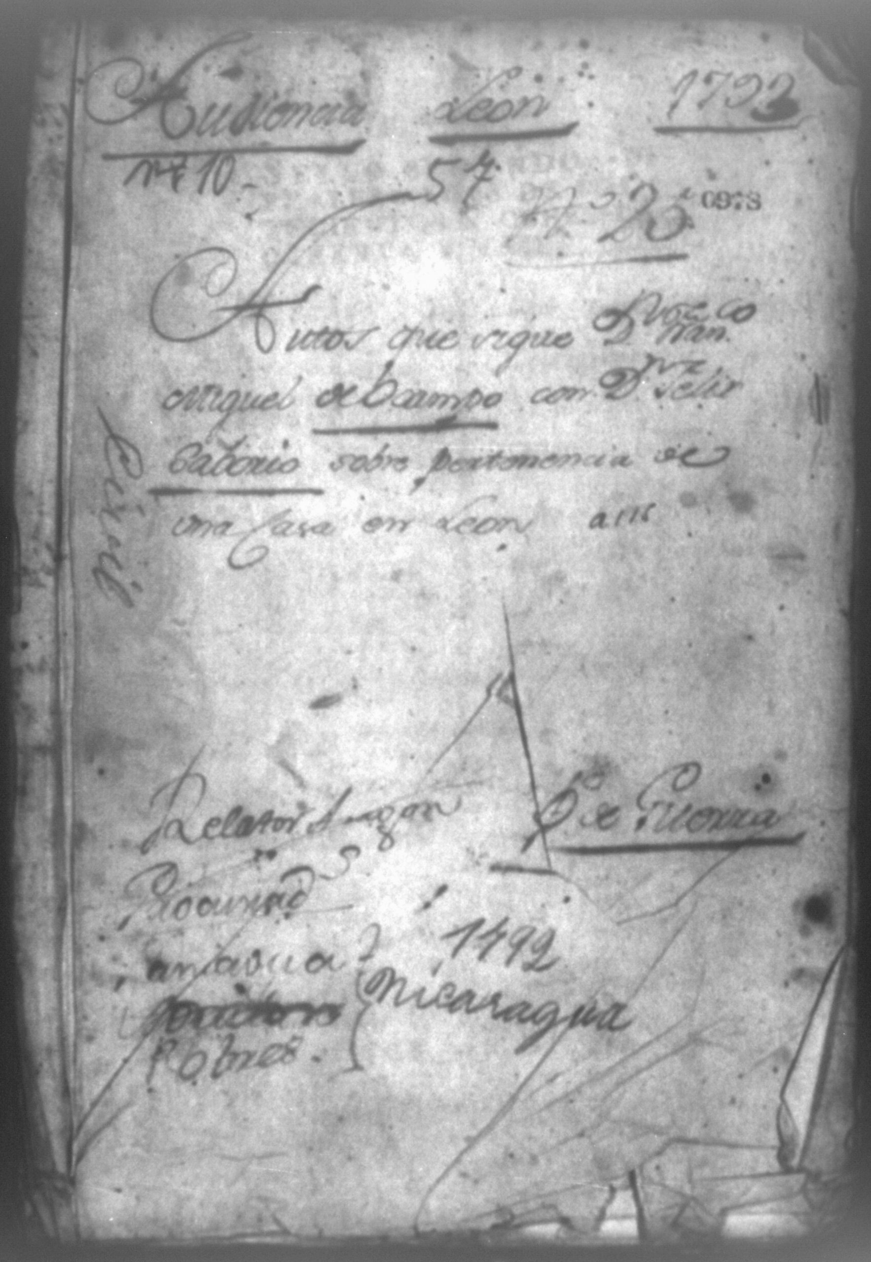 Temática: Audiencia, León, 1793. Autos que sigue Don Francisco Miguel de Ocampo con Don Felix Saborio sobre pertenencia de una casa en León. Incluye: Pruebas a favor de los hijos menores del finado Don Diego de Ocampo en el pleito que sigue el procurador Yglesias contra Doña Angela Medrano por haberle vendido esta una casa que tienen en la Calle Real, que va para Subtiaba. Subtiaba era un pueblo indígena en León, de origen Maribio. Algunas páginas del documento se encuentran manchadas.