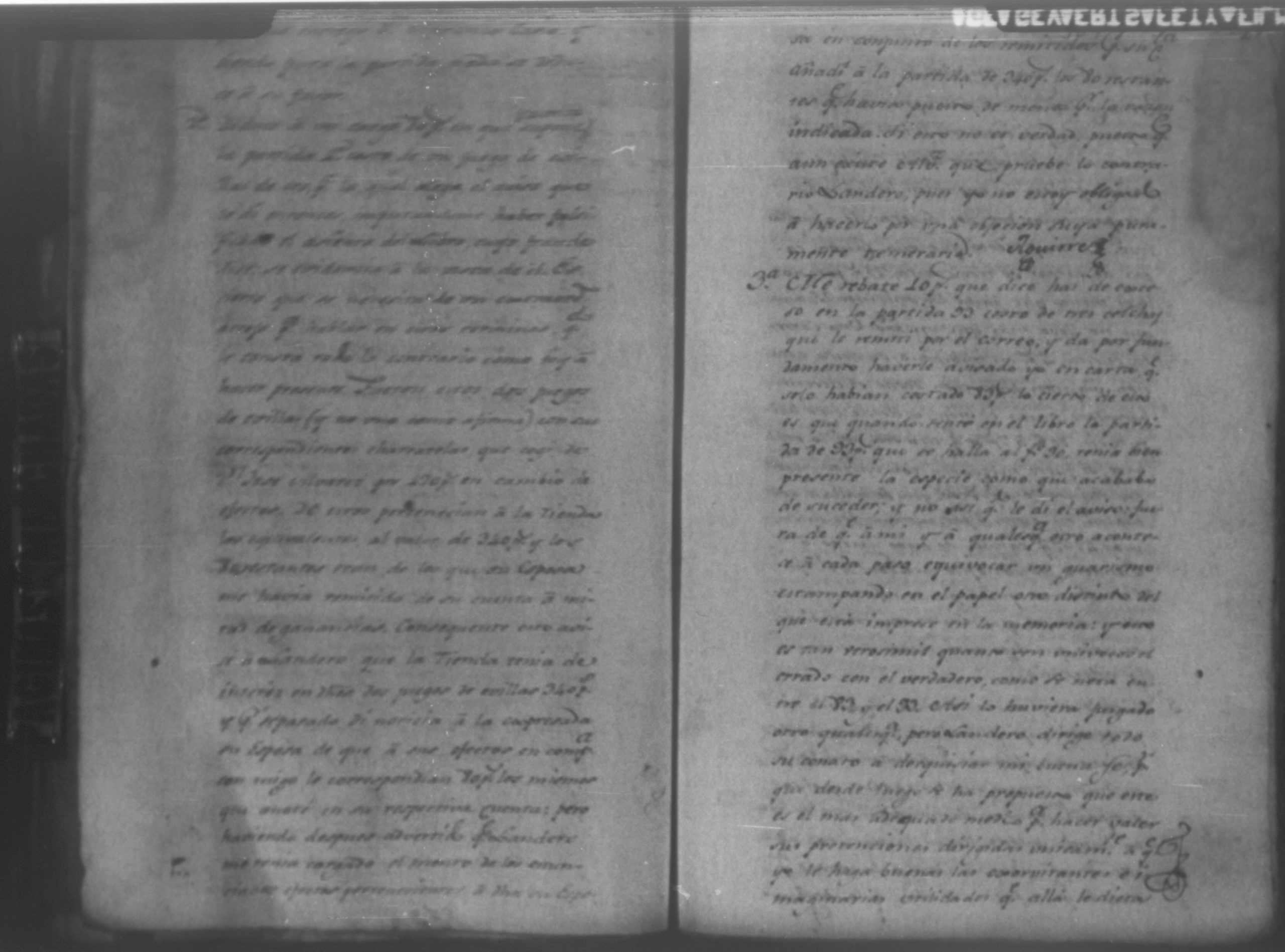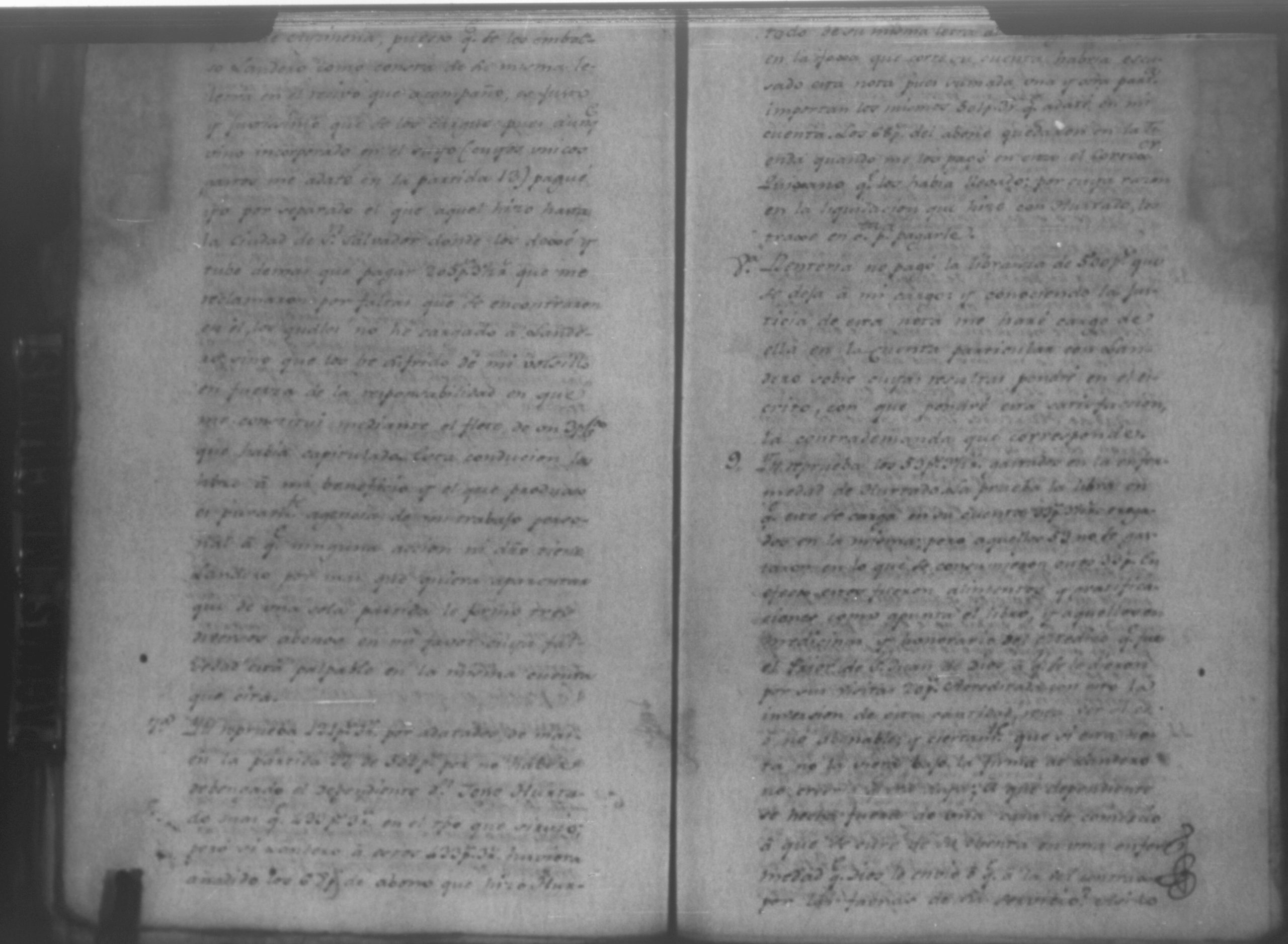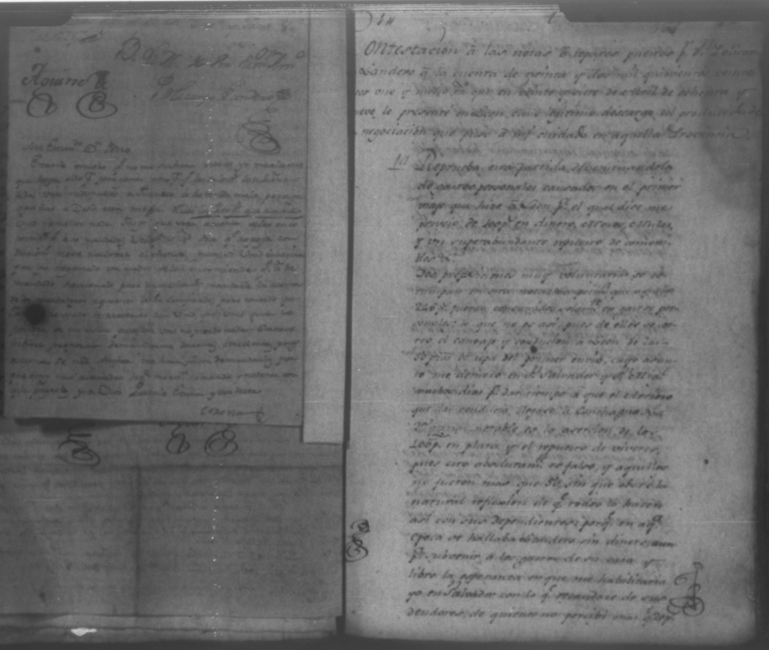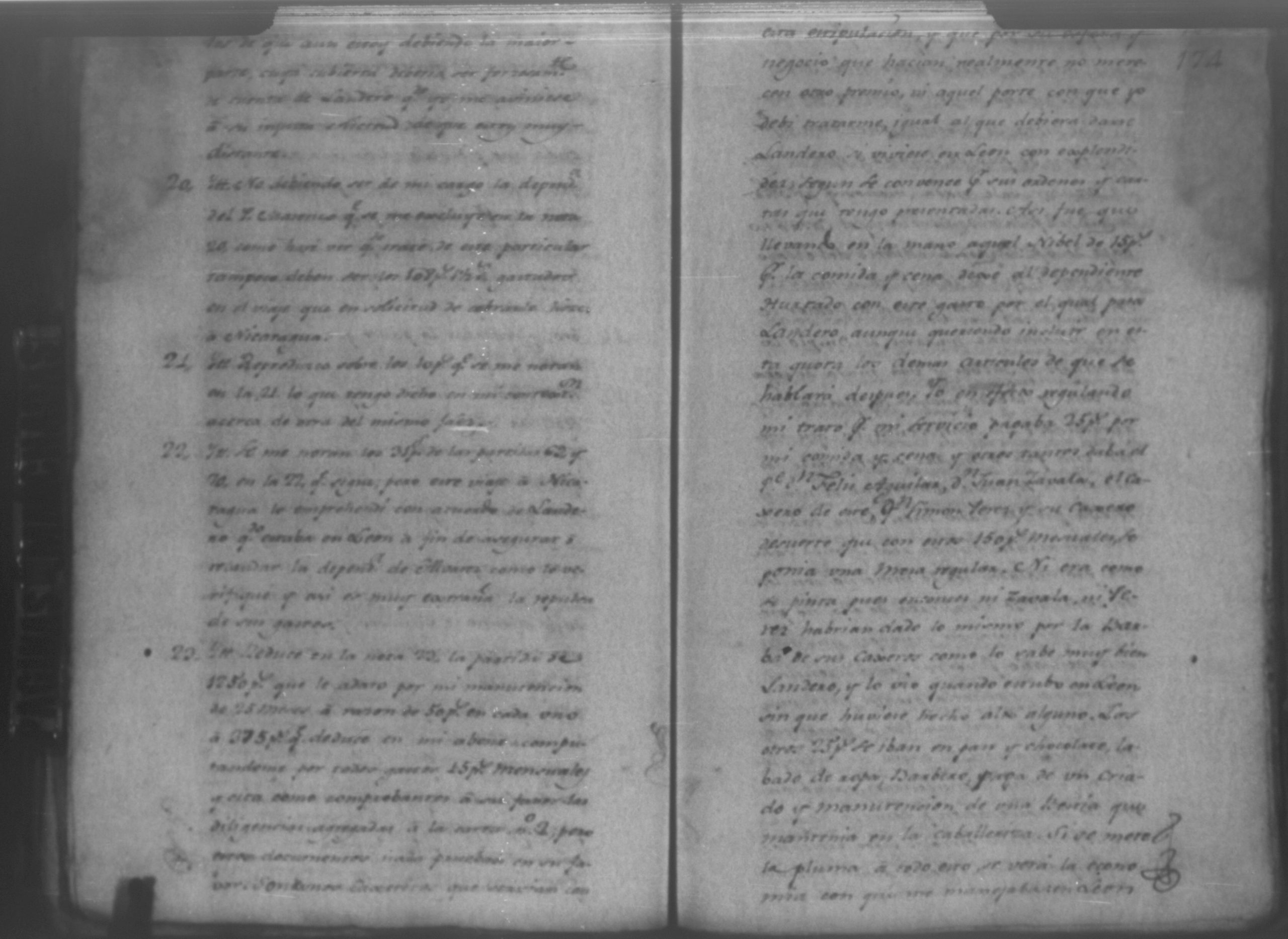 Temática: Audiencia León, 1792. Autos que sigue don Policarpo Landero con don Pedro Aguirre, su cajero, sobre estado de cuentas que necesita para resolver una causa pendiente. Cuaderno 1. "Don Policarpo Landero vecino y del Comercio de la Capital de Guatemala como mas haya lugar ante Vuestras majestades paresco y digo: Que ayer fueron Vuestras majestades mui servidos de darme por Traslado las Cuentas presentadas por mi Caxero Don Pedro Aguirre como igualmente el Libro Manual de caxa y Diario de el para anotar, y formar mi correspondiente Cuenta del Descargo, y Cargo que tenga que hacerlo y como quiera que para mayor comprencion y formacion que tengo que hacer han de ser Vuestras majestades mui servidos mandar se me entreguen las Justificaciones comprobantes que a Vuestras majestades haya exivido por medio de su apoderado Don Pedro Aguirre por serme tan precisos y necesarios para la mayor claridad de mi cuenta pues en la que se me forma hallo algunas contrarierades que son vien de bulto y a su tiempo hare precentes con todo lo demas a favor y en contra... [...]" (Extracto de la imagen 36)