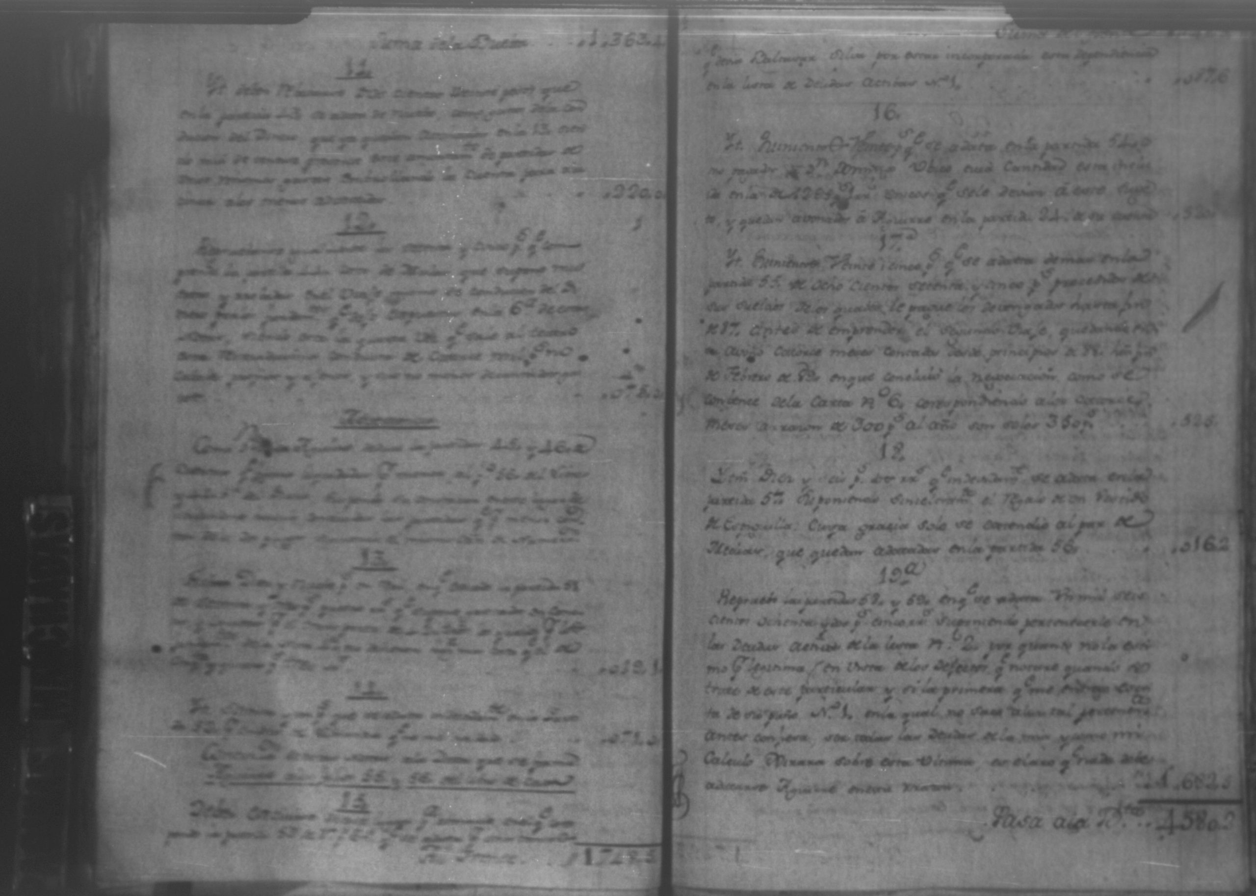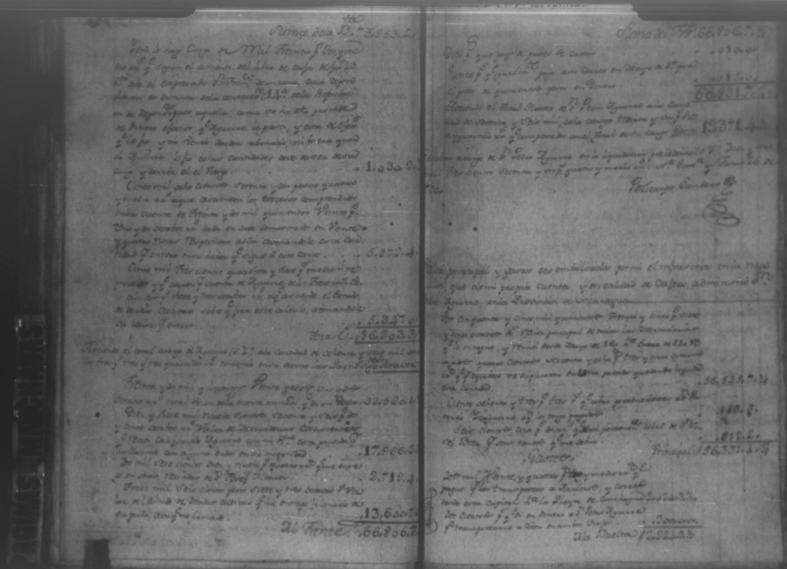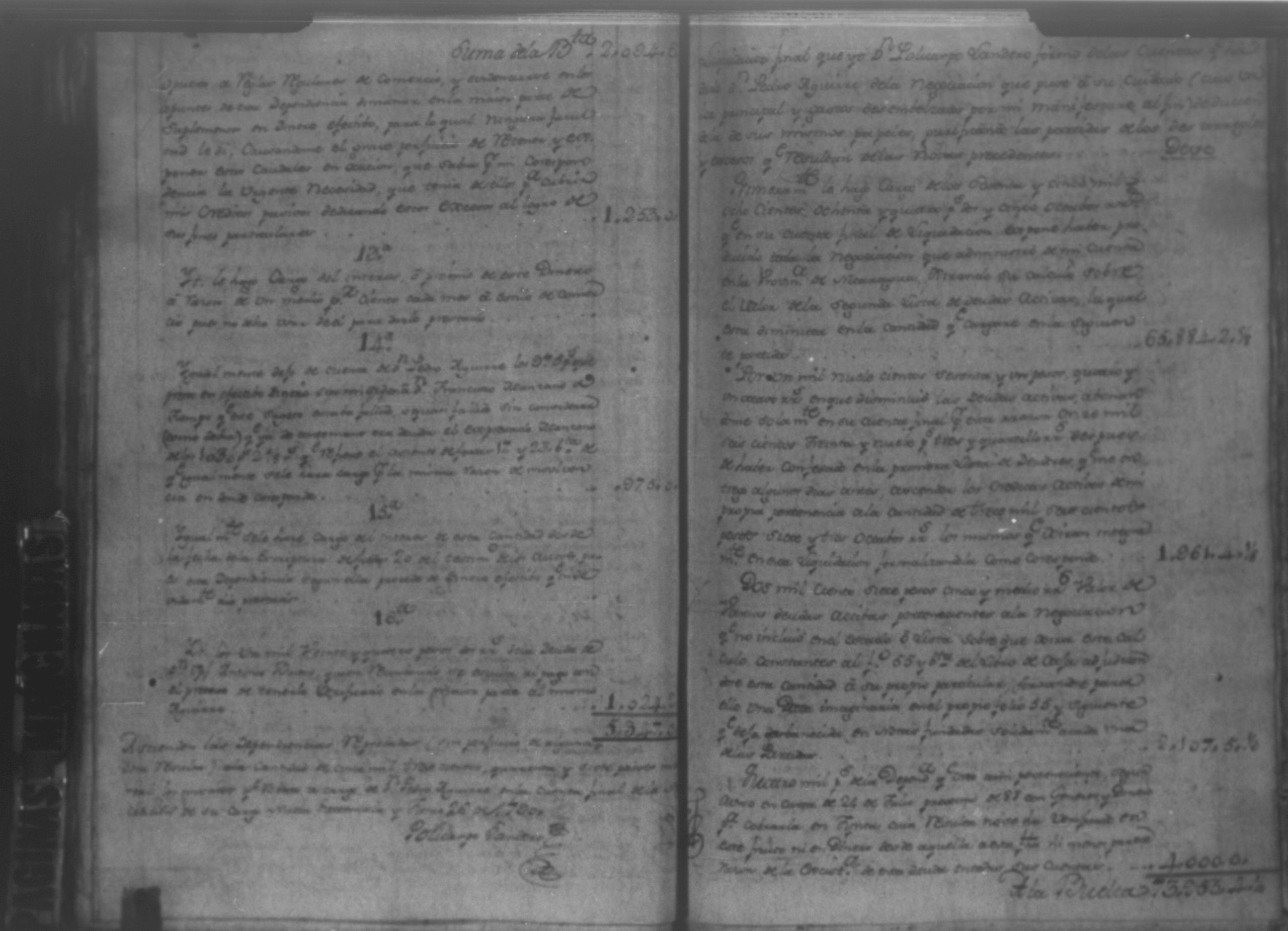 Temática: Audiencia León, 1792. Autos que sigue don Policarpo Landero con don Pedro Aguirre, su cajero, sobre estado de cuentas que necesita para resolver una causa pendiente. Cuaderno 1. "Don Policarpo Landero vecino y del Comercio de la Capital de Guatemala como mas haya lugar ante Vuestras majestades paresco y digo: Que ayer fueron Vuestras majestades mui servidos de darme por Traslado las Cuentas presentadas por mi Caxero Don Pedro Aguirre como igualmente el Libro Manual de caxa y Diario de el para anotar, y formar mi correspondiente Cuenta del Descargo, y Cargo que tenga que hacerlo y como quiera que para mayor comprencion y formacion que tengo que hacer han de ser Vuestras majestades mui servidos mandar se me entreguen las Justificaciones comprobantes que a Vuestras majestades haya exivido por medio de su apoderado Don Pedro Aguirre por serme tan precisos y necesarios para la mayor claridad de mi cuenta pues en la que se me forma hallo algunas contrarierades que son vien de bulto y a su tiempo hare precentes con todo lo demas a favor y en contra... [...]" (Extracto de la imagen 36)