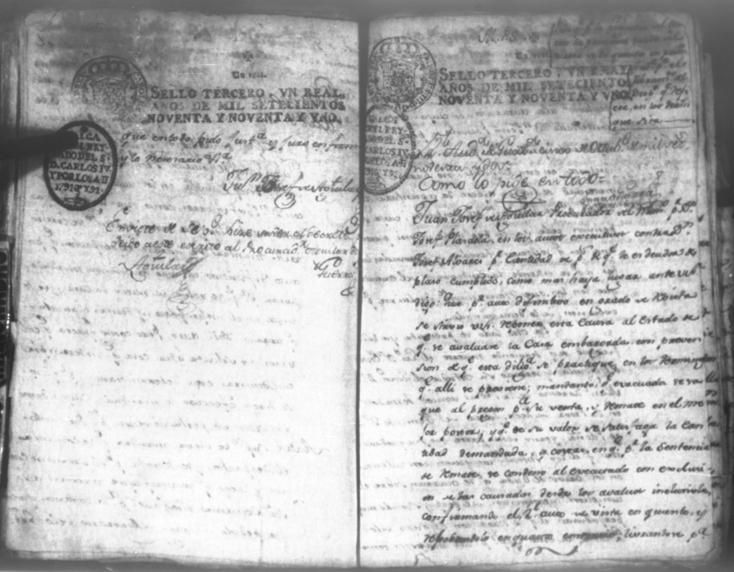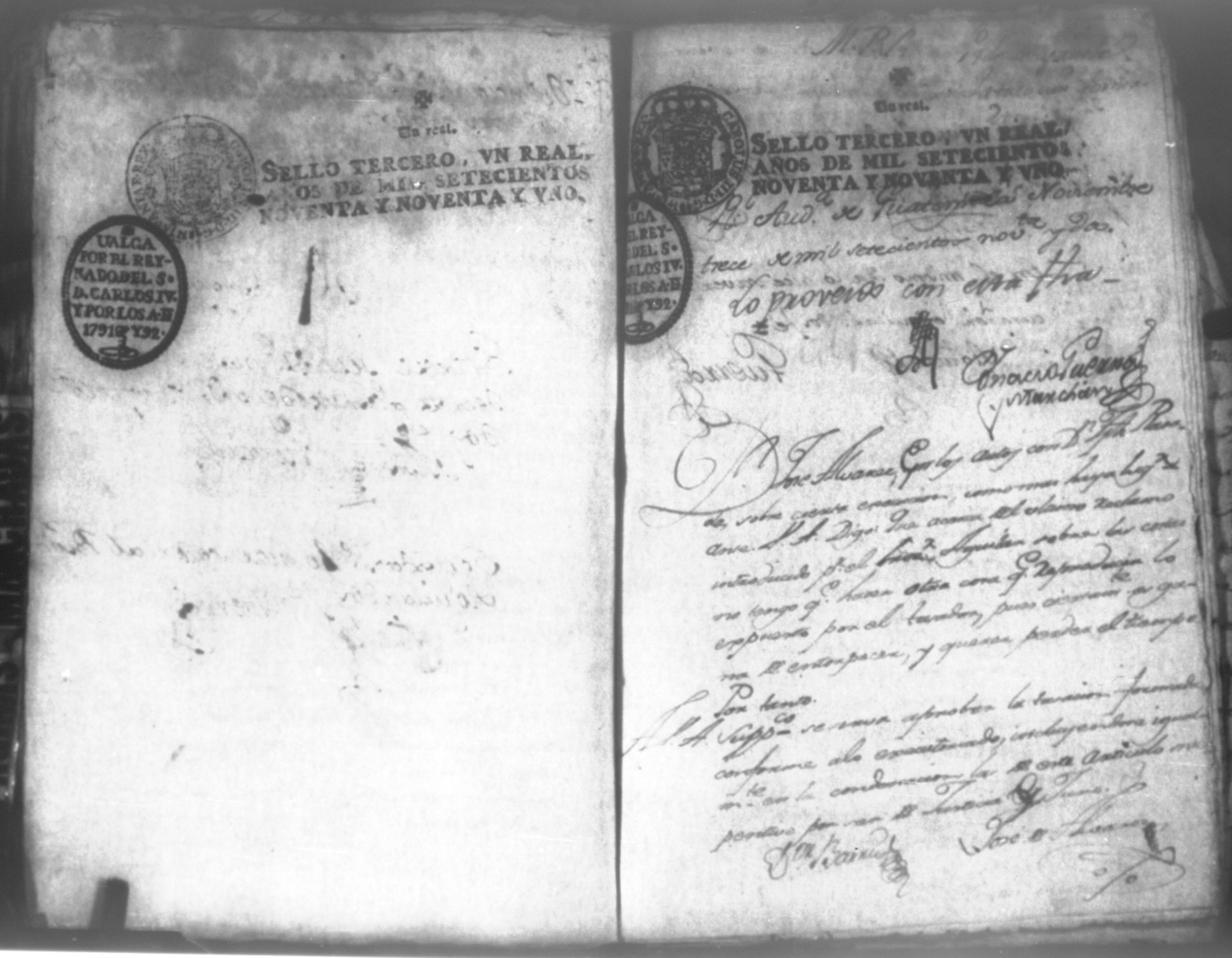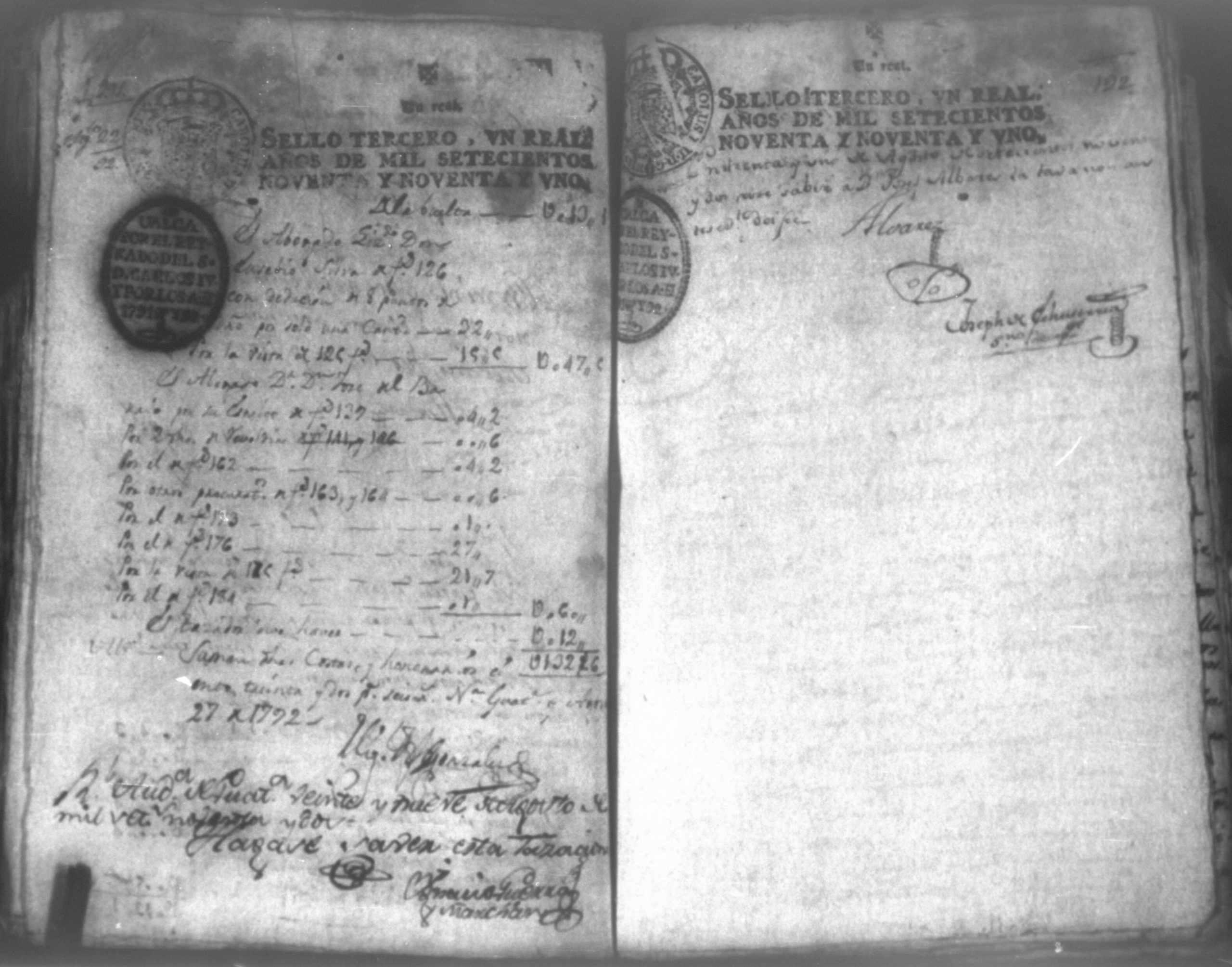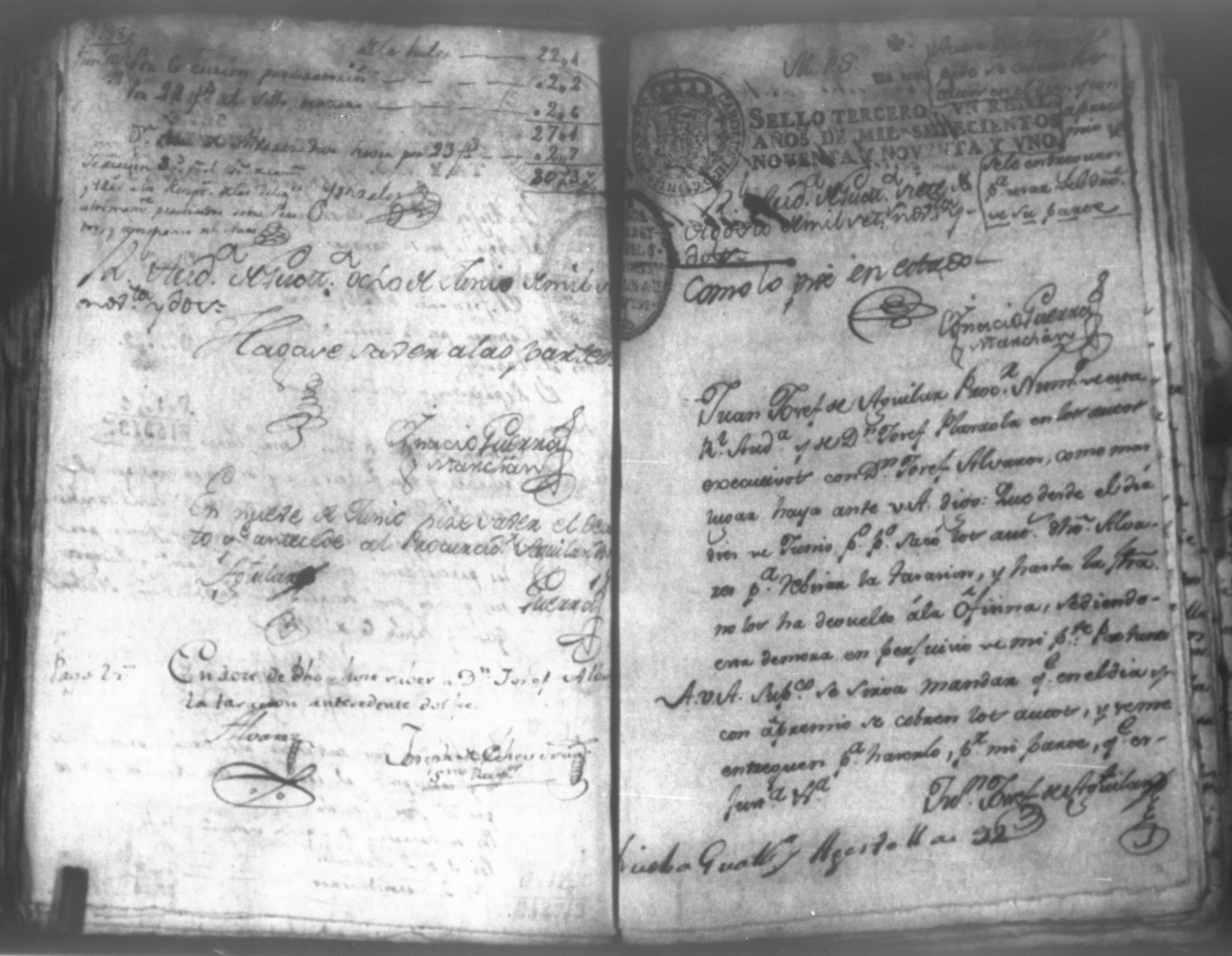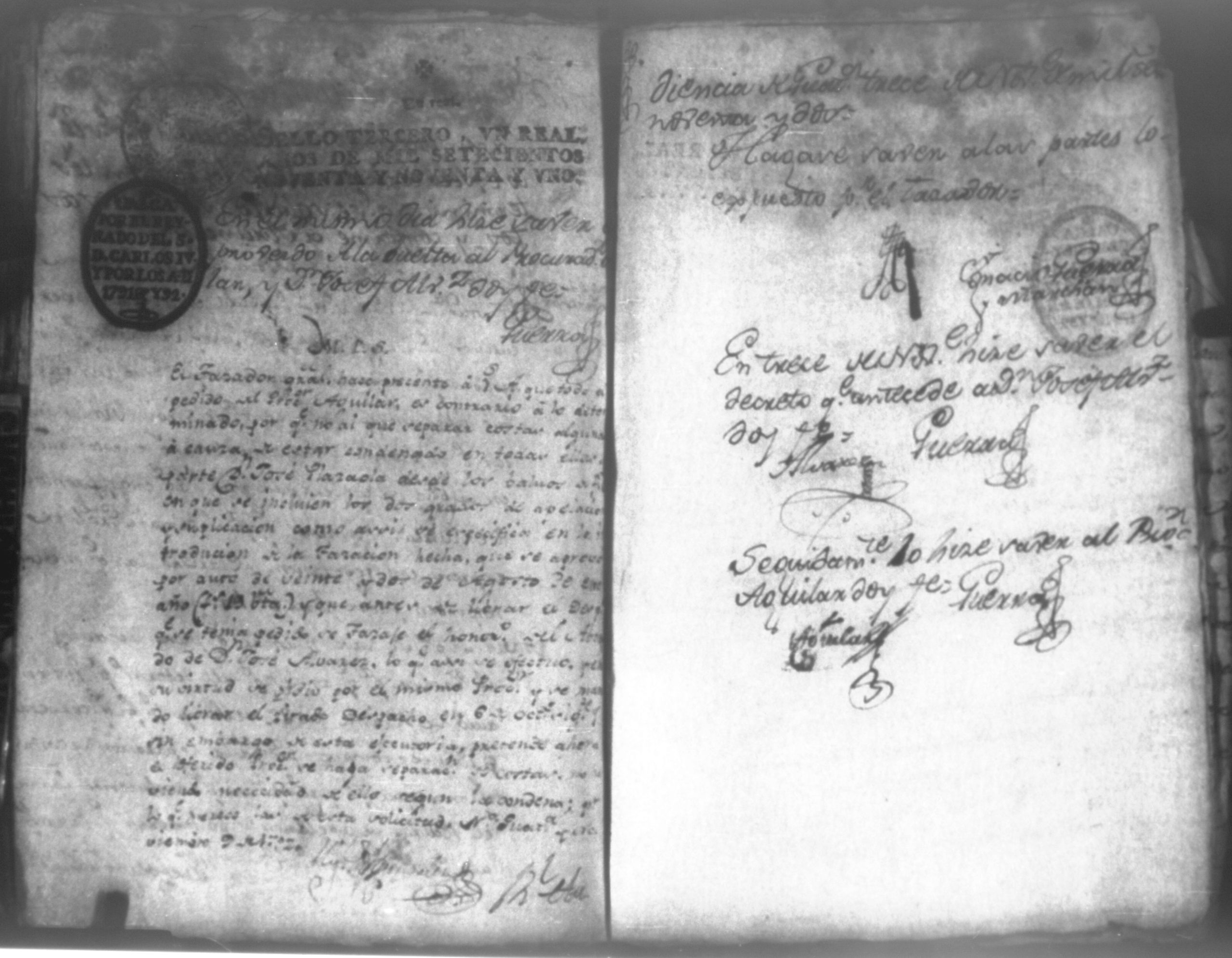 Temática: Audiencia León, 1792. Autos que siguen don José Alvarez y don José Plazaola por cantidad de pesos. Incluye: los Documentos relativos al testimonio de la causa ejecutiva seguida contra don Josef Alvares en el Gobierno e Intendencia de León por cantidad de pesos debidos a don Josef Plazaola (1791). "En la Ciudad de Leon en veinte y tres de Abril de mil setecientos y noventa años: [...] el Escribano y testigos que iran nominados pareció personalmente Don Jossé de Albarez de este vecindario, á quien doy fee conosco, y digo: Que por la presente Escritura Publica otorga en la forma que mas lugar en derecho que deve, y se obliga á dar, y pagar, y que dará y pagará realmente, y con efecto á Don Jossé de Plazaola, vezino del Pueblo del Biejo, ó á quien su Poder, y causa huviere, es á saver la cantidad de ocho mil setecientos sesenta y tres pesos y un real por otra tanto que en generos mercantiles de Castilla, de la tierra que ha vendido al fiado, y se a entregado [...]". (Extracto del folio 1)