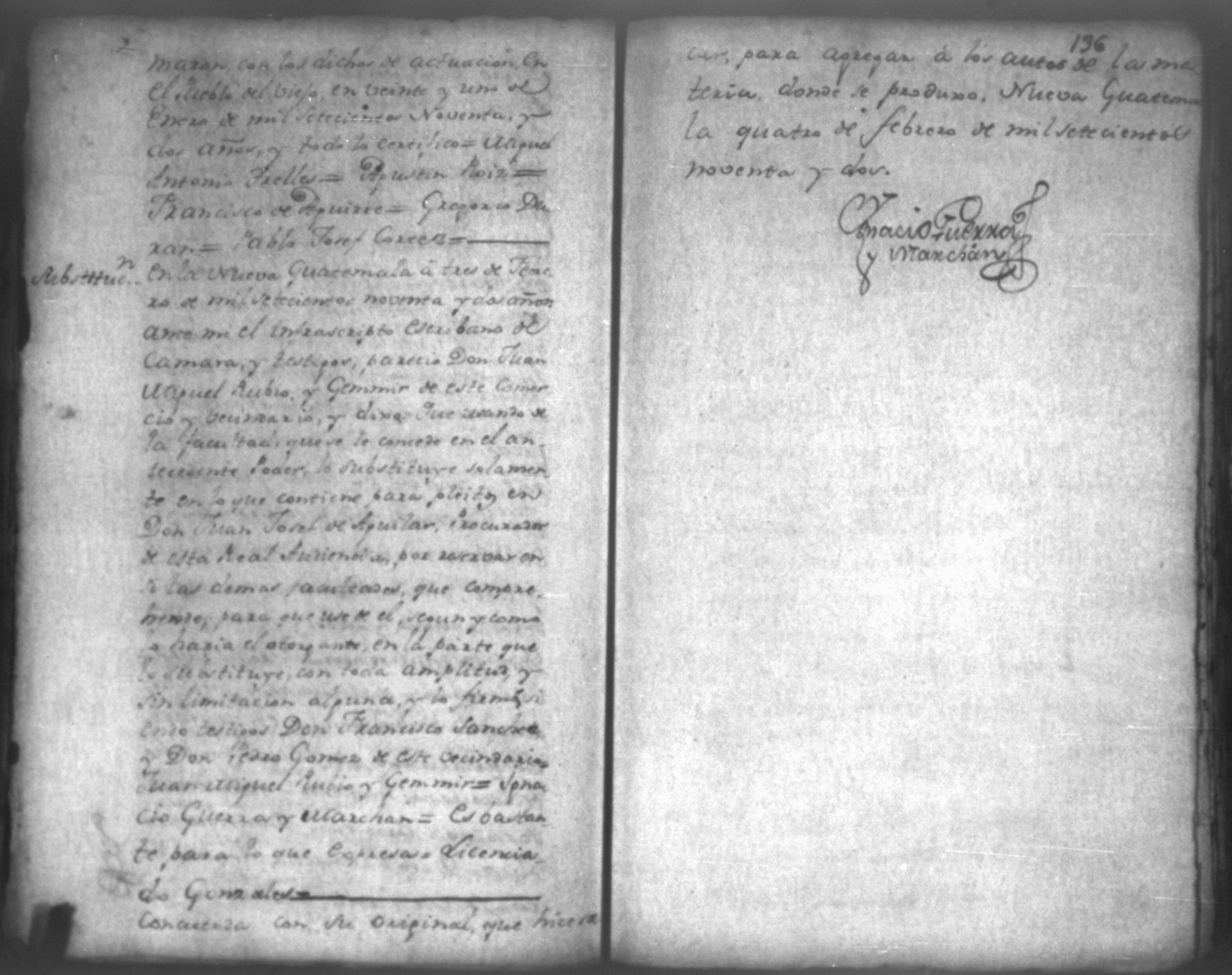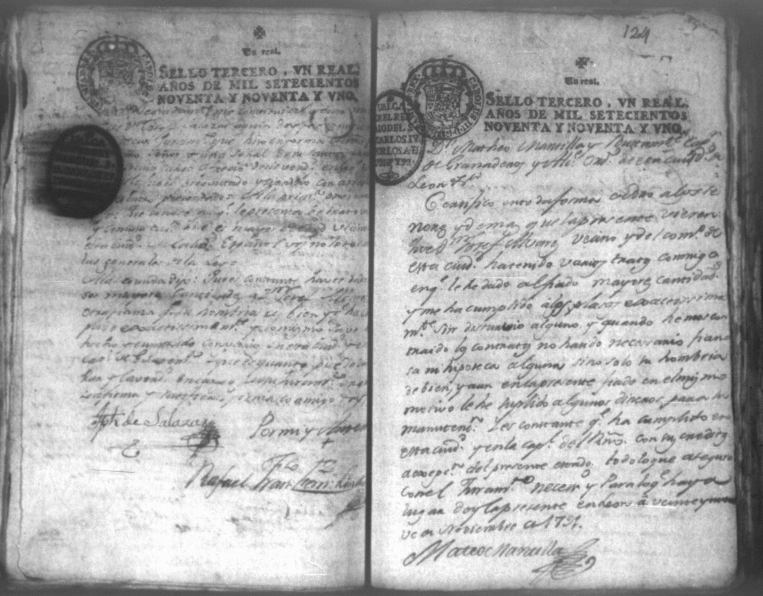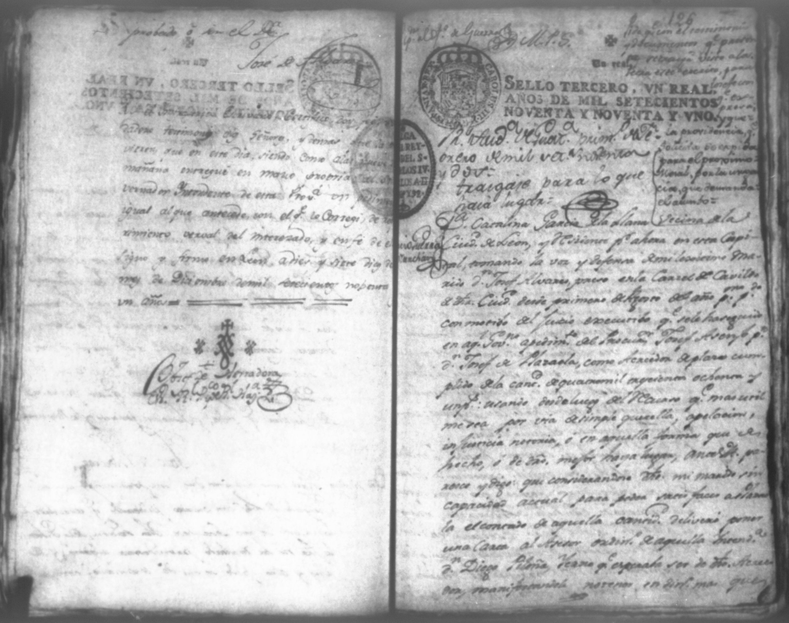 Temática: Audiencia León, 1792. Autos que siguen don José Alvarez y don José Plazaola por cantidad de pesos. Incluye: los Documentos relativos al testimonio de la causa ejecutiva seguida contra don Josef Alvares en el Gobierno e Intendencia de León por cantidad de pesos debidos a don Josef Plazaola (1791). "En la Ciudad de Leon en veinte y tres de Abril de mil setecientos y noventa años: [...] el Escribano y testigos que iran nominados pareció personalmente Don Jossé de Albarez de este vecindario, á quien doy fee conosco, y digo: Que por la presente Escritura Publica otorga en la forma que mas lugar en derecho que deve, y se obliga á dar, y pagar, y que dará y pagará realmente, y con efecto á Don Jossé de Plazaola, vezino del Pueblo del Biejo, ó á quien su Poder, y causa huviere, es á saver la cantidad de ocho mil setecientos sesenta y tres pesos y un real por otra tanto que en generos mercantiles de Castilla, de la tierra que ha vendido al fiado, y se a entregado [...]". (Extracto del folio 1)