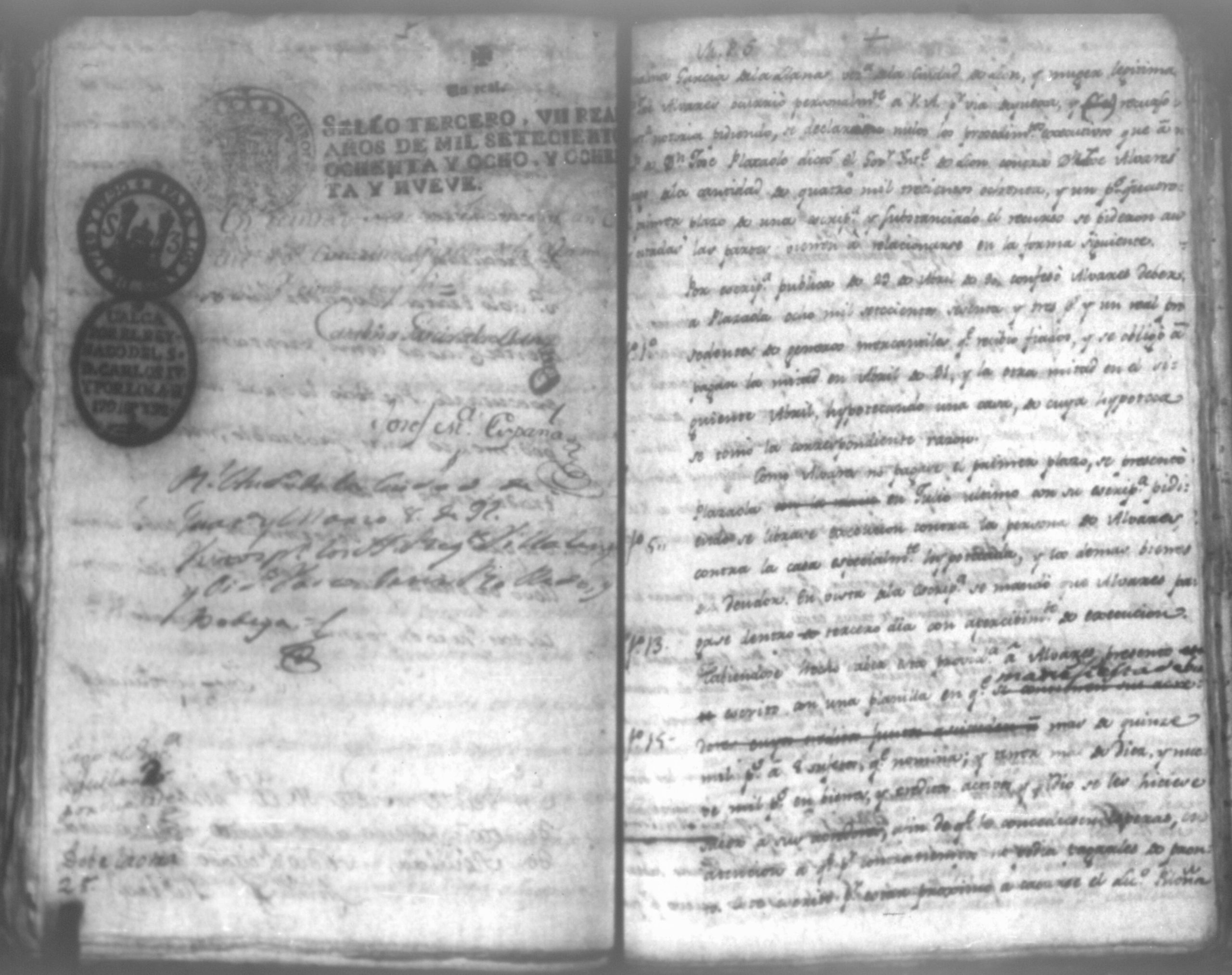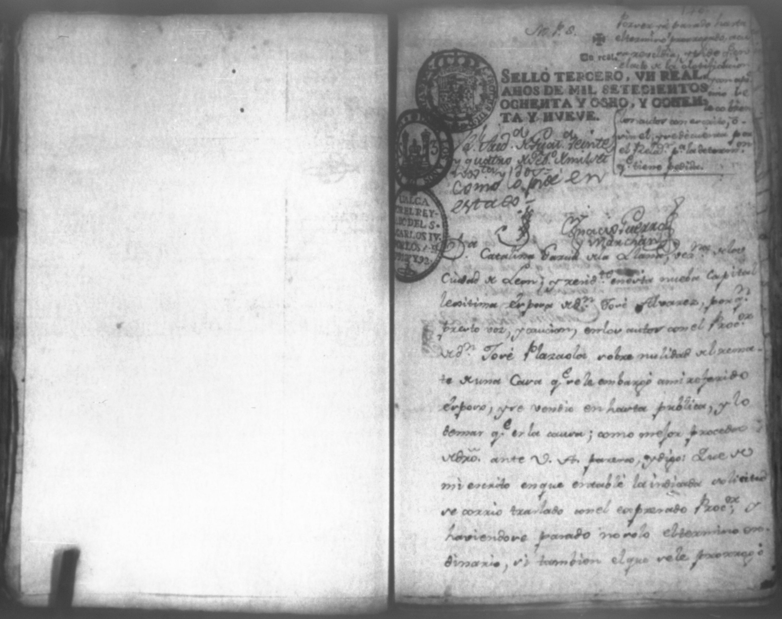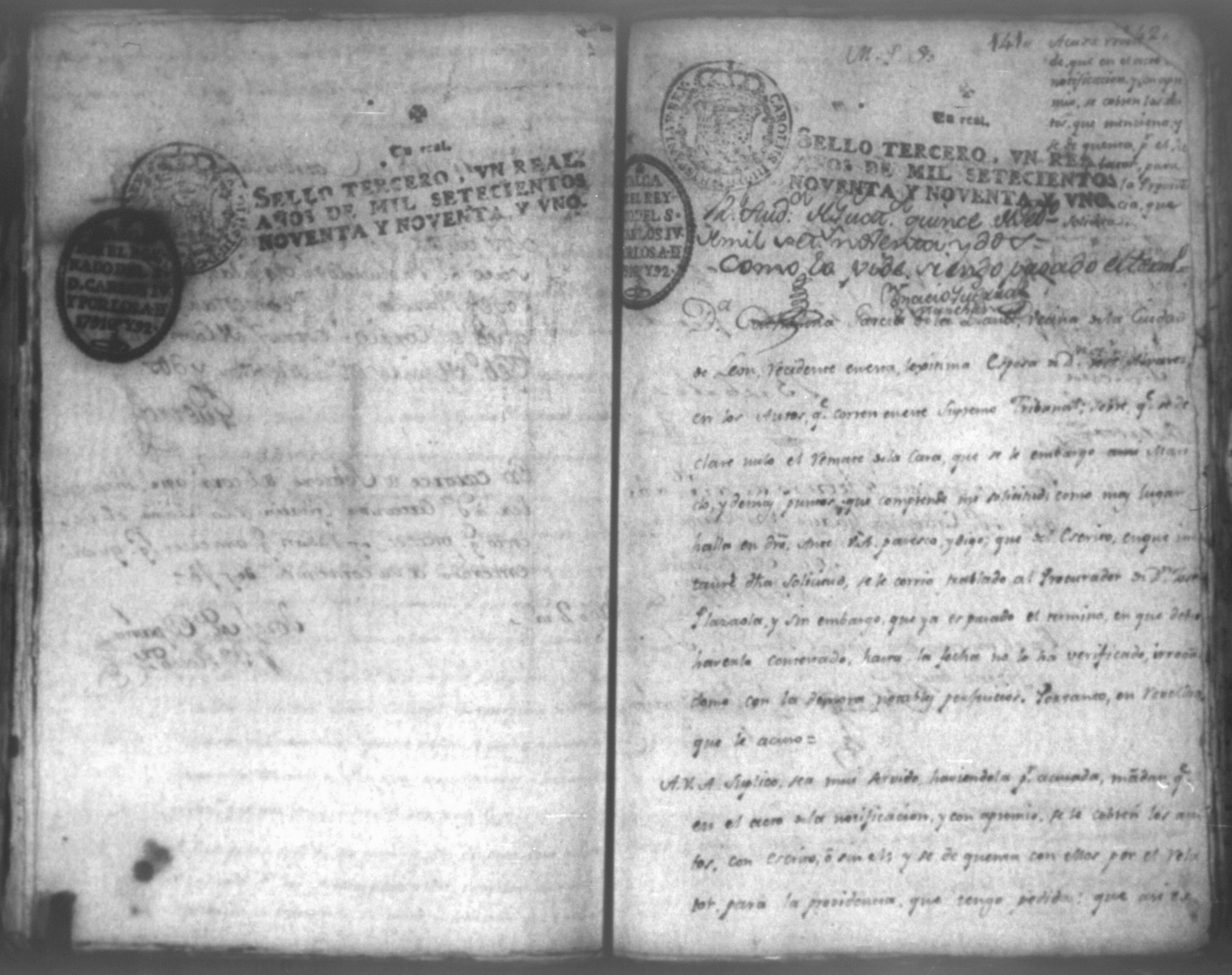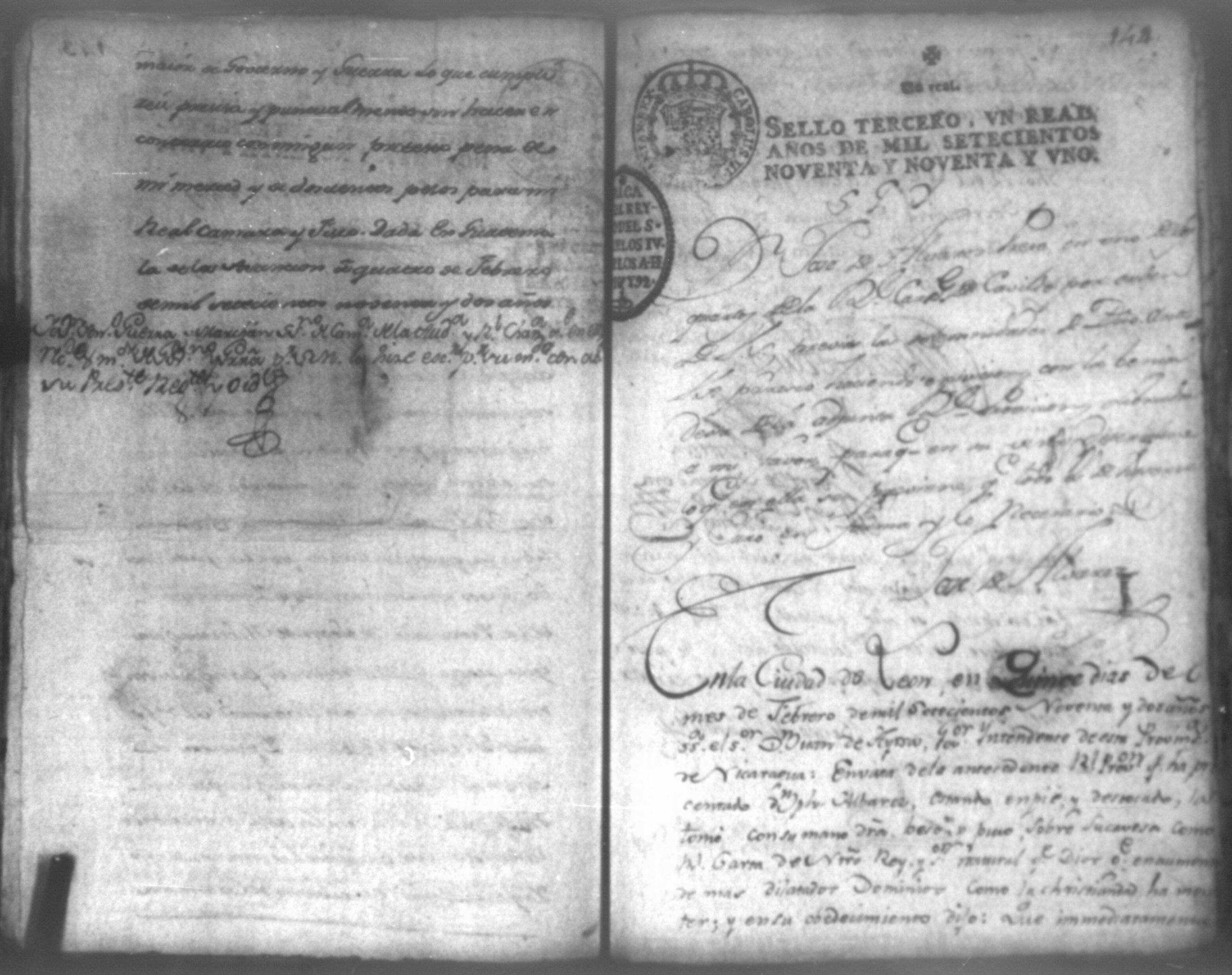 Temática: Audiencia León, 1792. Autos que siguen don José Alvarez y don José Plazaola por cantidad de pesos. Incluye: los Documentos relativos al testimonio de la causa ejecutiva seguida contra don Josef Alvares en el Gobierno e Intendencia de León por cantidad de pesos debidos a don Josef Plazaola (1791). "En la Ciudad de Leon en veinte y tres de Abril de mil setecientos y noventa años: [...] el Escribano y testigos que iran nominados pareció personalmente Don Jossé de Albarez de este vecindario, á quien doy fee conosco, y digo: Que por la presente Escritura Publica otorga en la forma que mas lugar en derecho que deve, y se obliga á dar, y pagar, y que dará y pagará realmente, y con efecto á Don Jossé de Plazaola, vezino del Pueblo del Biejo, ó á quien su Poder, y causa huviere, es á saver la cantidad de ocho mil setecientos sesenta y tres pesos y un real por otra tanto que en generos mercantiles de Castilla, de la tierra que ha vendido al fiado, y se a entregado [...]". (Extracto del folio 1)