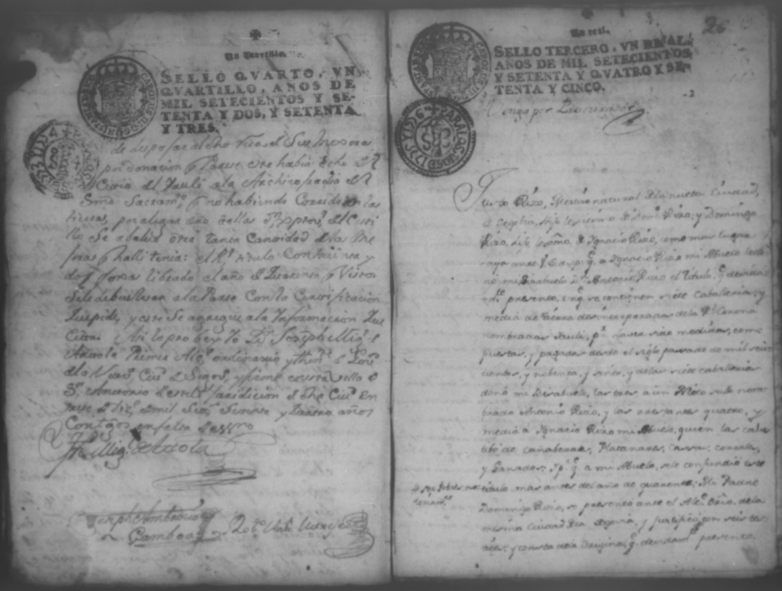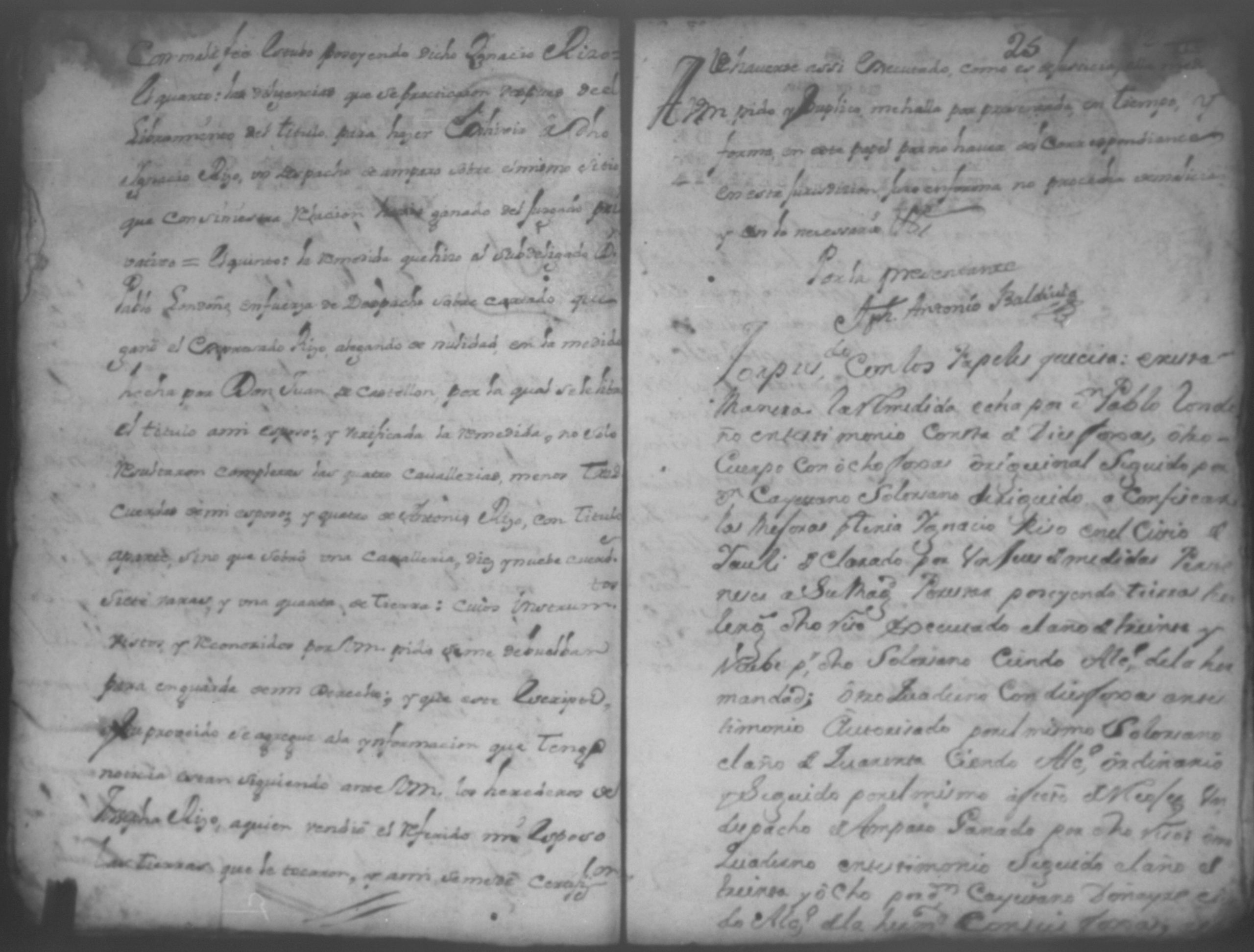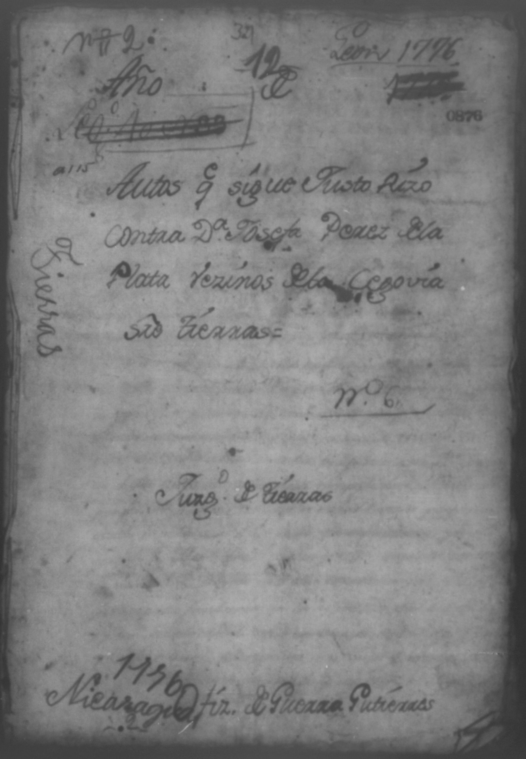 Temática: "Leon 1776. Juzgado de tierras. Autos que sigue Justo Rizo contra Doñan Josefa Perez de la Plata vezinos de la Cegovia Domingo Rizo vecino de la ciudad de Cegovia por mi y a nombre de mis hermanos por quienes presto vos y petición de visto […] ante vuestra merced parezco en la mejor forma […] lugar en dicho y dejo que desde el año de noventa y sinco padeció mi abuelo Don Antonio Rizo entre otros años uno nombrado […] […] jurisdicción como capitán desta Real […] y por […] de dicho mi abuelo dio en la herencia de dicho […] Ygnacio Rizo… "