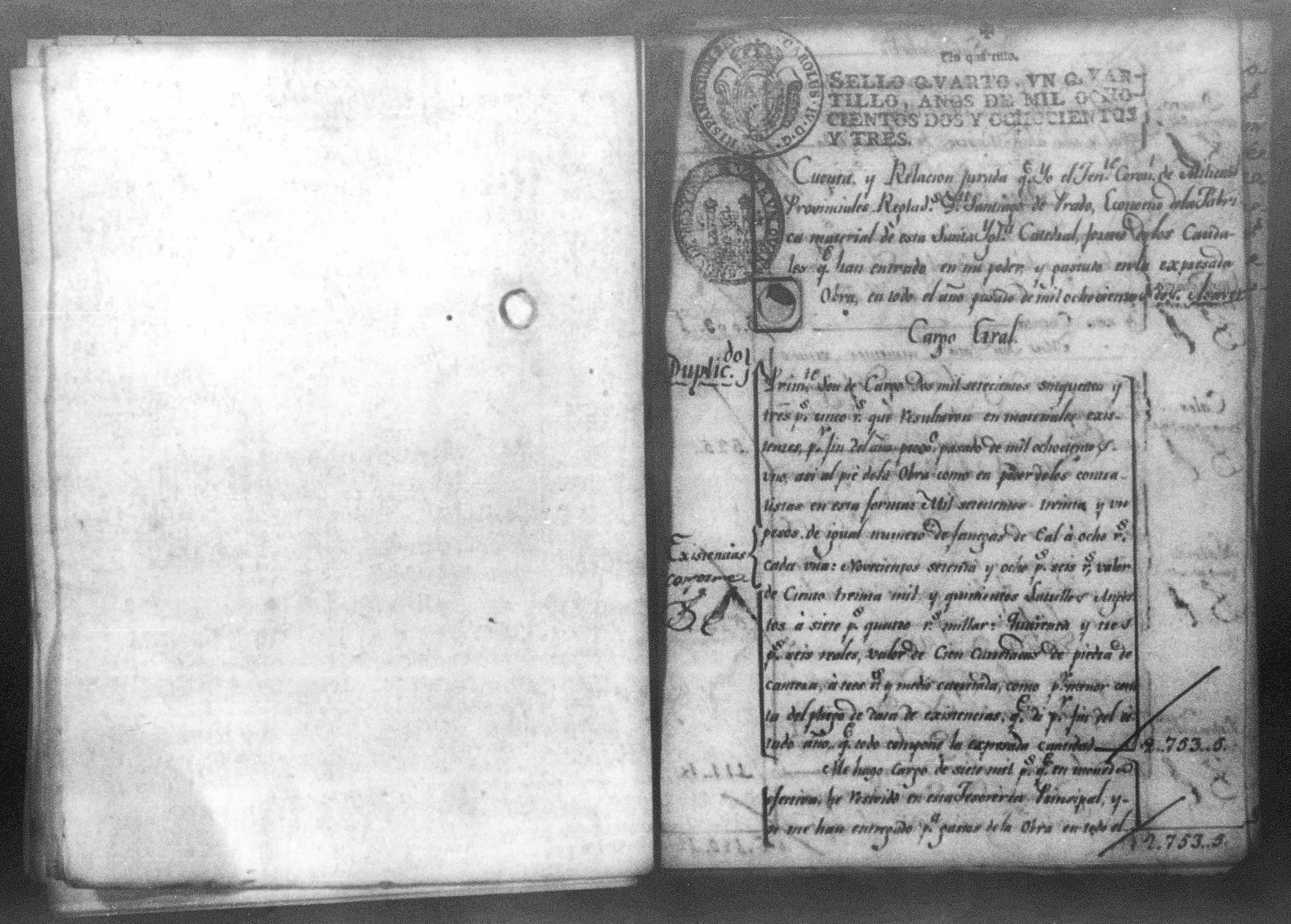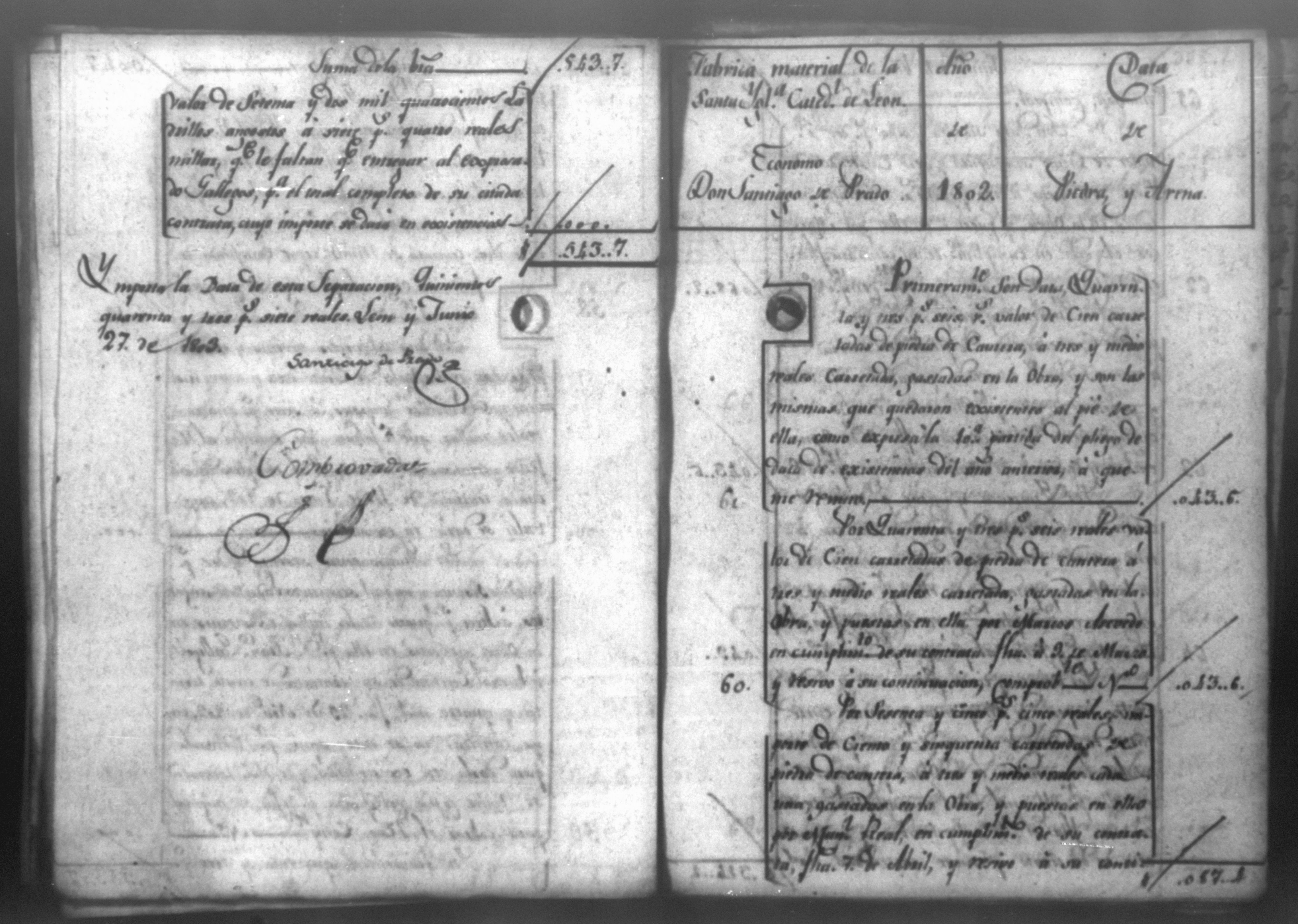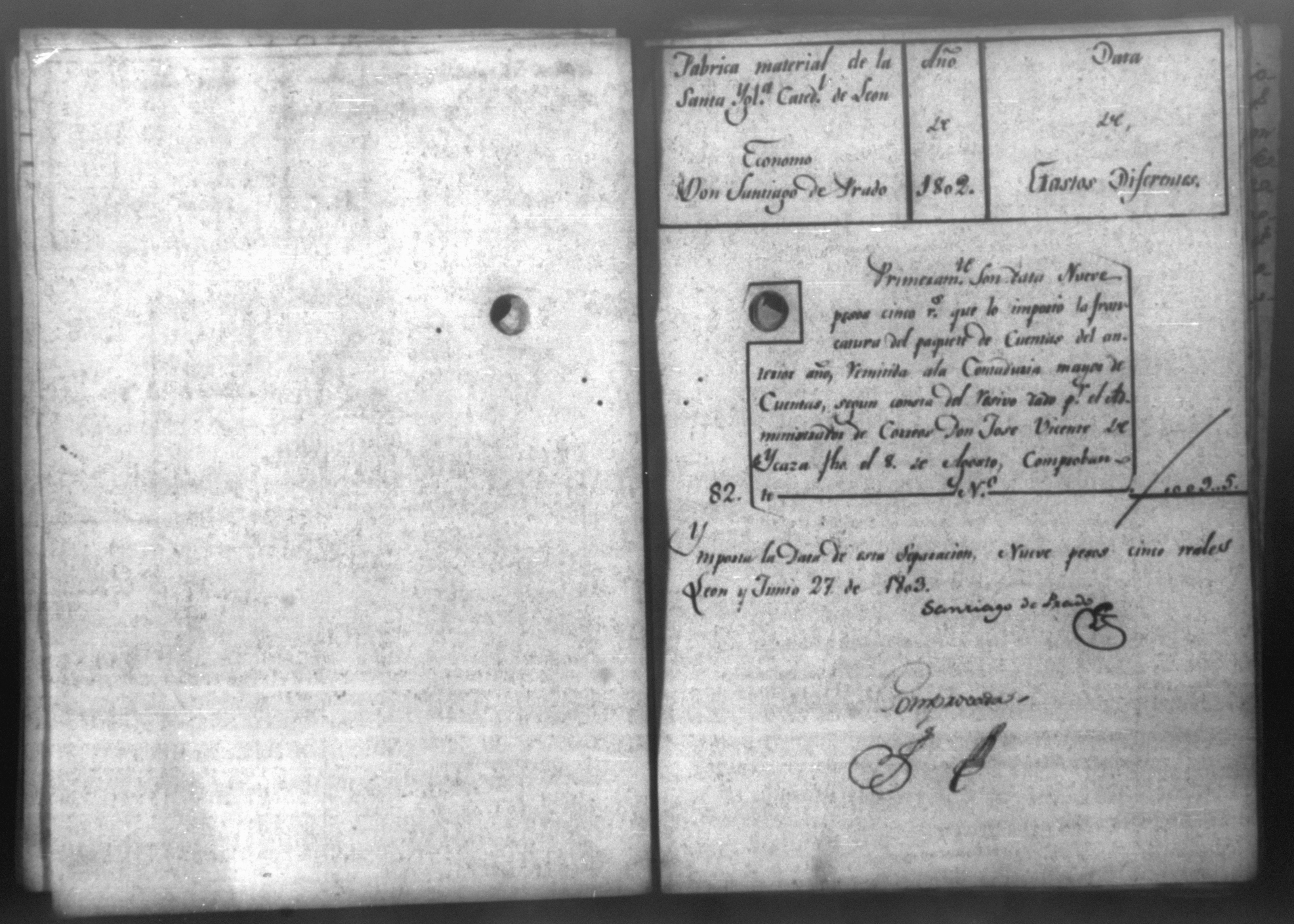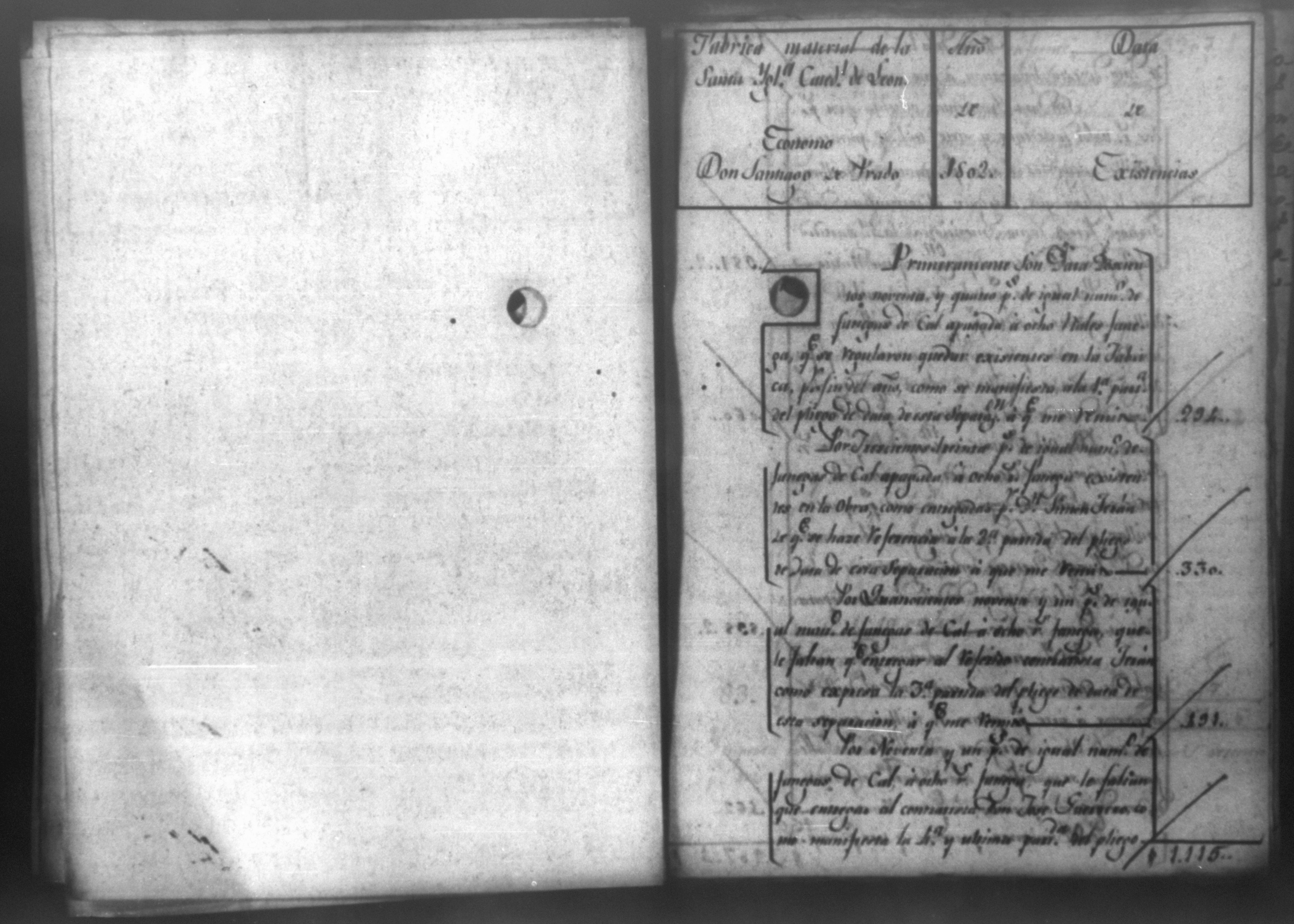 Temática: Año de 1802 Cuenta de Cargo y Data de la obra material de esta Santa Yglesia Catedral de Leon, correspondiente a dicho Año. Fabrica material de la Santa Yglesia Catedral de Leon. Economo Don Santiago de Prado. Año de 1802 Cargo de excistencias. Primeramente son de Cargo Trescientos sesenta y seis pesos de igual numero de fanegas de cal apagada al precio de ocho reales fanega