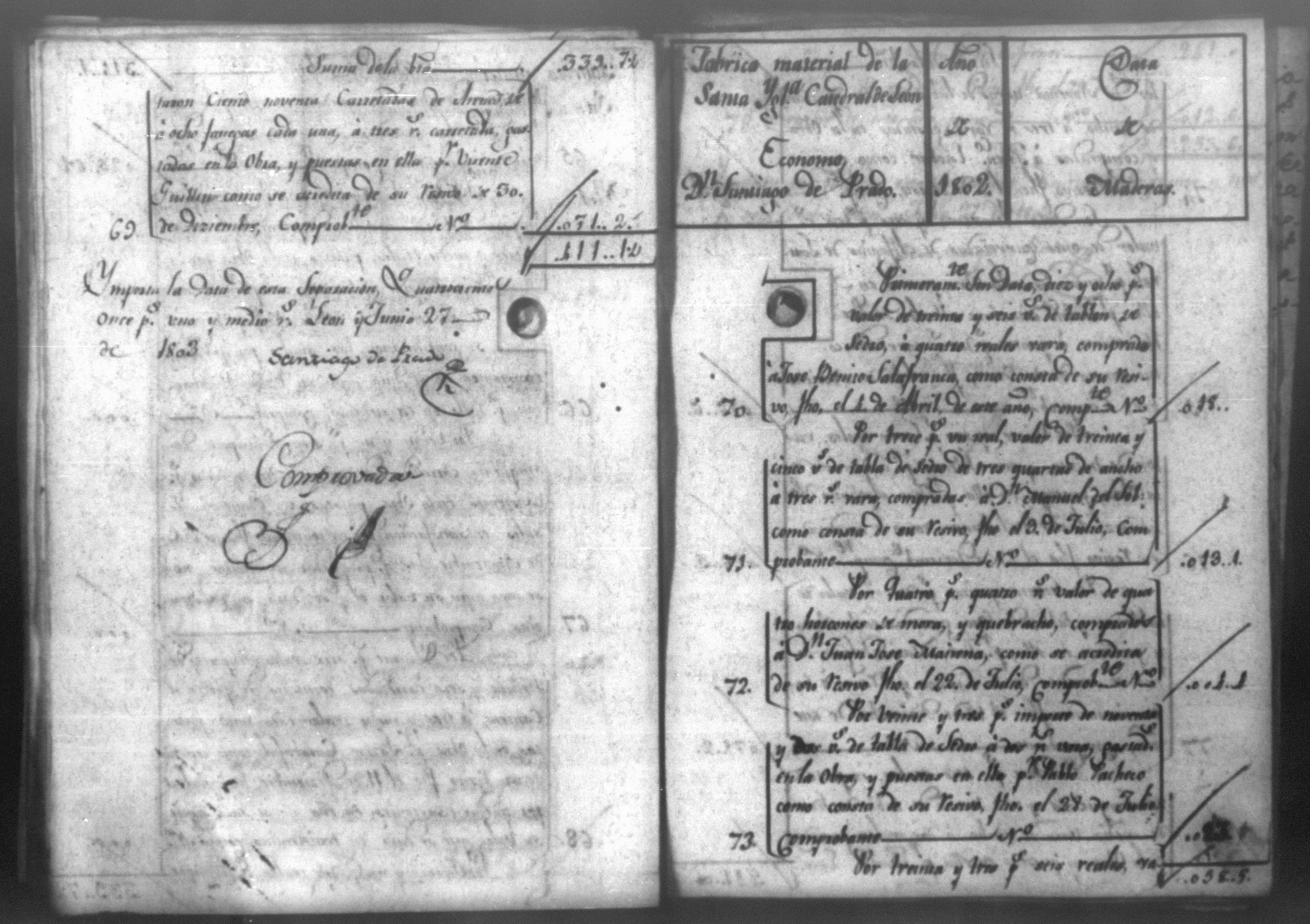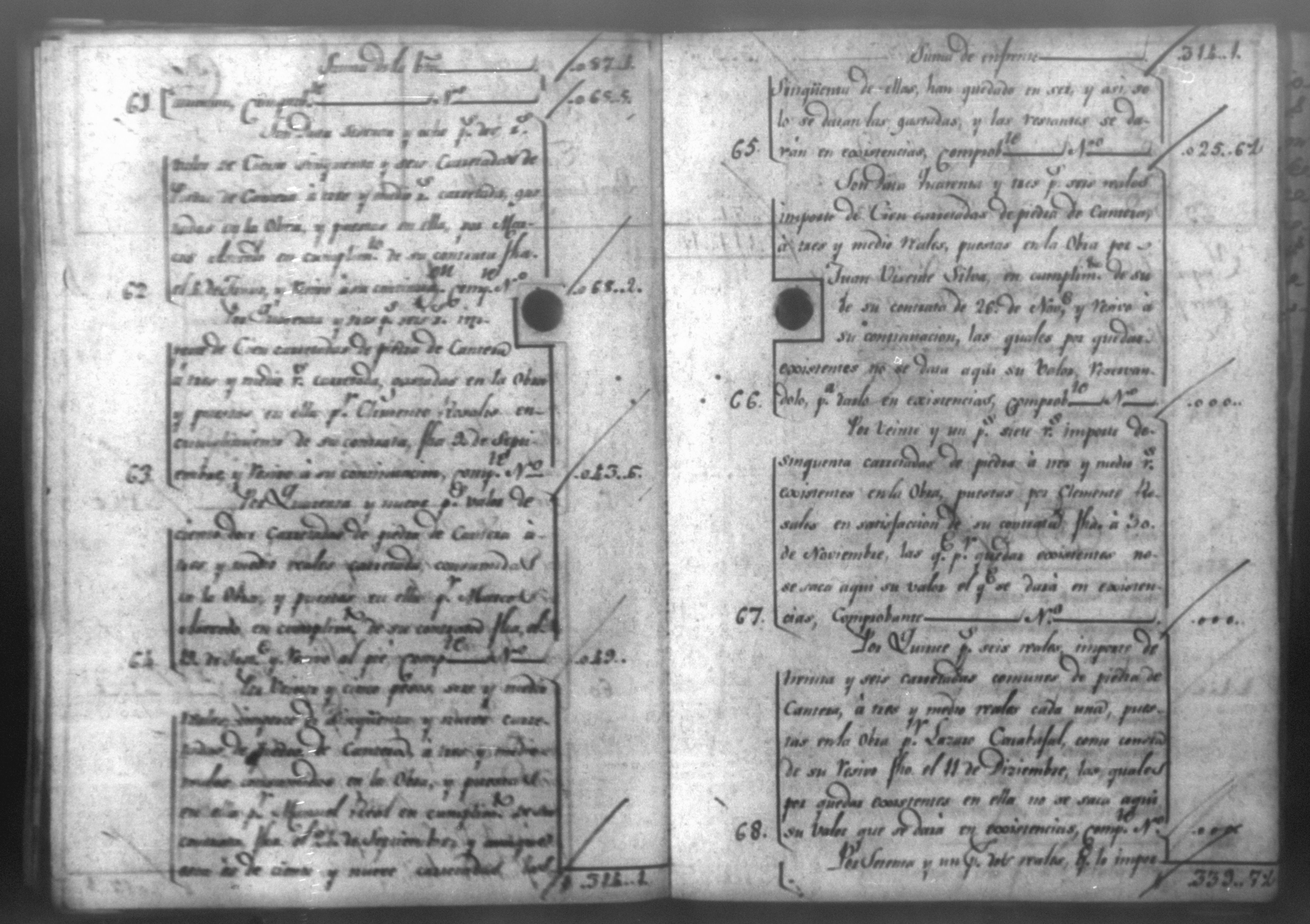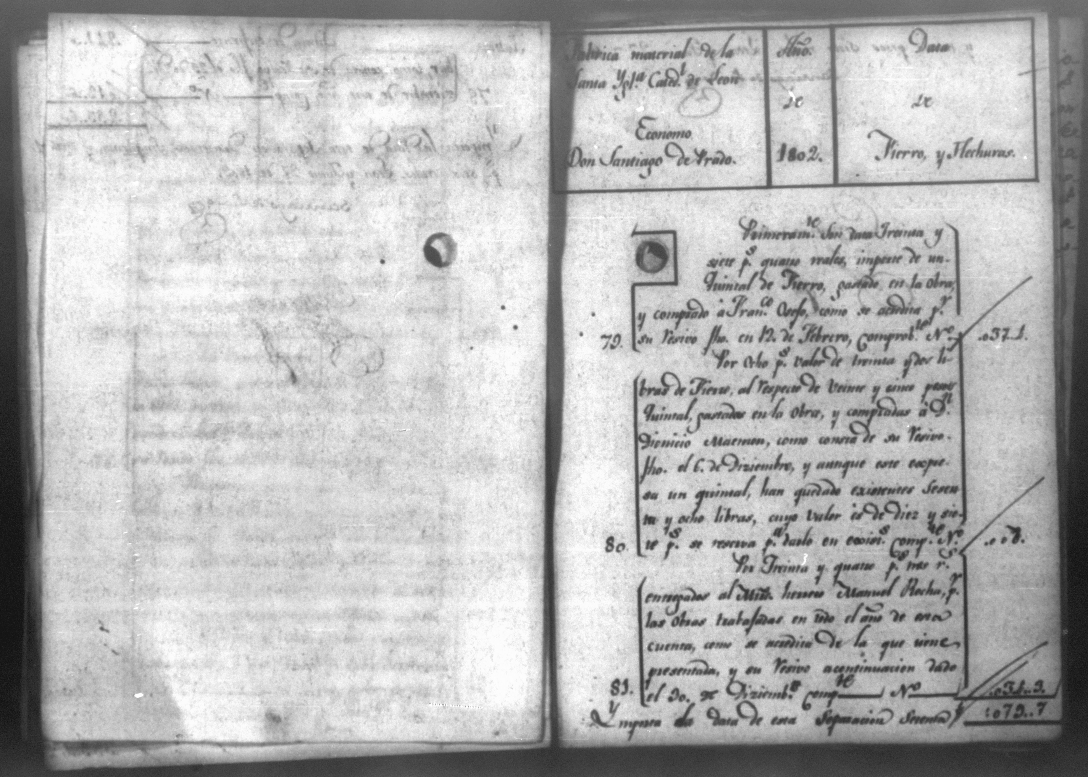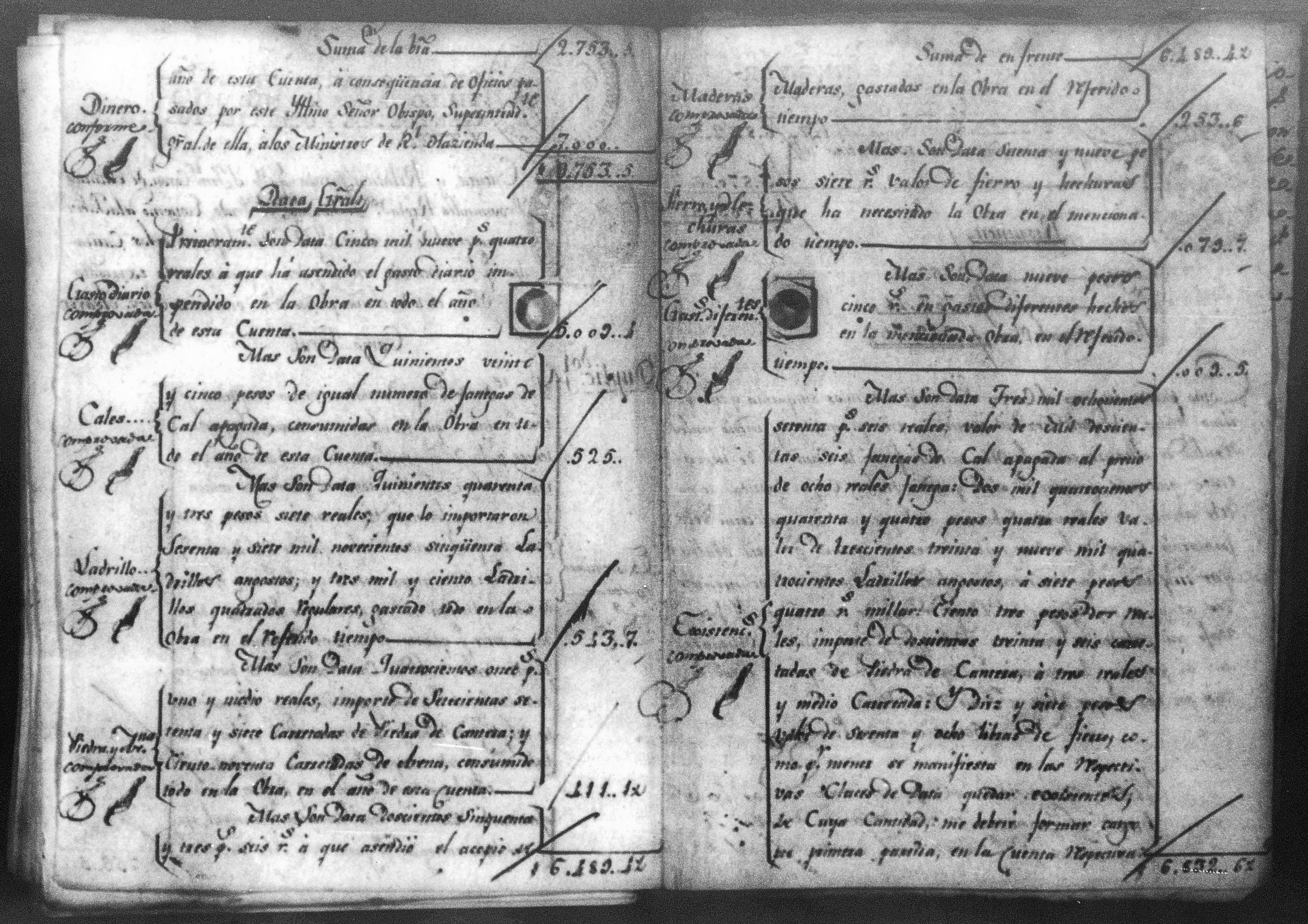 Temática: Año de 1802 Cuenta de Cargo y Data de la obra material de esta Santa Yglesia Catedral de Leon, correspondiente a dicho Año. Fabrica material de la Santa Yglesia Catedral de Leon. Economo Don Santiago de Prado. Año de 1802 Cargo de excistencias. Primeramente son de Cargo Trescientos sesenta y seis pesos de igual numero de fanegas de cal apagada al precio de ocho reales fanega