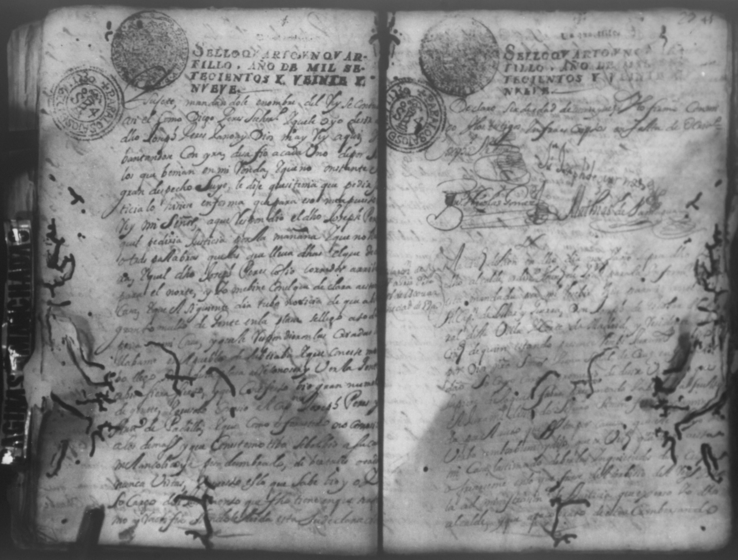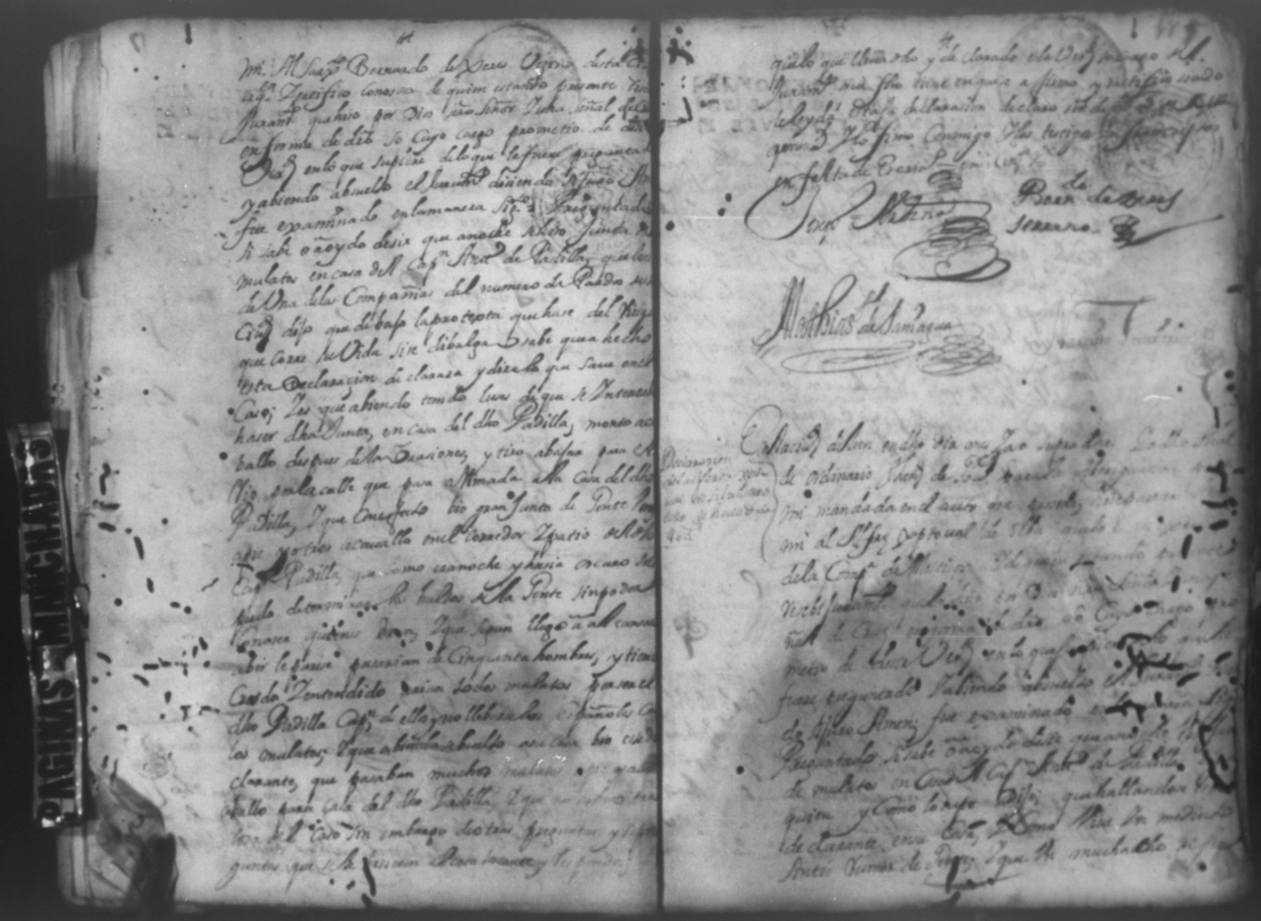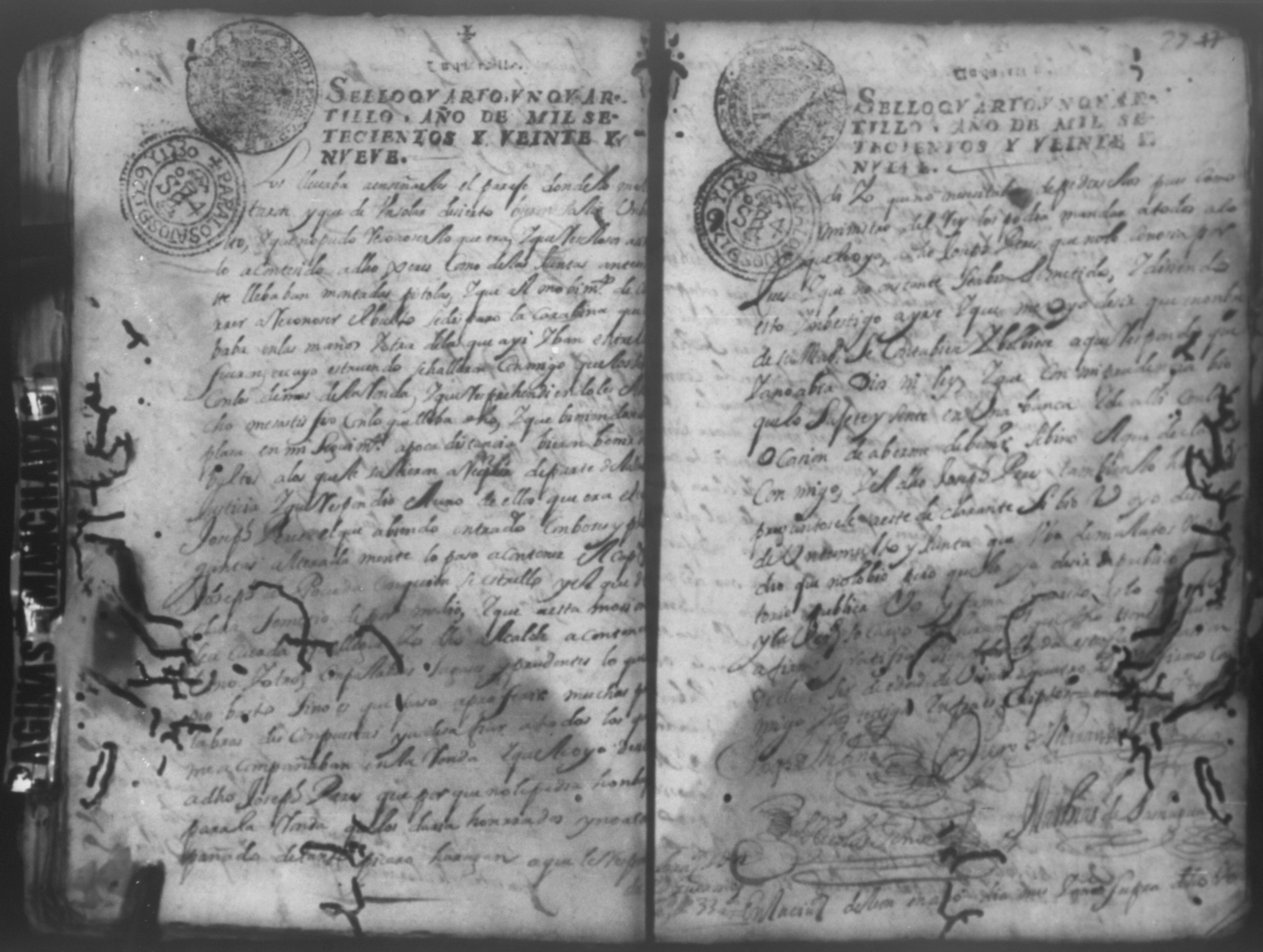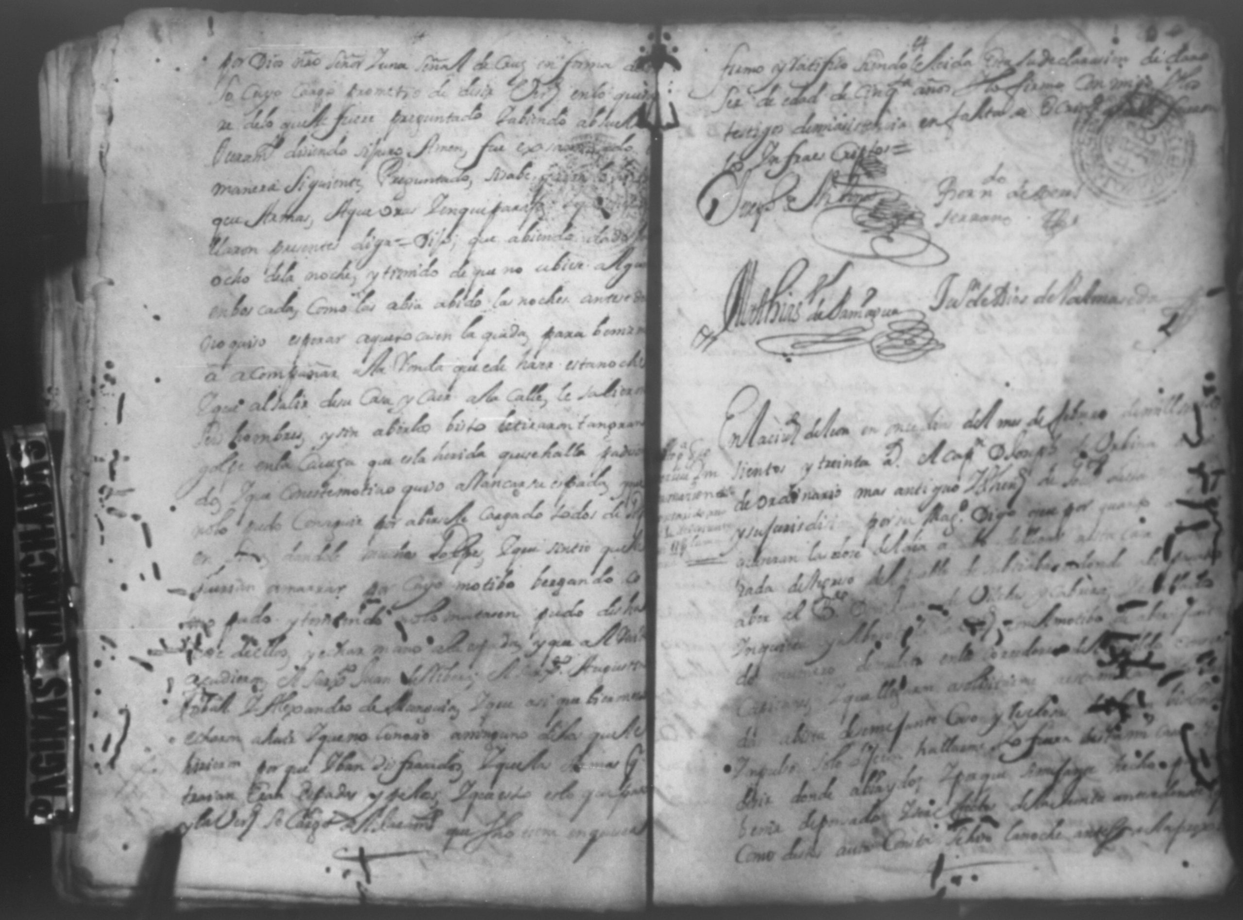 Temática: Leon 1729. Causa Criminal seguida de oficcion por la Real Justizia contra Juan Rafael de Espinosa, ygnazio de Sequeira y [Derifio] Javier la executa de [yncautos] en la pugna [...] de [sargento] Mayor en que prohiben los duelos y desafios. Firma de Mathias de Samagua. Documentos hace mención de varias causas criminales. Expediente contiene varias paginas con manchas por humedad.
