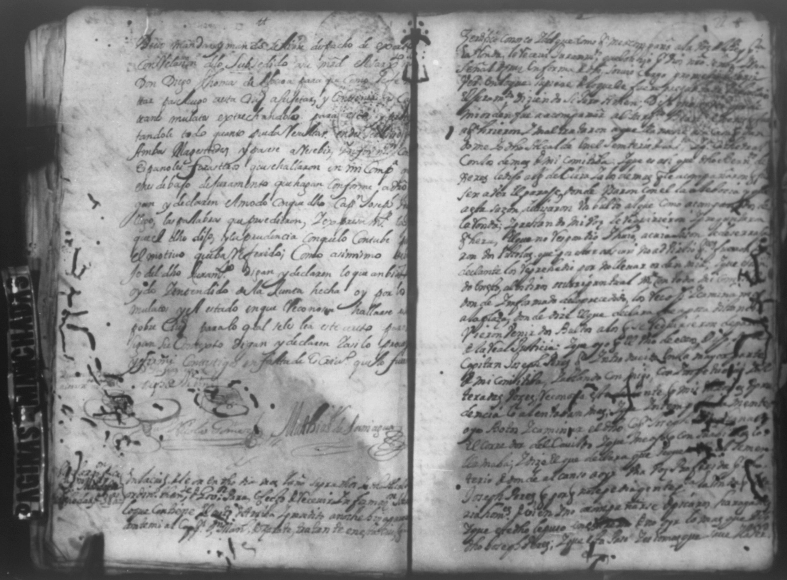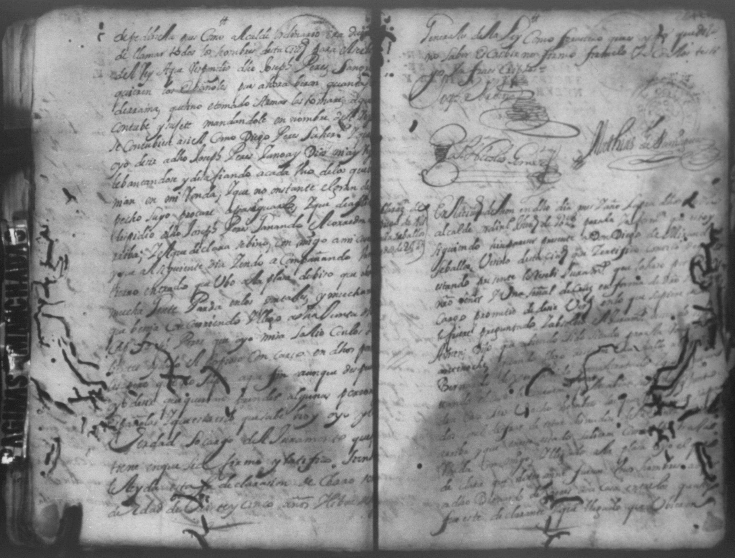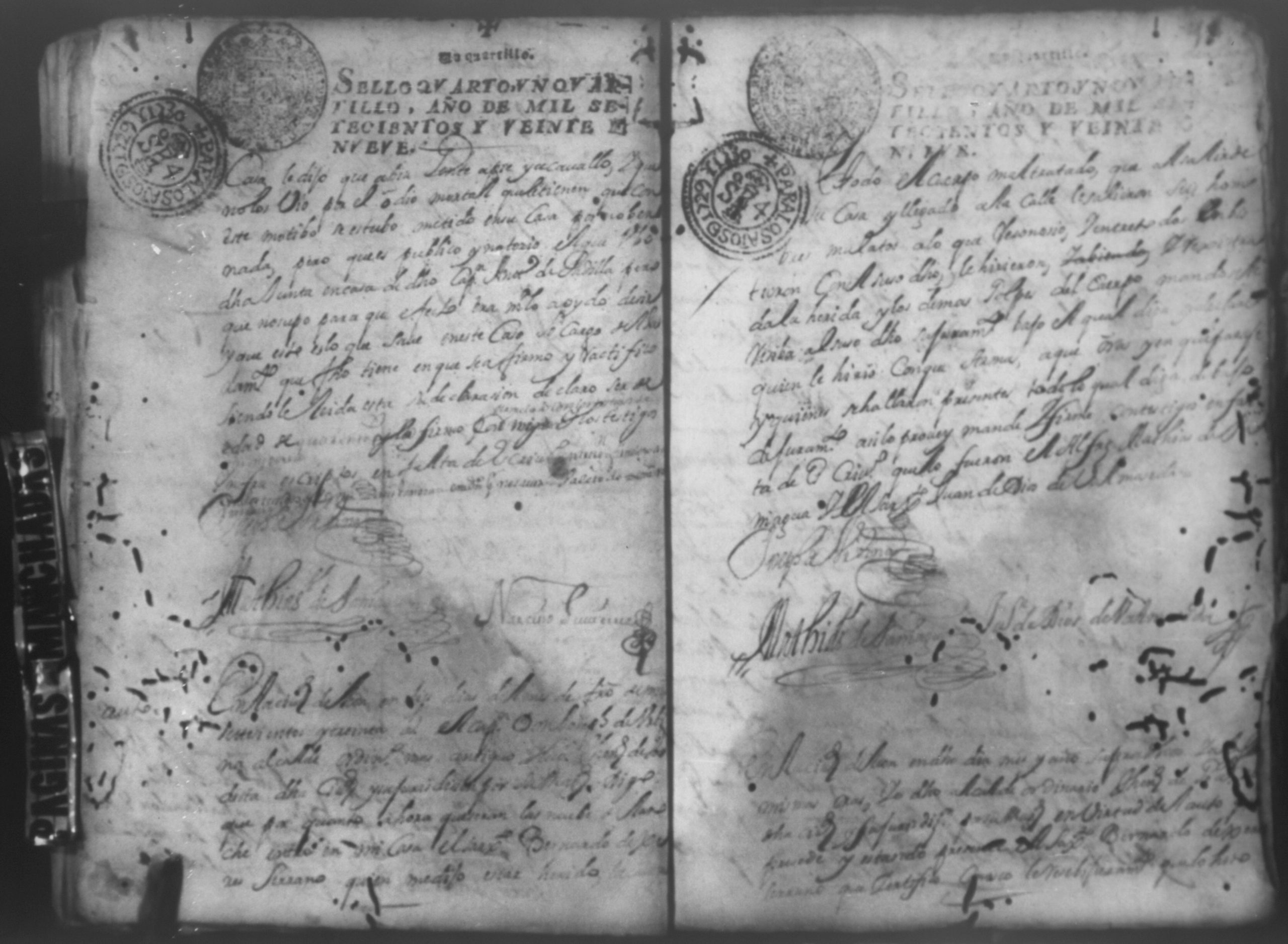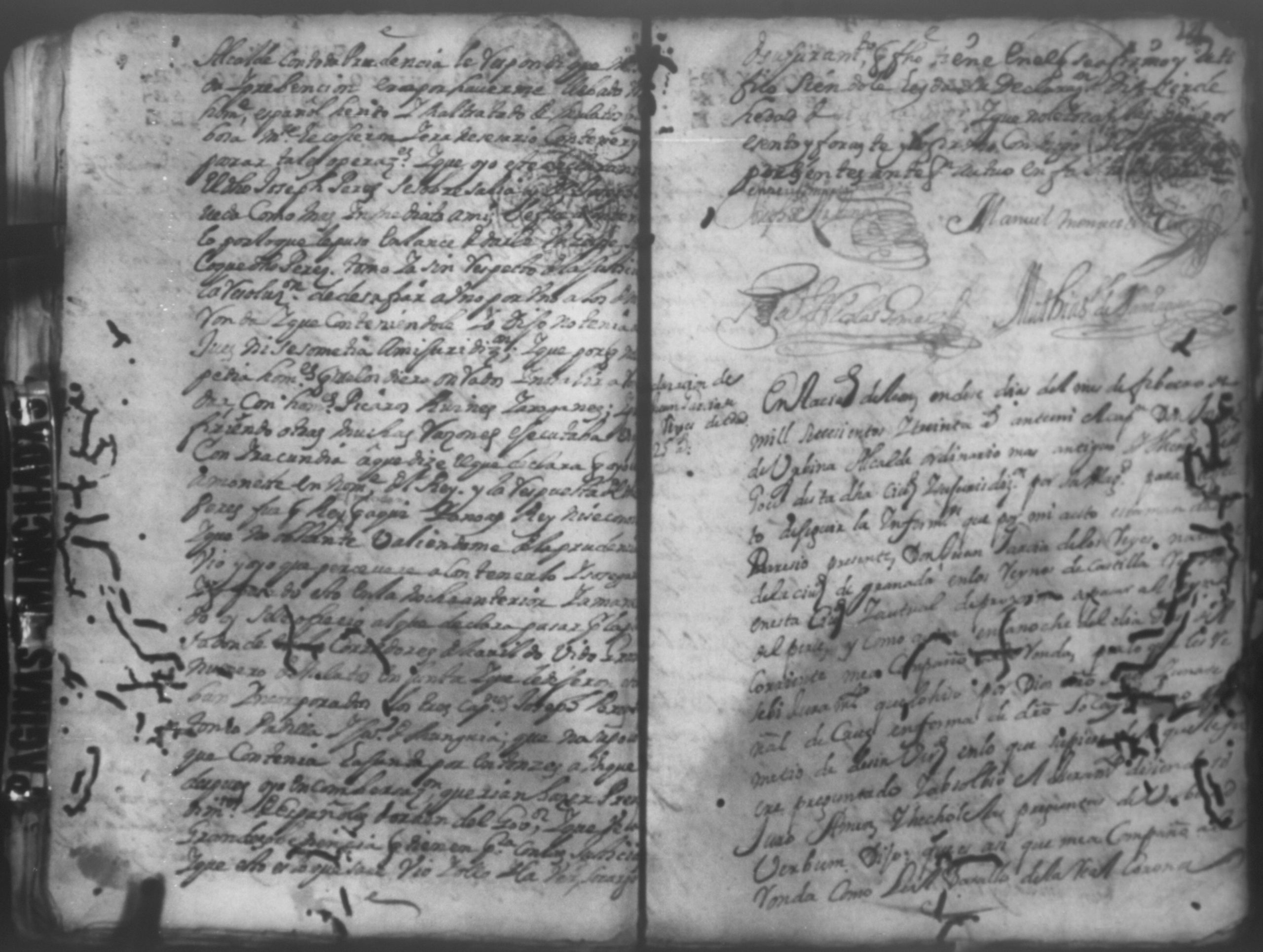 Temática: Leon 1729. Causa Criminal seguida de oficcion por la Real Justizia contra Juan Rafael de Espinosa, ygnazio de Sequeira y [Derifio] Javier la executa de [yncautos] en la pugna [...] de [sargento] Mayor en que prohiben los duelos y desafios. Firma de Mathias de Samagua. Documentos hace mención de varias causas criminales. Expediente contiene varias paginas con manchas por humedad.