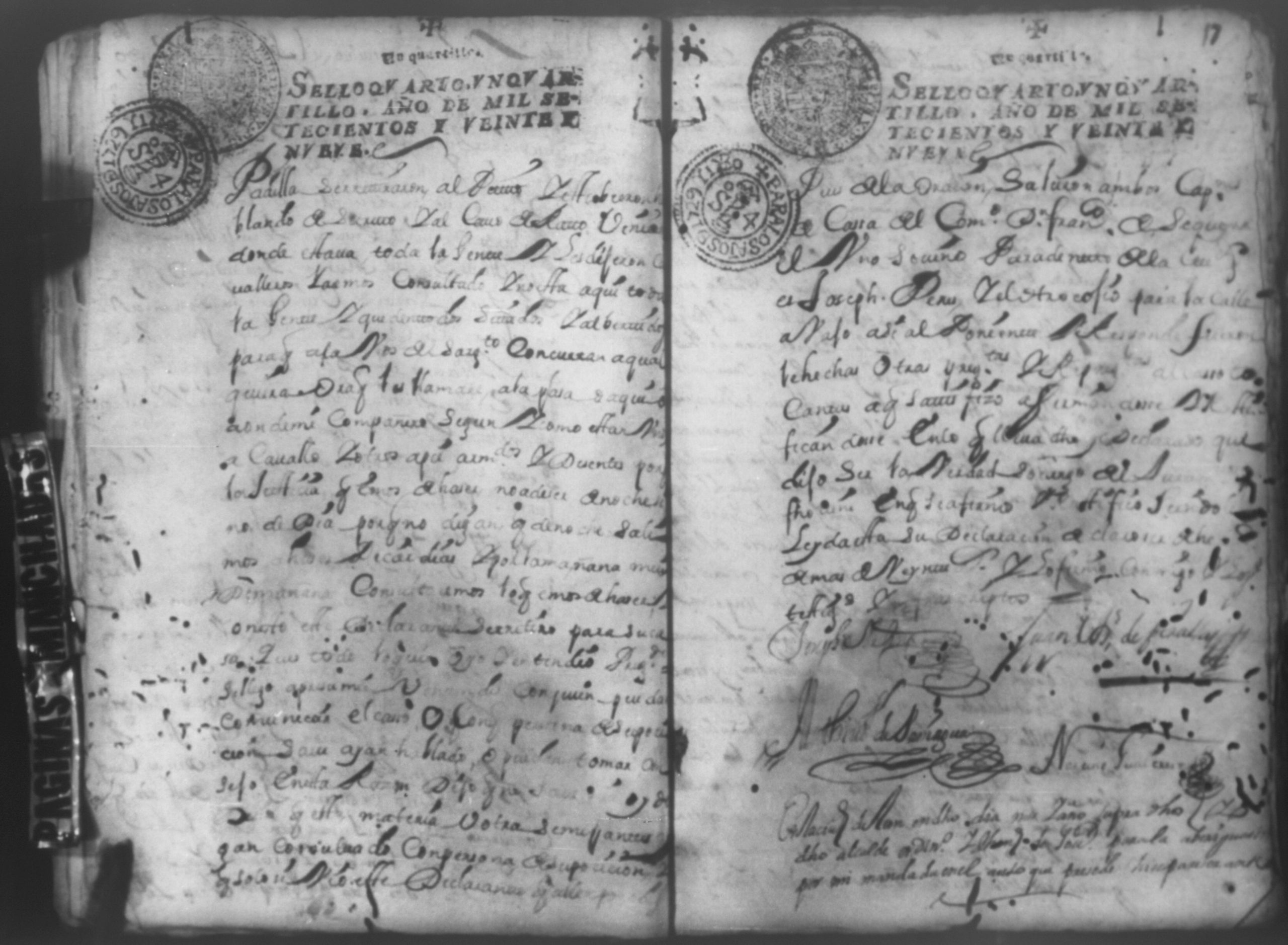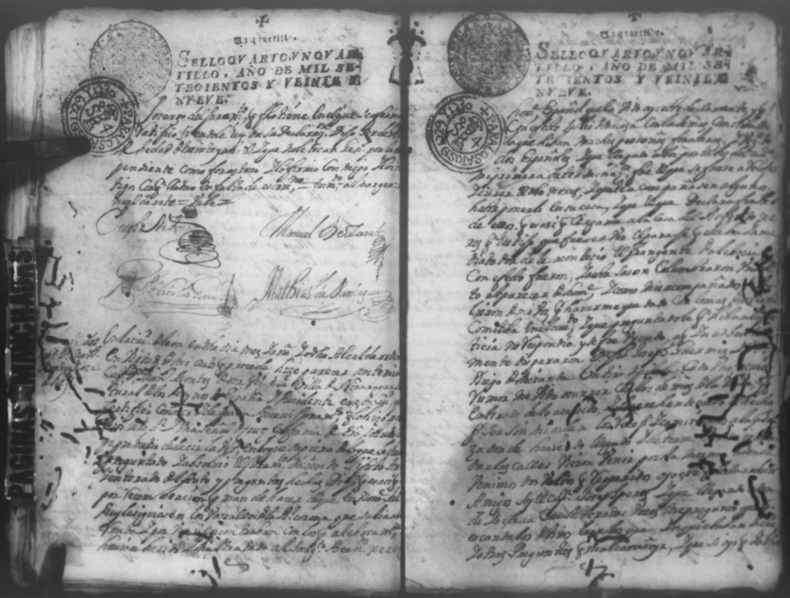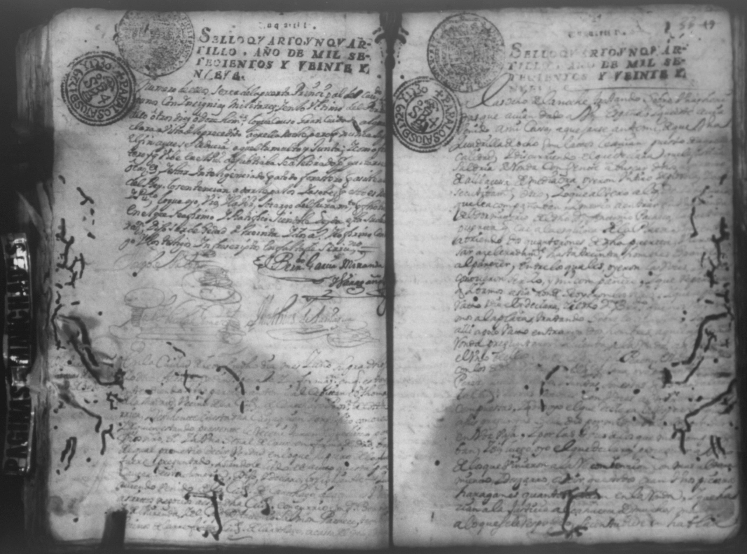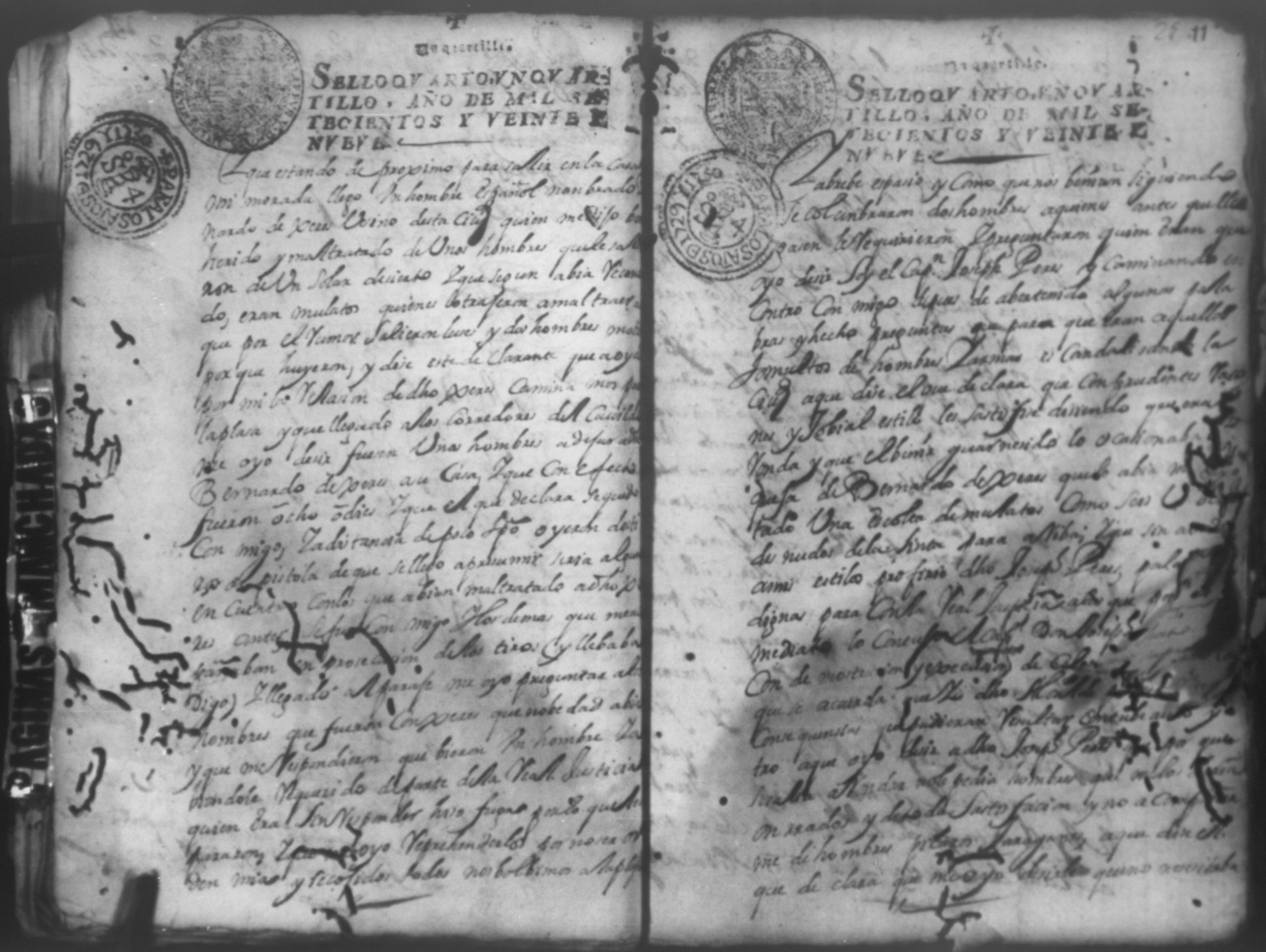 Temática: Leon 1729. Causa Criminal seguida de oficcion por la Real Justizia contra Juan Rafael de Espinosa, ygnazio de Sequeira y [Derifio] Javier la executa de [yncautos] en la pugna [...] de [sargento] Mayor en que prohiben los duelos y desafios. Firma de Mathias de Samagua. Documentos hace mención de varias causas criminales. Expediente contiene varias paginas con manchas por humedad.