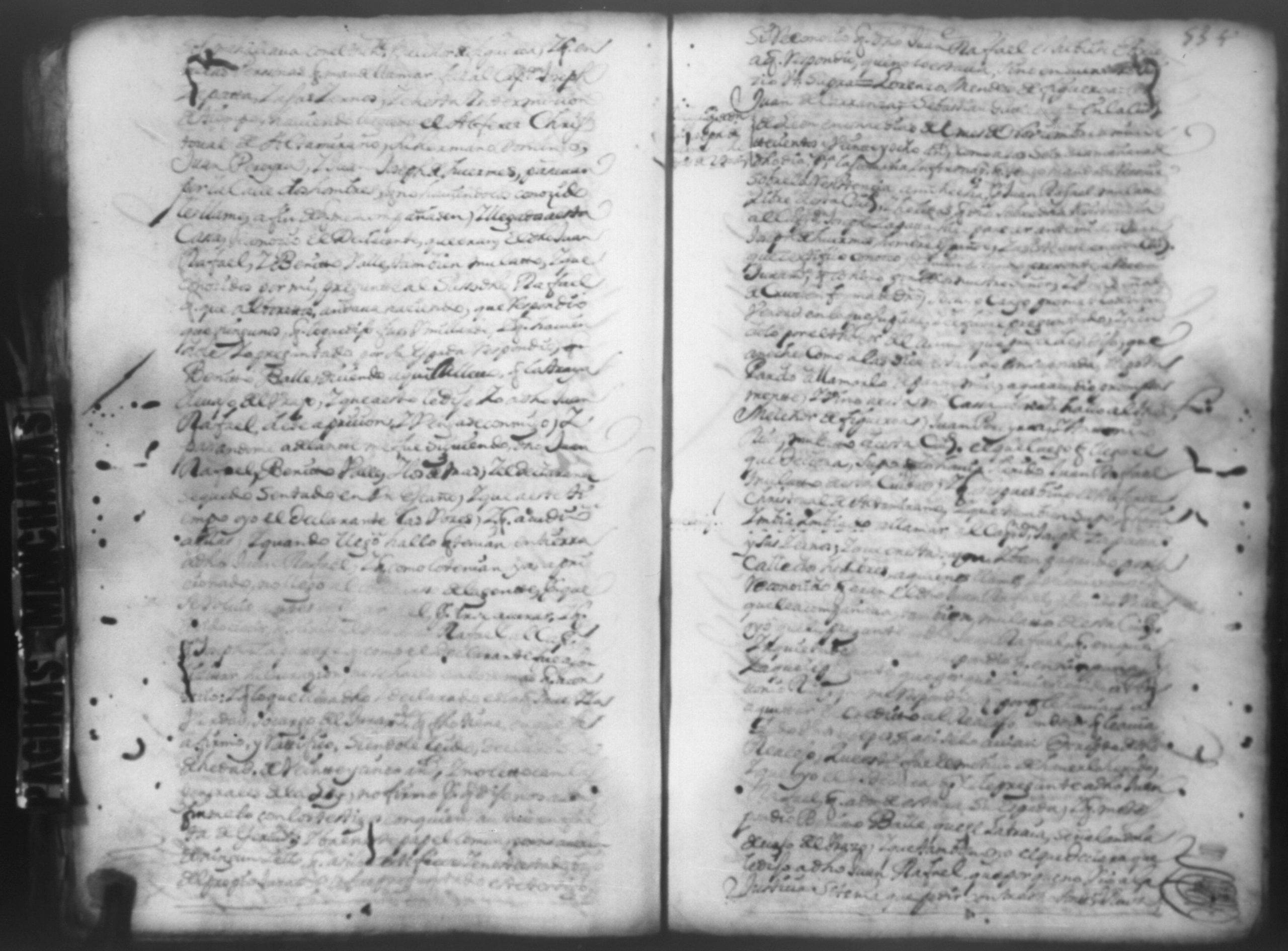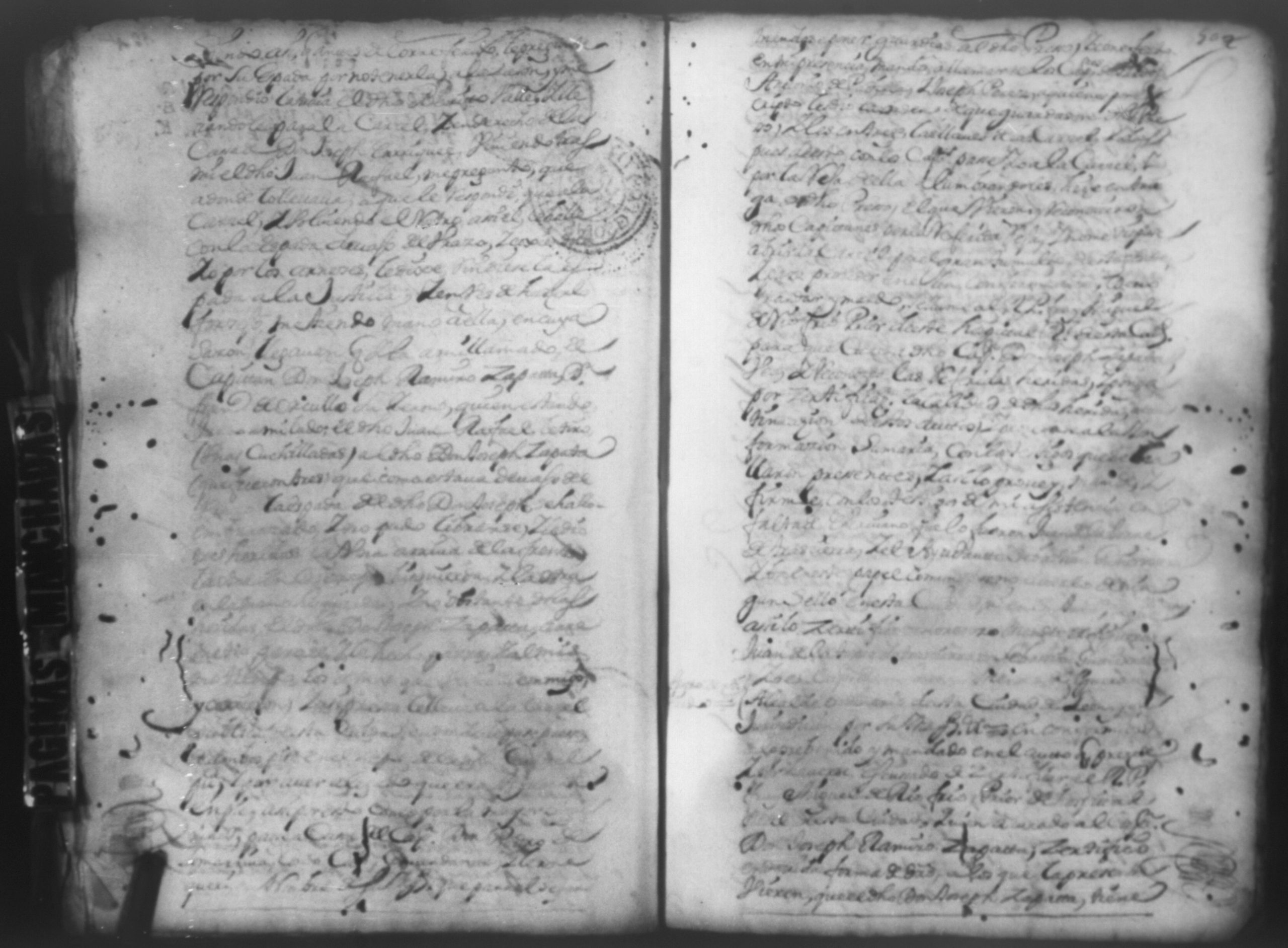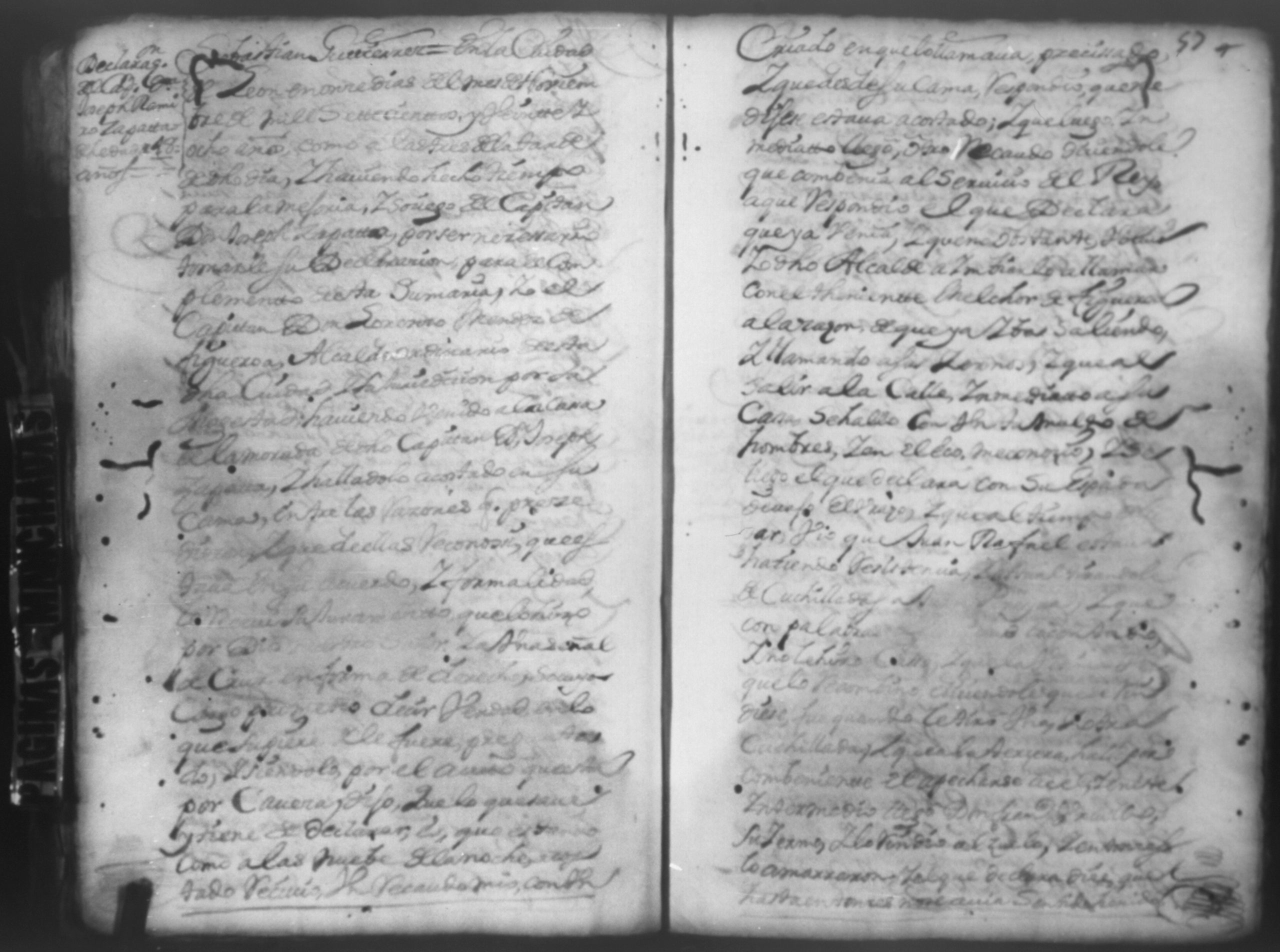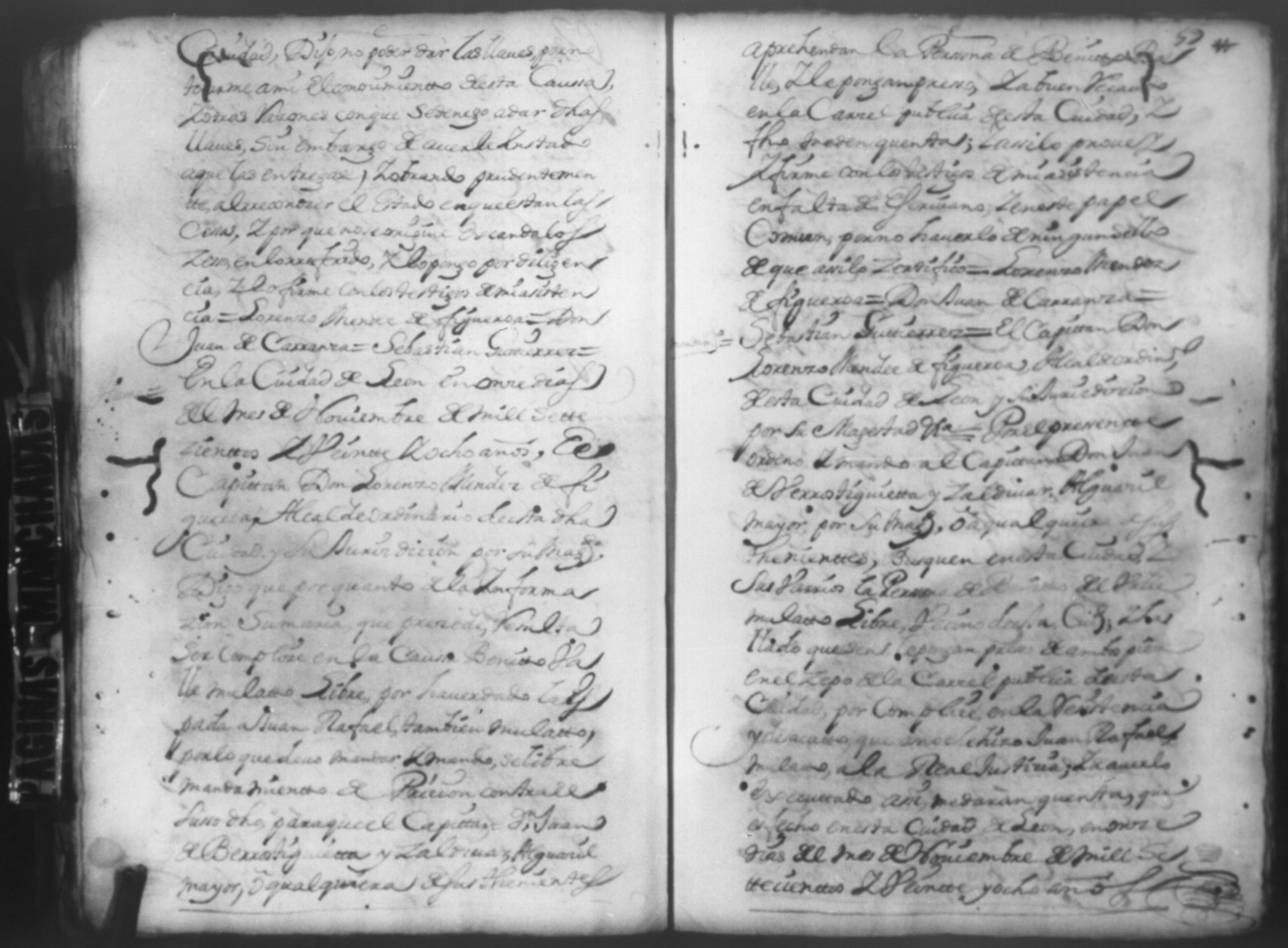 Temática: Leon 1729. Causa Criminal seguida de oficcion por la Real Justizia contra Juan Rafael de Espinosa, ygnazio de Sequeira y [Derifio] Javier la executa de [yncautos] en la pugna [...] de [sargento] Mayor en que prohiben los duelos y desafios. Firma de Mathias de Samagua. Documentos hace mención de varias causas criminales. Expediente contiene varias paginas con manchas por humedad.