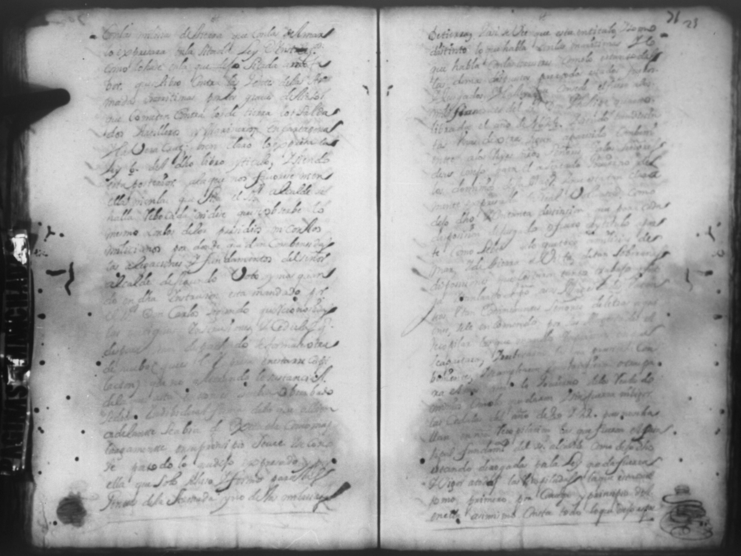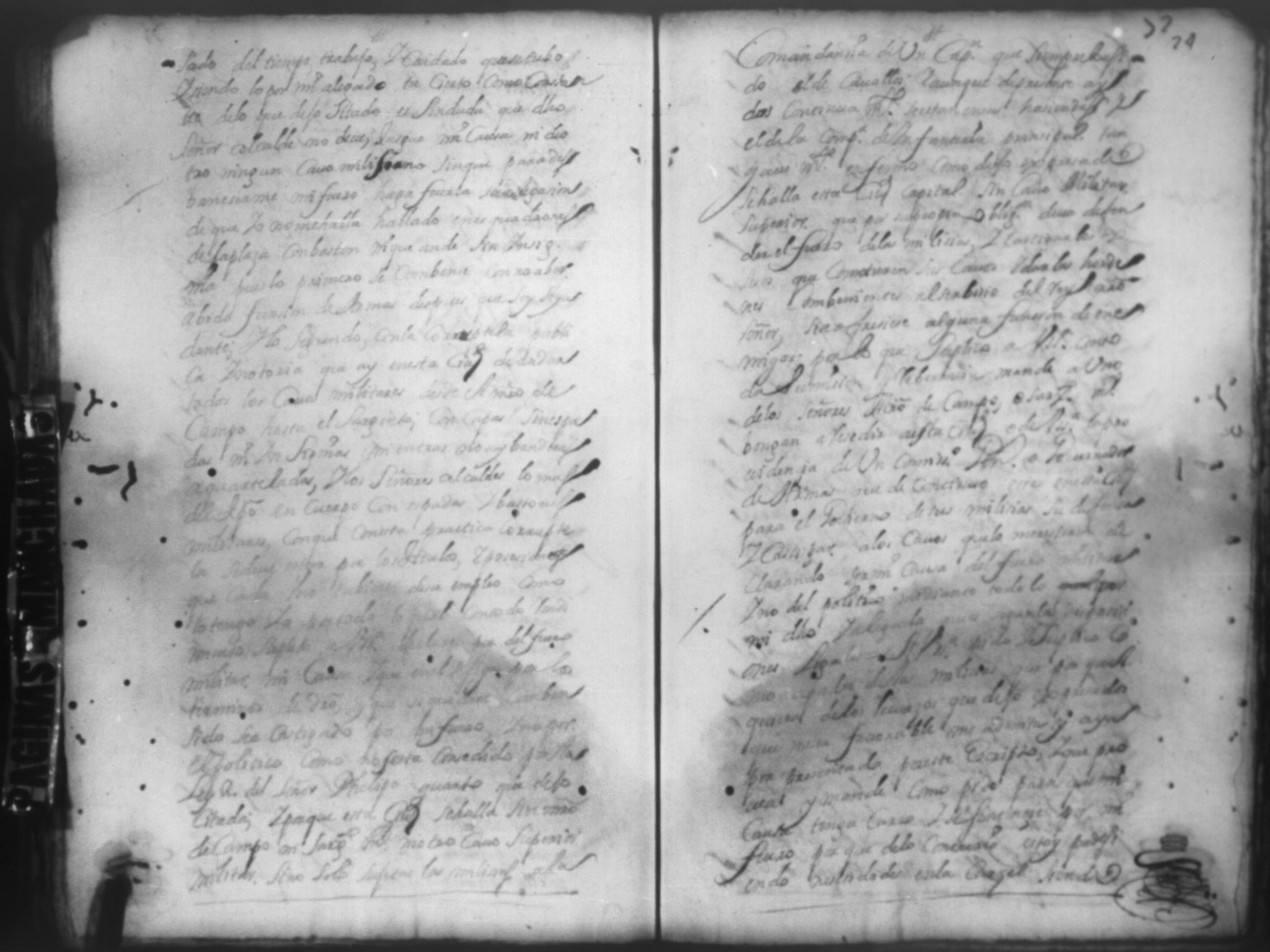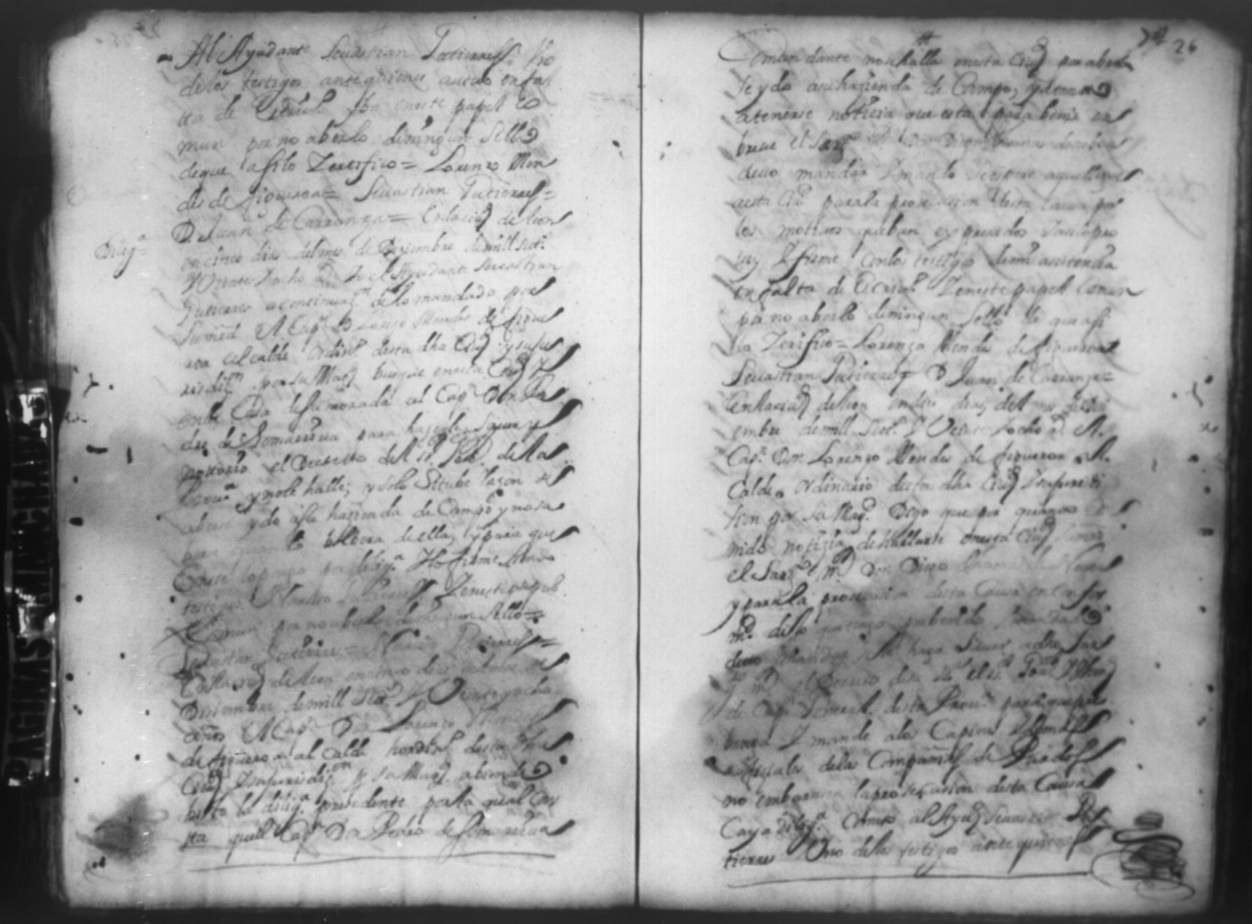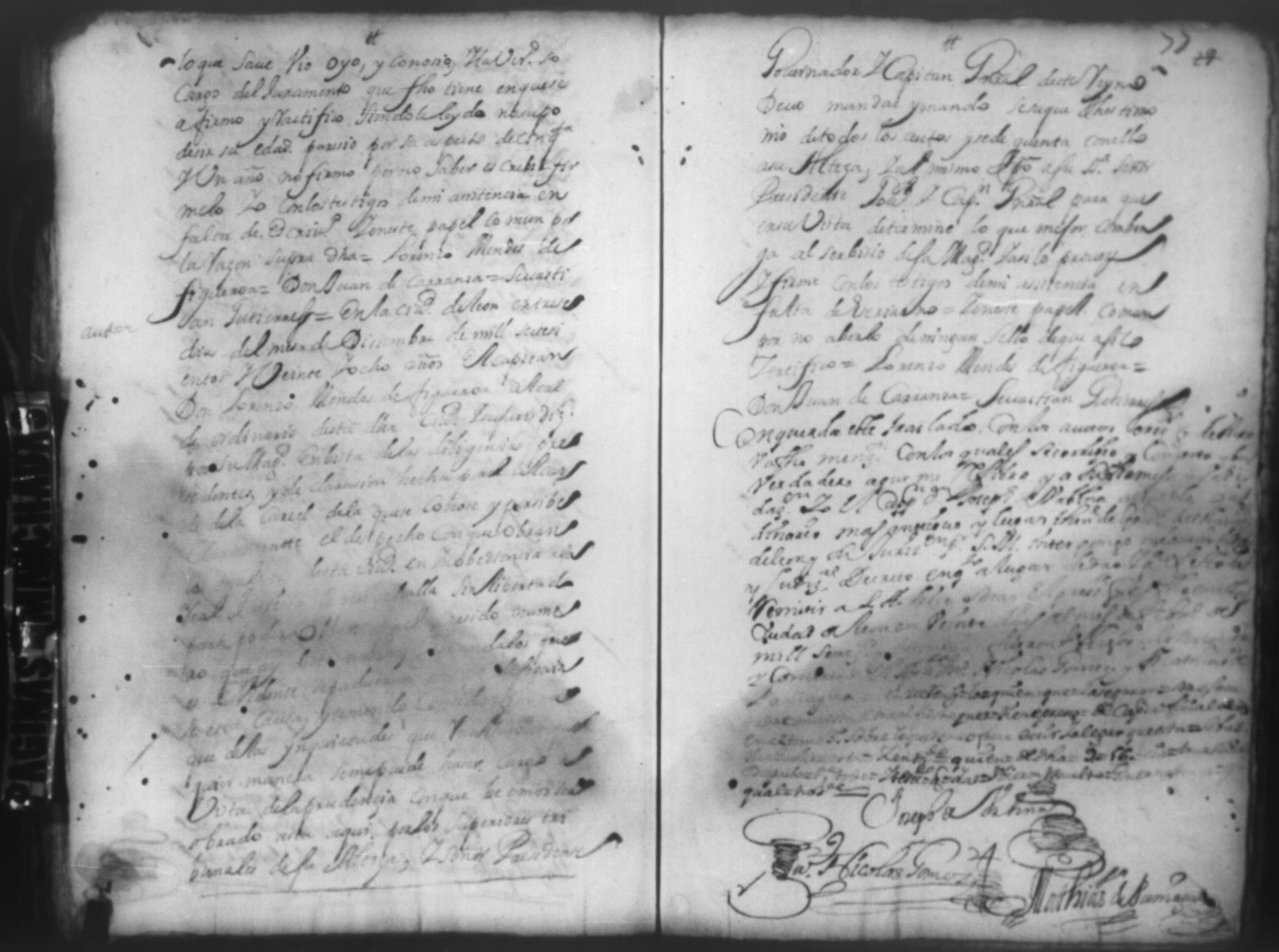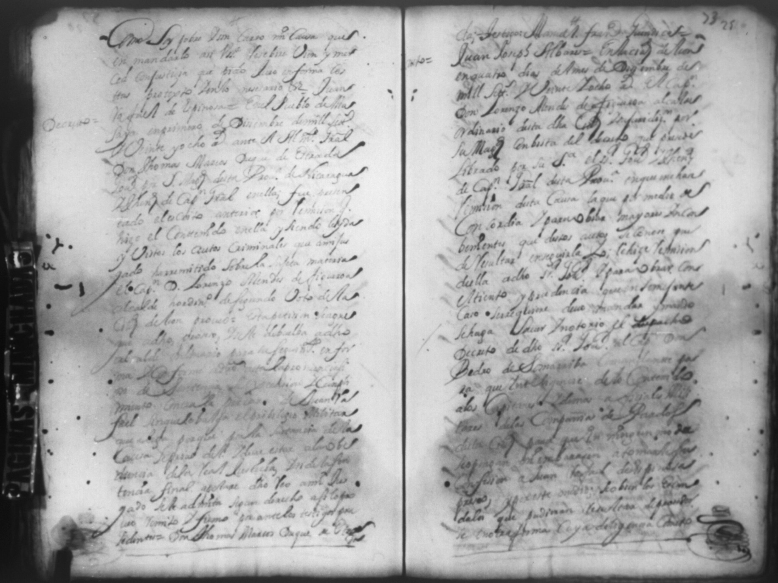 Temática: Leon 1729. Causa Criminal seguida de oficcion por la Real Justizia contra Juan Rafael de Espinosa, ygnazio de Sequeira y [Derifio] Javier la executa de [yncautos] en la pugna [...] de [sargento] Mayor en que prohiben los duelos y desafios. Firma de Mathias de Samagua. Documentos hace mención de varias causas criminales. Expediente contiene varias paginas con manchas por humedad.
