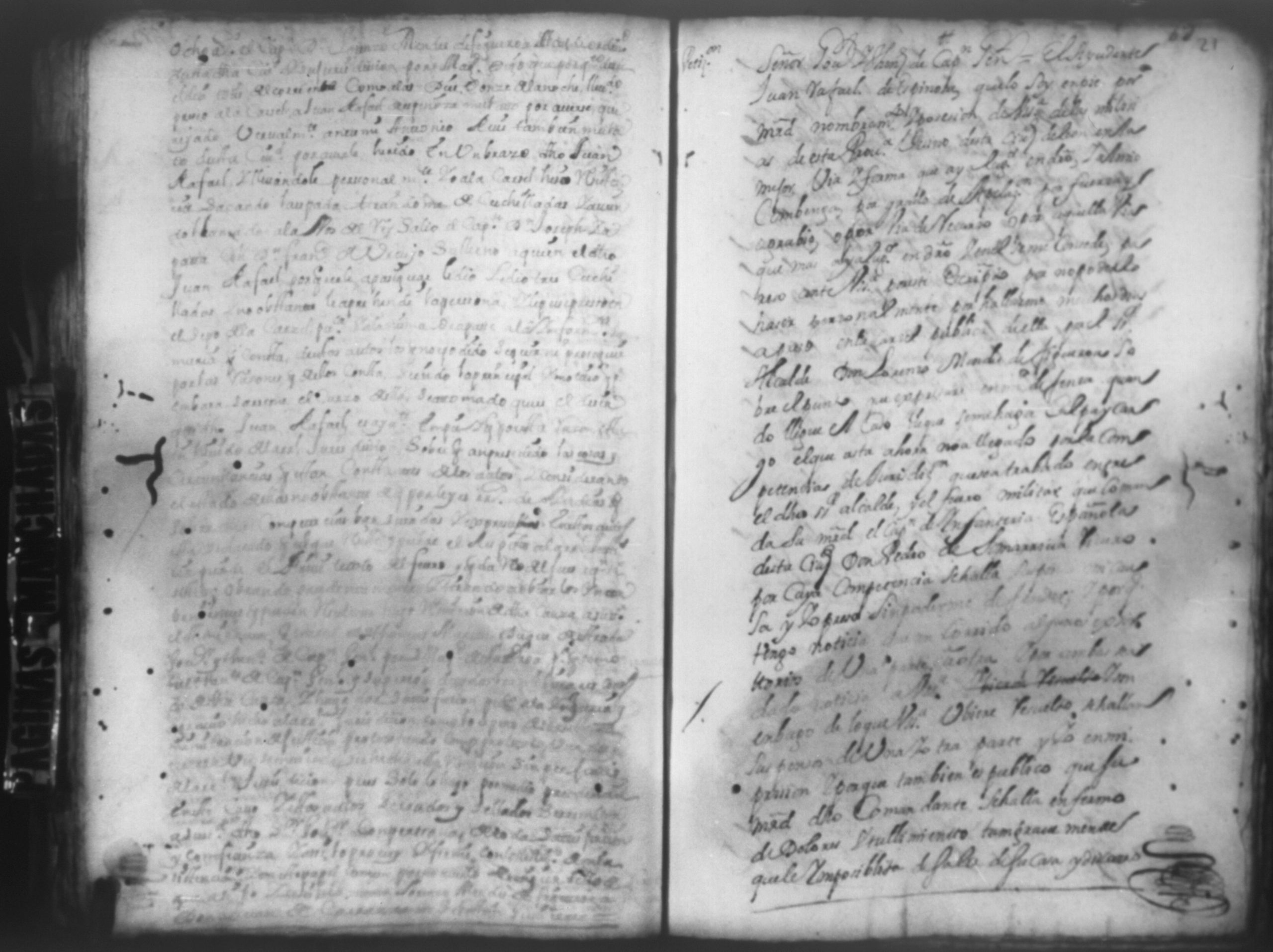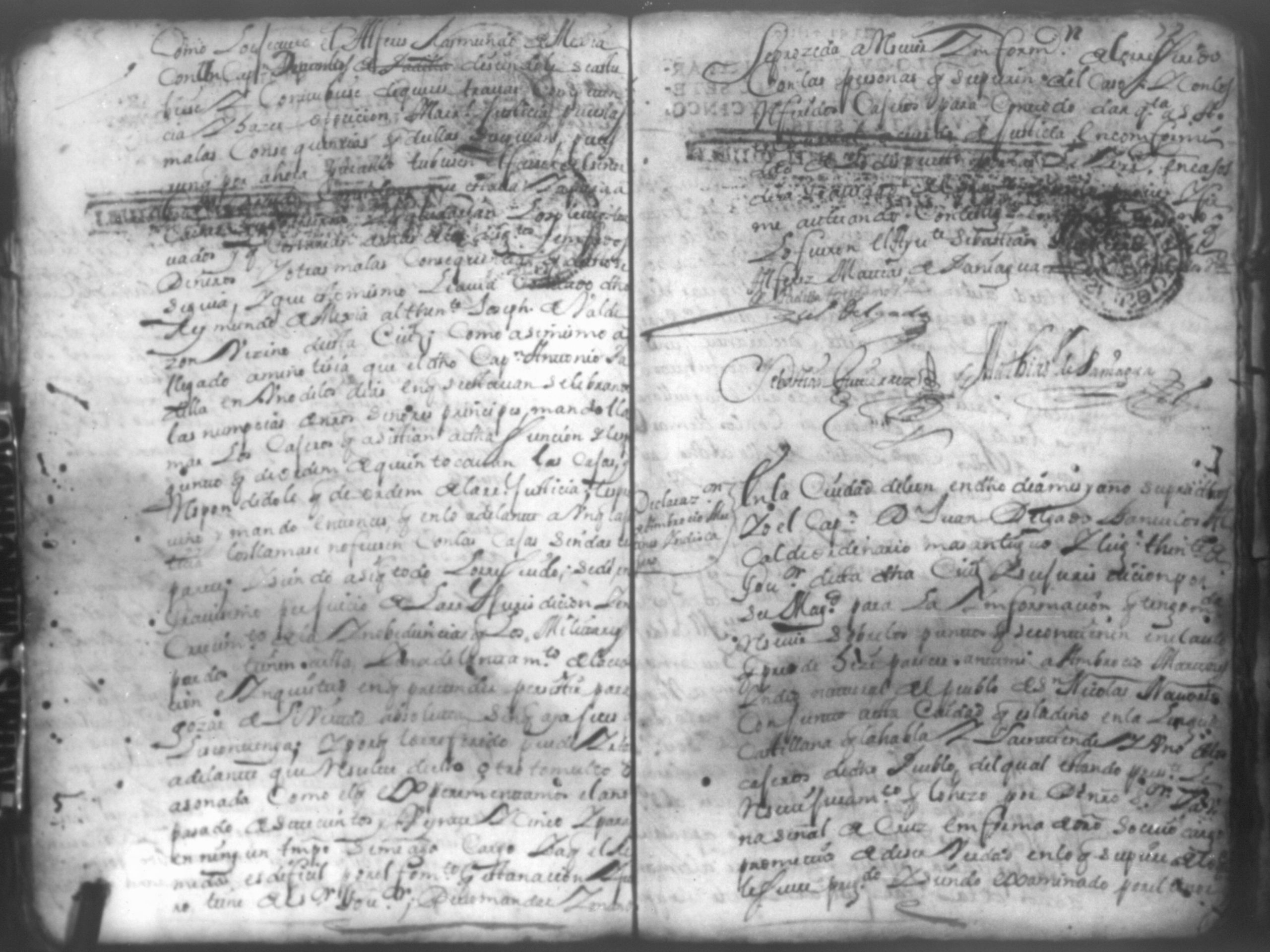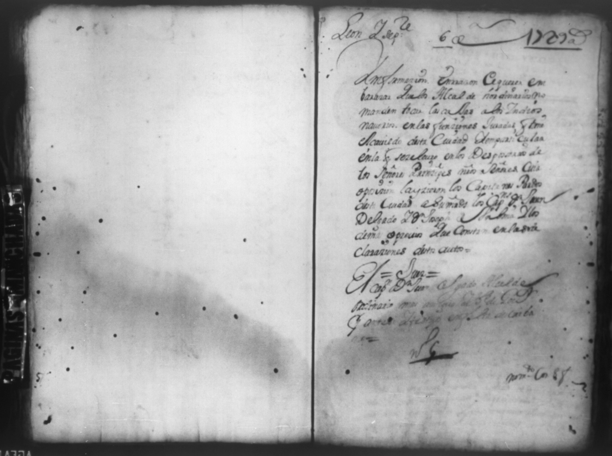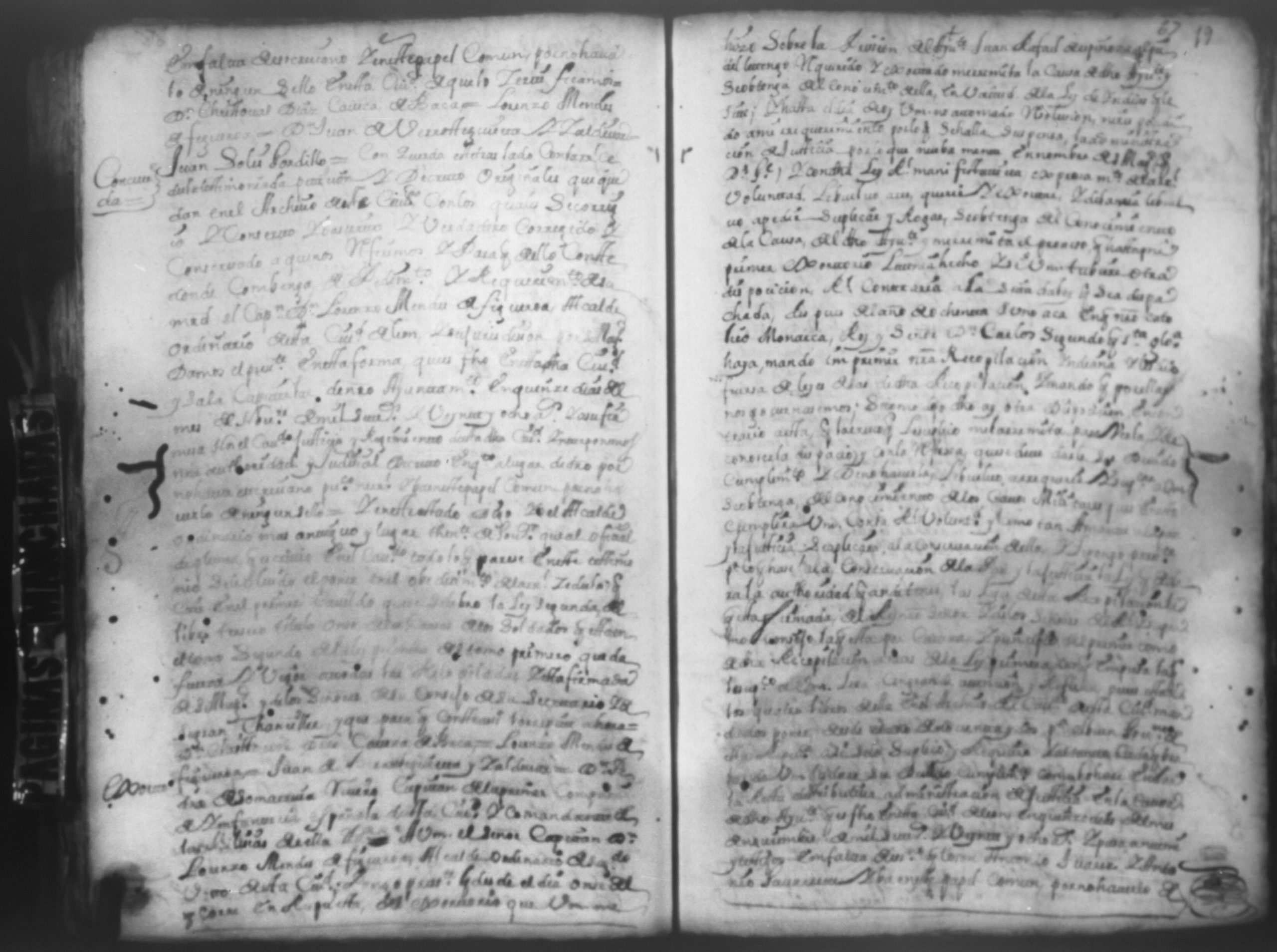 Temática: Leon 1729. Causa Criminal seguida de oficcion por la Real Justizia contra Juan Rafael de Espinosa, ygnazio de Sequeira y [Derifio] Javier la executa de [yncautos] en la pugna [...] de [sargento] Mayor en que prohiben los duelos y desafios. Firma de Mathias de Samagua. Documentos hace mención de varias causas criminales. Expediente contiene varias paginas con manchas por humedad.