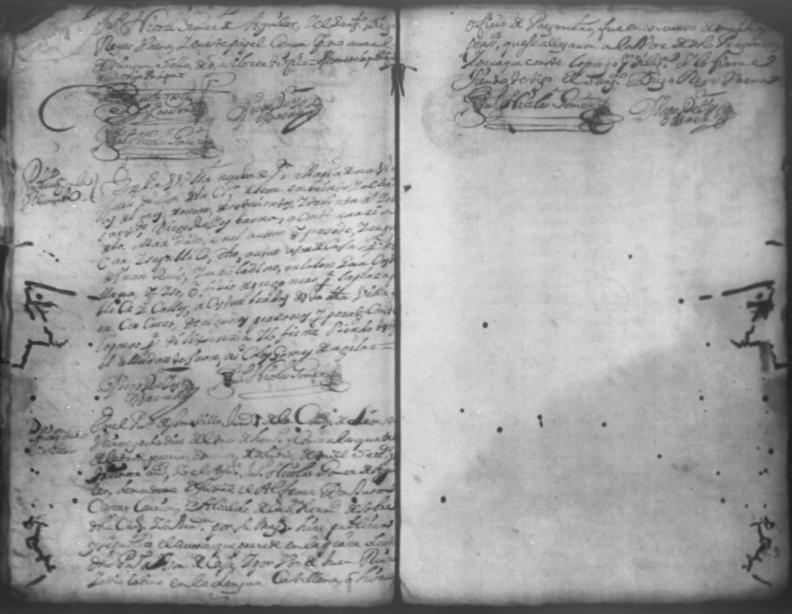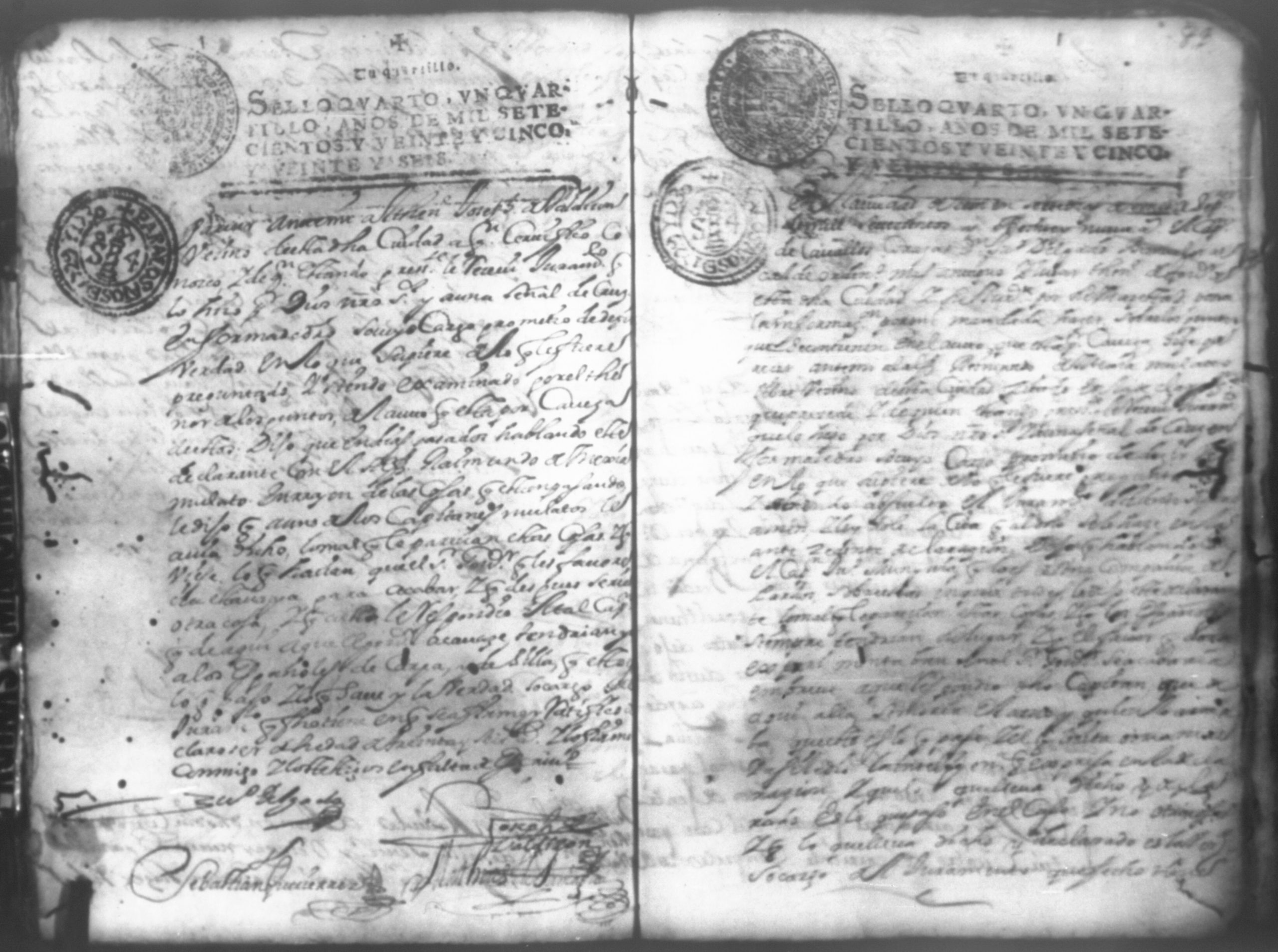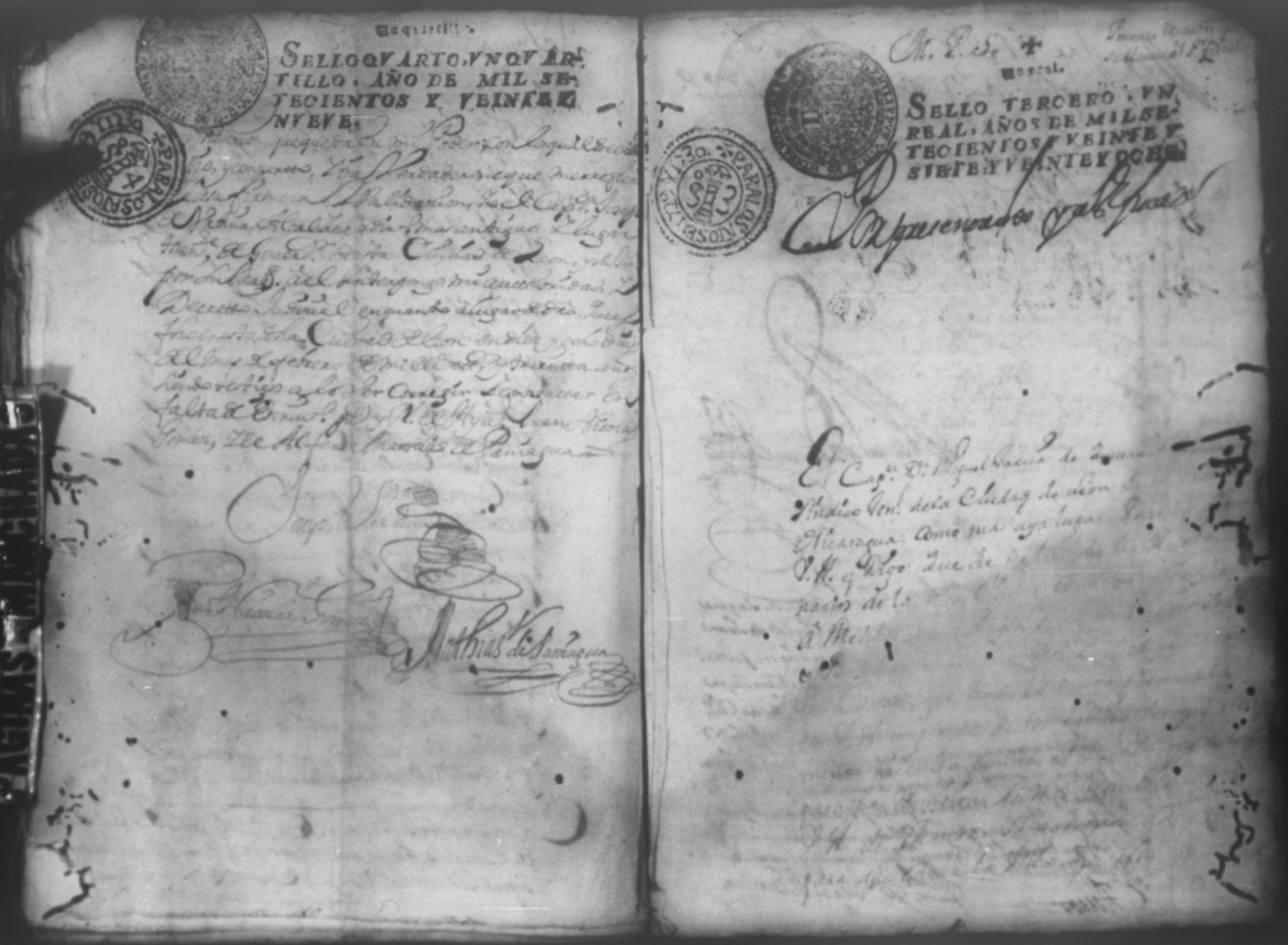 Temática: Leon 1729. Causa Criminal seguida de oficcion por la Real Justizia contra Juan Rafael de Espinosa, ygnazio de Sequeira y [Derifio] Javier la executa de [yncautos] en la pugna [...] de [sargento] Mayor en que prohiben los duelos y desafios. Firma de Mathias de Samagua. Documentos hace mención de varias causas criminales. Expediente contiene varias paginas con manchas por humedad.
