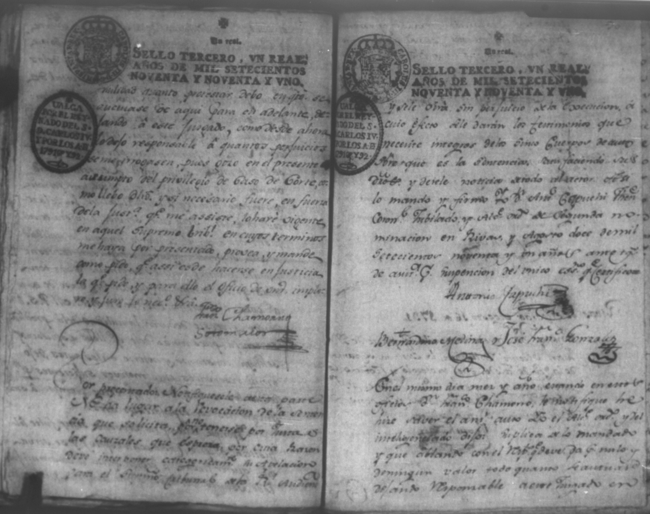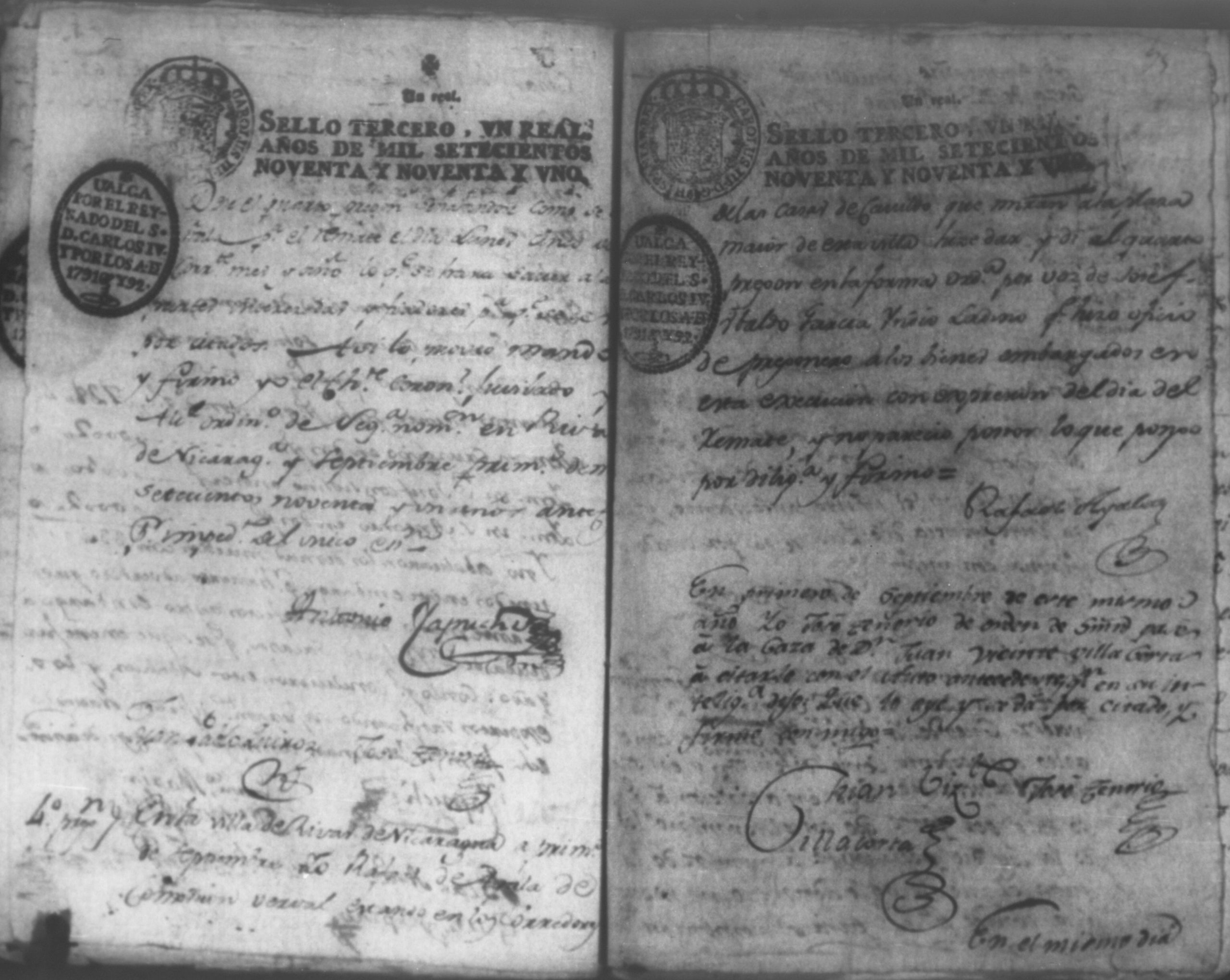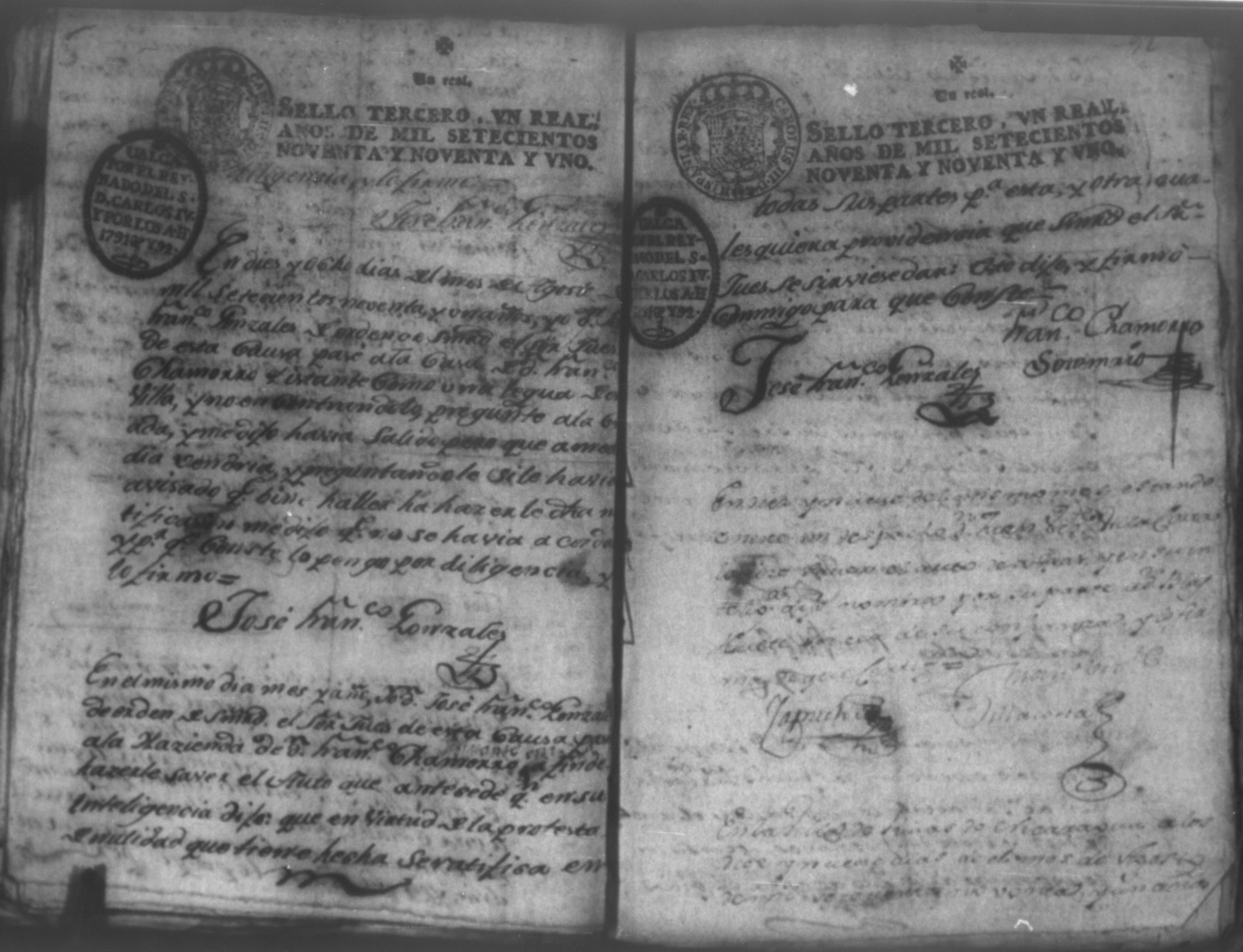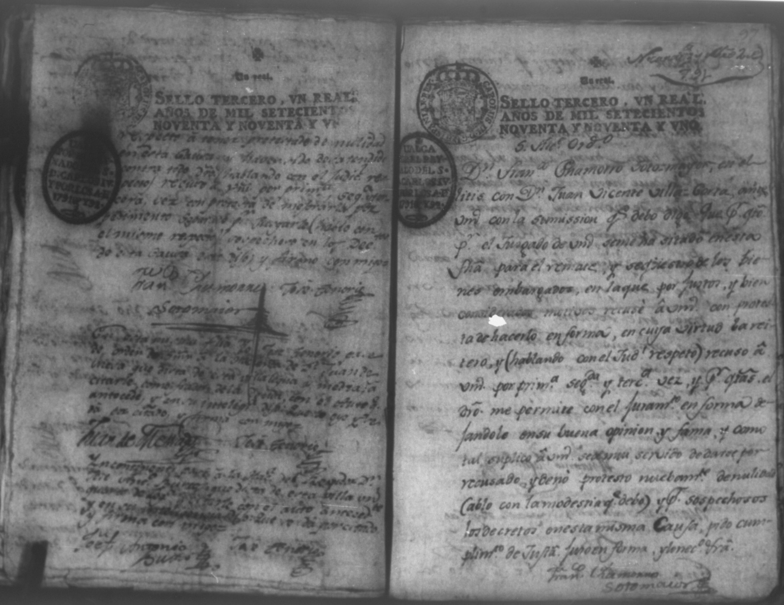 Temática: León, 1792. Correspondiente a la causa de don Juan de Villacorta, con don Francisco Chamorro. Incluye el Artículo de oposición por Don Francisco Chamorro y consorte, en la ejecución que le sigue Don Juan Visente Villacorta. "Señor Alcalde Ordinario. Don Juan Vizente Villacorta del Comercio en esta Provincia en la execucion que contra a Francisco Chamorro y doña Marcelina Martinez Montaña, por cantidad de tres mil pesos, sigo en la mejor forma ante vuestra majestad digo; que por opocicion que el referido Chamorro hiso al remate de la Hacienda (que a cubierta del general y costas que las demando, se aya embargada) se le entregaron los autos en traslado el veinte, y ocho del corriente para que dentro de segundo dia expuciese las essecciones que dise le favorecen, á impedir el enunciado remate, y siendo ya pasado el termino, por contar oy treinta, y uno de este mismo mes de Mayo, en la forma que haya lugar á cuio esta y es el dia, por primera. segunda y tercera vez [...]" (Extracto de los folios 4 y 4v.).