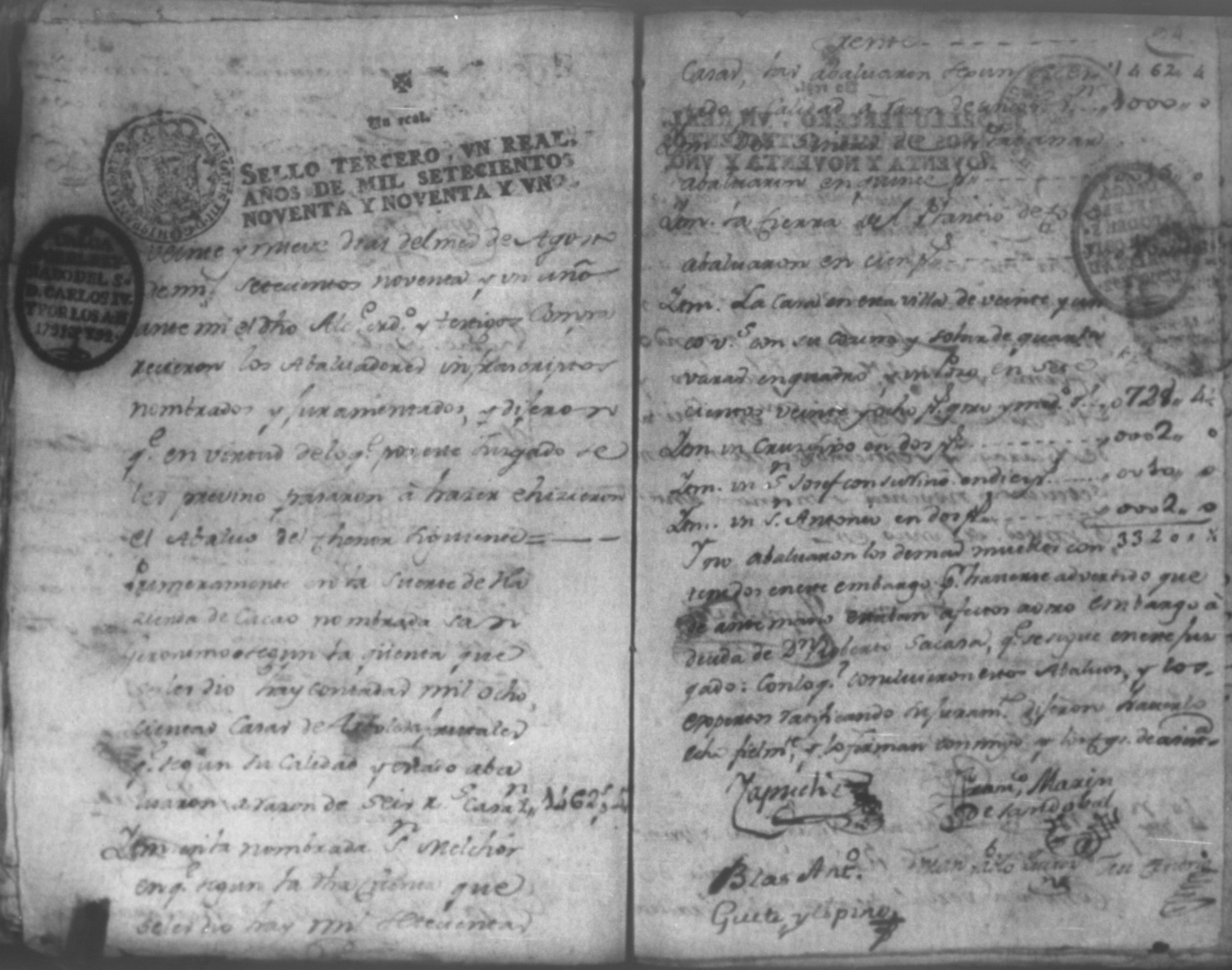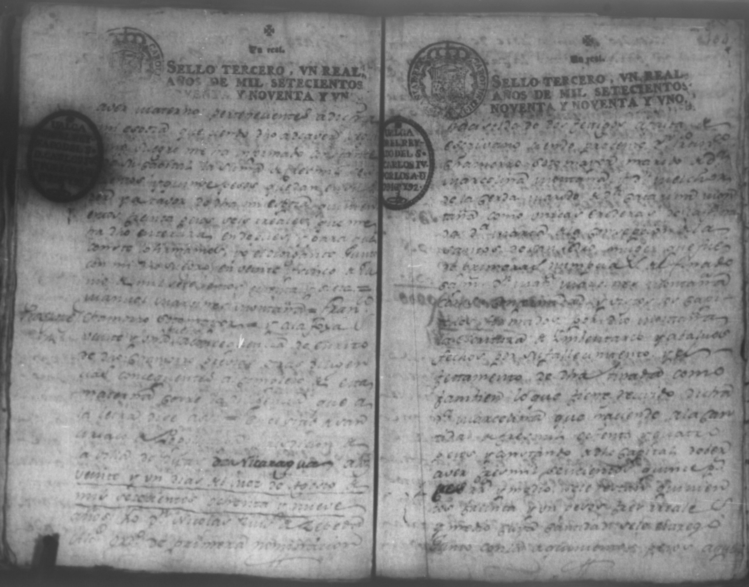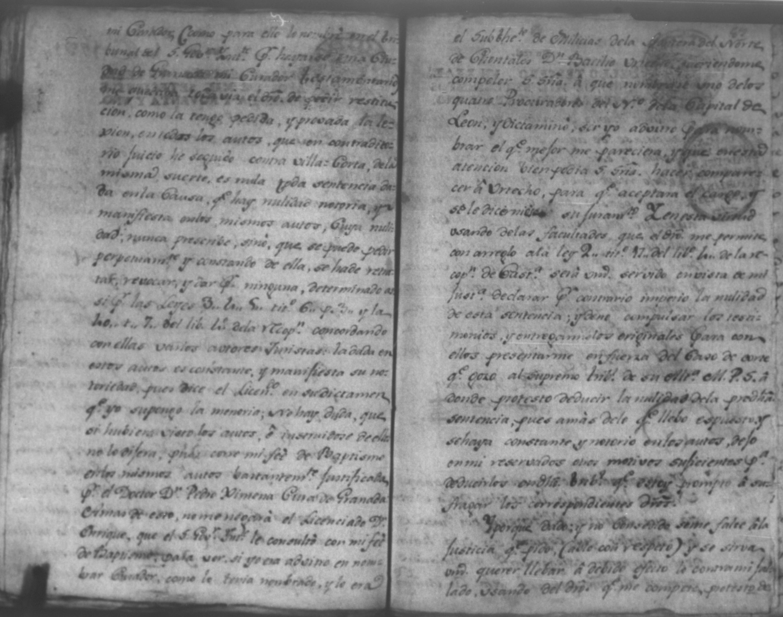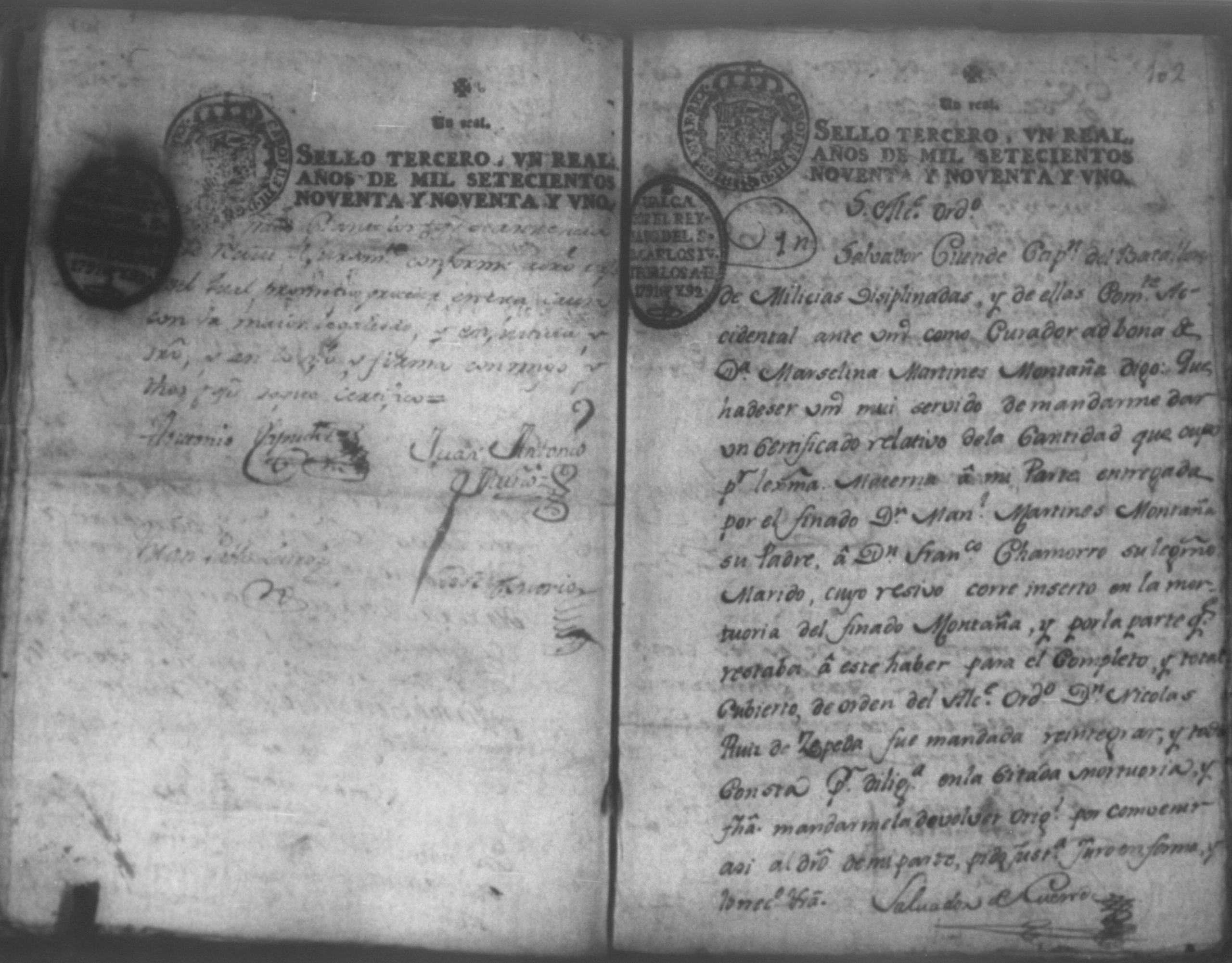 Temática: León, 1792. Correspondiente a la causa de don Juan de Villacorta, con don Francisco Chamorro. Incluye el Artículo de oposición por Don Francisco Chamorro y consorte, en la ejecución que le sigue Don Juan Visente Villacorta. "Señor Alcalde Ordinario. Don Juan Vizente Villacorta del Comercio en esta Provincia en la execucion que contra a Francisco Chamorro y doña Marcelina Martinez Montaña, por cantidad de tres mil pesos, sigo en la mejor forma ante vuestra majestad digo; que por opocicion que el referido Chamorro hiso al remate de la Hacienda (que a cubierta del general y costas que las demando, se aya embargada) se le entregaron los autos en traslado el veinte, y ocho del corriente para que dentro de segundo dia expuciese las essecciones que dise le favorecen, á impedir el enunciado remate, y siendo ya pasado el termino, por contar oy treinta, y uno de este mismo mes de Mayo, en la forma que haya lugar á cuio esta y es el dia, por primera. segunda y tercera vez [...]" (Extracto de los folios 4 y 4v.).