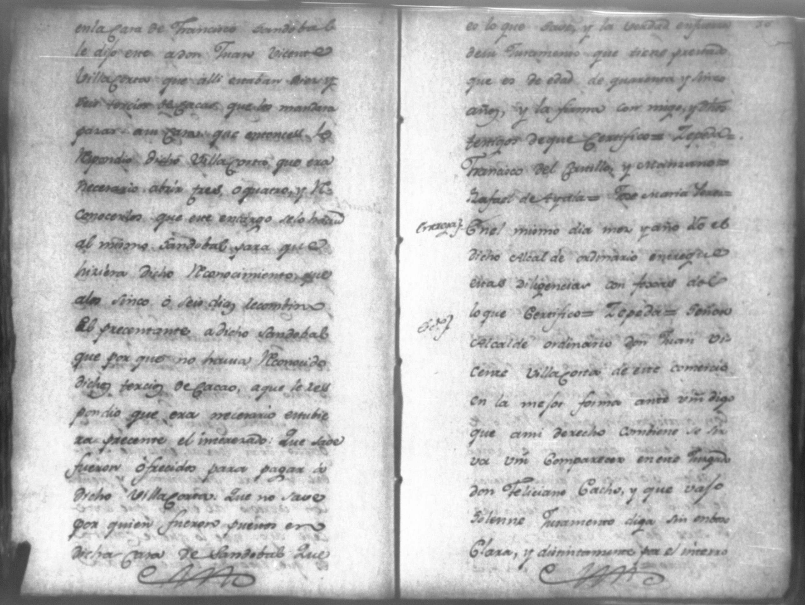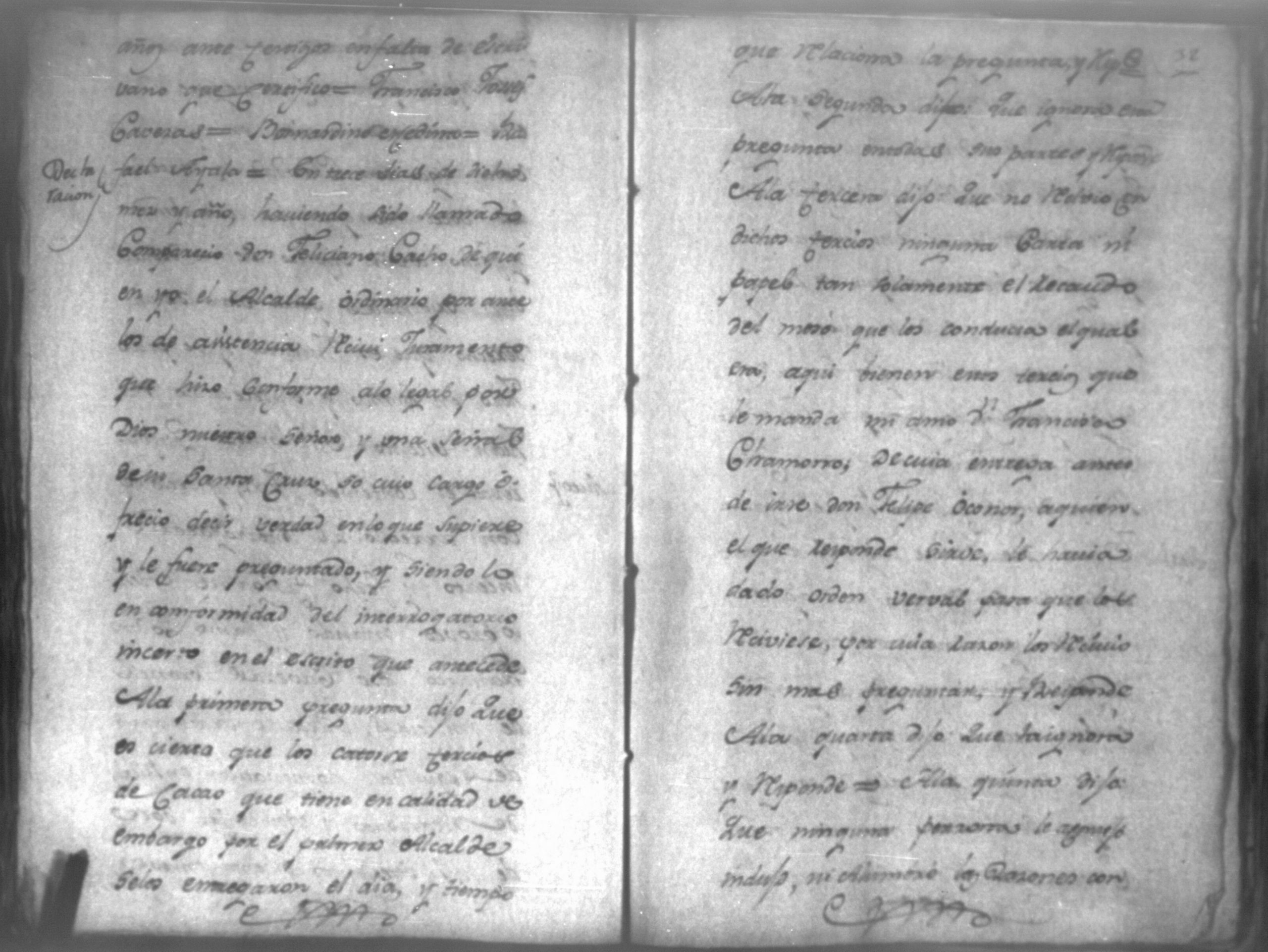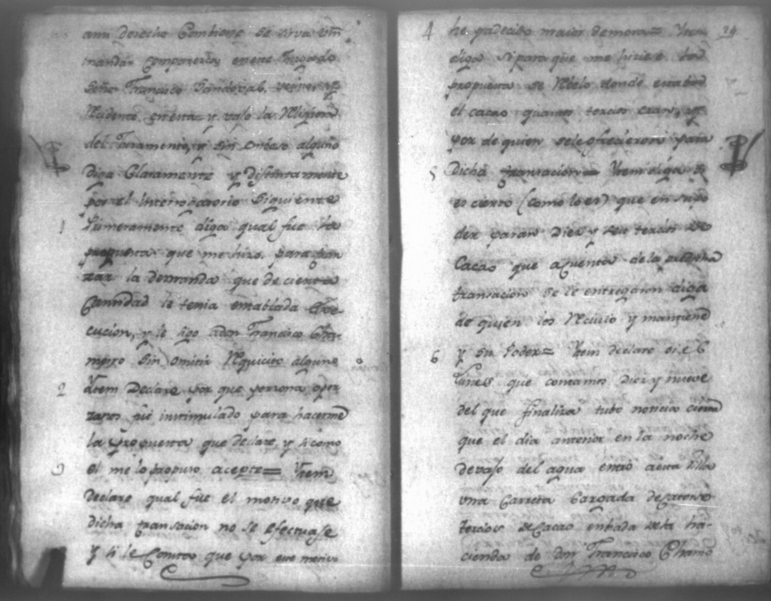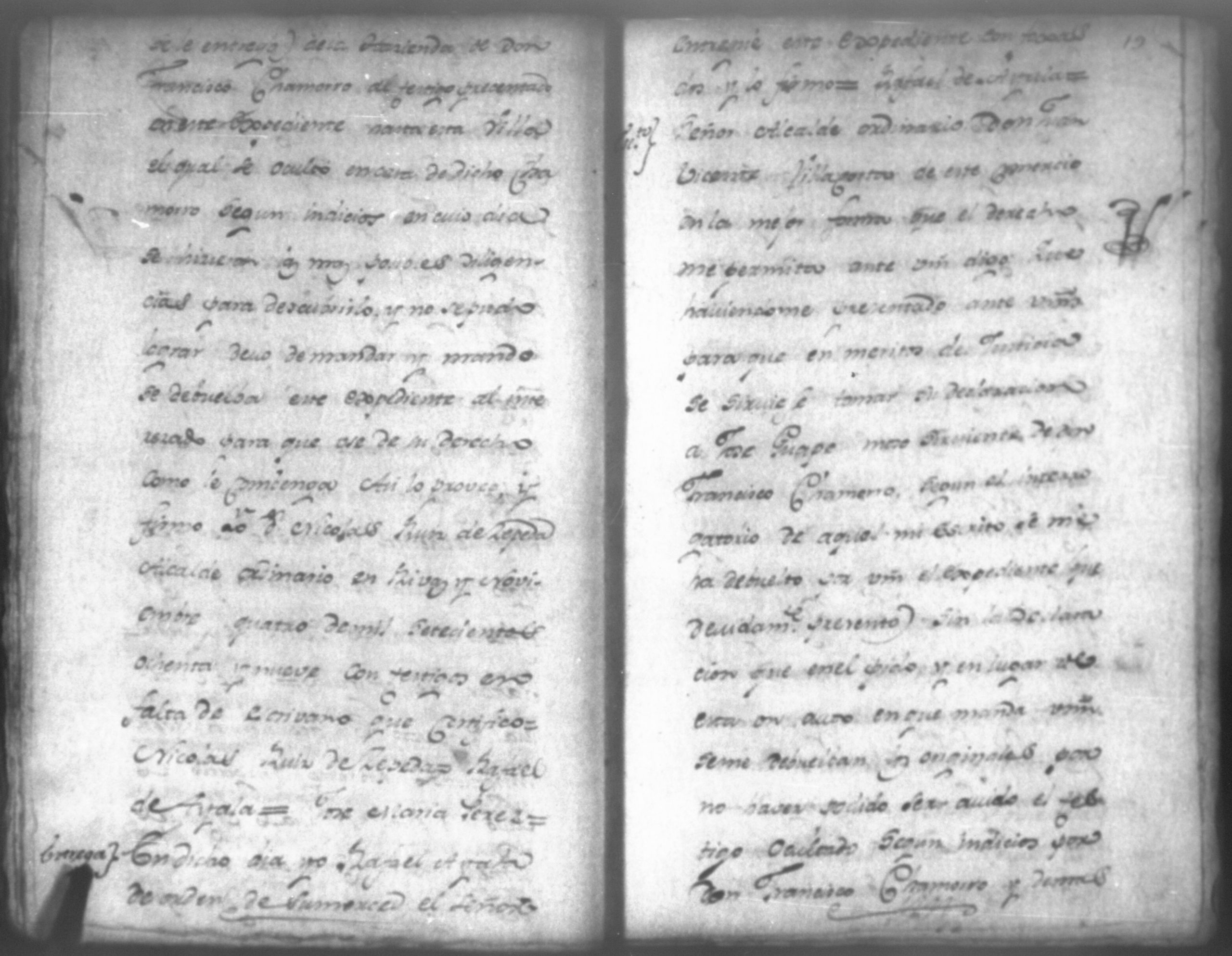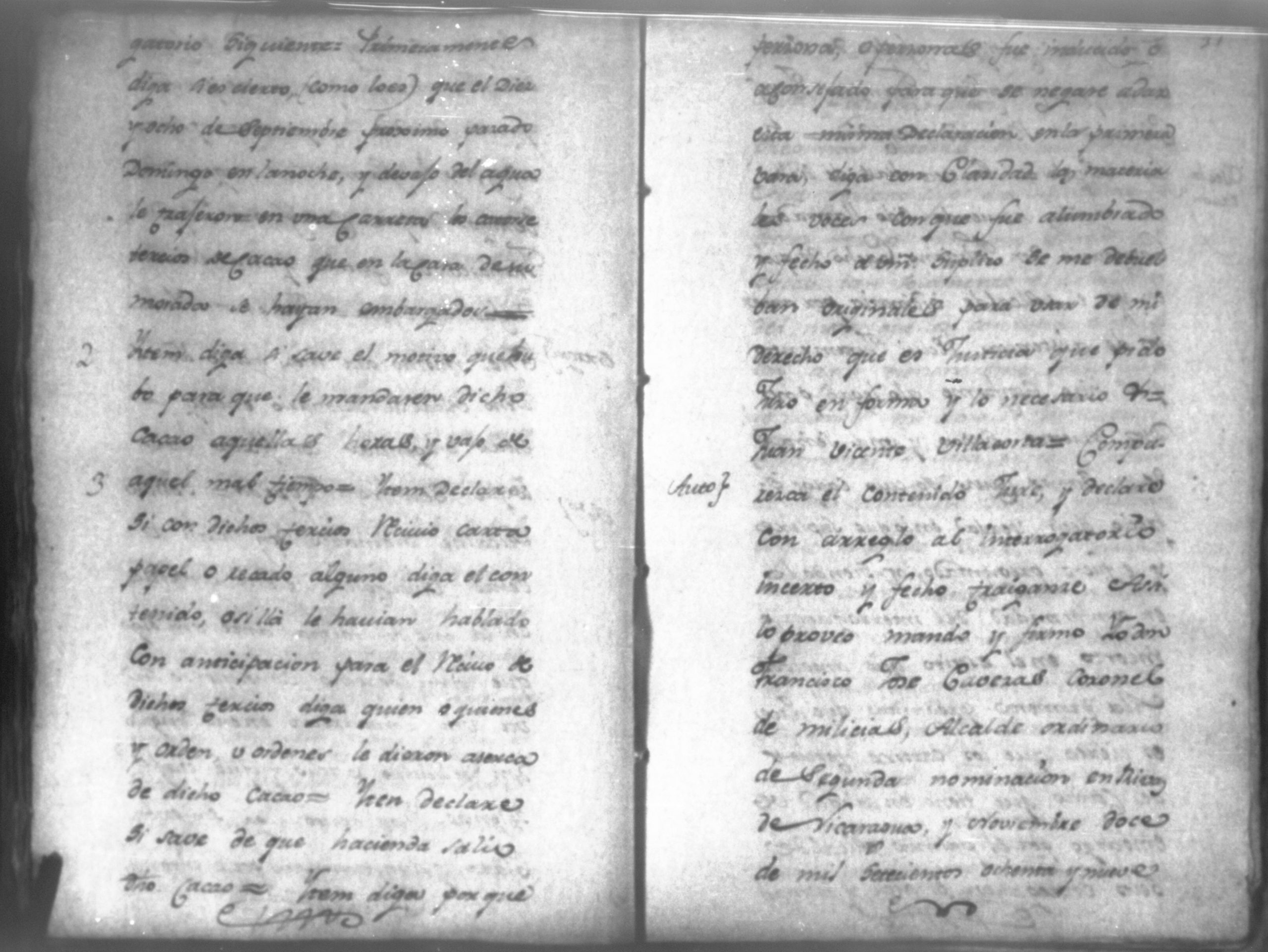 Temática: Audiencia de León, 1792. Correspondiente a la causa de Don Juan de Villacorta con Don Francisco Chamorro. "Señor Alcalde ordinario Don Juan Vicente Villacorta de este Comercio en la mejor forma ante Vuestra majestad digo que a mi derecho combiene se sirva Vuestra majestad mandar comparezca en este Juzgado [al] Señor Francisco Sandoval, vecino y recidente en esta, y vajo la religion del Juramento, y sin embaso alguno diga: Claramente y distintivamente por el Interrogatorio siguiente Primeramente diga qual fue la propuesta que me hizo para fianzar la demanda que de cierta cantidad la tenia entablada execucion, y le sigo a don Francisco Chamorro son omitir requicito alguno [...]." (Extracto de los folio 11 y 11v.).