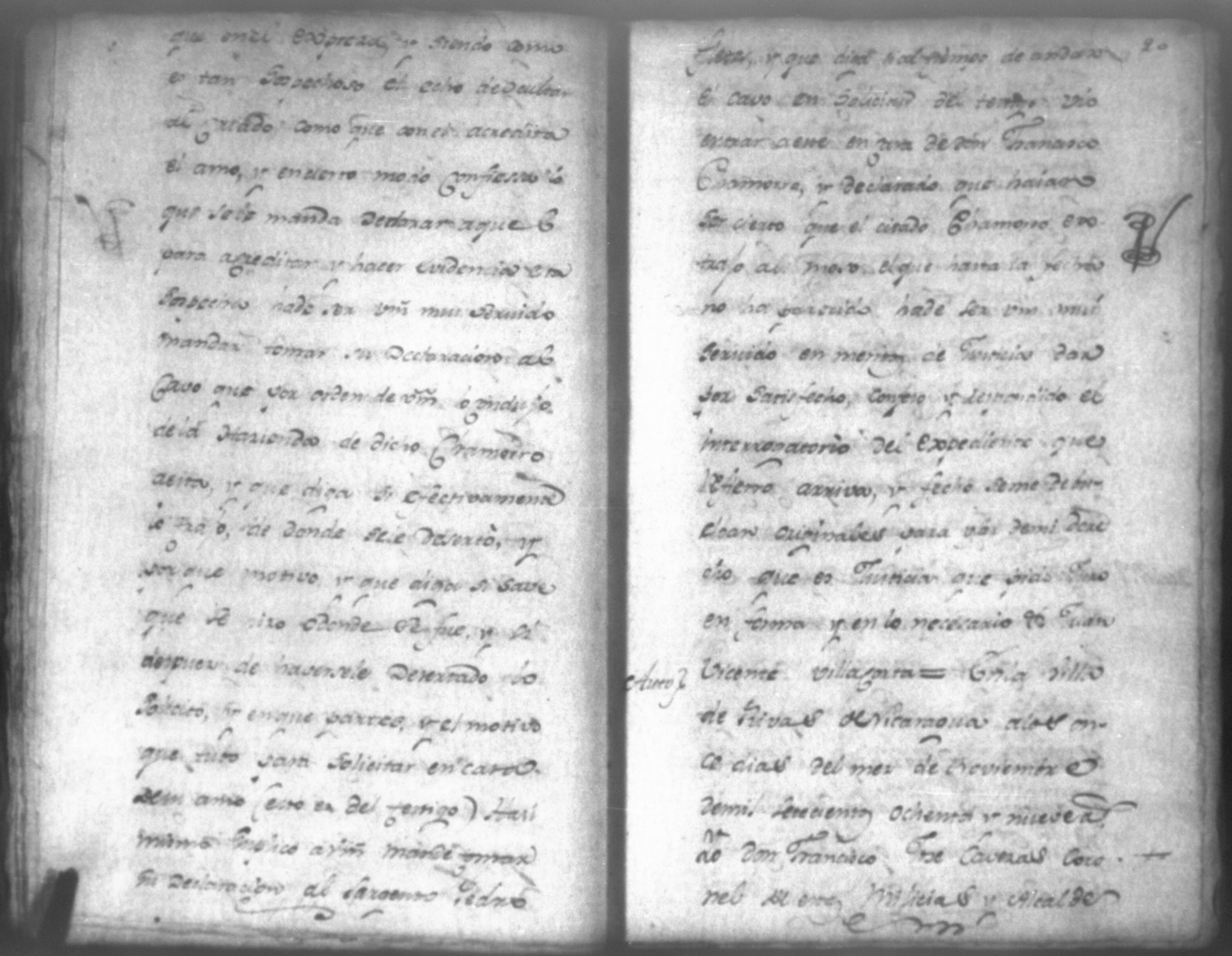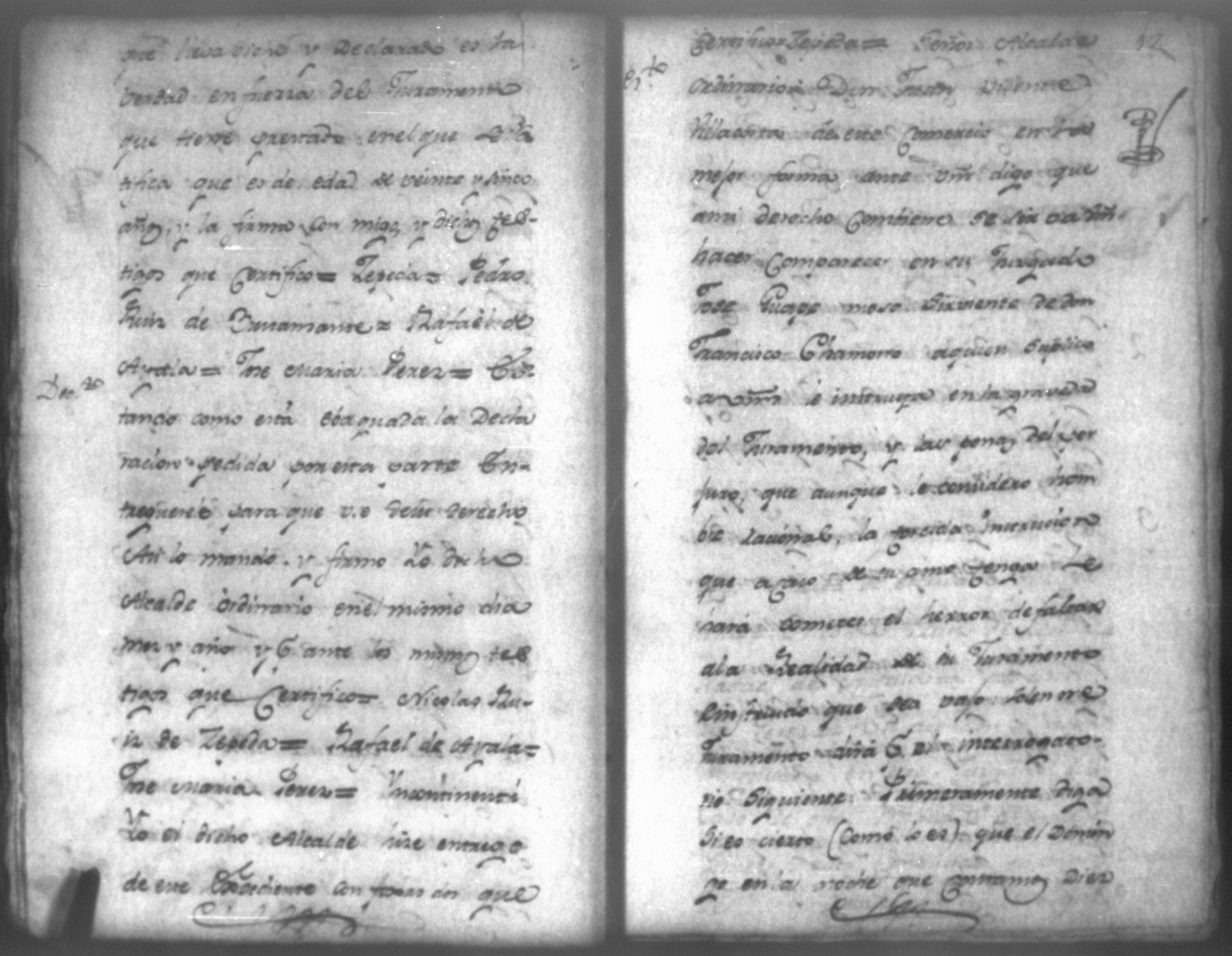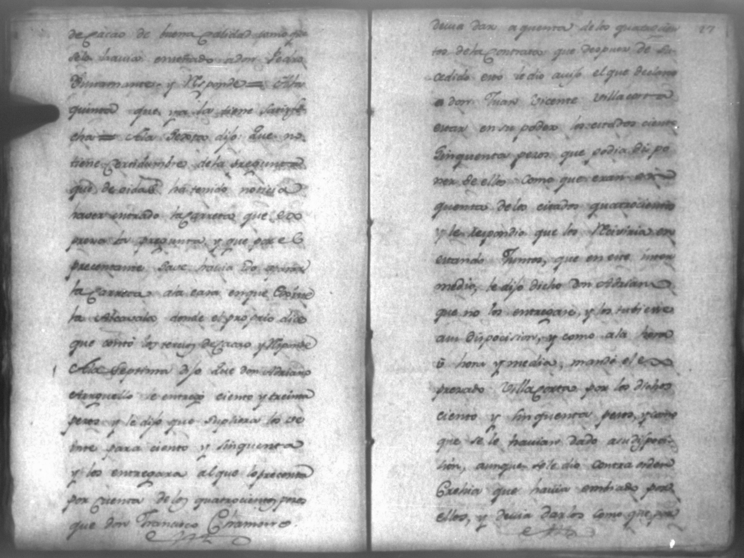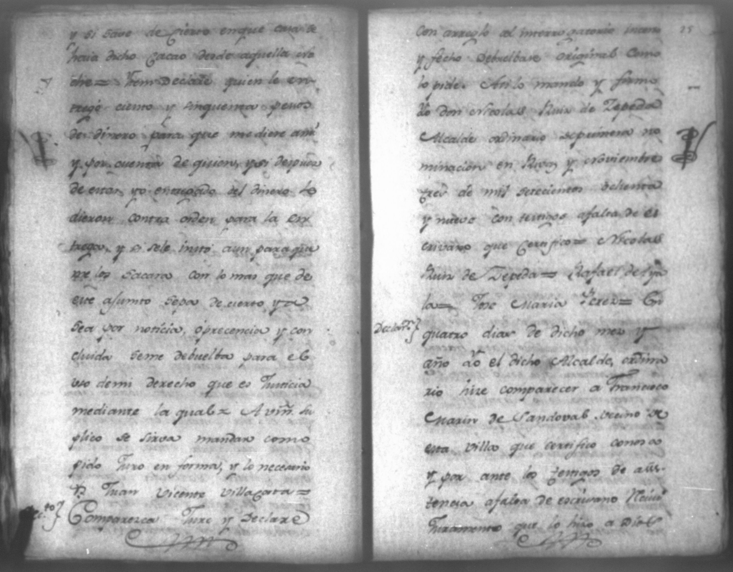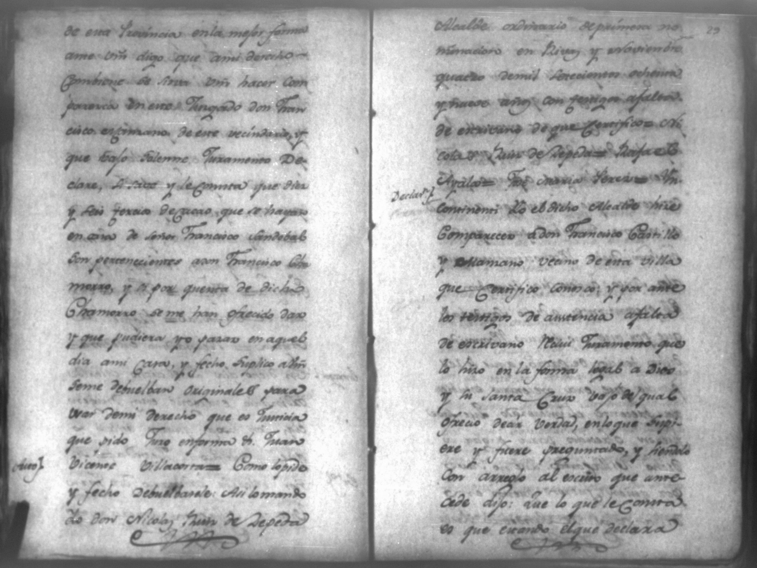 Temática: Audiencia de León, 1792. Correspondiente a la causa de Don Juan de Villacorta con Don Francisco Chamorro. "Señor Alcalde ordinario Don Juan Vicente Villacorta de este Comercio en la mejor forma ante Vuestra majestad digo que a mi derecho combiene se sirva Vuestra majestad mandar comparezca en este Juzgado [al] Señor Francisco Sandoval, vecino y recidente en esta, y vajo la religion del Juramento, y sin embaso alguno diga: Claramente y distintivamente por el Interrogatorio siguiente Primeramente diga qual fue la propuesta que me hizo para fianzar la demanda que de cierta cantidad la tenia entablada execucion, y le sigo a don Francisco Chamorro son omitir requicito alguno [...]." (Extracto de los folio 11 y 11v.).