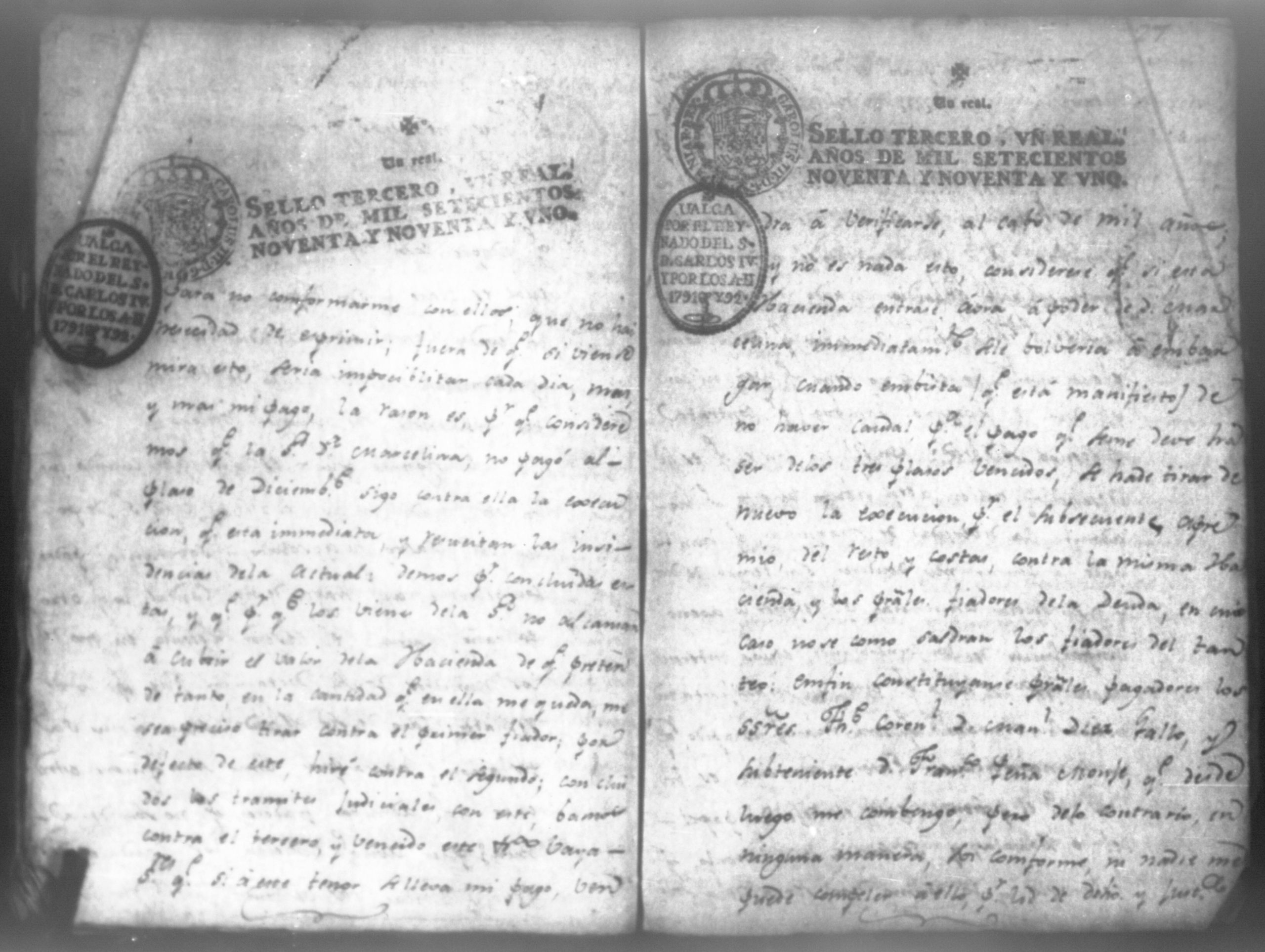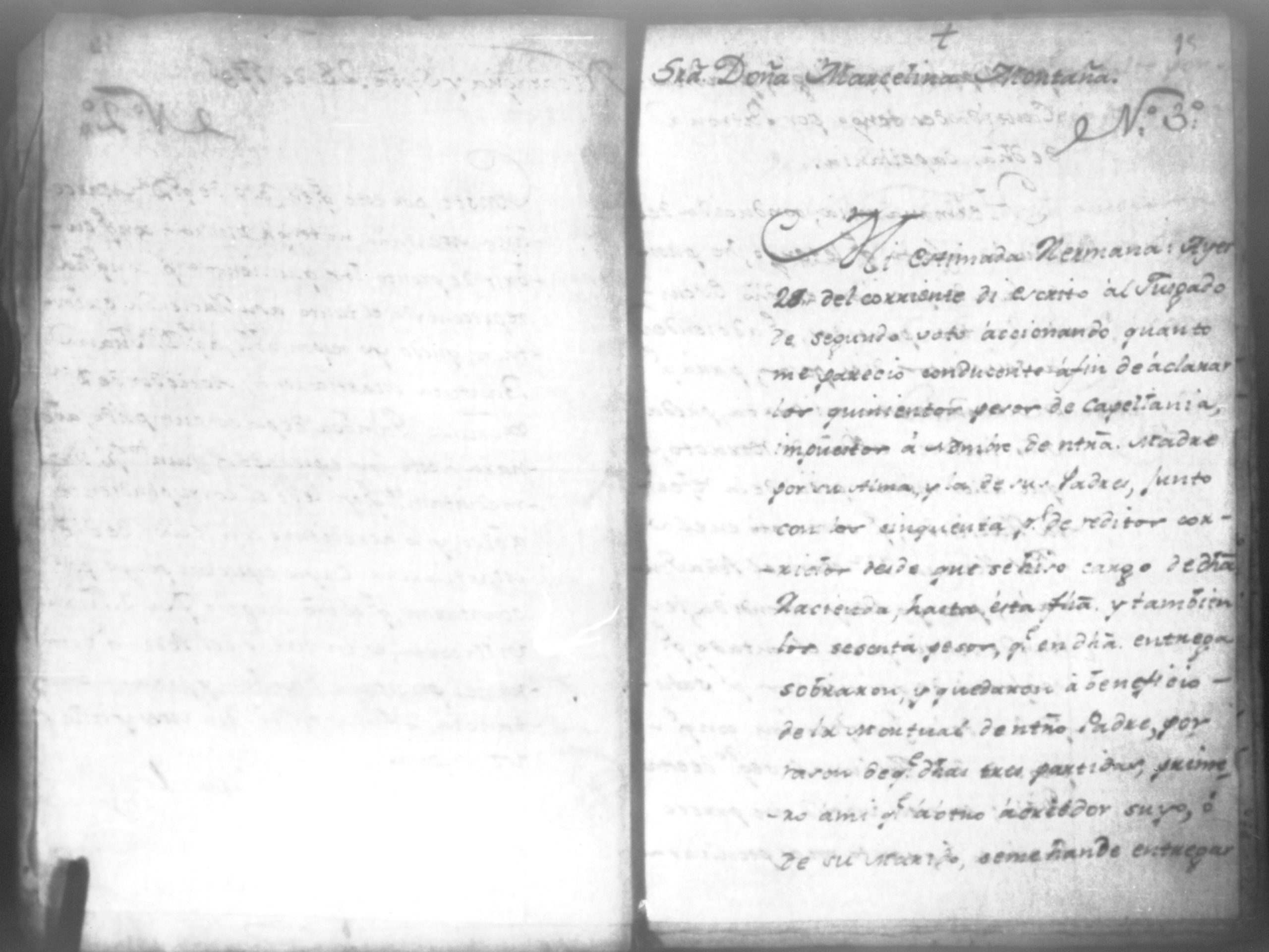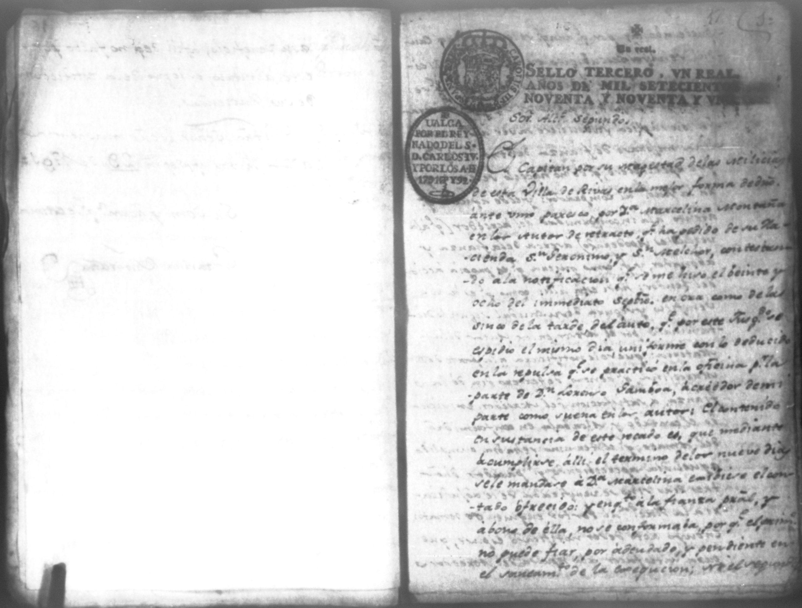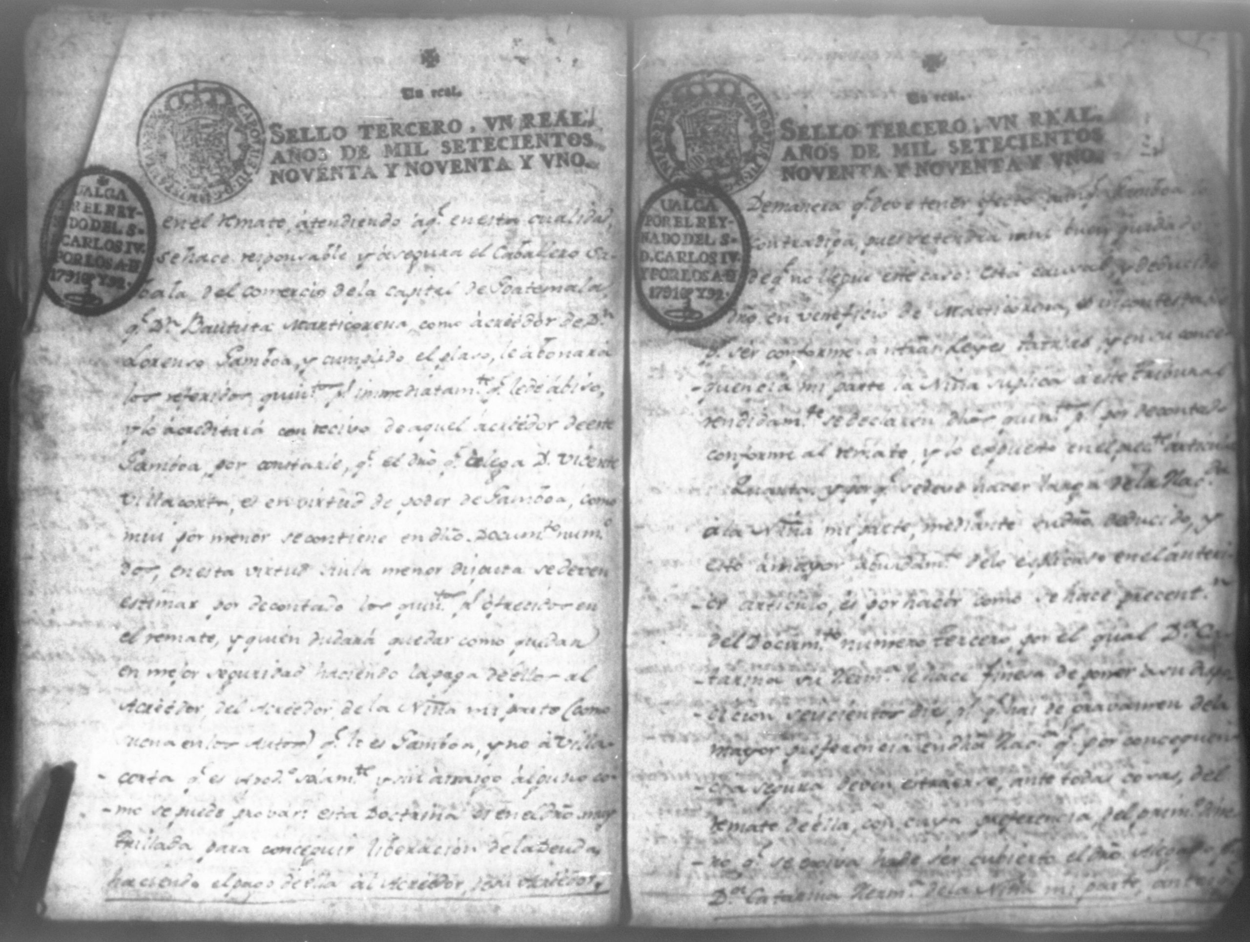 Temática: León, 1792. Correspondiente a la causa de don Juan Villacorta, con don Francisco Chamorro y es de doña Marcelina Martines de Montaña. "Señor Alcalde Segundo. El Capitan Don Francisco Xavier de la Peña [Andabua] deudo afinitivo dentro del segundo grado, de Doña Marcelina Montaña, en los autos executivos y de remate, que contra esta y su consorte ha seguido este Juzgado, por pedimento de su acreedor Villacorta como mas haya lugar en dereho ante Usted paresco con vos de la susodicha y conforme á la recomendacion que por la adjunta carta de fecha de veinte y siete del corriente me ha hecho, para que a su Nombre y representando su propia Persona, pida por el derecho de retracto, que tiene á la Hacienda que se remató en el Real Terceria Don Manuel Peña, Nombrada don Melchor y don Geronimo el dies y nueve, á horas que serian las doce, y poniendolo en efecto usando de dicha Facultad, y la de ser su deudor [...]". (Extracto del folio 5).