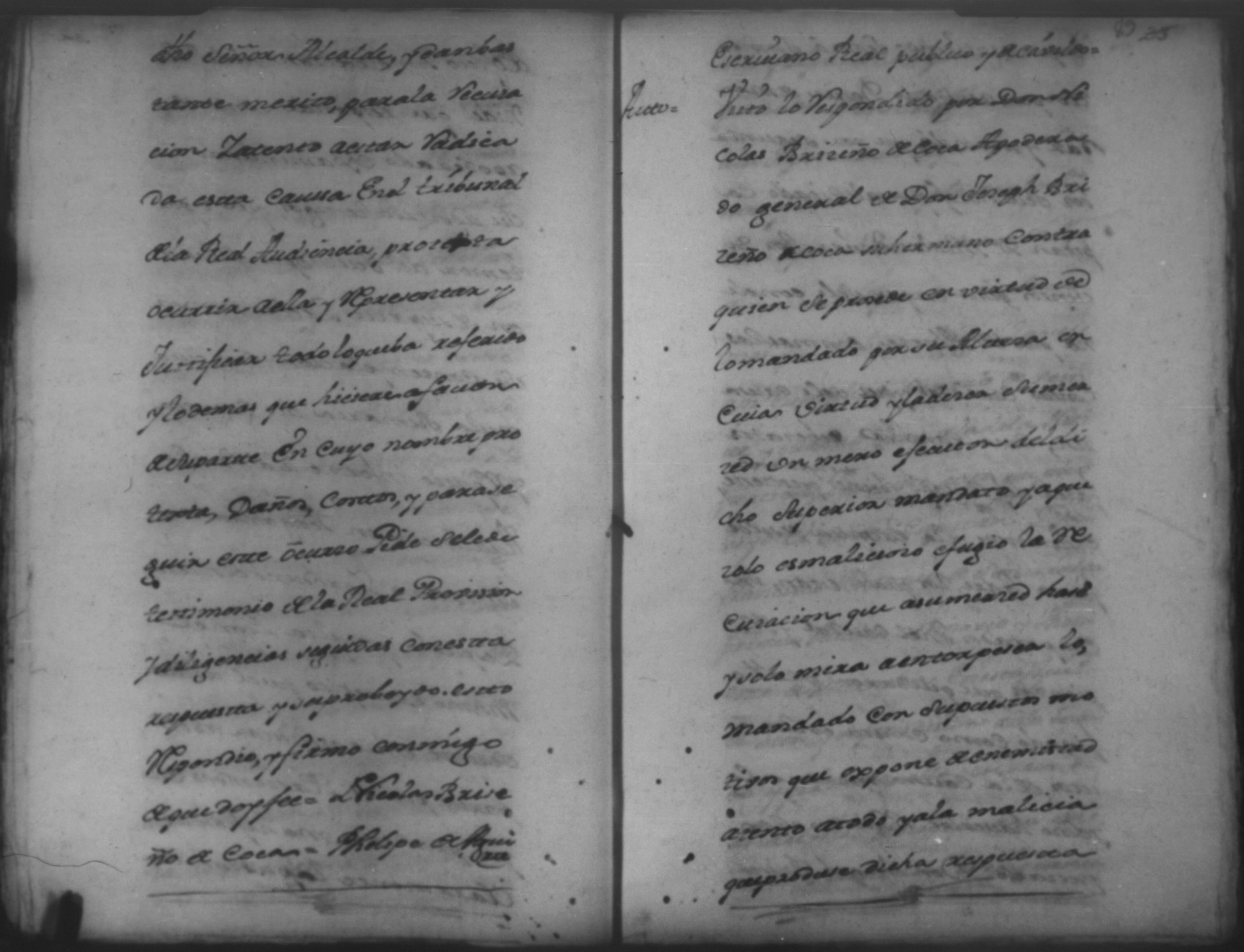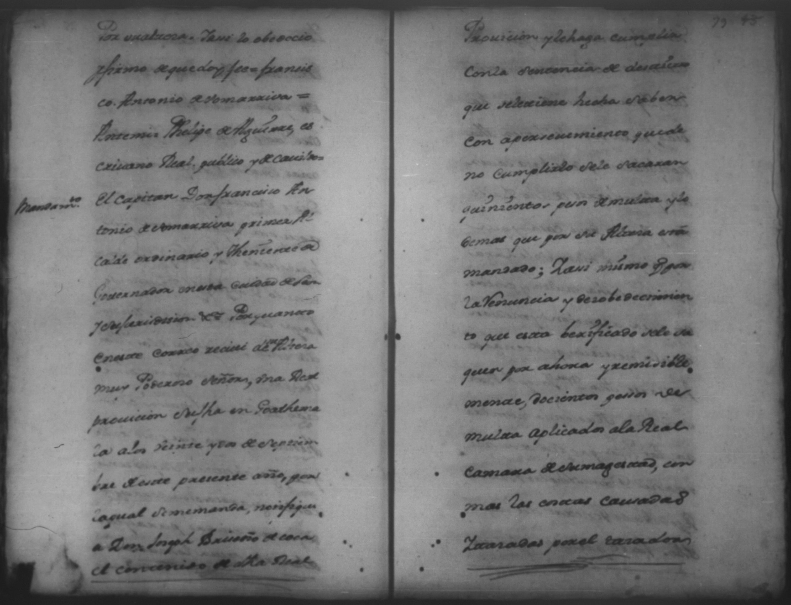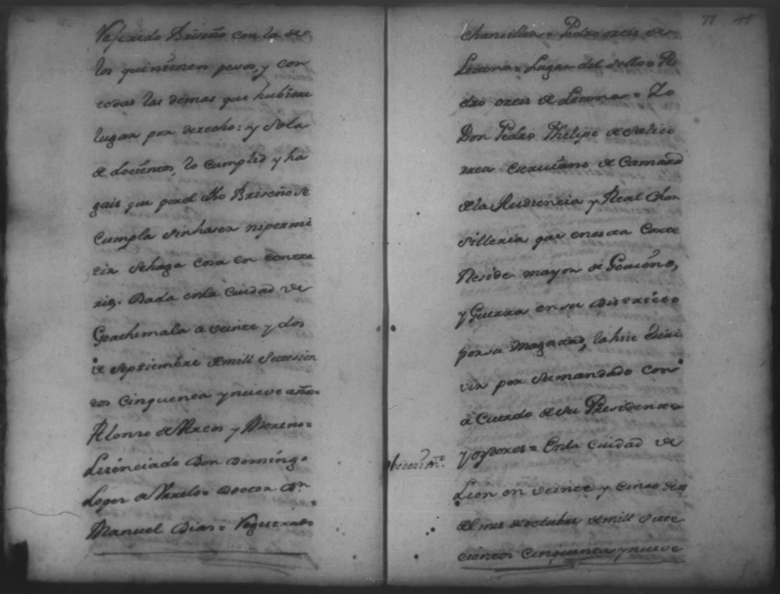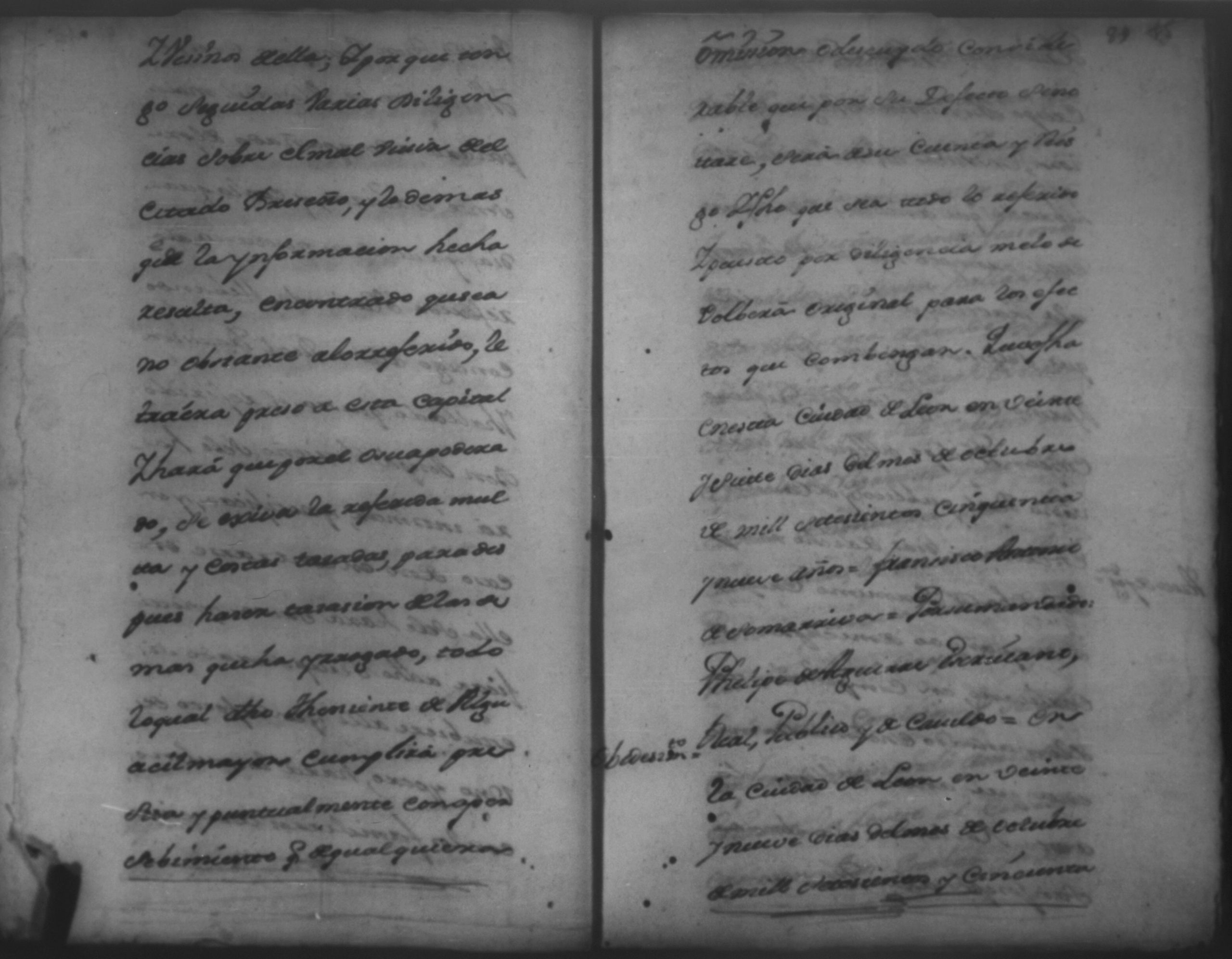 Temática: León. El Señor Capitan Don Francisco Antonio de [Somarriva] Primer Alcalde Ordinario y Theniente de Governador en ella y su jurisficcion dixo que por quanto ha llegado a su notisia que Don Nicolas Briseño de [Coca] esta pretendiendo sacar certificacion de algunos [designos] de esta ciudad.
