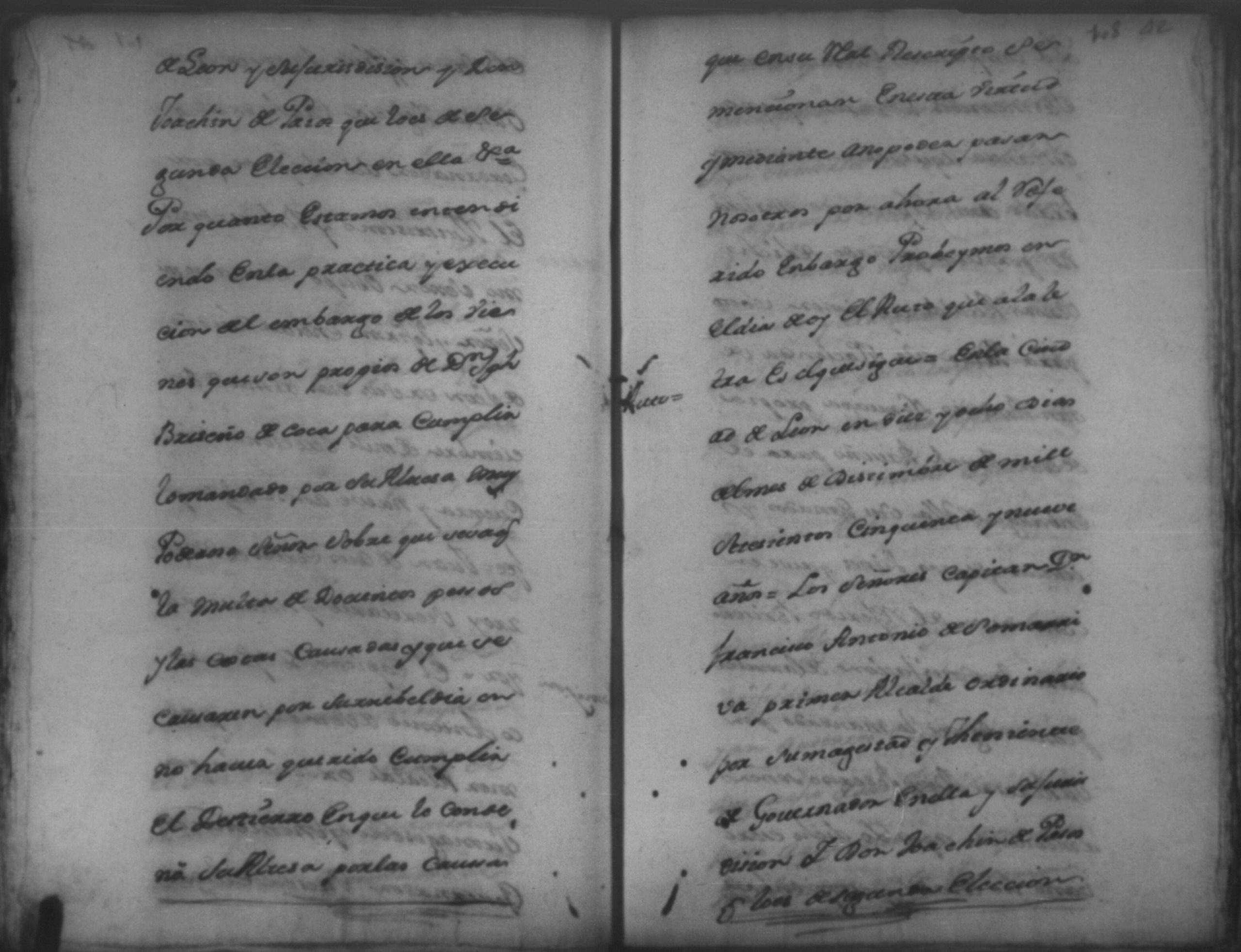 Temática: León. El Señor Capitan Don Francisco Antonio de [Somarriva] Primer Alcalde Ordinario y Theniente de Governador en ella y su jurisficcion dixo que por quanto ha llegado a su notisia que Don Nicolas Briseño de [Coca] esta pretendiendo sacar certificacion de algunos [designos] de esta ciudad.