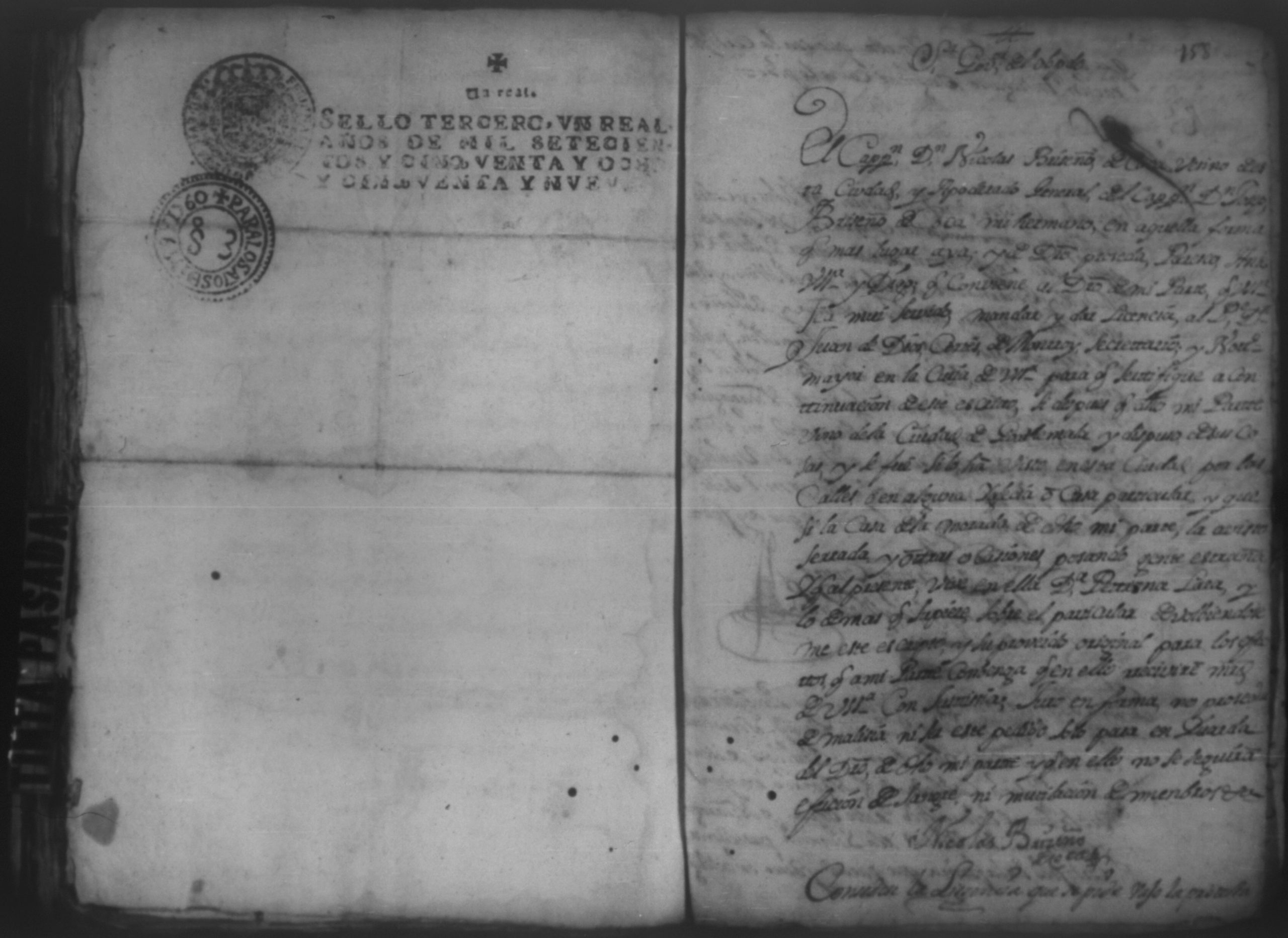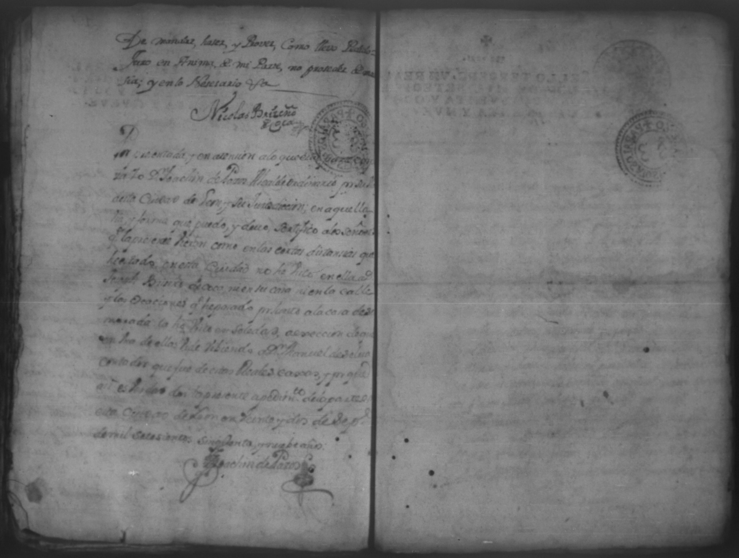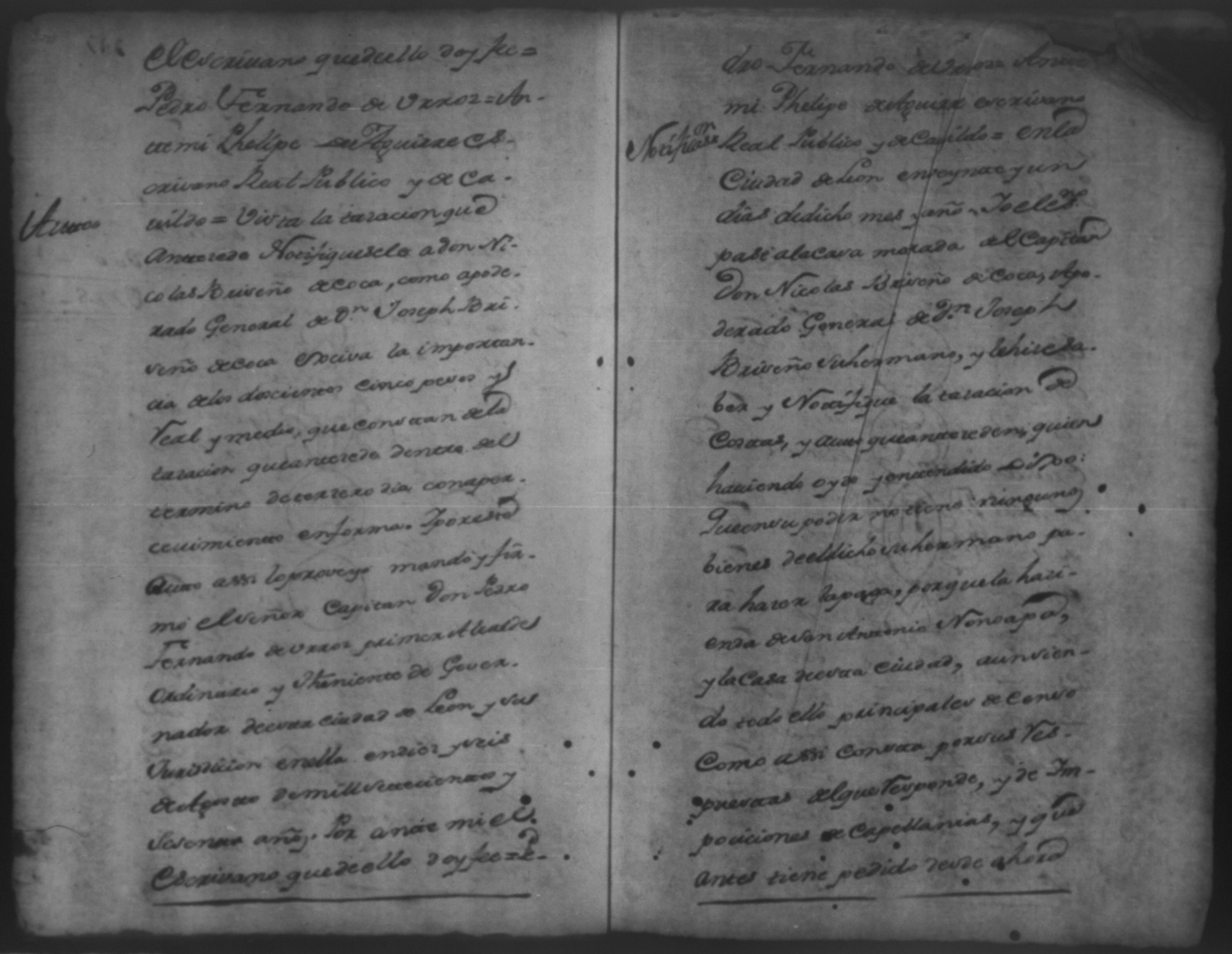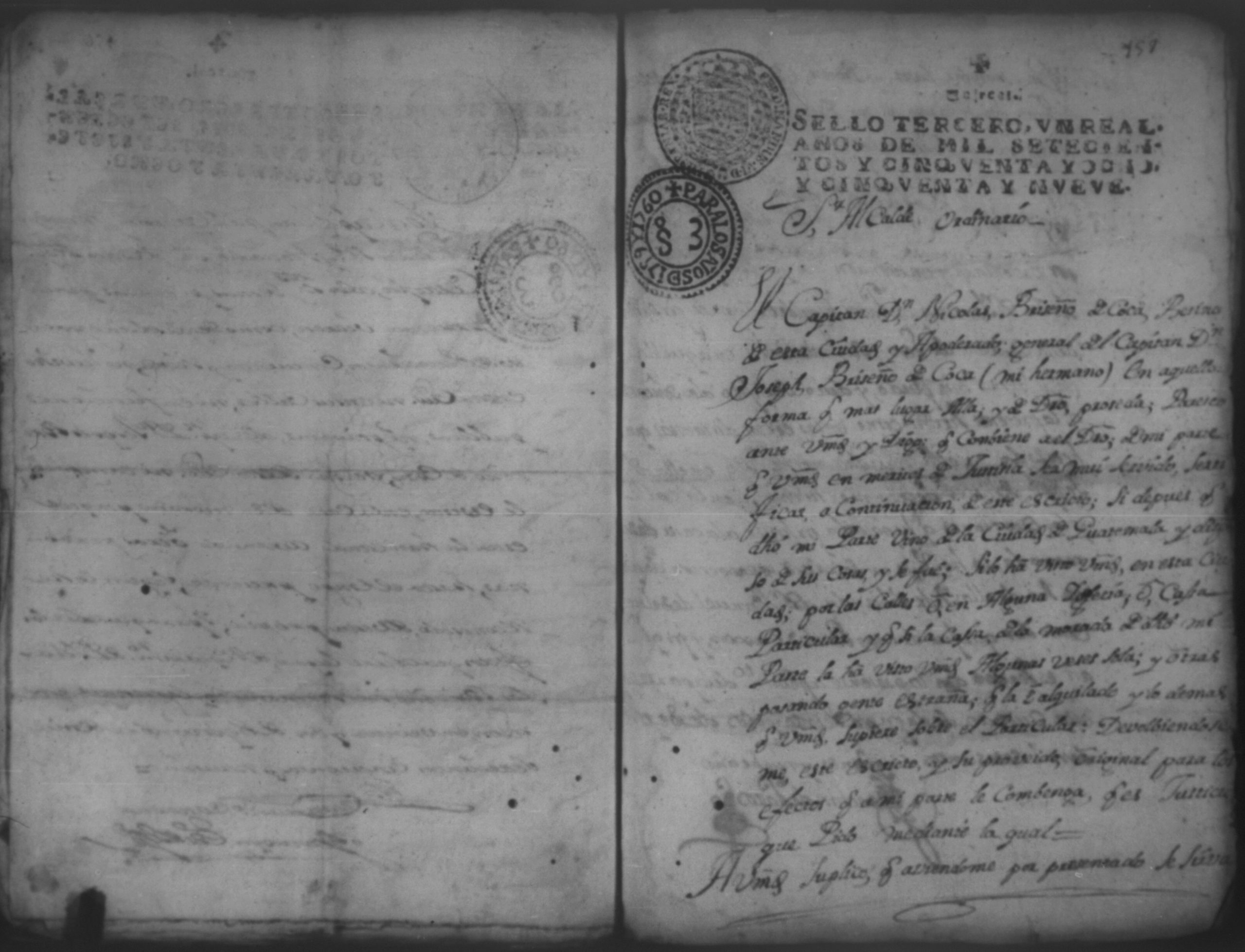 Temática: León. El Señor Capitan Don Francisco Antonio de [Somarriva] Primer Alcalde Ordinario y Theniente de Governador en ella y su jurisficcion dixo que por quanto ha llegado a su notisia que Don Nicolas Briseño de [Coca] esta pretendiendo sacar certificacion de algunos [designos] de esta ciudad.