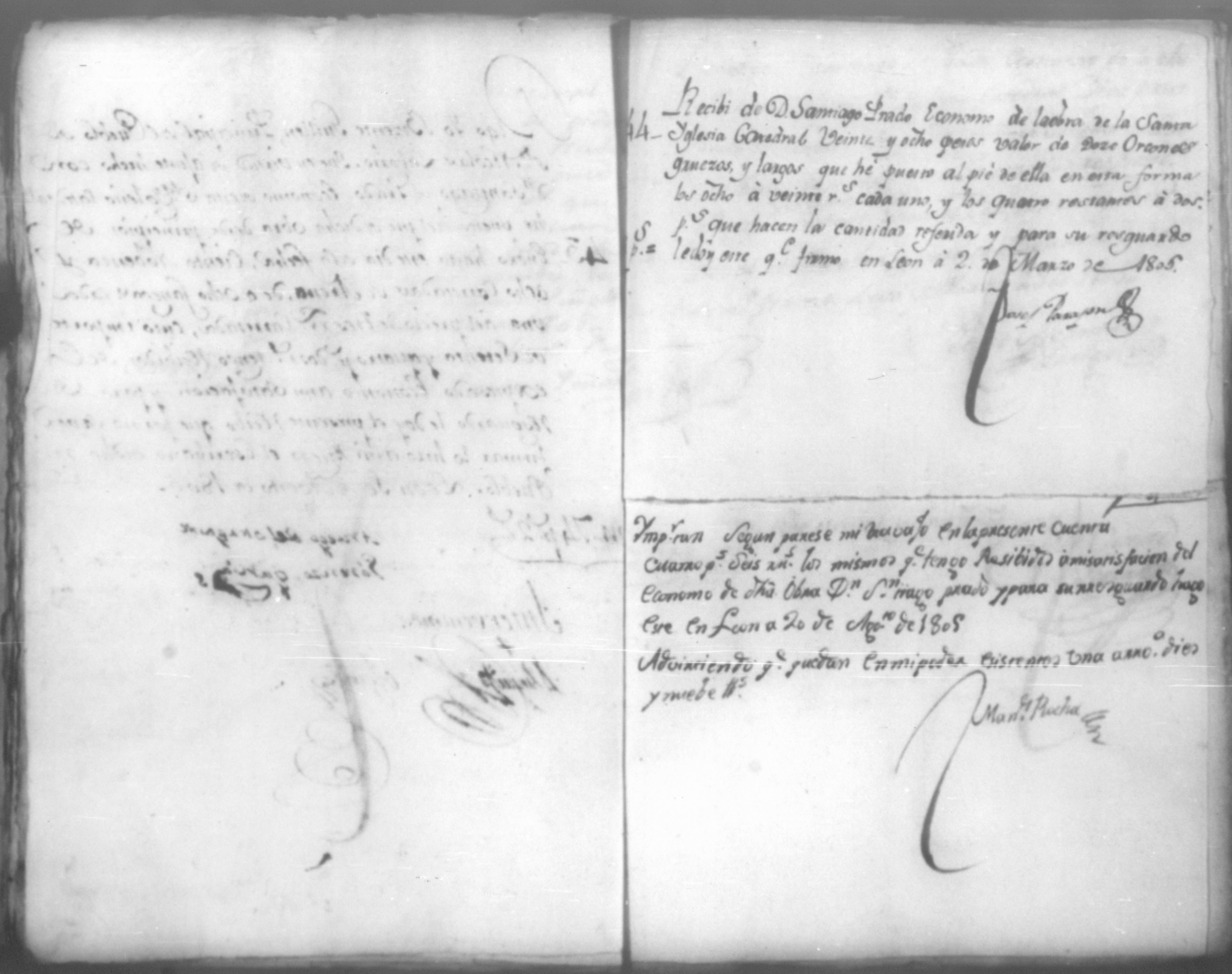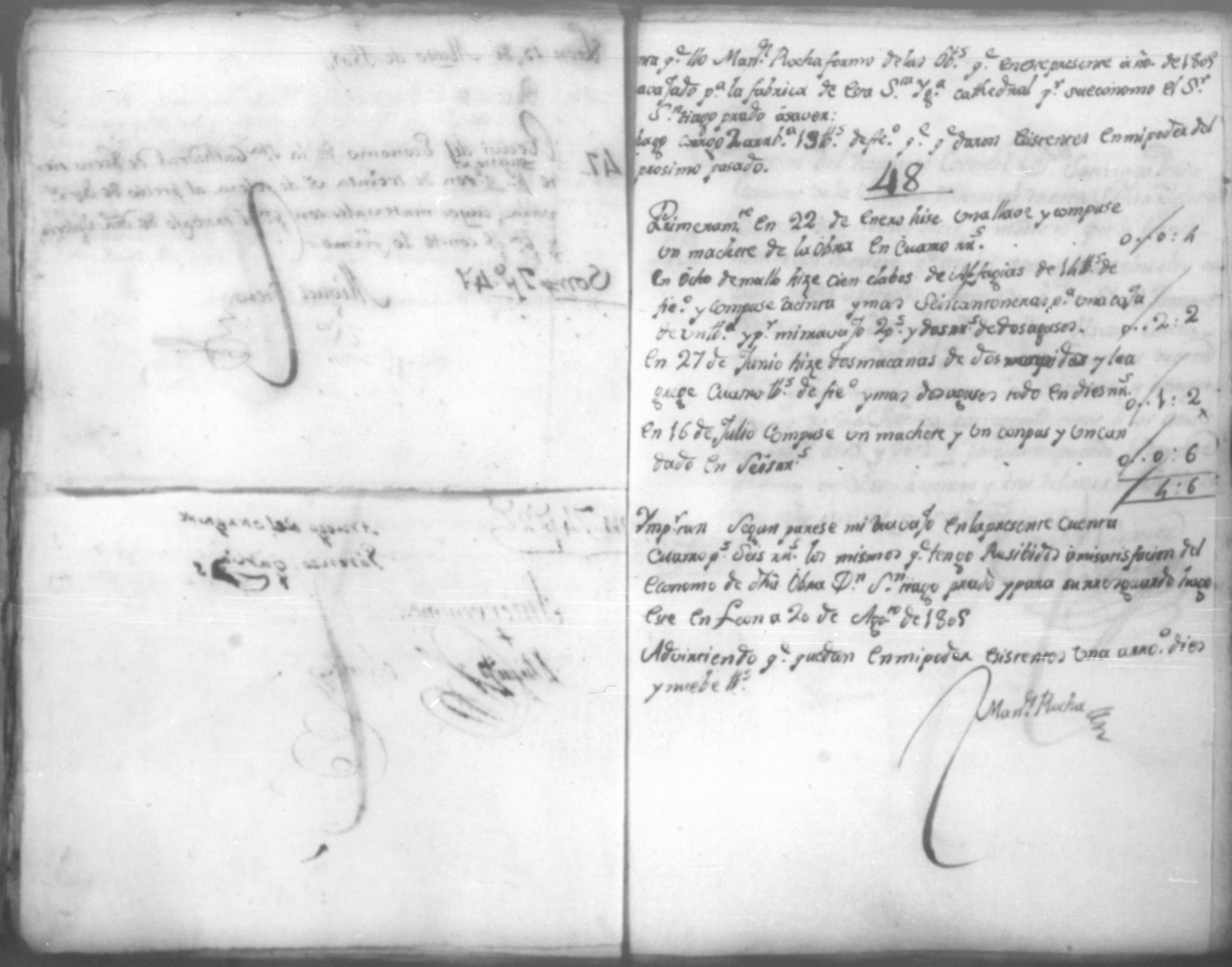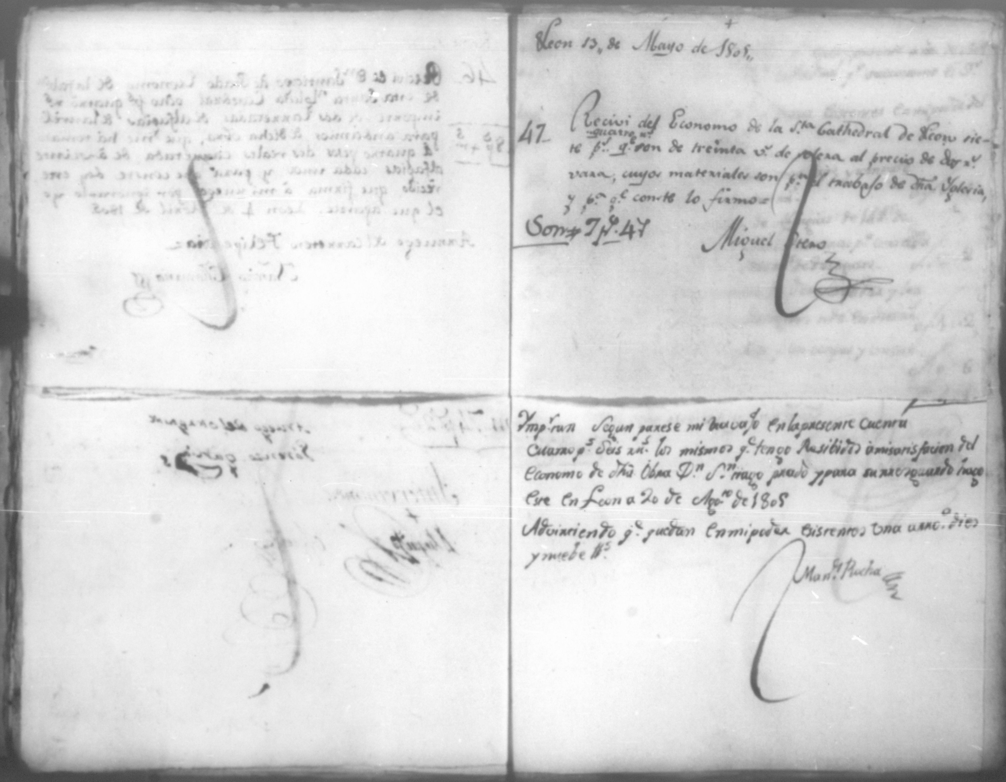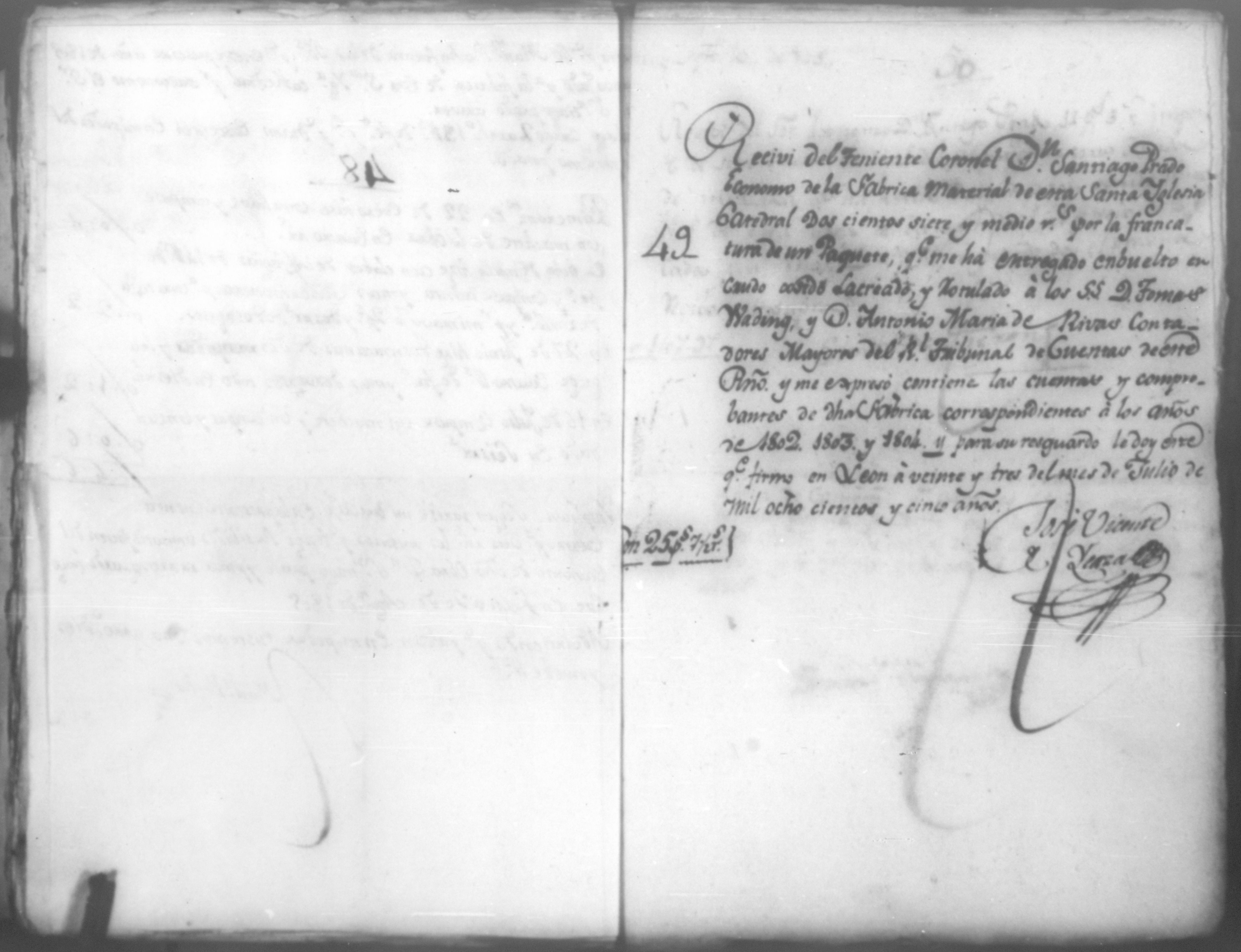Temática: Año de 1805. Cuaderno que contiene cincuenta y un comprobantes de cargo y data que acompañan a la cuenta de la obra material de la Santa Yglesia Catedral de León correspondiente a dicho año.