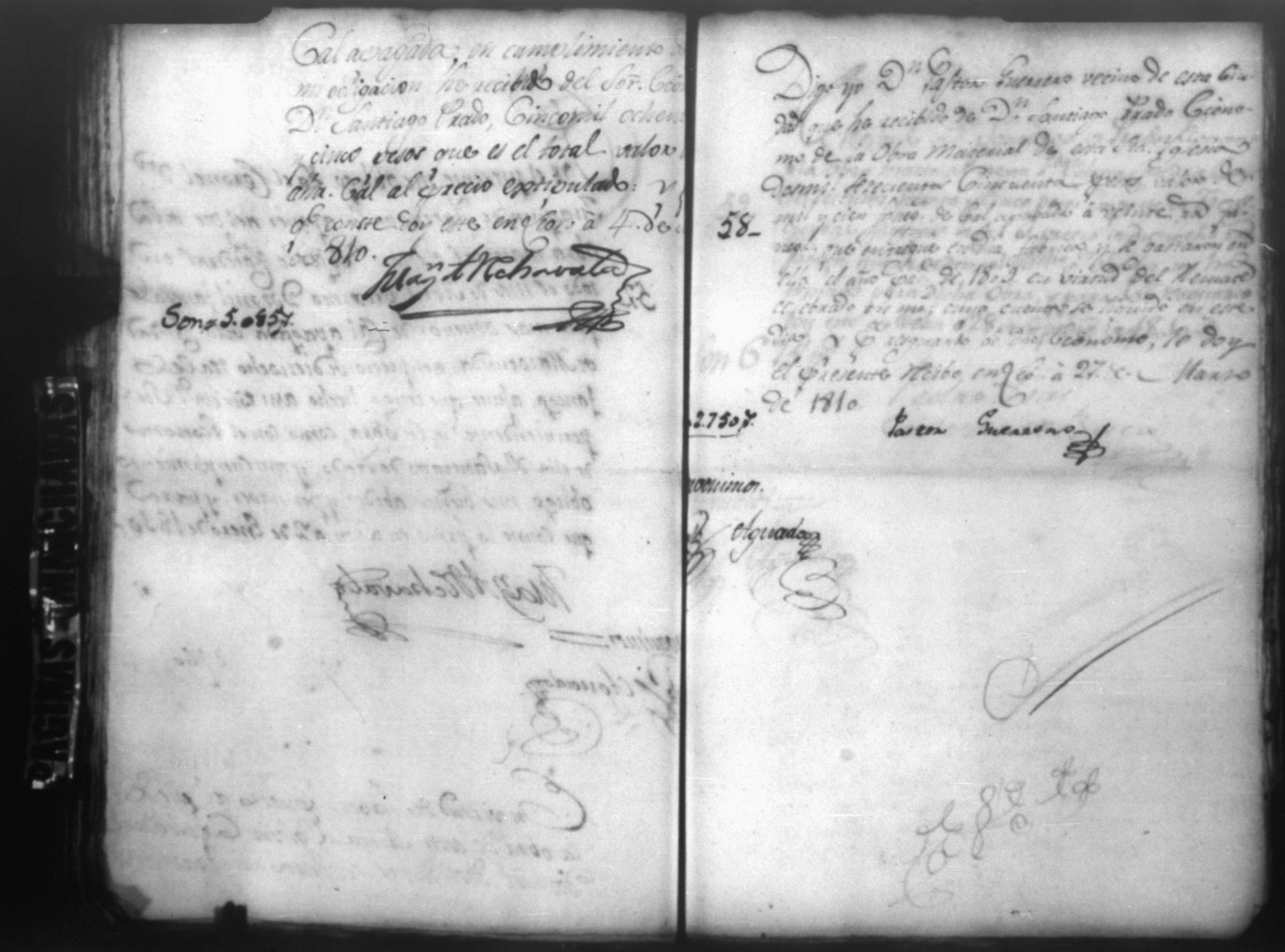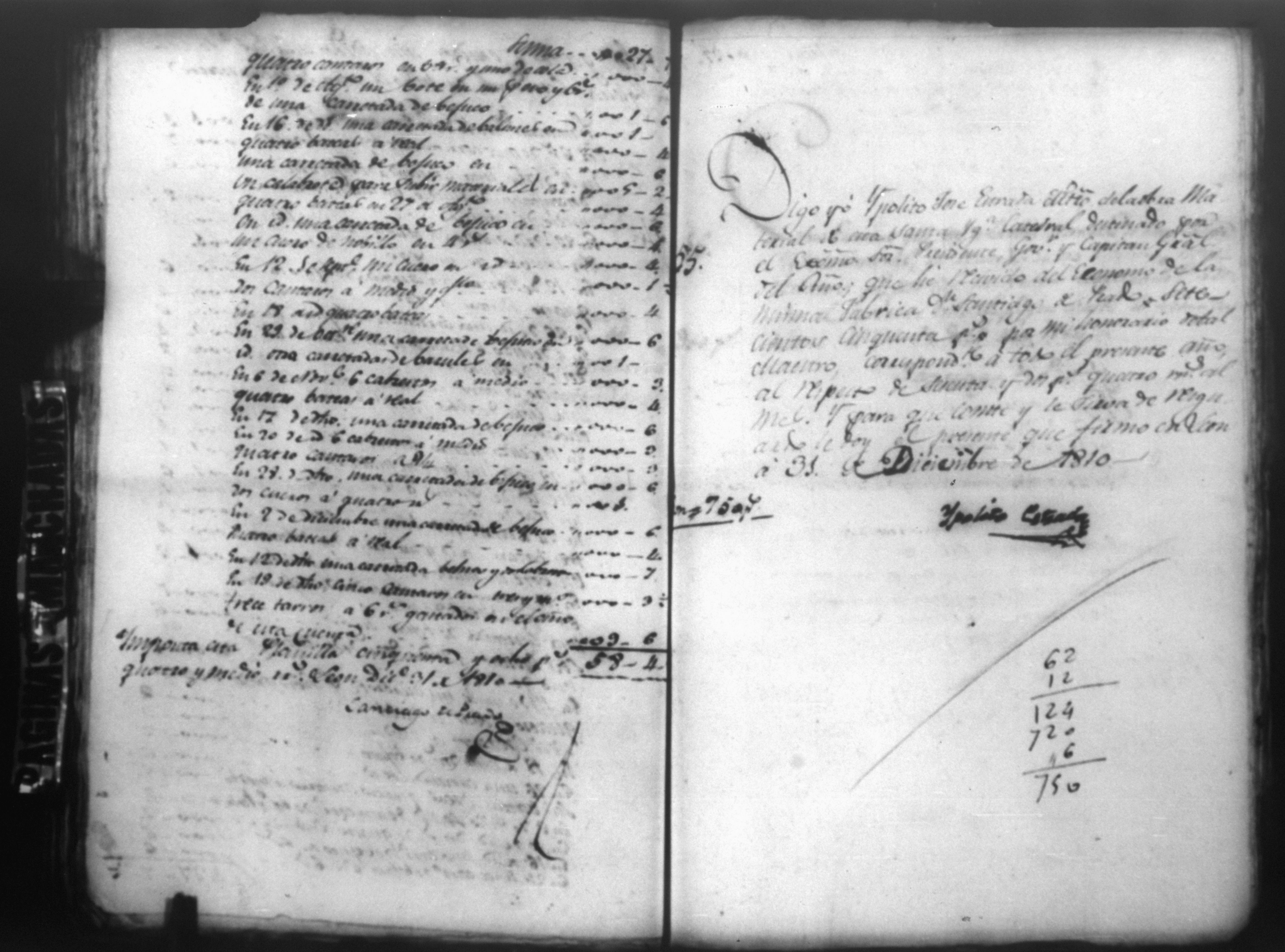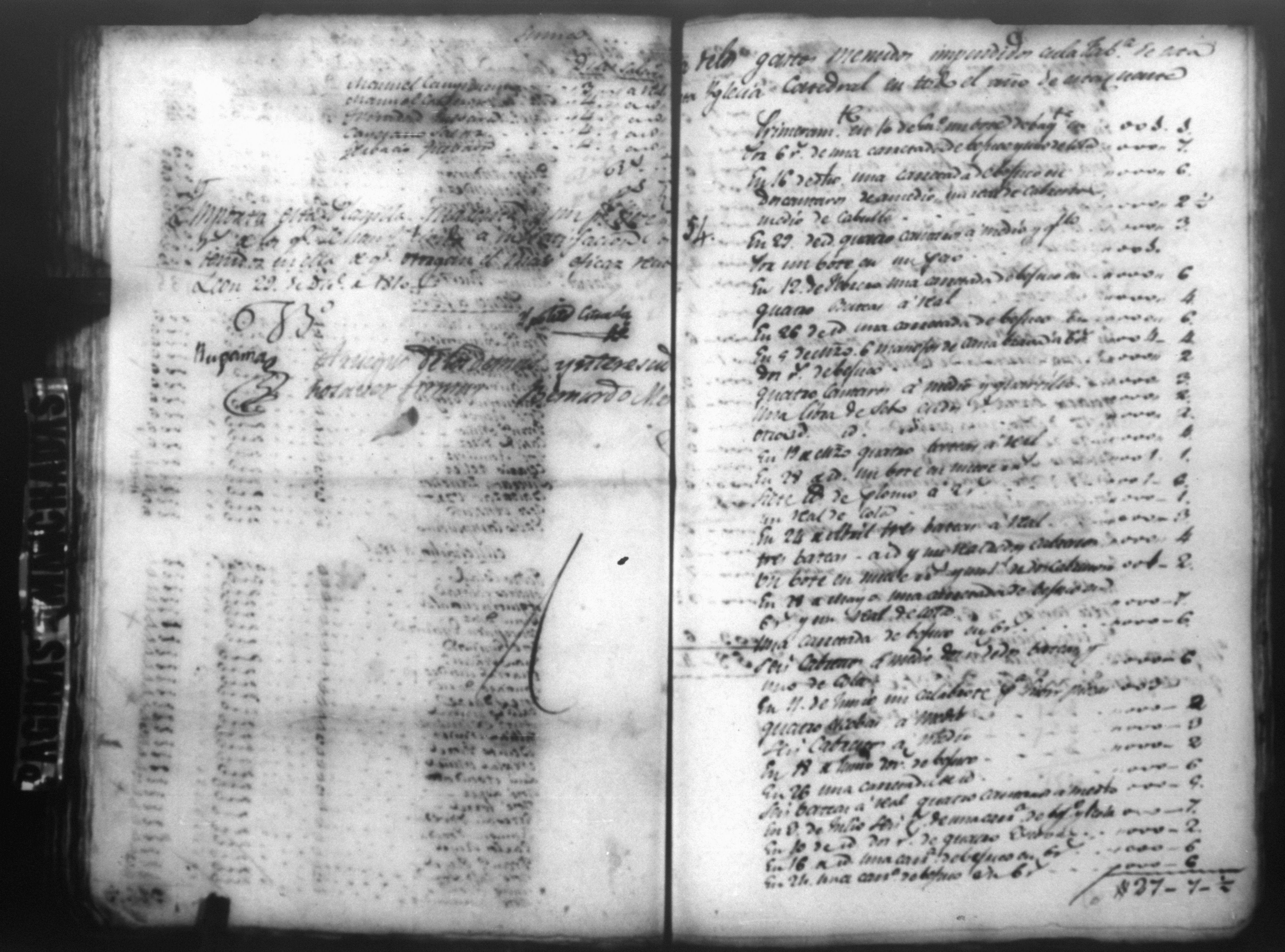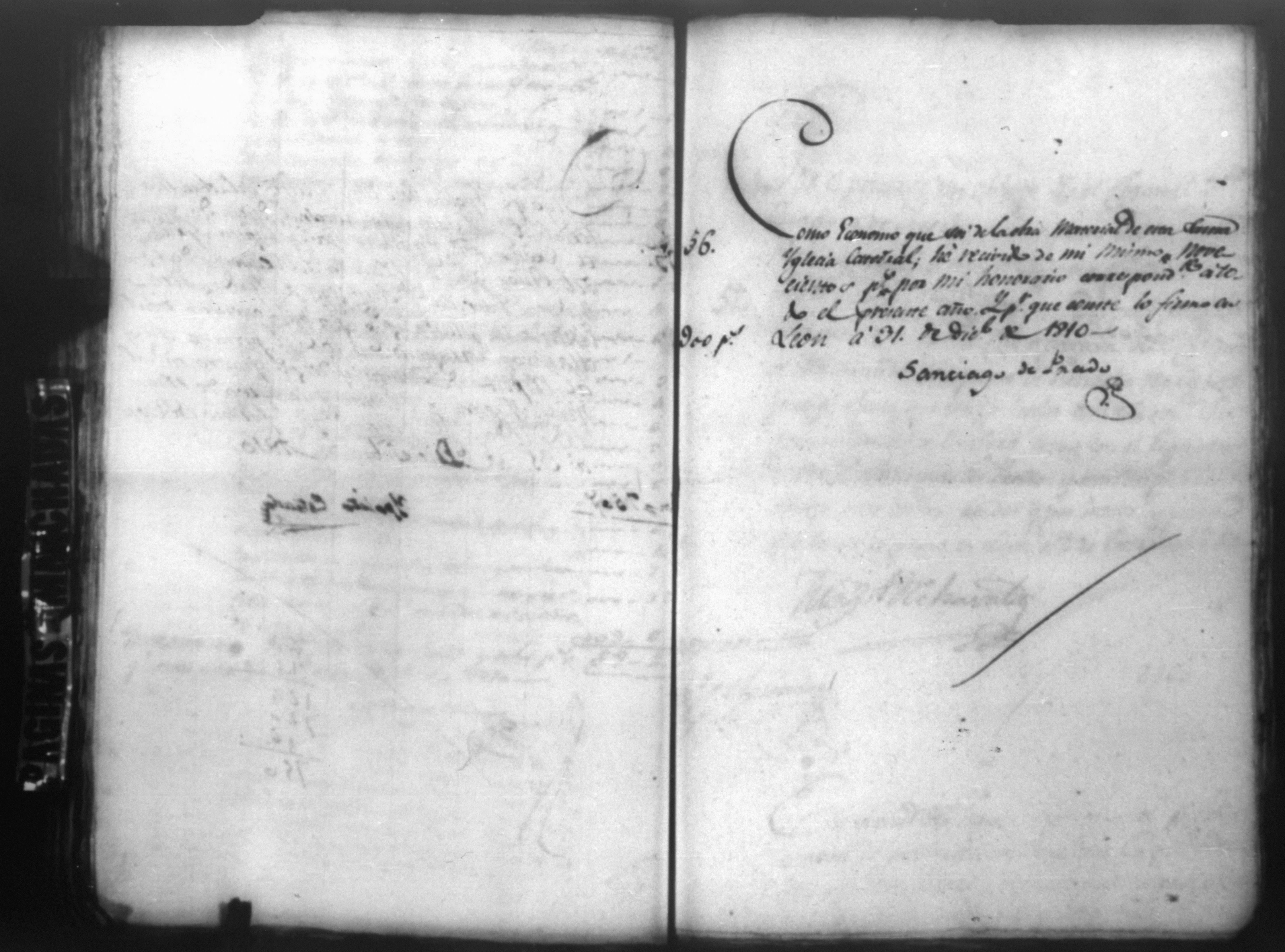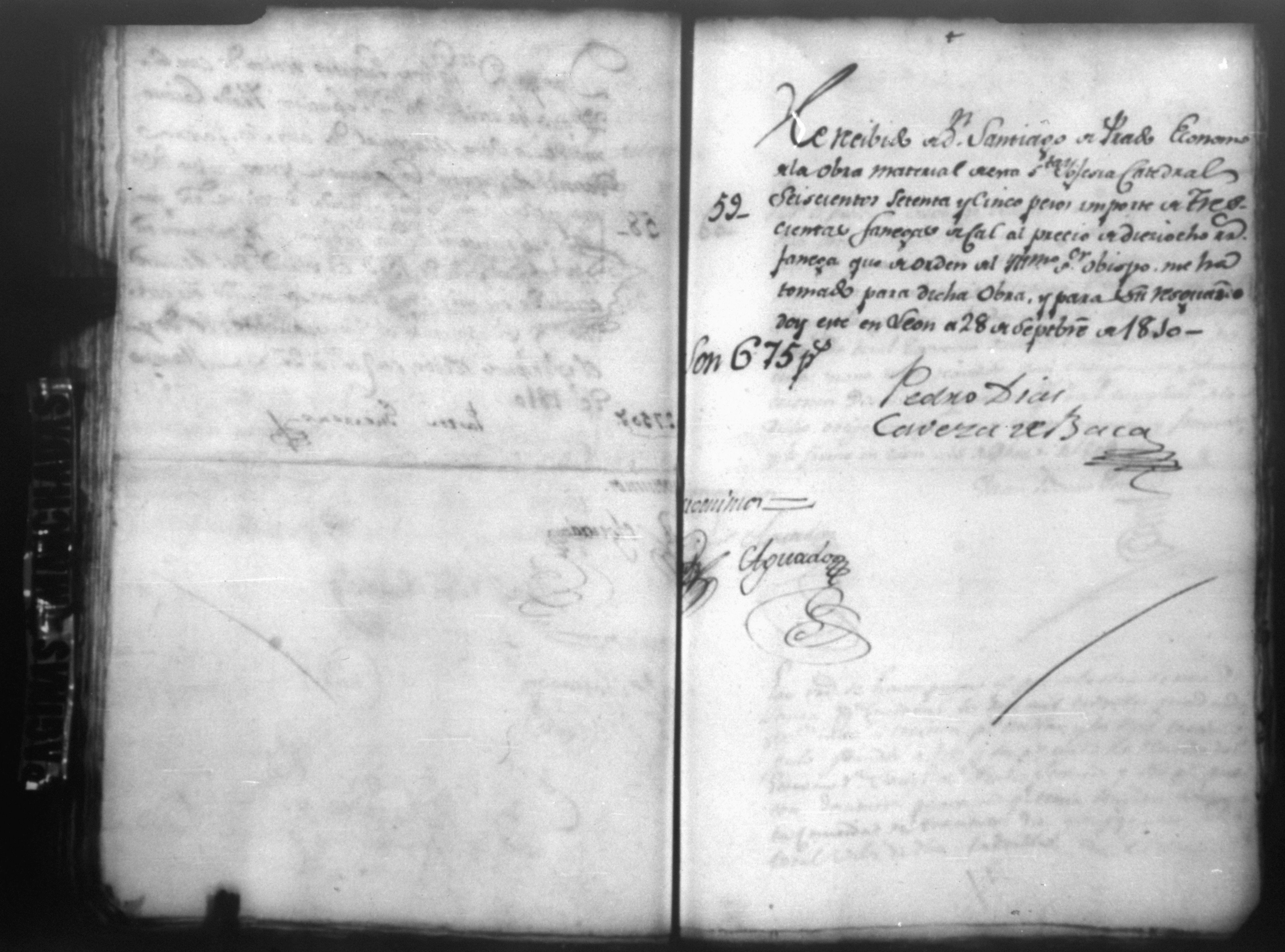 Temática: PÁGINAS MANCHADAS. Año de 1810 Quaderno Que comprende setenta y nueve comprobantes de Cargo y de Data, con Ochenta foxas que aconpañan a la Cuenta de la obra material de la Santa Yglesia Catedral de Leon, correpondiente a dicho año y se dirixe al Real Tribunal […] de Contaduria [mayor] de este Reyno.