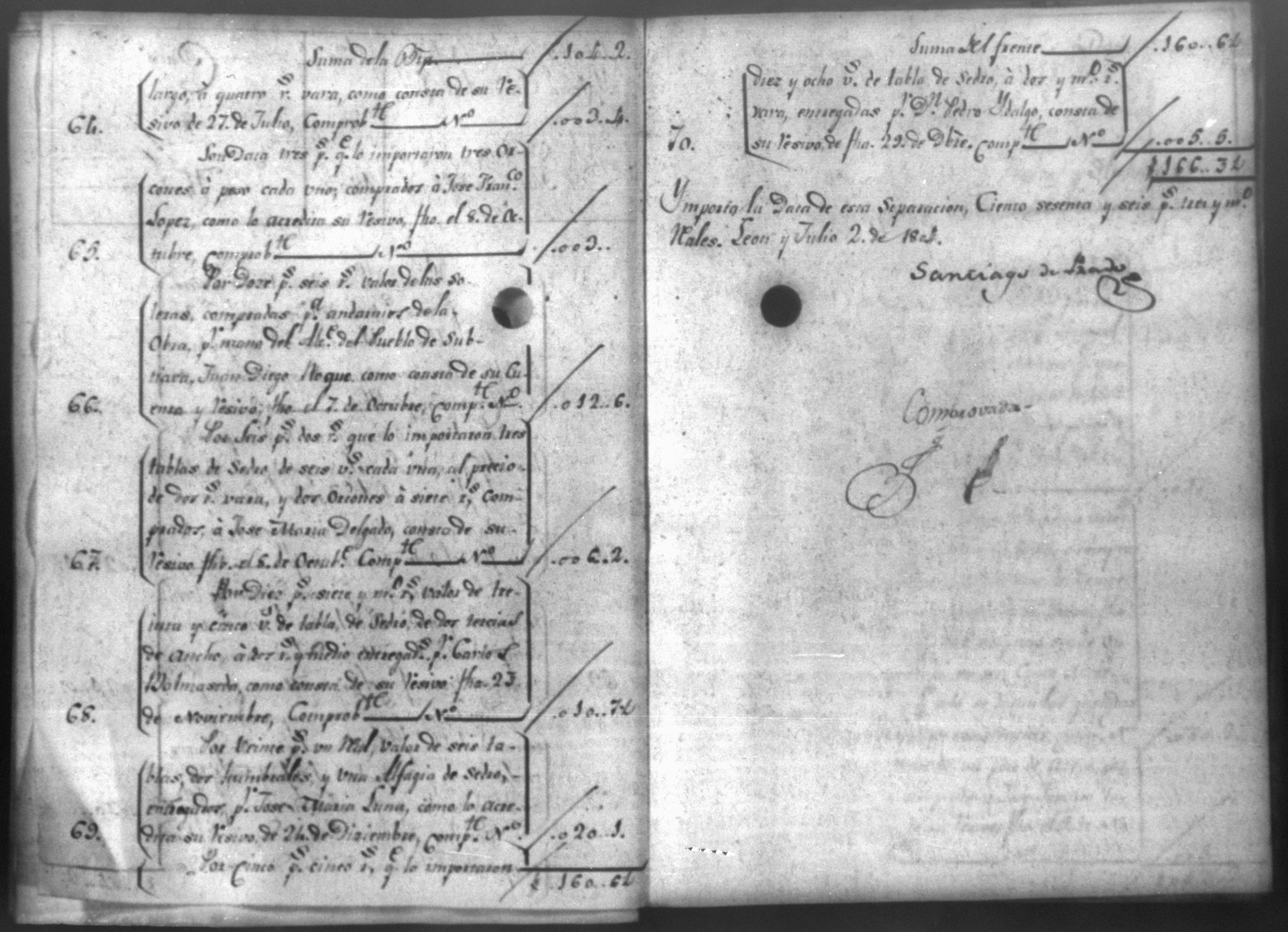 Temática: Cuenta que yo Joseph Felipe Santa Maria, Maestro de la obra Material de la Santa Yglesia Cathedral de la Ciudad de Leon de Nicaragua, formo de los pies cubicos. hechos en ella, desde el dia primero del mes de Enero del año de 1803 hasta el dia 26 del mes de Noviembre del mismo año, y es como sigue. Pies cubicos Primeramente en ciento secenta v. de [corn.za] ...