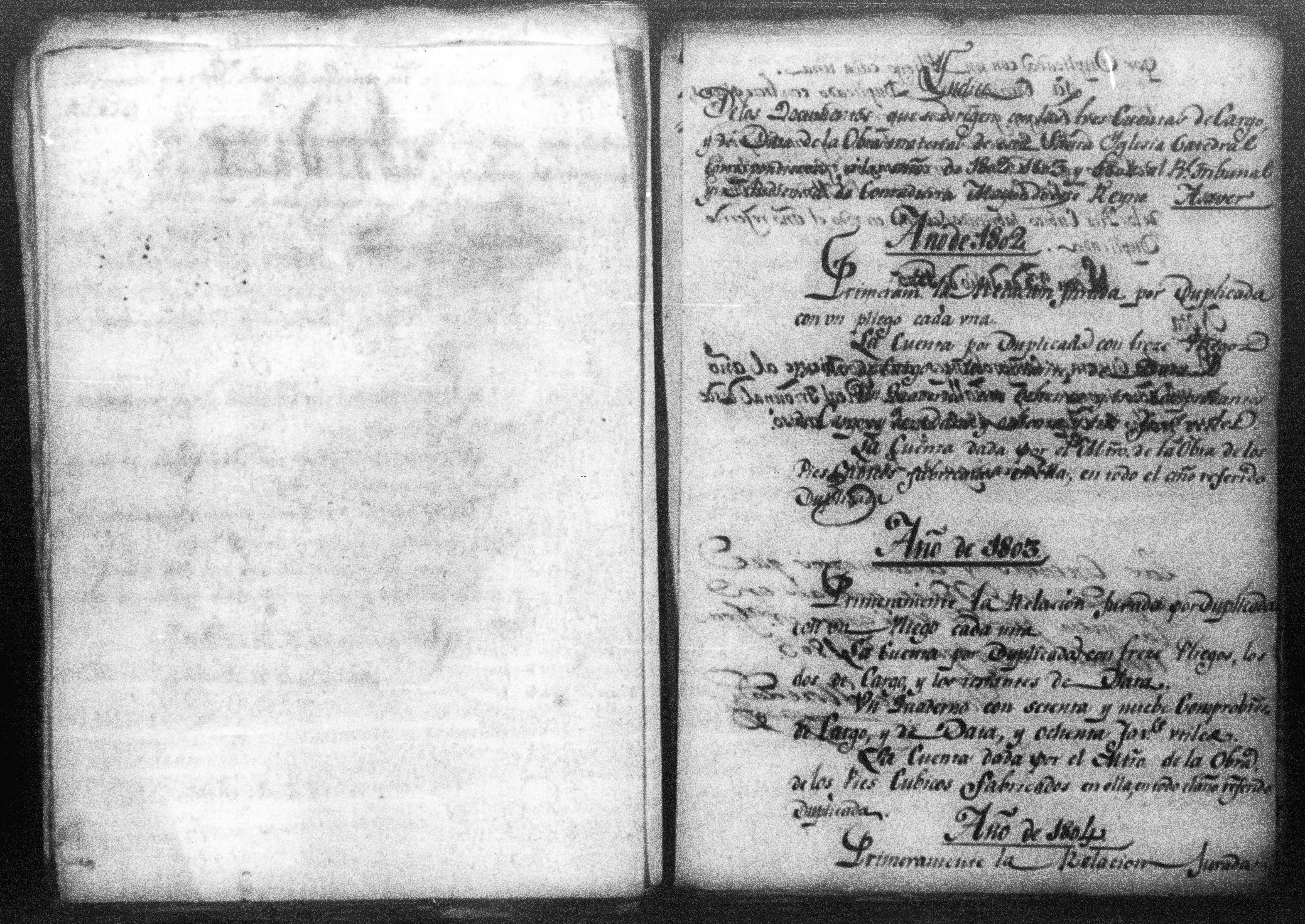 Temática: Dirijo a V. SS. la cuenta, y comprobantes, de los gastos causados en la obra material de esta Santa Iglesia Catedral en todo el año pasado de 1801 que ha estado á mi cargo; de cuios documentos que manifiesta el adjunto Yndize por duplicado se han de servir V. SS. mandar se me dé el que acredite quedar presentadas á ese Real Tribunal y Audiencia de Contaduria maior. Dios guarde á V. SS. muchos años. Leon y Agosto 8 de 1802. Santiago de Prado.