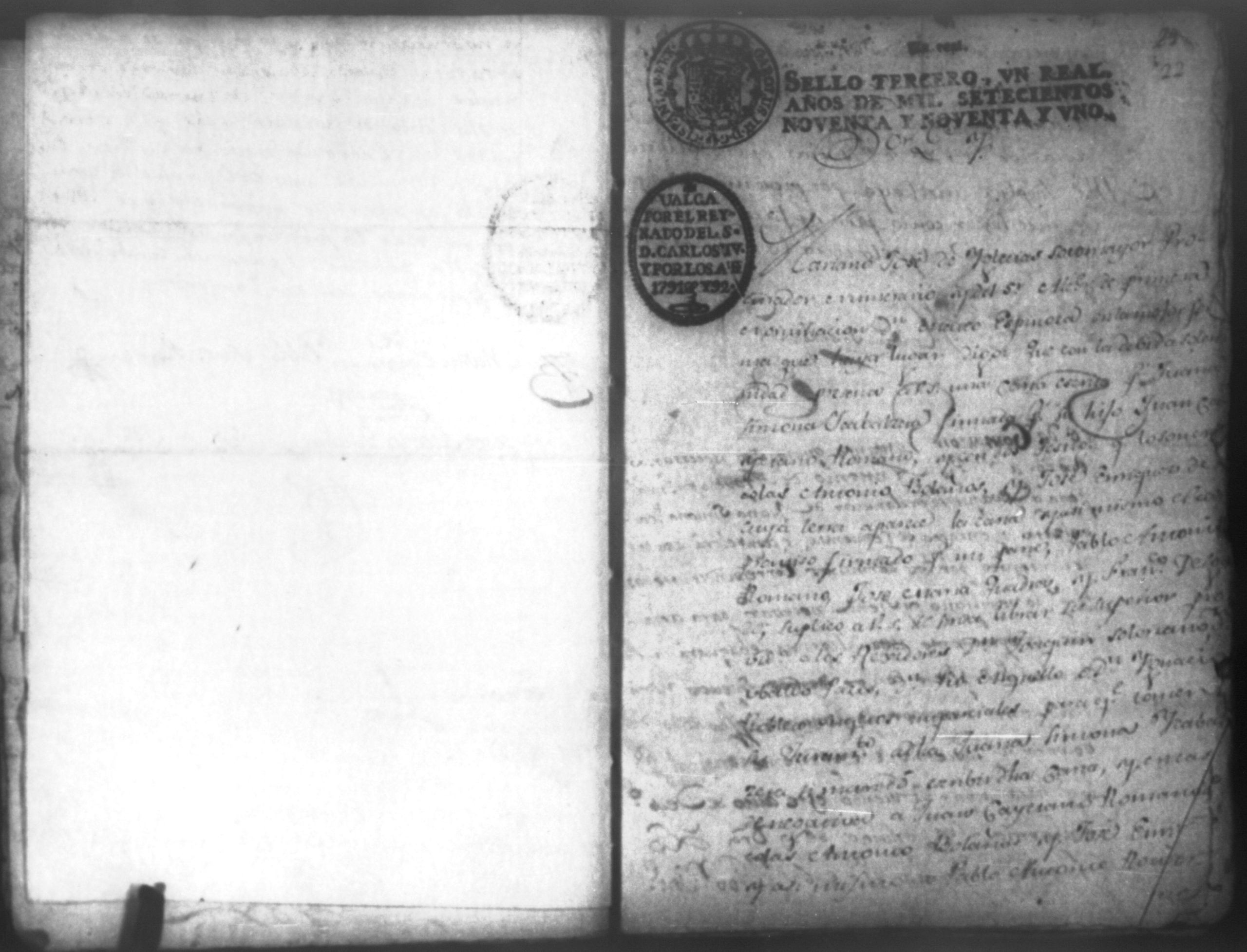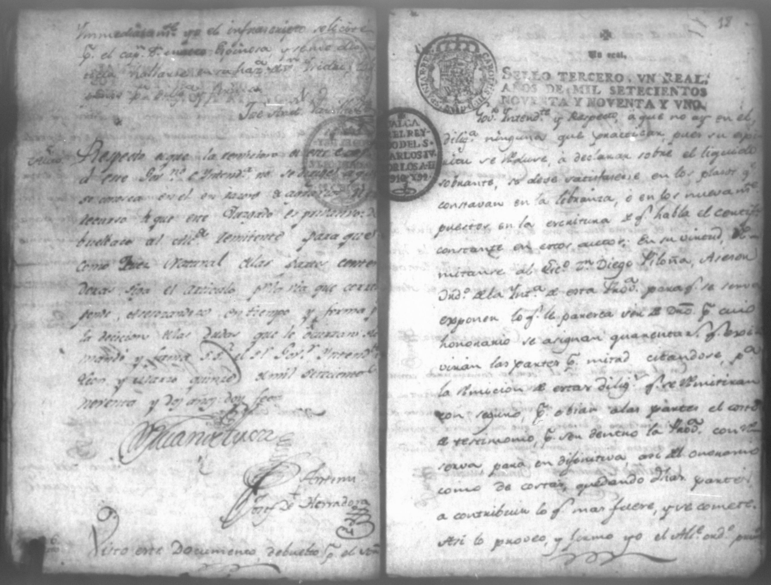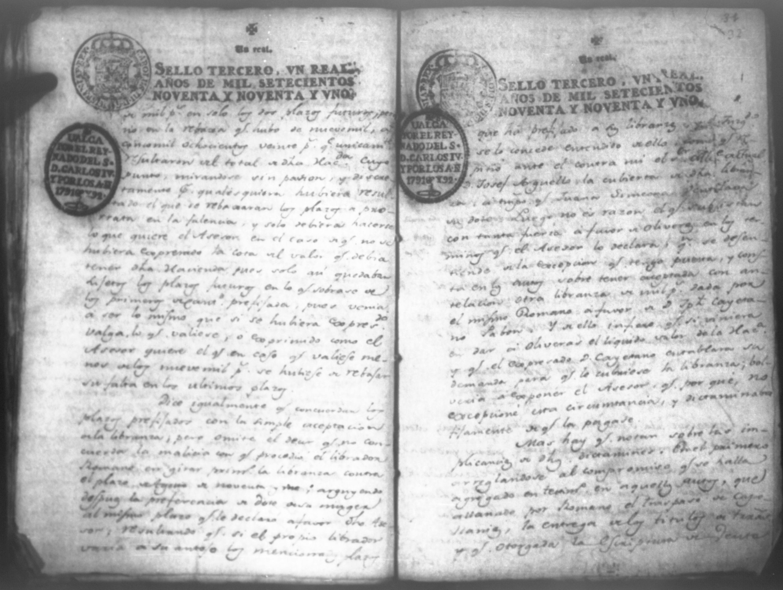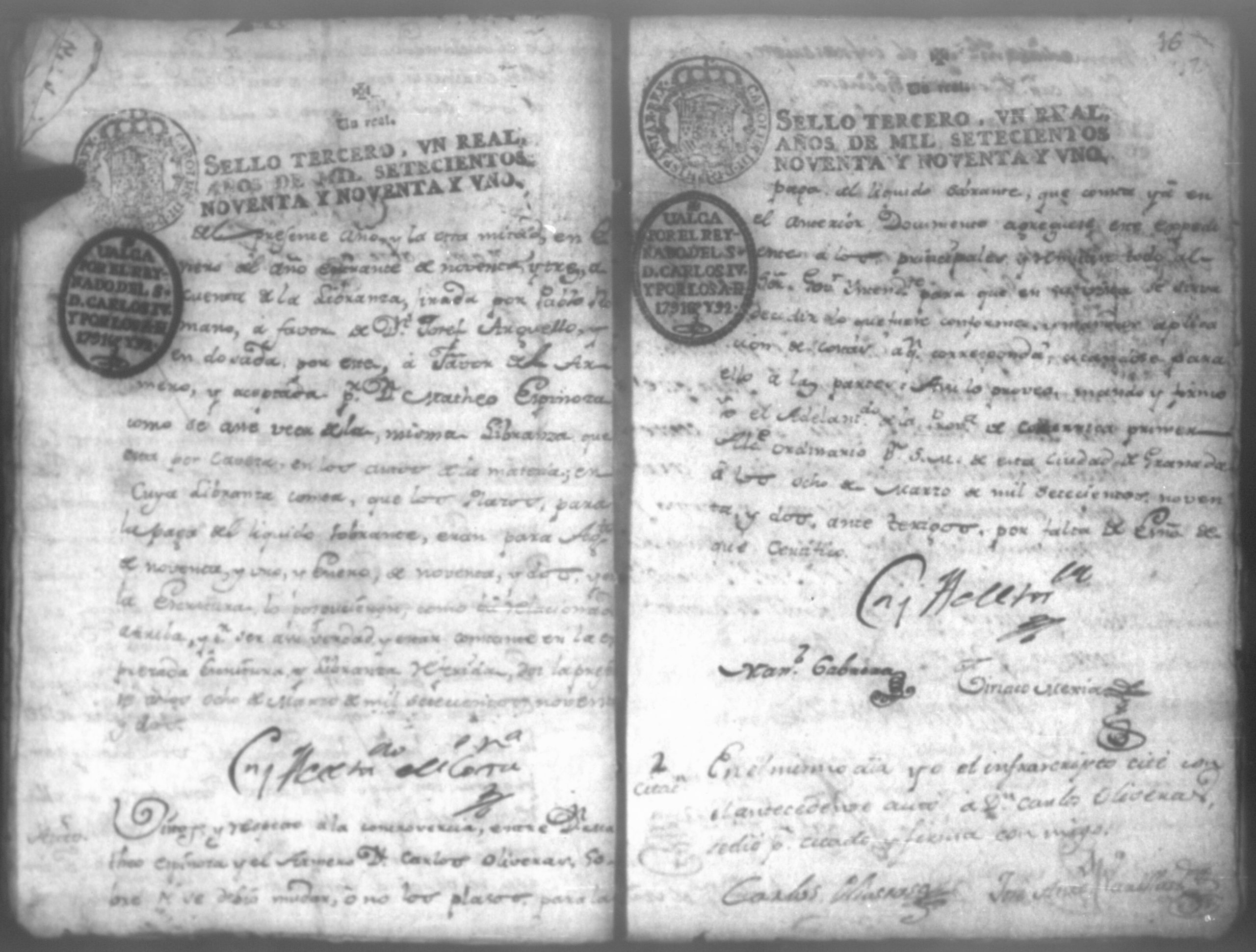 Temática: Audiencia León, 1792. De los Autos que sigue don Cayetano Pavón con don Carlos Oliveras sobre que se satisfaga con preferencia la libranza que obtuvo el primero de don Mateo Espinosa a la que este dio después a favor del segundo. Contiene: la instancia seguida en Costa Rica. "+ Señor Alcalde de primer voto. Don Carlos Olivares, vecino de esta Ciudad, en la mejor forma que haya lugar en derecho: ante Vuestro Señor parezco y digo: Que sin perjuicio del derecho que tengo contra el principal deudor, ó endosante Don Josef Arguello en la cantidad de mil novecientos y veinte pesos de que me tiene endorsada libranza de Pablo Romano, en este forma: mil y quatrocientos pesos para el primer plazo que fue en Agosto de noventa y uno; Y los quinientos y veinte para enero de noventa y dos: Y haviendosle presentado al Capital Don Matheo Espinosa que está por caveza, la aceptó y quedó a pagarla del liquido valor de la Hacienda expresada en dicha libranza [...] suplico á Vuestro Señor que por los terminos de la via executiva se sirva compeler a dicho Don Matheo a que cumpla su aceptacion que ofrecio, vajo de su firma [...]" (Extracto de los folios 11 y 11v.)