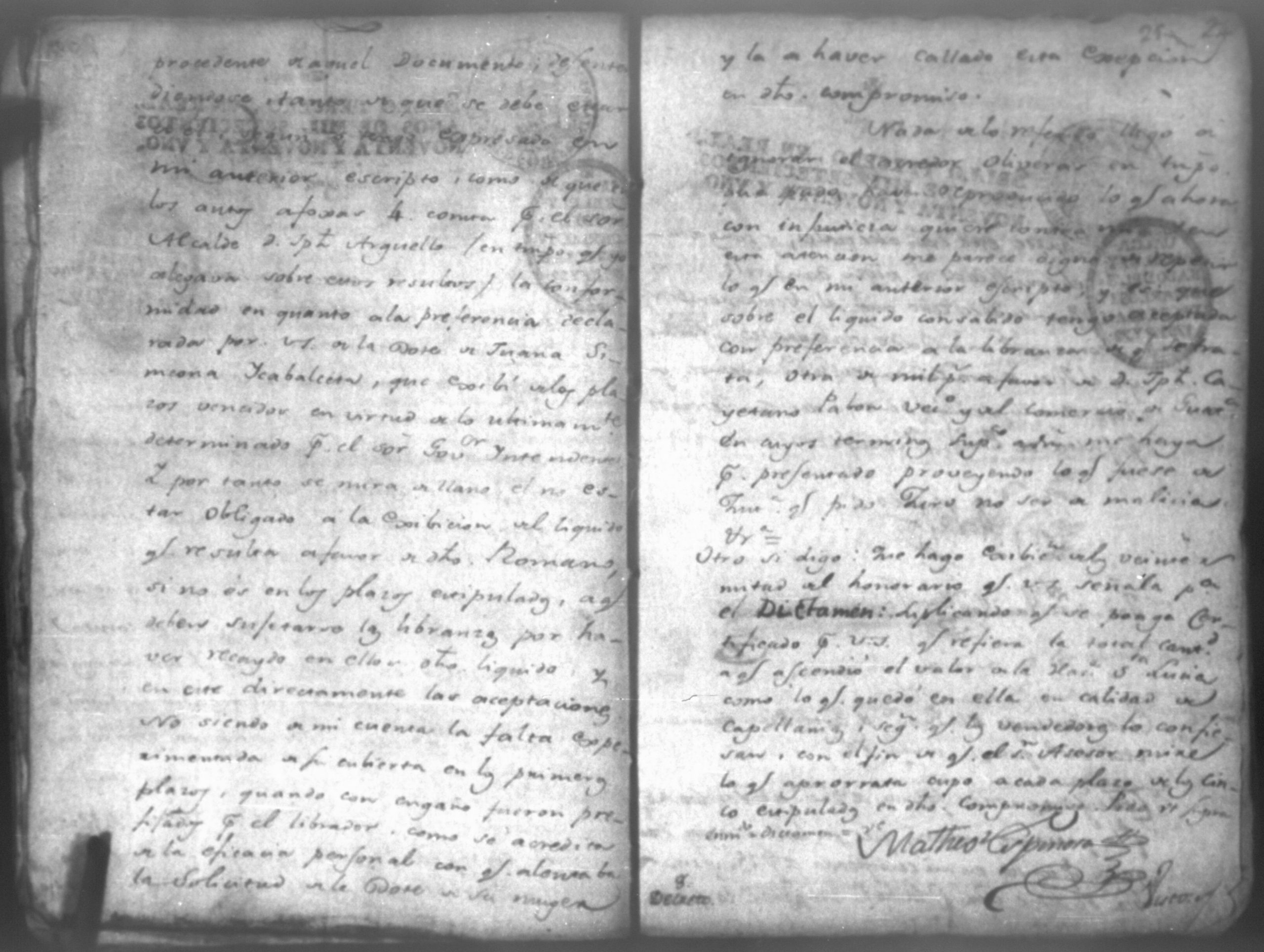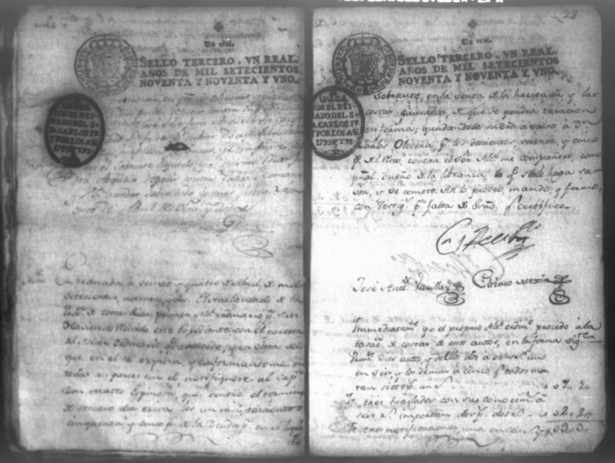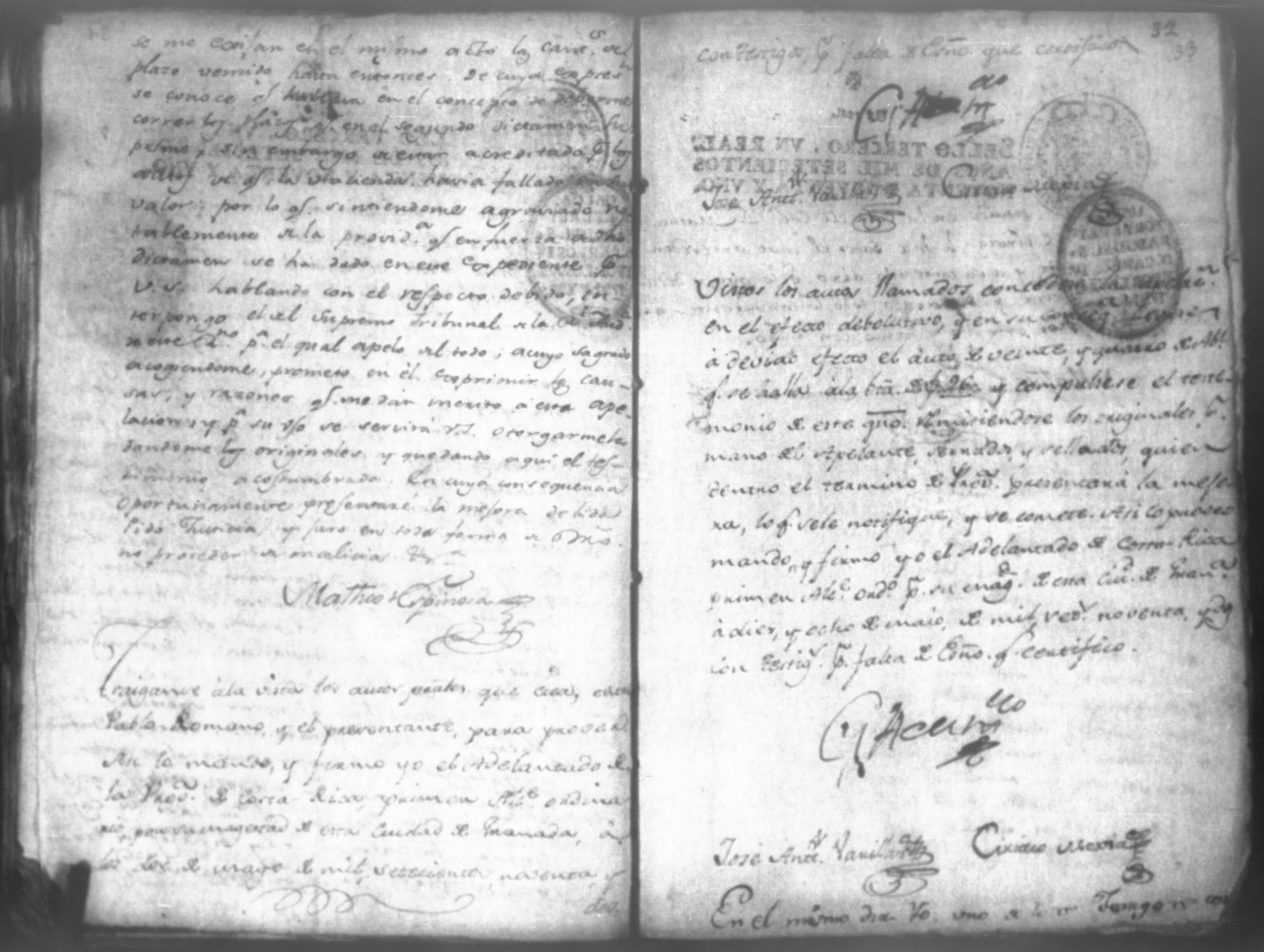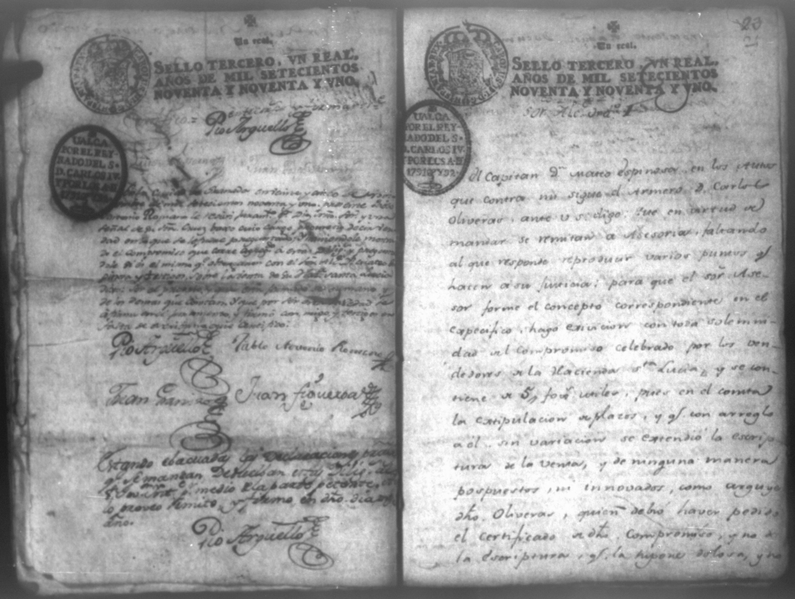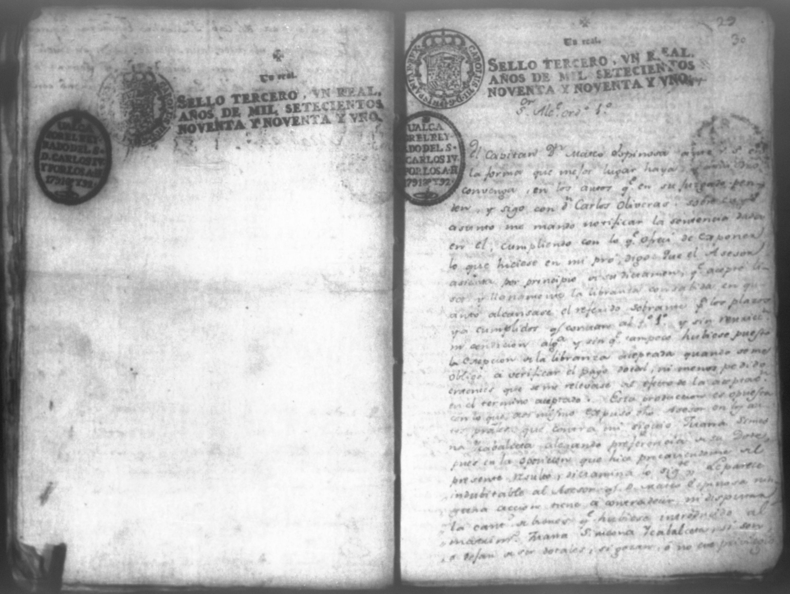 Temática: Audiencia León, 1792. De los Autos que sigue don Cayetano Pavón con don Carlos Oliveras sobre que se satisfaga con preferencia la libranza que obtuvo el primero de don Mateo Espinosa a la que este dio después a favor del segundo. Contiene: la instancia seguida en Costa Rica. "+ Señor Alcalde de primer voto. Don Carlos Olivares, vecino de esta Ciudad, en la mejor forma que haya lugar en derecho: ante Vuestro Señor parezco y digo: Que sin perjuicio del derecho que tengo contra el principal deudor, ó endosante Don Josef Arguello en la cantidad de mil novecientos y veinte pesos de que me tiene endorsada libranza de Pablo Romano, en este forma: mil y quatrocientos pesos para el primer plazo que fue en Agosto de noventa y uno; Y los quinientos y veinte para enero de noventa y dos: Y haviendosle presentado al Capital Don Matheo Espinosa que está por caveza, la aceptó y quedó a pagarla del liquido valor de la Hacienda expresada en dicha libranza [...] suplico á Vuestro Señor que por los terminos de la via executiva se sirva compeler a dicho Don Matheo a que cumpla su aceptacion que ofrecio, vajo de su firma [...]" (Extracto de los folios 11 y 11v.)
