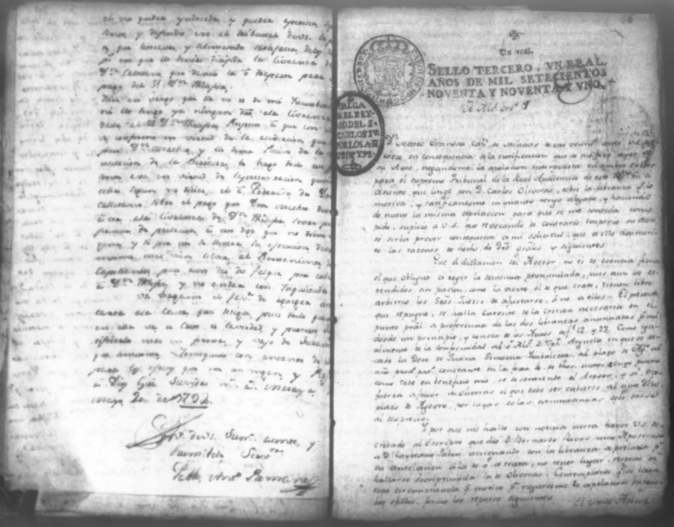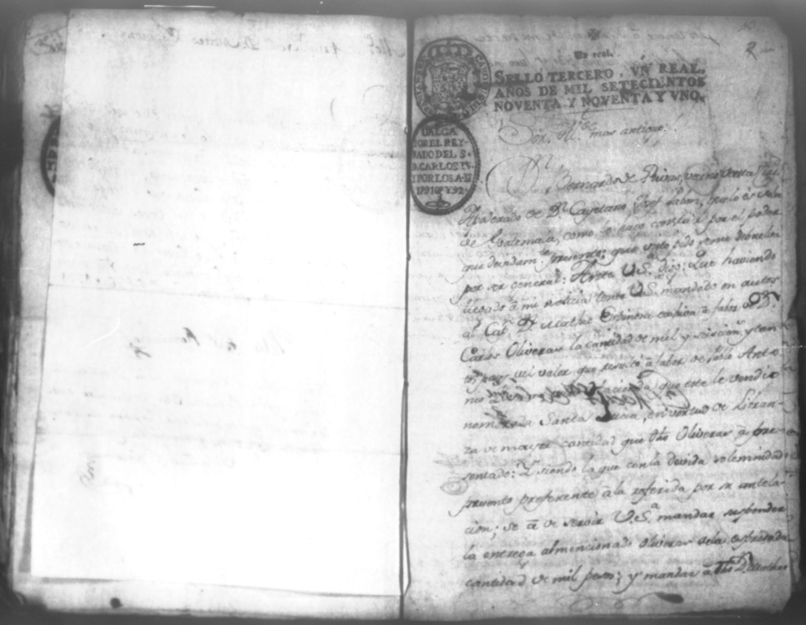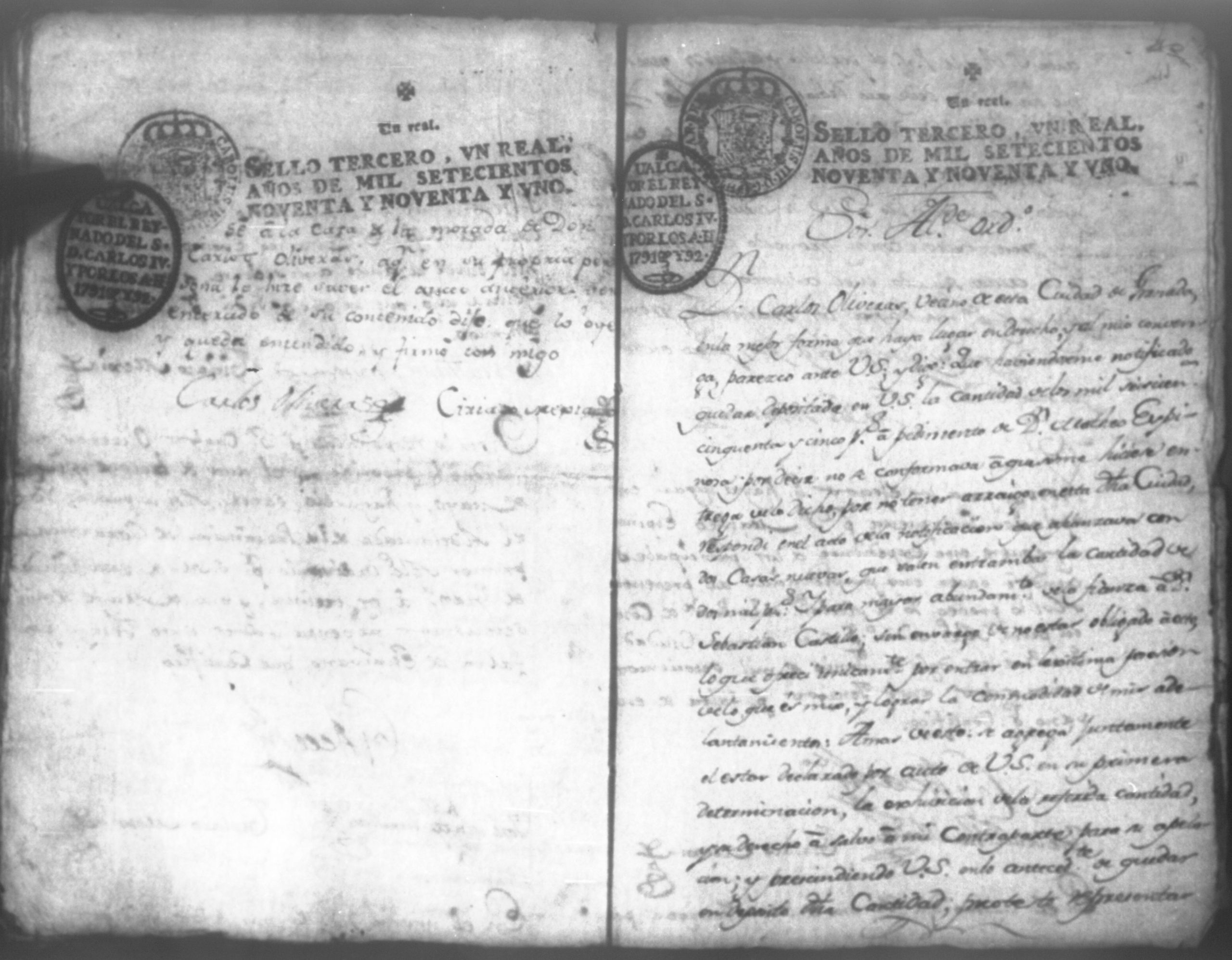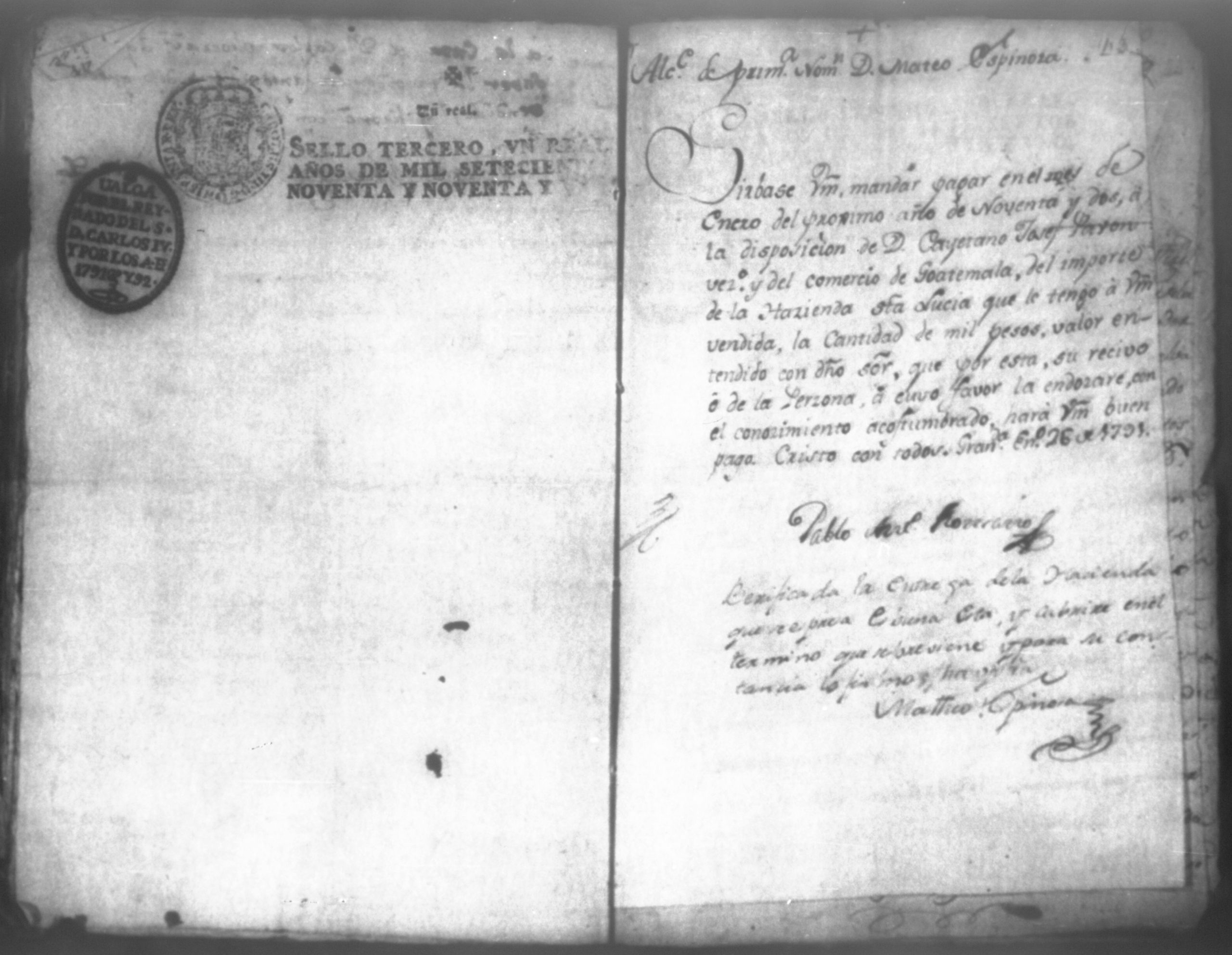 Temática: Audiencia León, 1792. De los Autos que sigue don Cayetano Pavón con don Carlos Oliveras sobre que se satisfaga con preferencia la libranza que obtuvo el primero de don Mateo Espinosa a la que este dio después a favor del segundo. Contiene: la instancia seguida en Costa Rica. "+ Señor Alcalde de primer voto. Don Carlos Olivares, vecino de esta Ciudad, en la mejor forma que haya lugar en derecho: ante Vuestro Señor parezco y digo: Que sin perjuicio del derecho que tengo contra el principal deudor, ó endosante Don Josef Arguello en la cantidad de mil novecientos y veinte pesos de que me tiene endorsada libranza de Pablo Romano, en este forma: mil y quatrocientos pesos para el primer plazo que fue en Agosto de noventa y uno; Y los quinientos y veinte para enero de noventa y dos: Y haviendosle presentado al Capital Don Matheo Espinosa que está por caveza, la aceptó y quedó a pagarla del liquido valor de la Hacienda expresada en dicha libranza [...] suplico á Vuestro Señor que por los terminos de la via executiva se sirva compeler a dicho Don Matheo a que cumpla su aceptacion que ofrecio, vajo de su firma [...]" (Extracto de los folios 11 y 11v.)