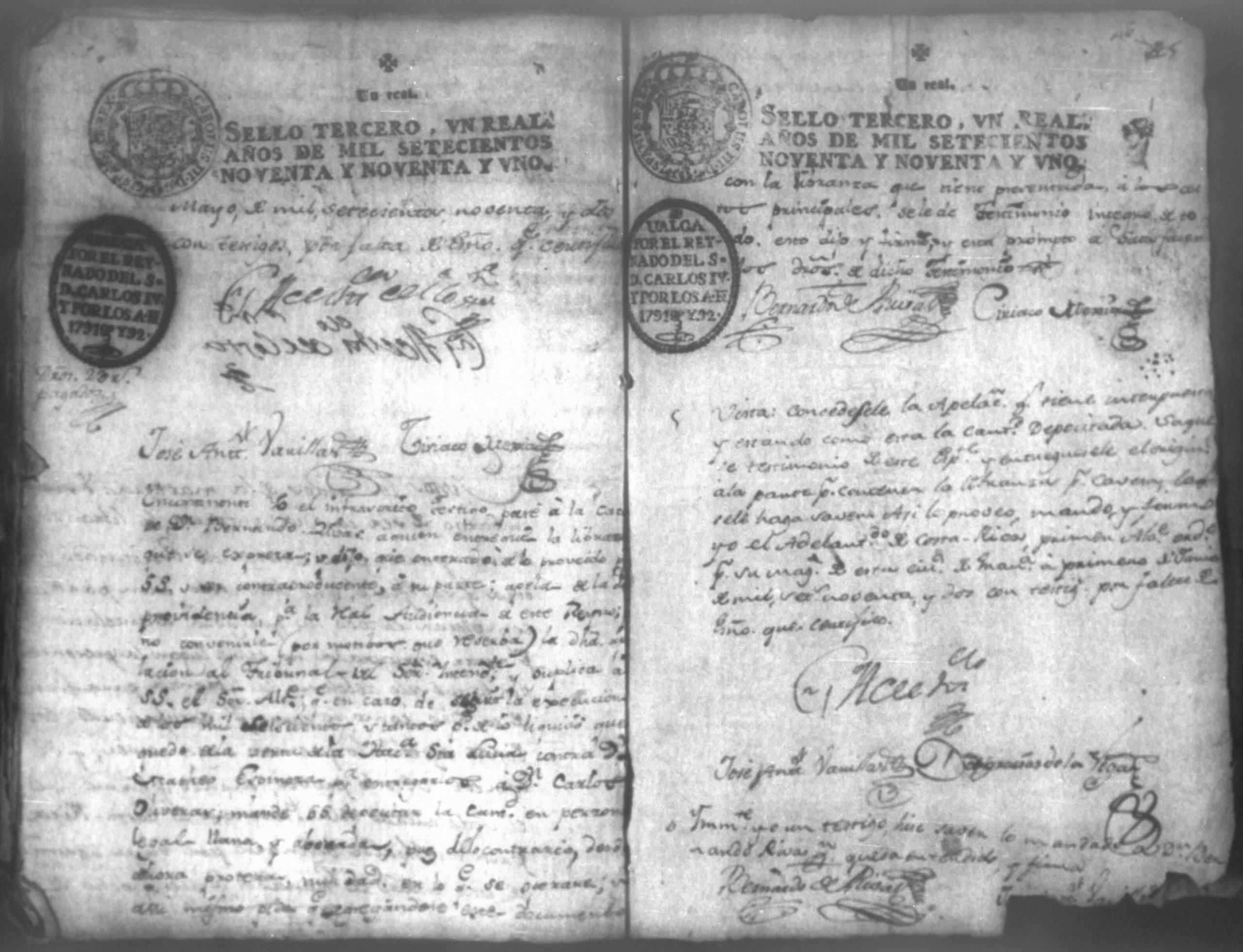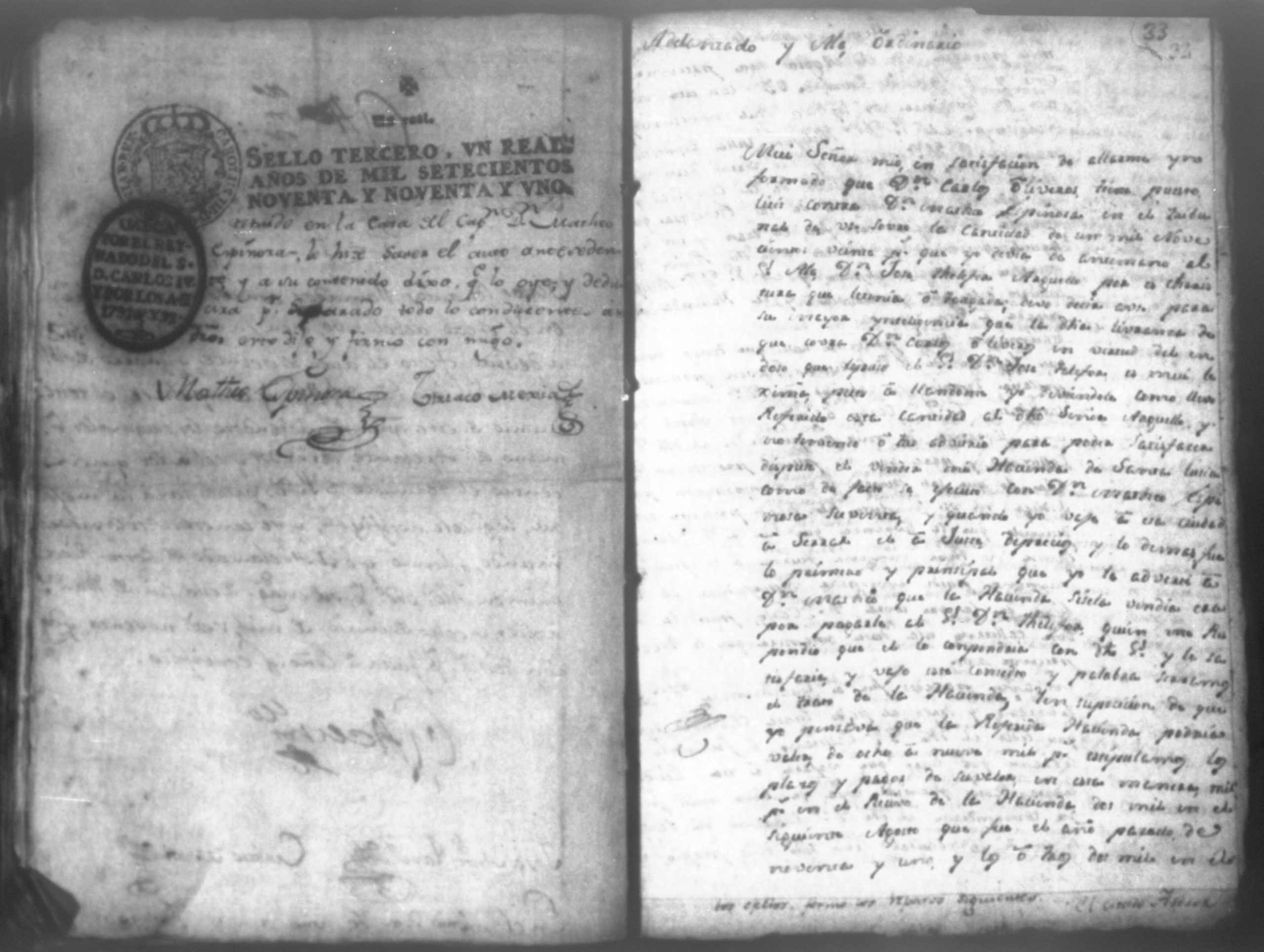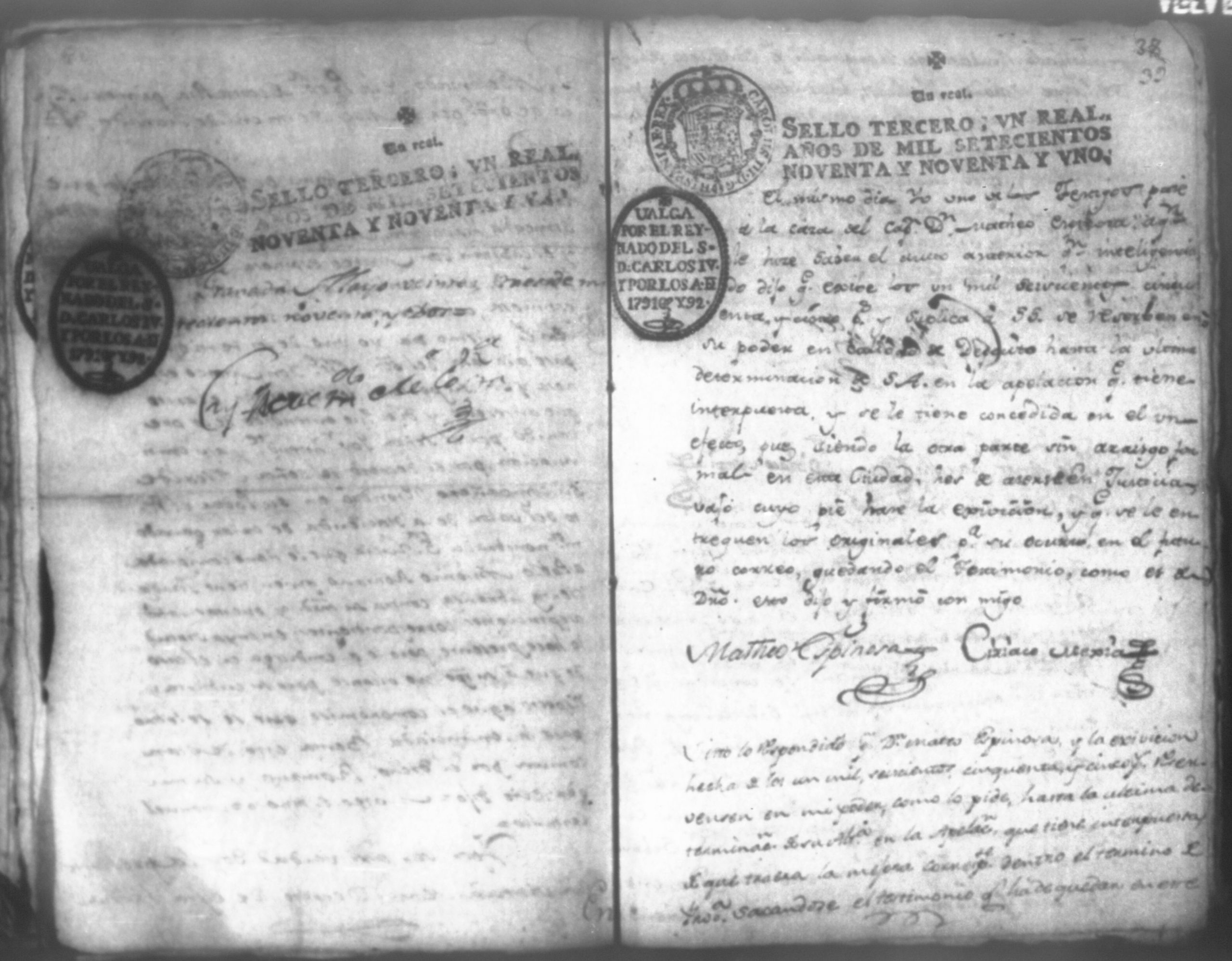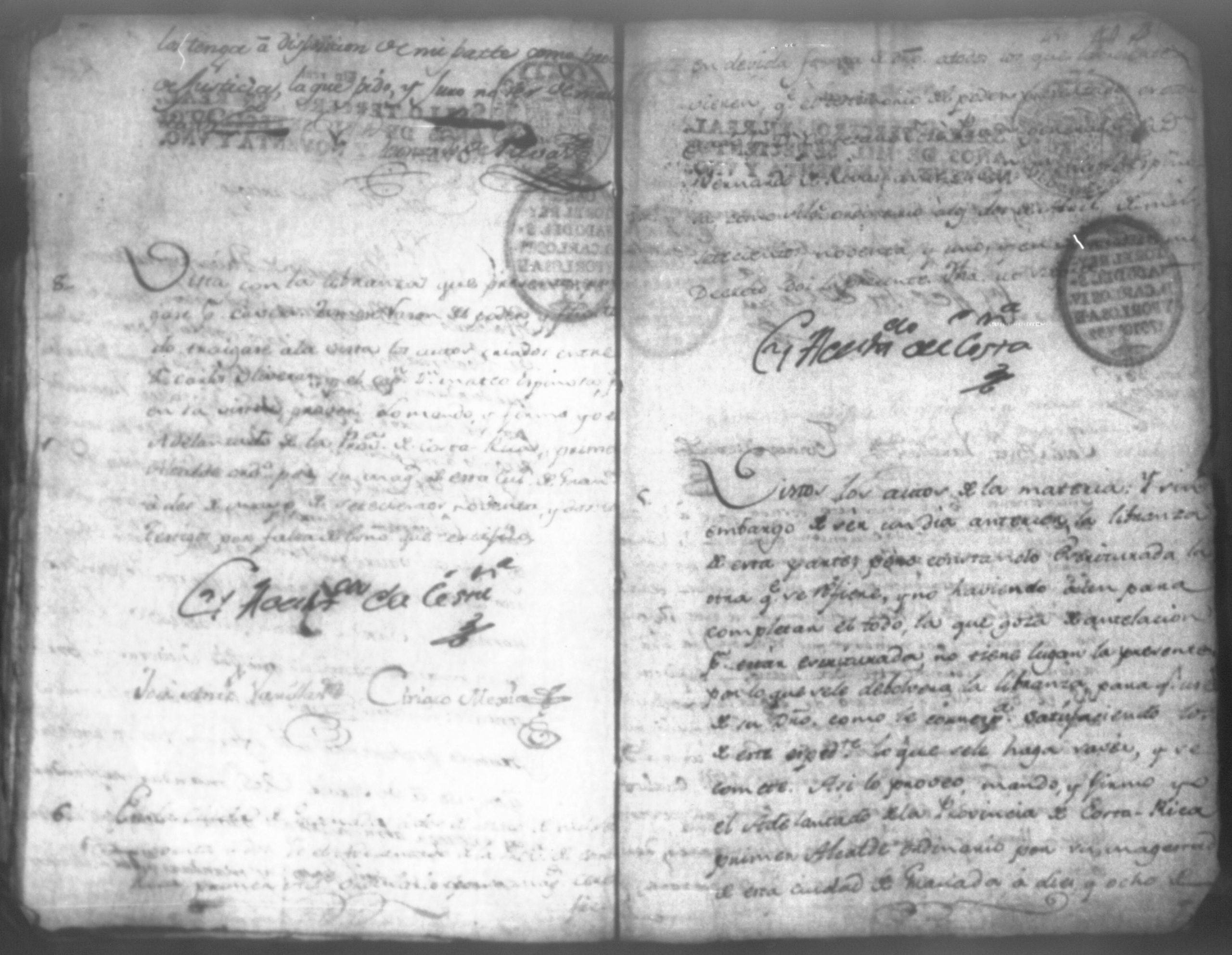 Temática: Audiencia León, 1792. De los Autos que sigue don Cayetano Pavón con don Carlos Oliveras sobre que se satisfaga con preferencia la libranza que obtuvo el primero de don Mateo Espinosa a la que este dio después a favor del segundo. Contiene: la instancia seguida en Costa Rica. "+ Señor Alcalde de primer voto. Don Carlos Olivares, vecino de esta Ciudad, en la mejor forma que haya lugar en derecho: ante Vuestro Señor parezco y digo: Que sin perjuicio del derecho que tengo contra el principal deudor, ó endosante Don Josef Arguello en la cantidad de mil novecientos y veinte pesos de que me tiene endorsada libranza de Pablo Romano, en este forma: mil y quatrocientos pesos para el primer plazo que fue en Agosto de noventa y uno; Y los quinientos y veinte para enero de noventa y dos: Y haviendosle presentado al Capital Don Matheo Espinosa que está por caveza, la aceptó y quedó a pagarla del liquido valor de la Hacienda expresada en dicha libranza [...] suplico á Vuestro Señor que por los terminos de la via executiva se sirva compeler a dicho Don Matheo a que cumpla su aceptacion que ofrecio, vajo de su firma [...]" (Extracto de los folios 11 y 11v.)