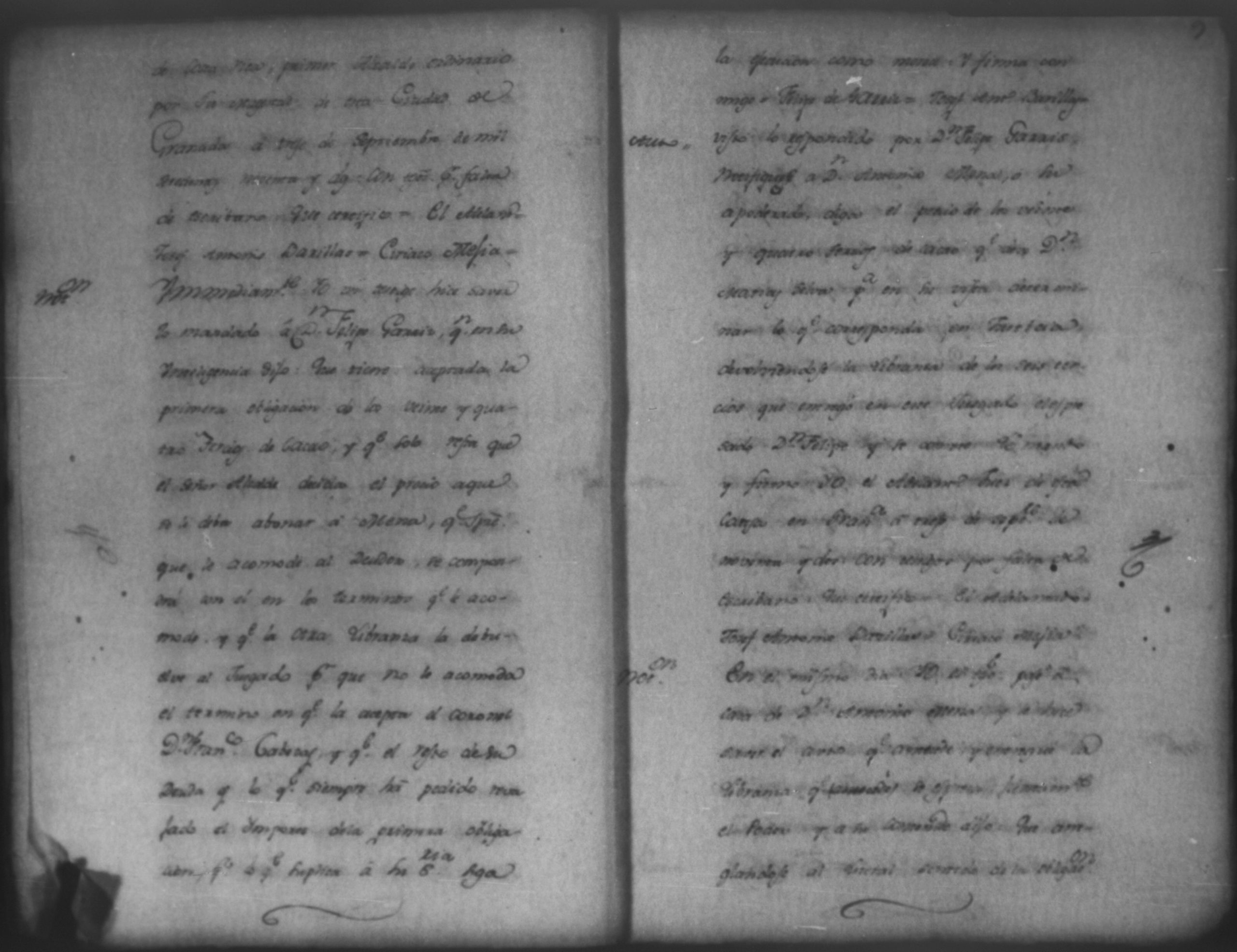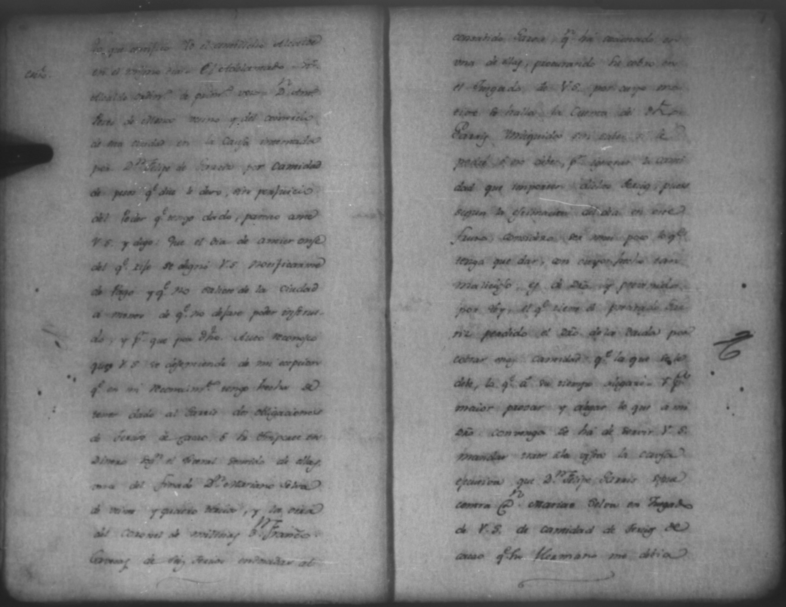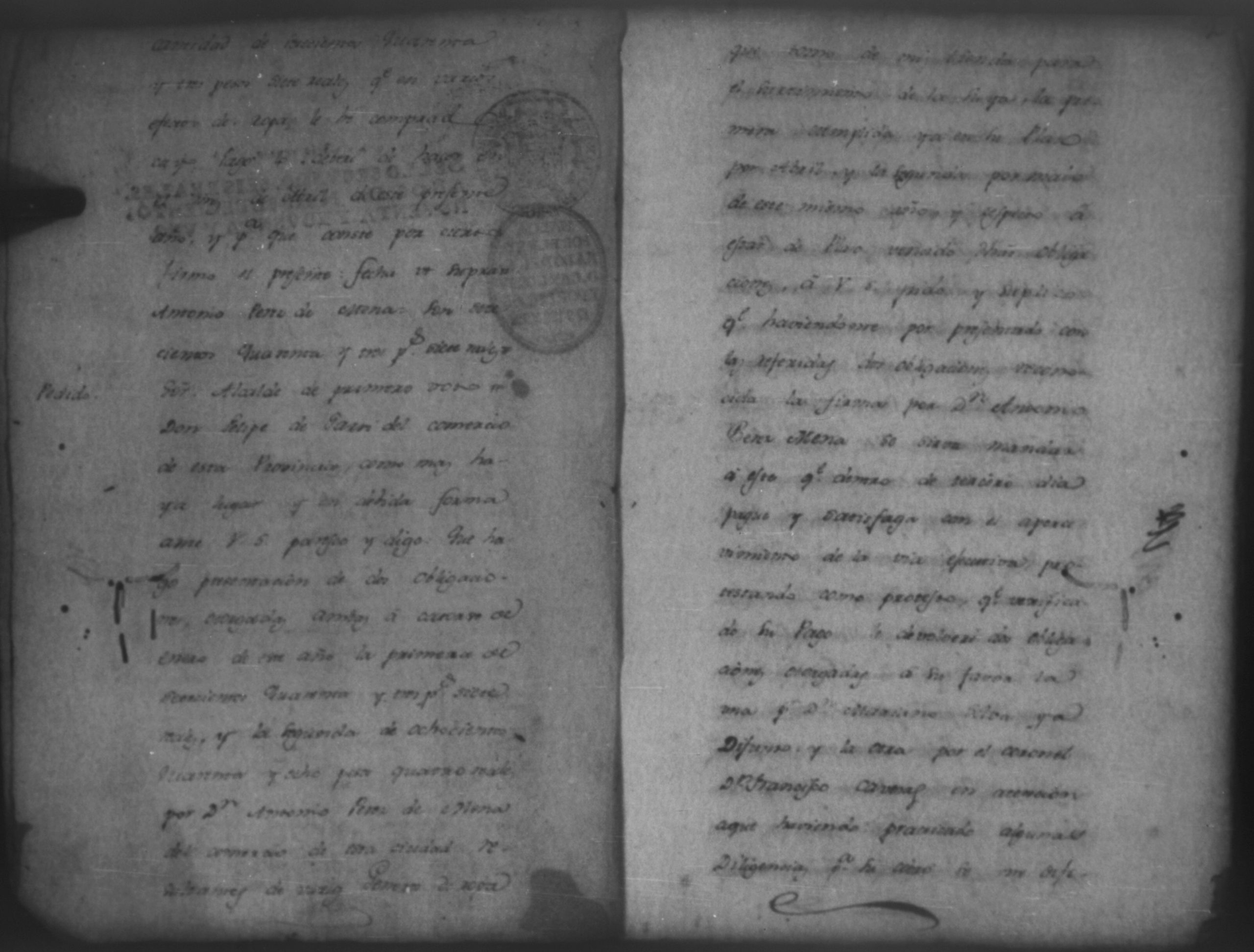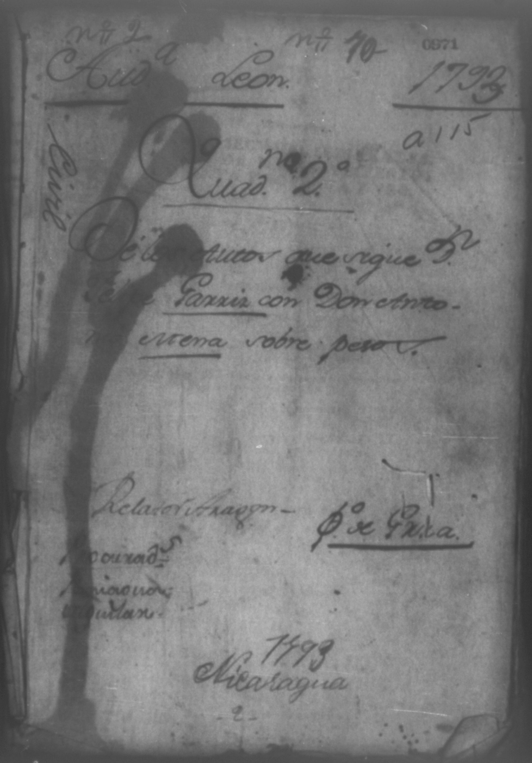 Temática: Audiencia León, 1793. Quaderno No. 2°. De los Autos que sigue don Felipe Garriz con don Antonio Mena, por cantidad de pesos. "[...] Pedido. Don Felipe de Garri del comercio de esta Provincia como mas haya lugar y en debida forma ante Vuestro Señor paresco y digo: Que hago presentacion de dos obligaciones otorgadas ambas á catorse de enero de esta año la primera de setecientos quarenta y tres pesos siete reales y la segunda de ochocientos quarenta y ochos pesos quatro reales por Don Antonio Perez Mena del comercio de esta ciudad... [por] Genero de ropa que tomó de mi tienda para el suministro de la suya, la primera cumplida ya en su plazo por Abril, y la segunda por maio de este mismo año y respecto á estas de Plazo vencido dichas obligaciones, á Vuestro Señor pido y suplico que haciendome por presentado con las referidas dos obligaciones reconocida la firma por Don Antonio Perez Mena se sirva mandar á este que dentro de tercero dia pague y satisfaga con el apercivimiento de la via efectiva, protestando como protesto [...]". (Extracto de los folios 1v. y 2)