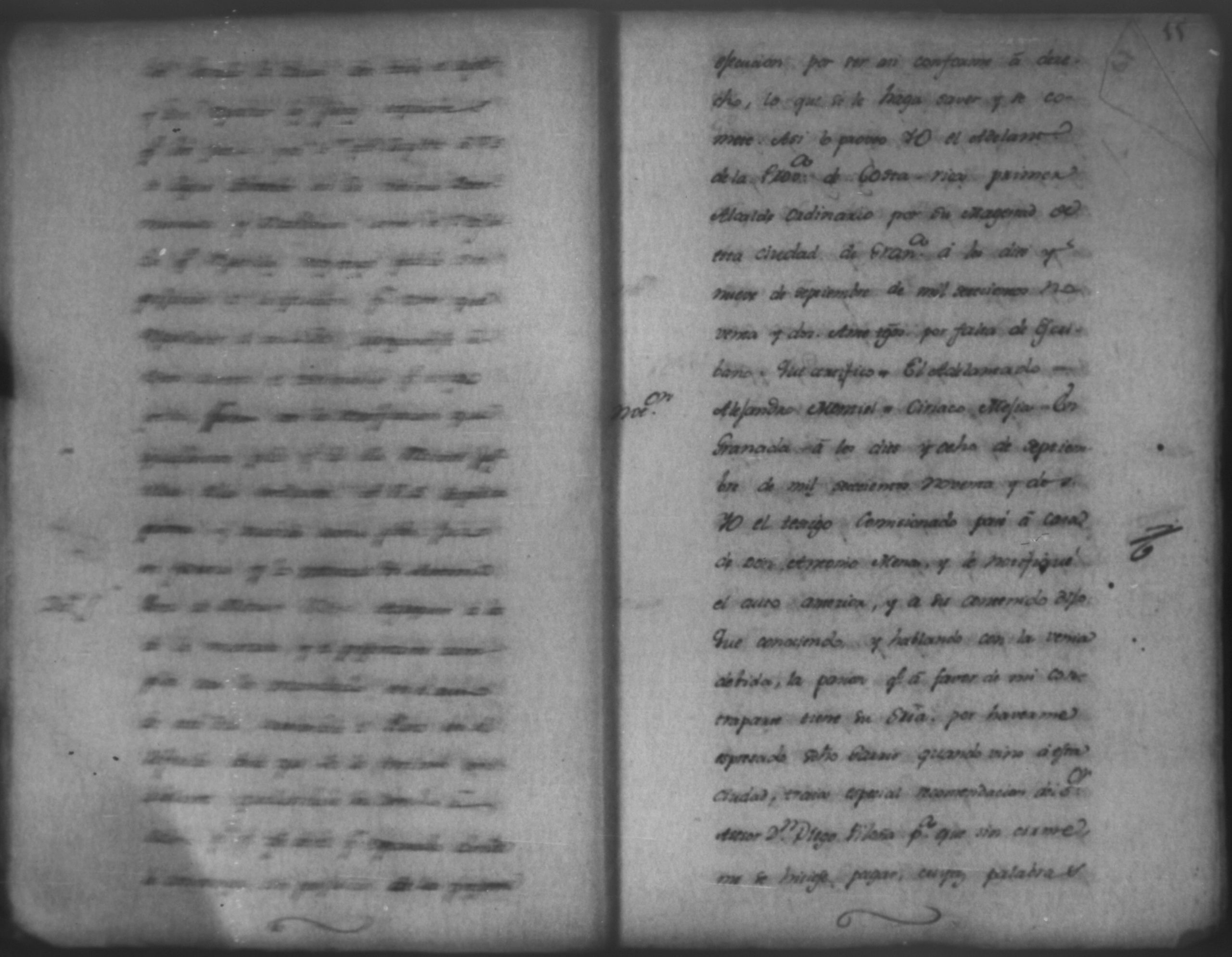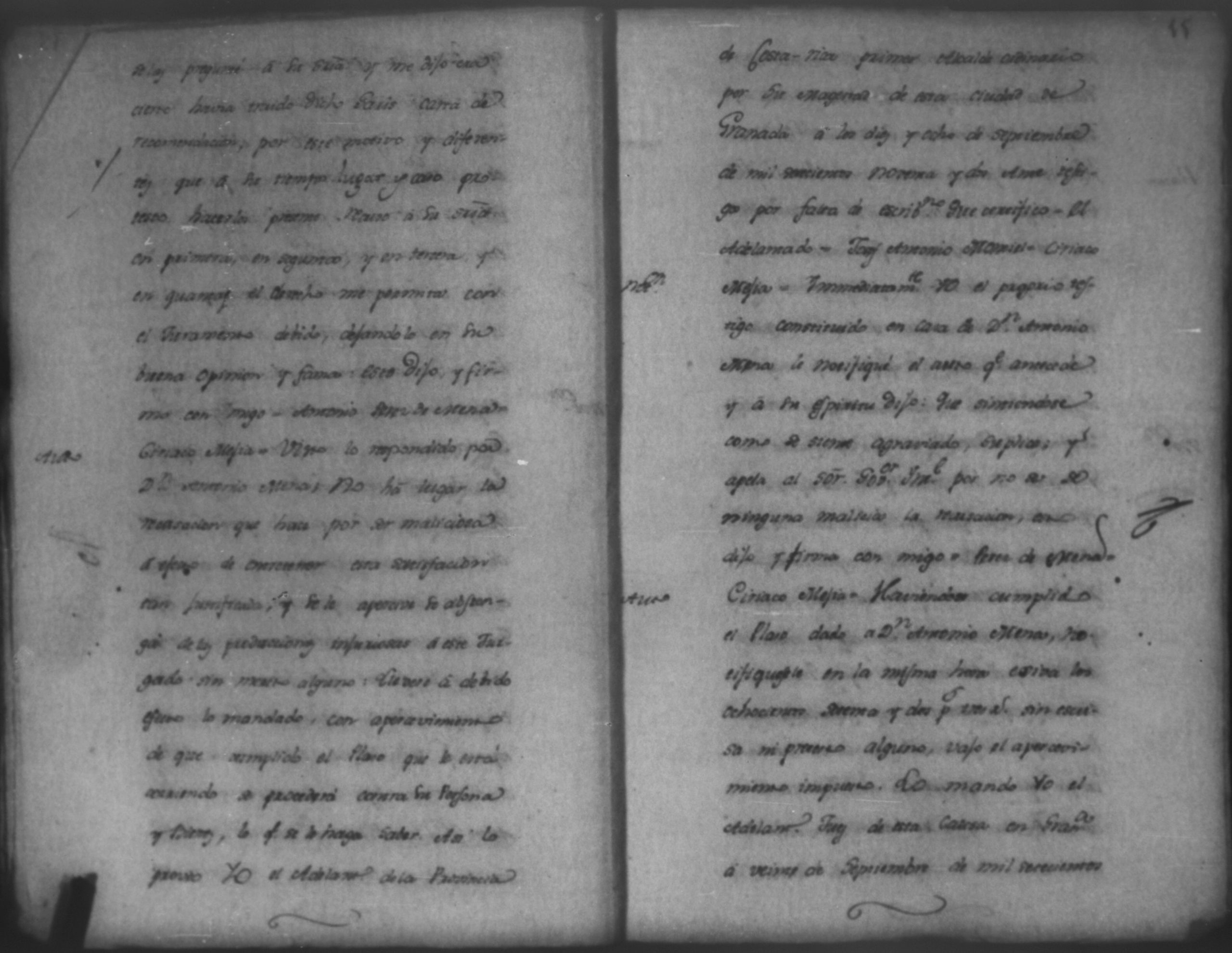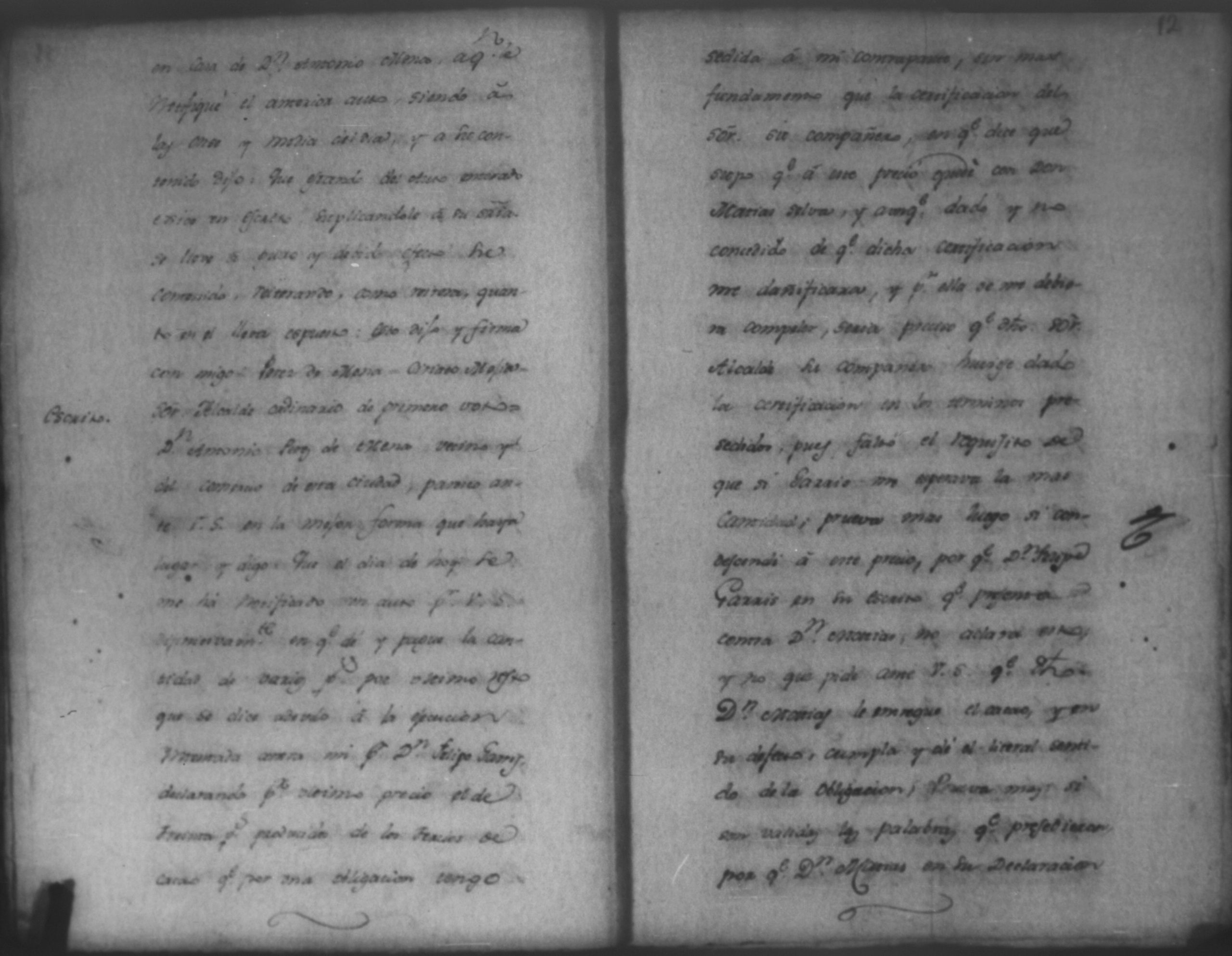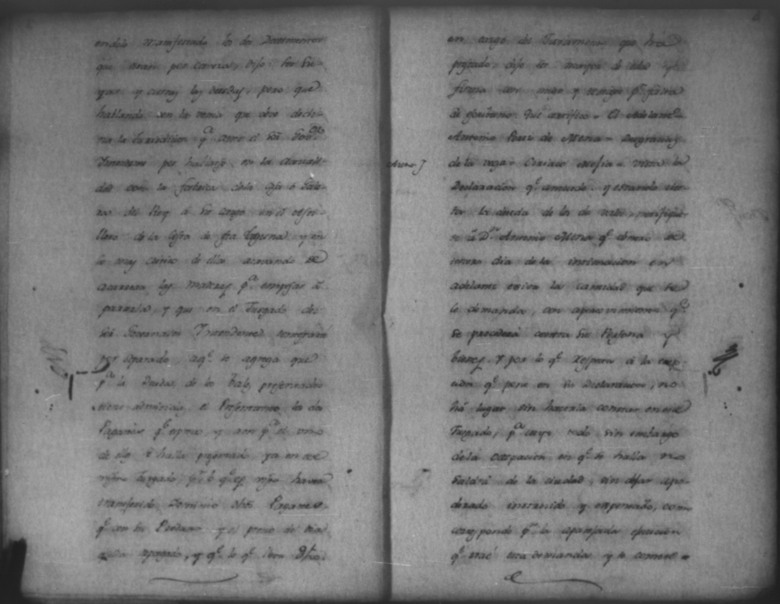 Temática: Audiencia León, 1793. Quaderno No. 2°. De los Autos que sigue don Felipe Garriz con don Antonio Mena, por cantidad de pesos. "[...] Pedido. Don Felipe de Garri del comercio de esta Provincia como mas haya lugar y en debida forma ante Vuestro Señor paresco y digo: Que hago presentacion de dos obligaciones otorgadas ambas á catorse de enero de esta año la primera de setecientos quarenta y tres pesos siete reales y la segunda de ochocientos quarenta y ochos pesos quatro reales por Don Antonio Perez Mena del comercio de esta ciudad... [por] Genero de ropa que tomó de mi tienda para el suministro de la suya, la primera cumplida ya en su plazo por Abril, y la segunda por maio de este mismo año y respecto á estas de Plazo vencido dichas obligaciones, á Vuestro Señor pido y suplico que haciendome por presentado con las referidas dos obligaciones reconocida la firma por Don Antonio Perez Mena se sirva mandar á este que dentro de tercero dia pague y satisfaga con el apercivimiento de la via efectiva, protestando como protesto [...]". (Extracto de los folios 1v. y 2)