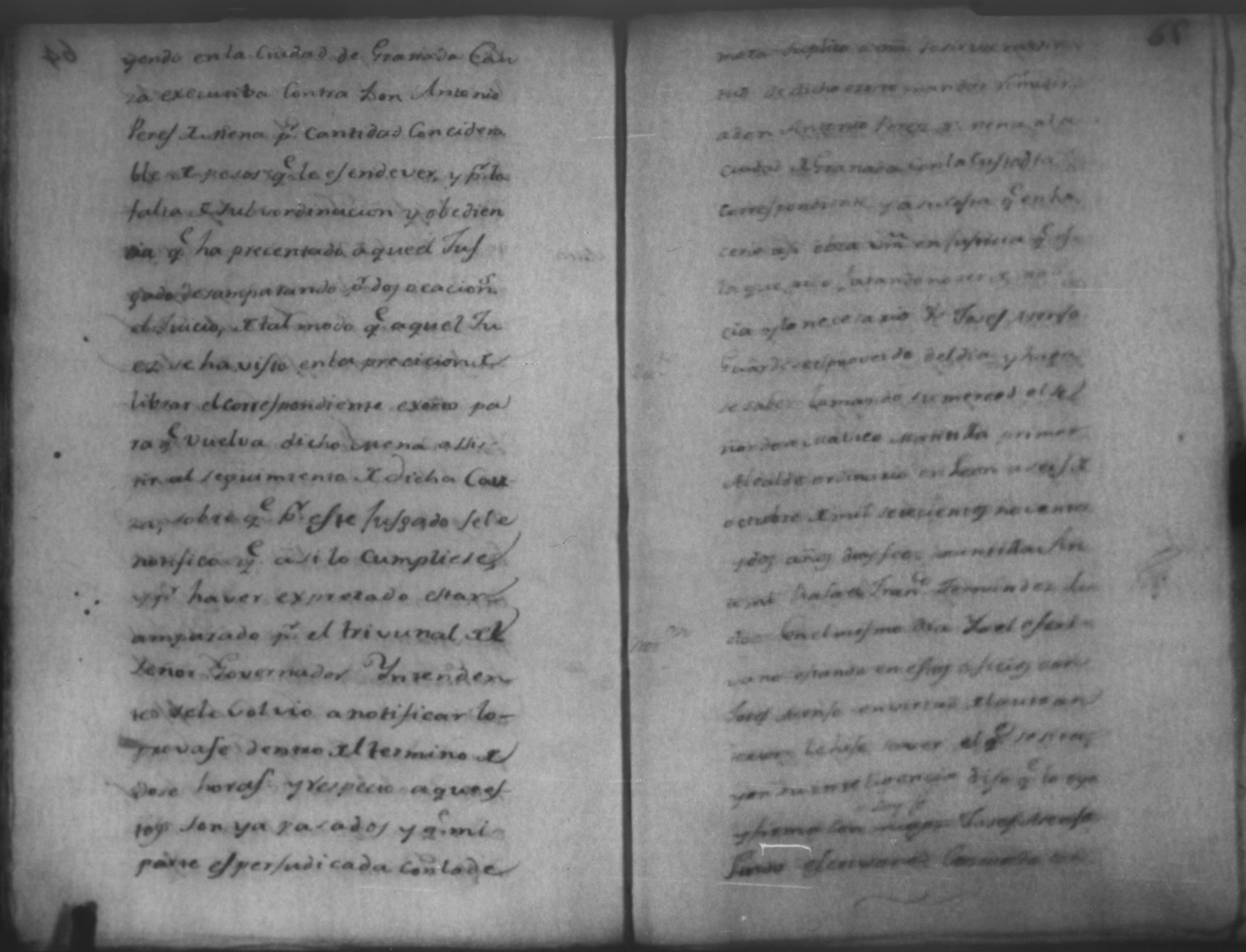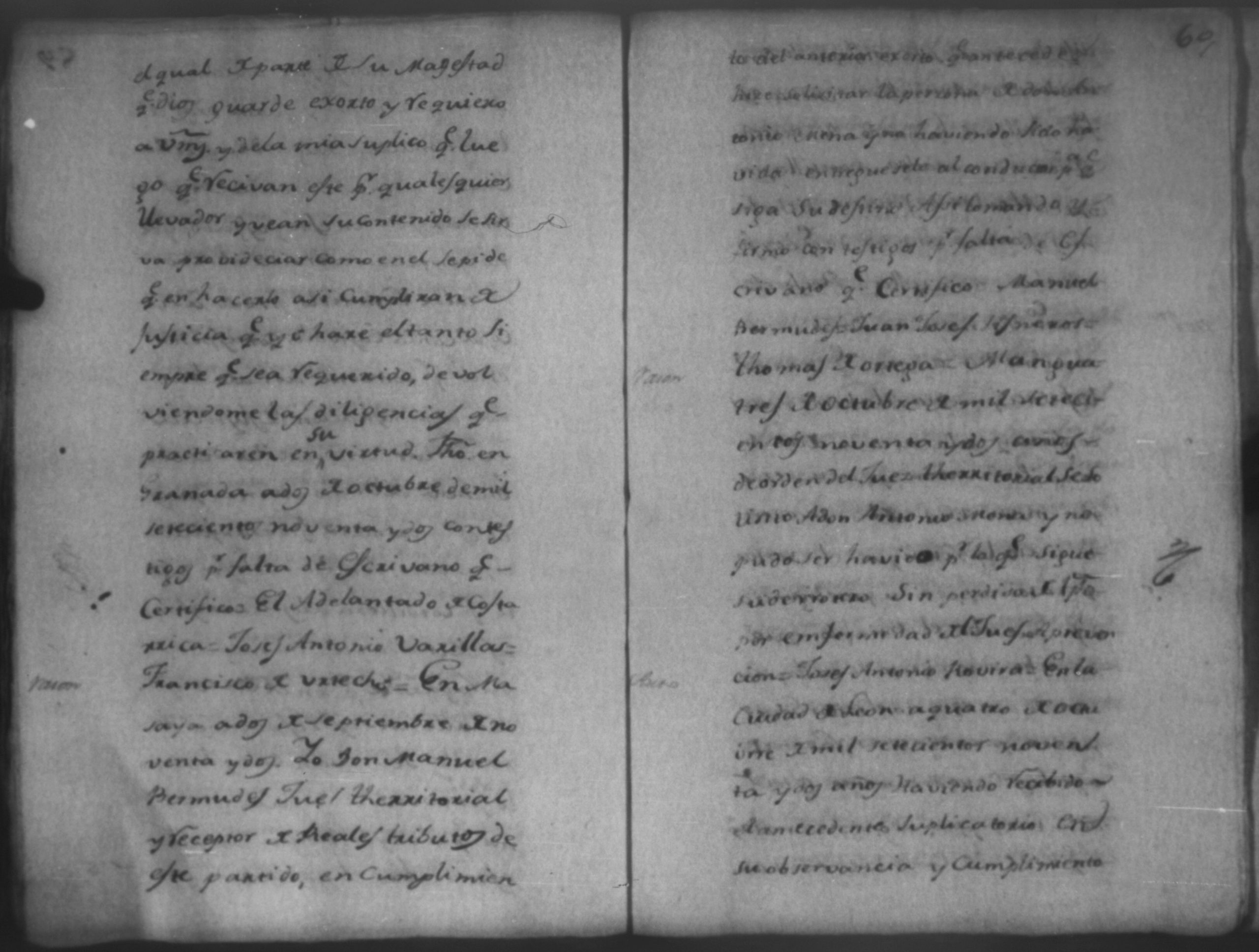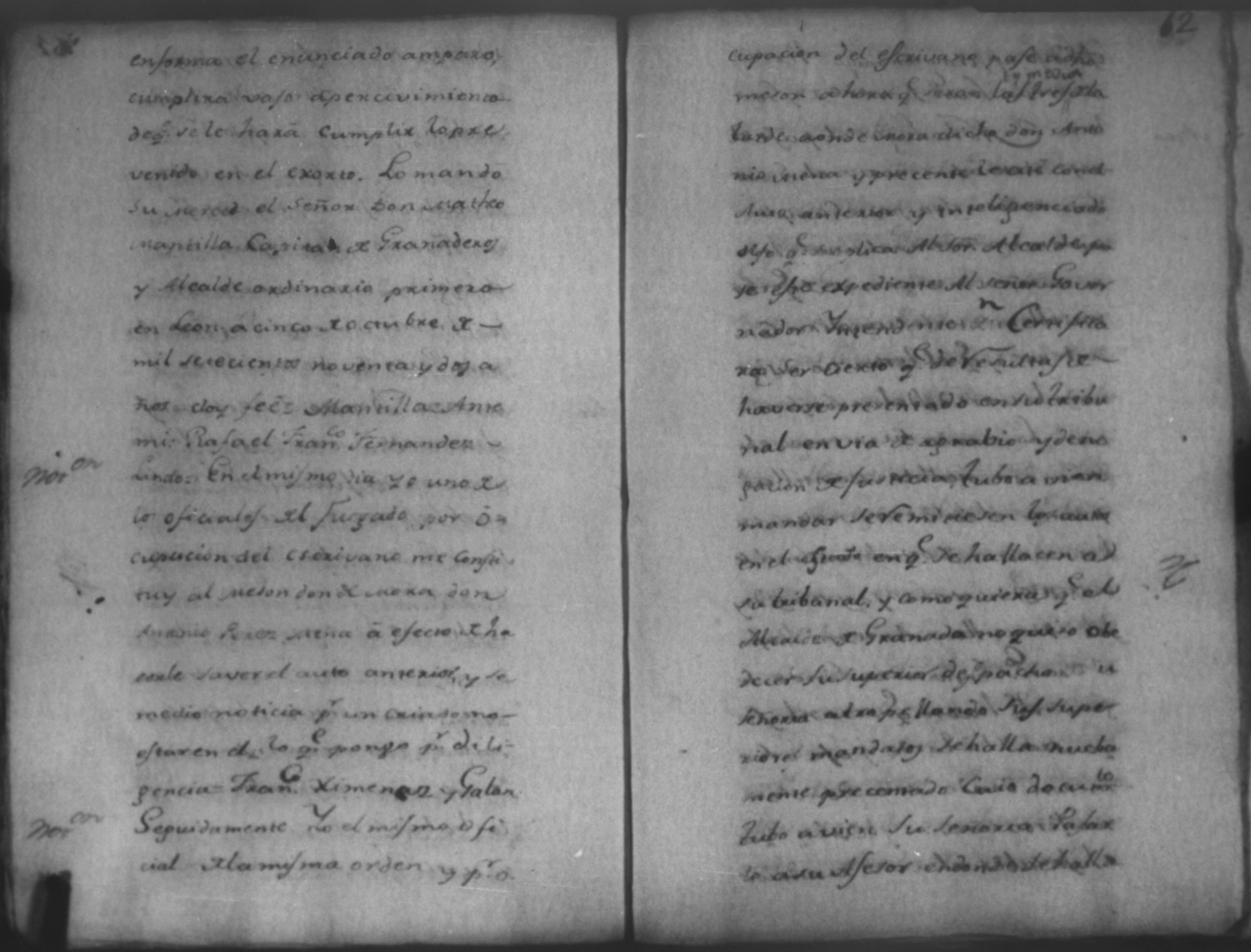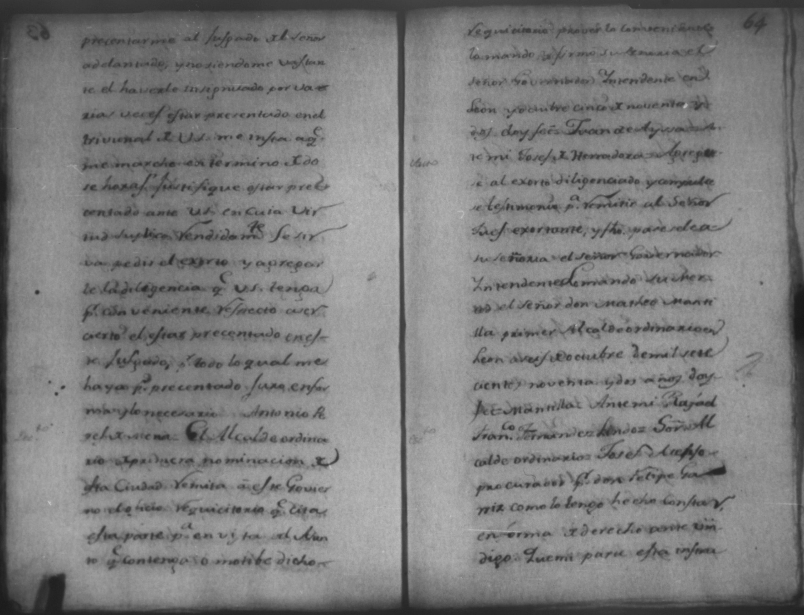 Temática: Audiencia León, 1793. Quaderno No. 2°. De los Autos que sigue don Felipe Garriz con don Antonio Mena, por cantidad de pesos. "[...] Pedido. Don Felipe de Garri del comercio de esta Provincia como mas haya lugar y en debida forma ante Vuestro Señor paresco y digo: Que hago presentacion de dos obligaciones otorgadas ambas á catorse de enero de esta año la primera de setecientos quarenta y tres pesos siete reales y la segunda de ochocientos quarenta y ochos pesos quatro reales por Don Antonio Perez Mena del comercio de esta ciudad... [por] Genero de ropa que tomó de mi tienda para el suministro de la suya, la primera cumplida ya en su plazo por Abril, y la segunda por maio de este mismo año y respecto á estas de Plazo vencido dichas obligaciones, á Vuestro Señor pido y suplico que haciendome por presentado con las referidas dos obligaciones reconocida la firma por Don Antonio Perez Mena se sirva mandar á este que dentro de tercero dia pague y satisfaga con el apercivimiento de la via efectiva, protestando como protesto [...]". (Extracto de los folios 1v. y 2)