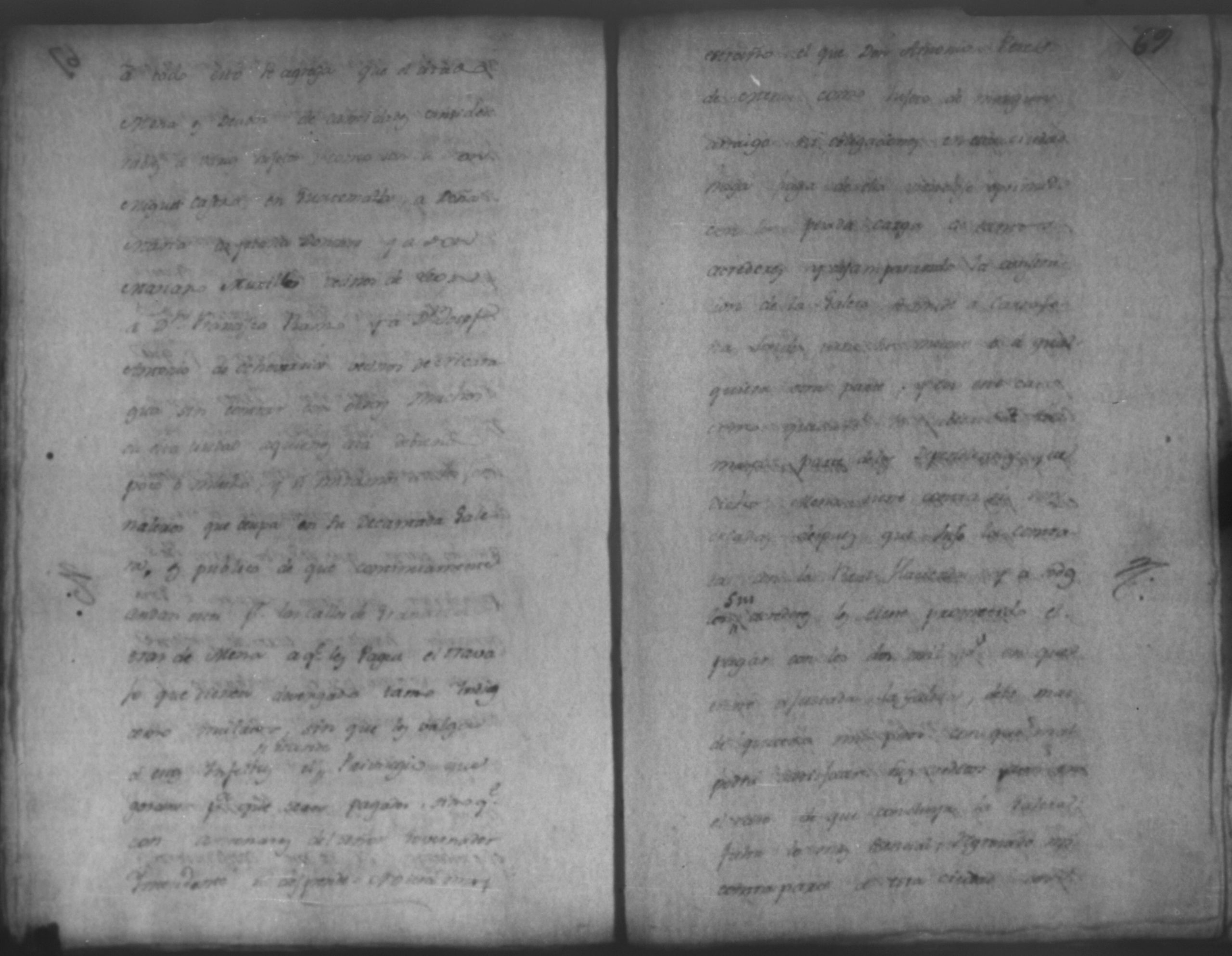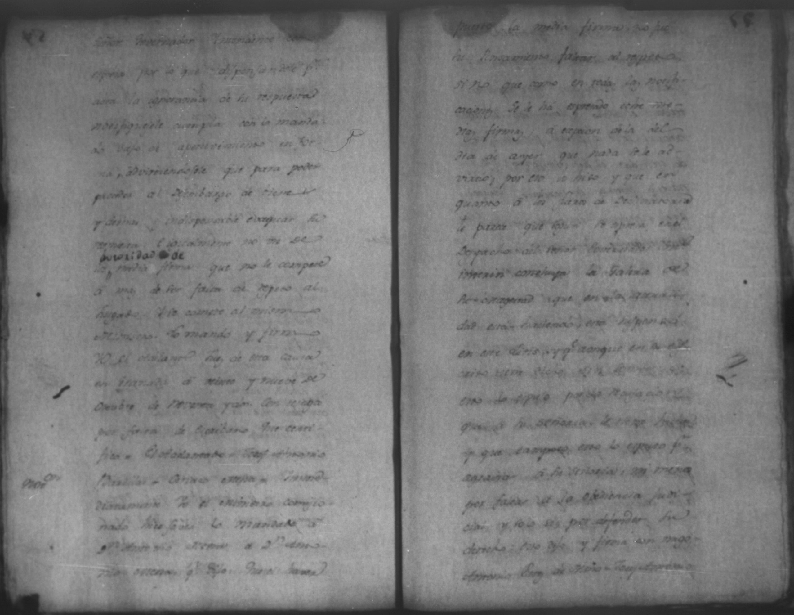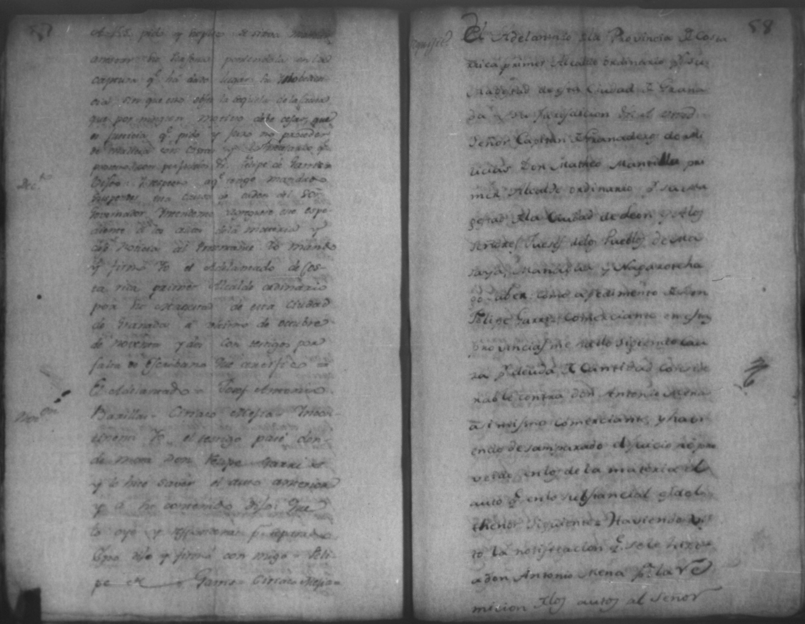 Temática: Audiencia León, 1793. Quaderno No. 2°. De los Autos que sigue don Felipe Garriz con don Antonio Mena, por cantidad de pesos. "[...] Pedido. Don Felipe de Garri del comercio de esta Provincia como mas haya lugar y en debida forma ante Vuestro Señor paresco y digo: Que hago presentacion de dos obligaciones otorgadas ambas á catorse de enero de esta año la primera de setecientos quarenta y tres pesos siete reales y la segunda de ochocientos quarenta y ochos pesos quatro reales por Don Antonio Perez Mena del comercio de esta ciudad... [por] Genero de ropa que tomó de mi tienda para el suministro de la suya, la primera cumplida ya en su plazo por Abril, y la segunda por maio de este mismo año y respecto á estas de Plazo vencido dichas obligaciones, á Vuestro Señor pido y suplico que haciendome por presentado con las referidas dos obligaciones reconocida la firma por Don Antonio Perez Mena se sirva mandar á este que dentro de tercero dia pague y satisfaga con el apercivimiento de la via efectiva, protestando como protesto [...]". (Extracto de los folios 1v. y 2)