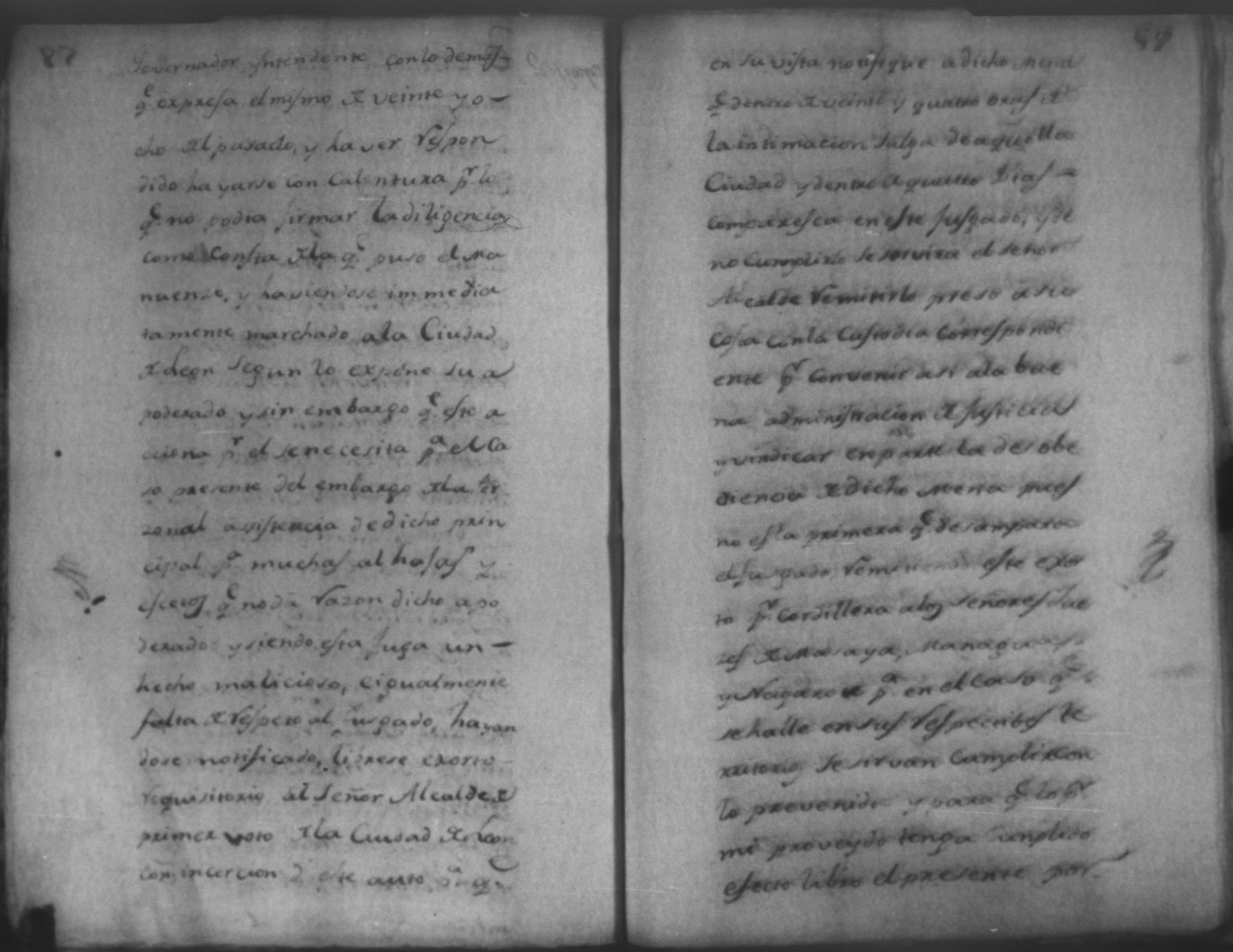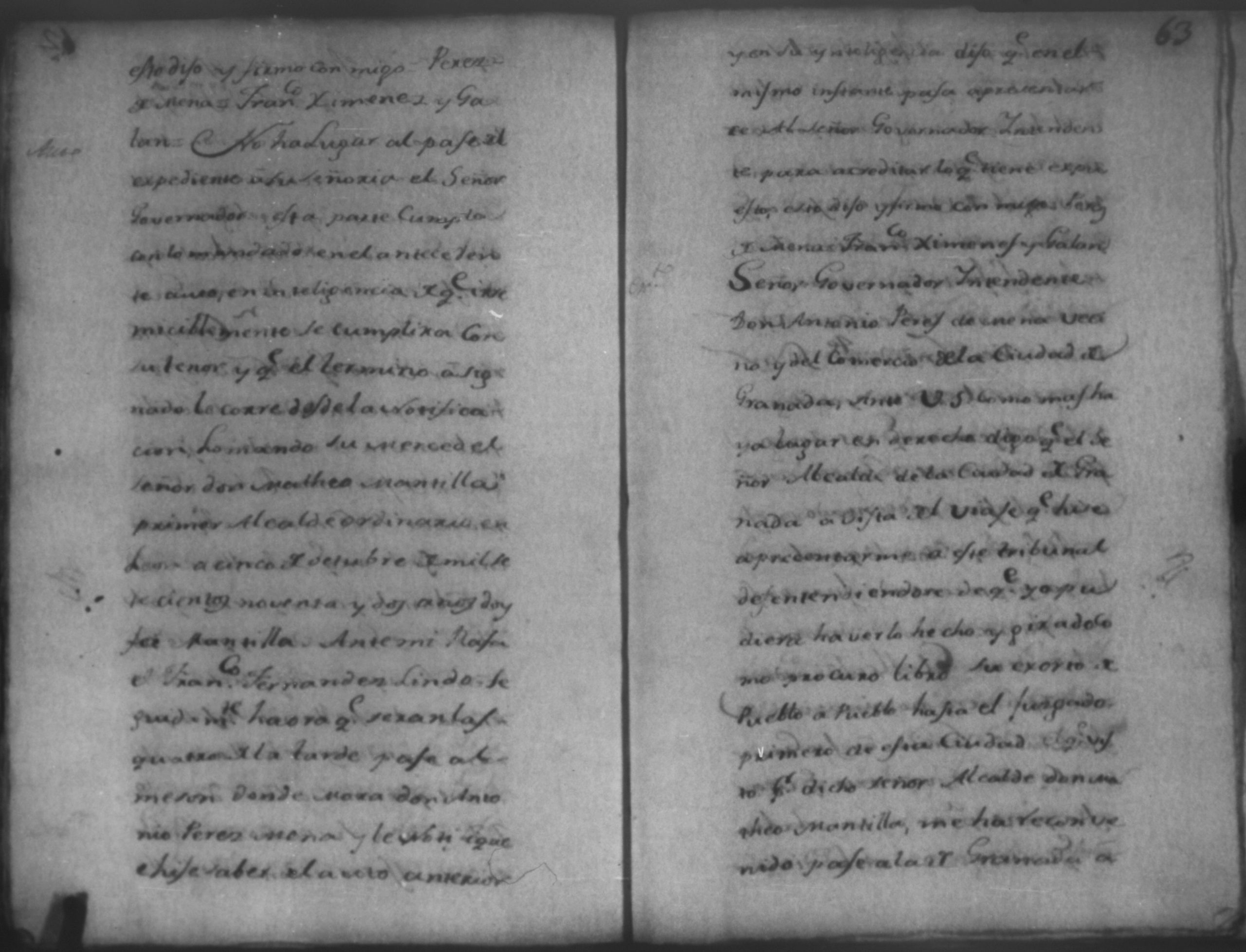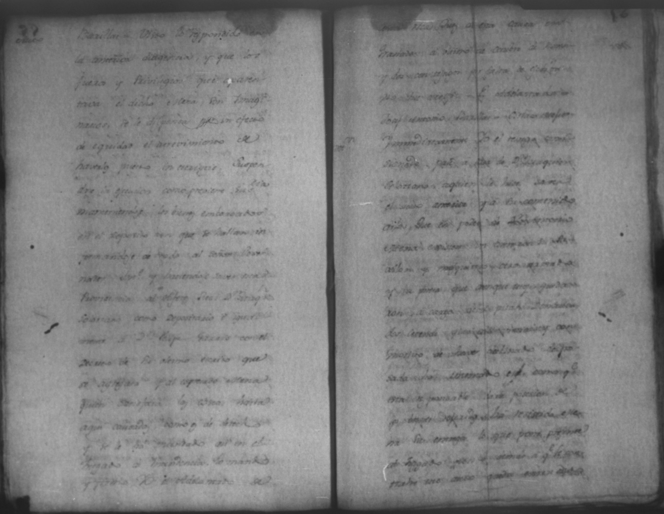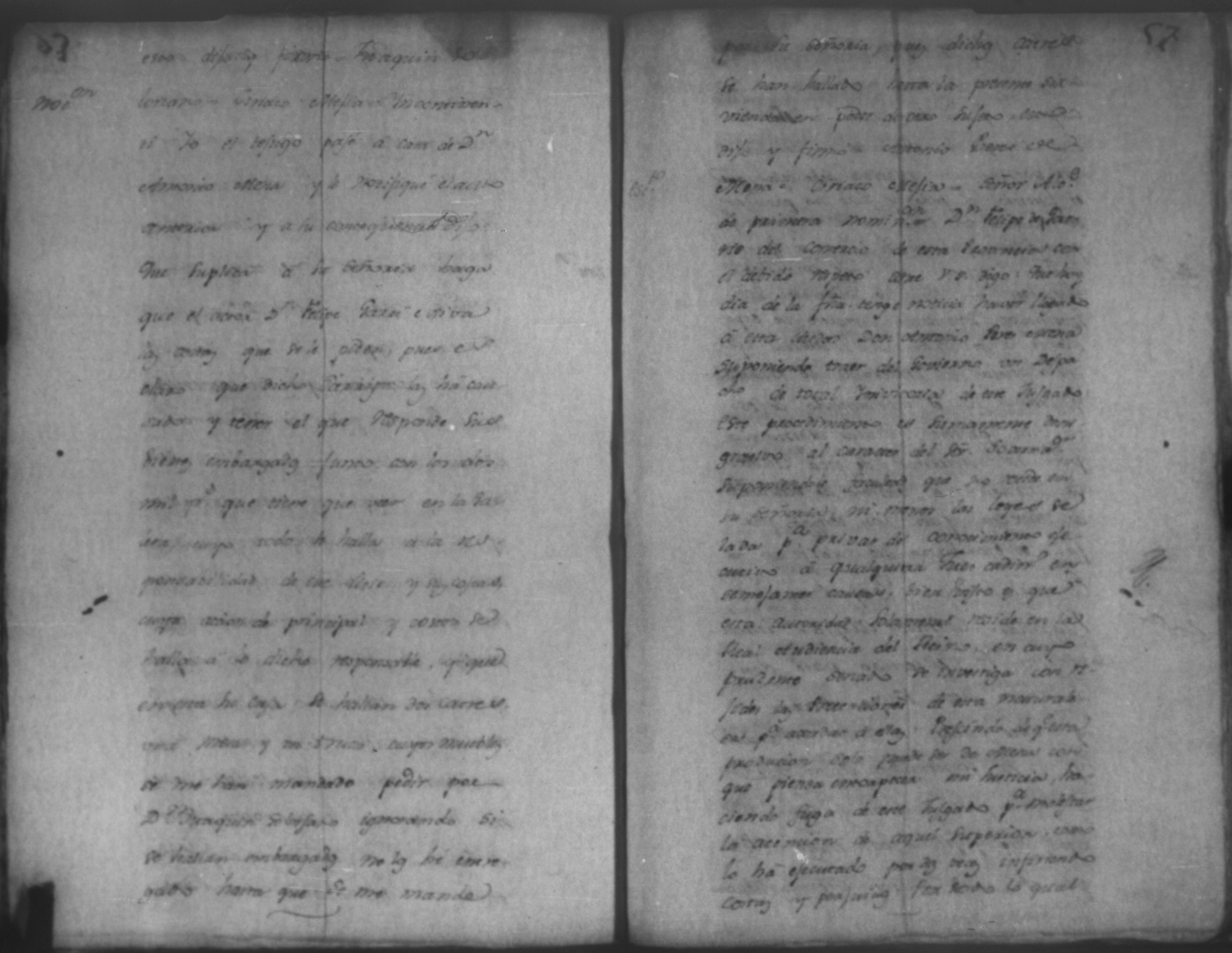 Temática: Audiencia León, 1793. Quaderno No. 2°. De los Autos que sigue don Felipe Garriz con don Antonio Mena, por cantidad de pesos. "[...] Pedido. Don Felipe de Garri del comercio de esta Provincia como mas haya lugar y en debida forma ante Vuestro Señor paresco y digo: Que hago presentacion de dos obligaciones otorgadas ambas á catorse de enero de esta año la primera de setecientos quarenta y tres pesos siete reales y la segunda de ochocientos quarenta y ochos pesos quatro reales por Don Antonio Perez Mena del comercio de esta ciudad... [por] Genero de ropa que tomó de mi tienda para el suministro de la suya, la primera cumplida ya en su plazo por Abril, y la segunda por maio de este mismo año y respecto á estas de Plazo vencido dichas obligaciones, á Vuestro Señor pido y suplico que haciendome por presentado con las referidas dos obligaciones reconocida la firma por Don Antonio Perez Mena se sirva mandar á este que dentro de tercero dia pague y satisfaga con el apercivimiento de la via efectiva, protestando como protesto [...]". (Extracto de los folios 1v. y 2)