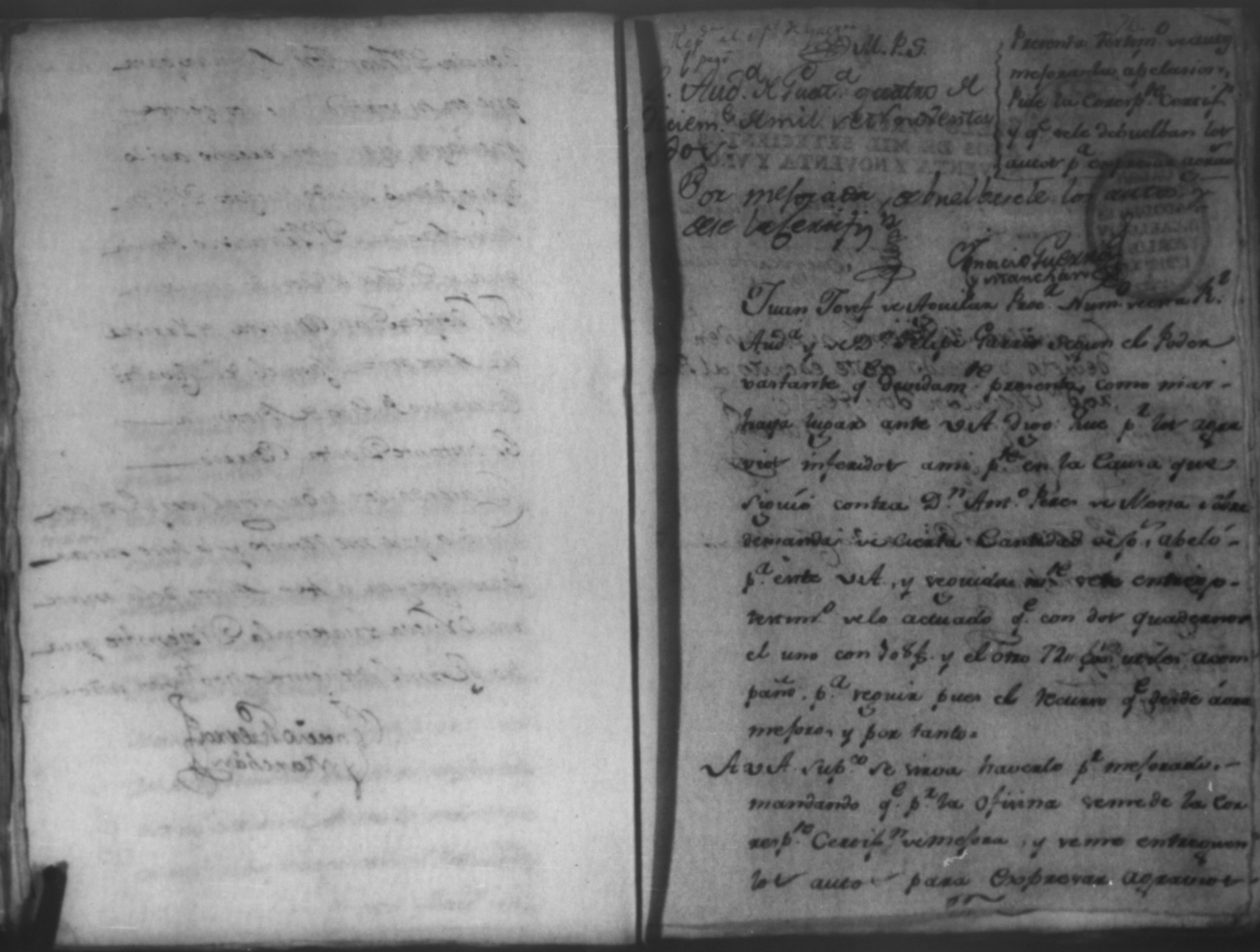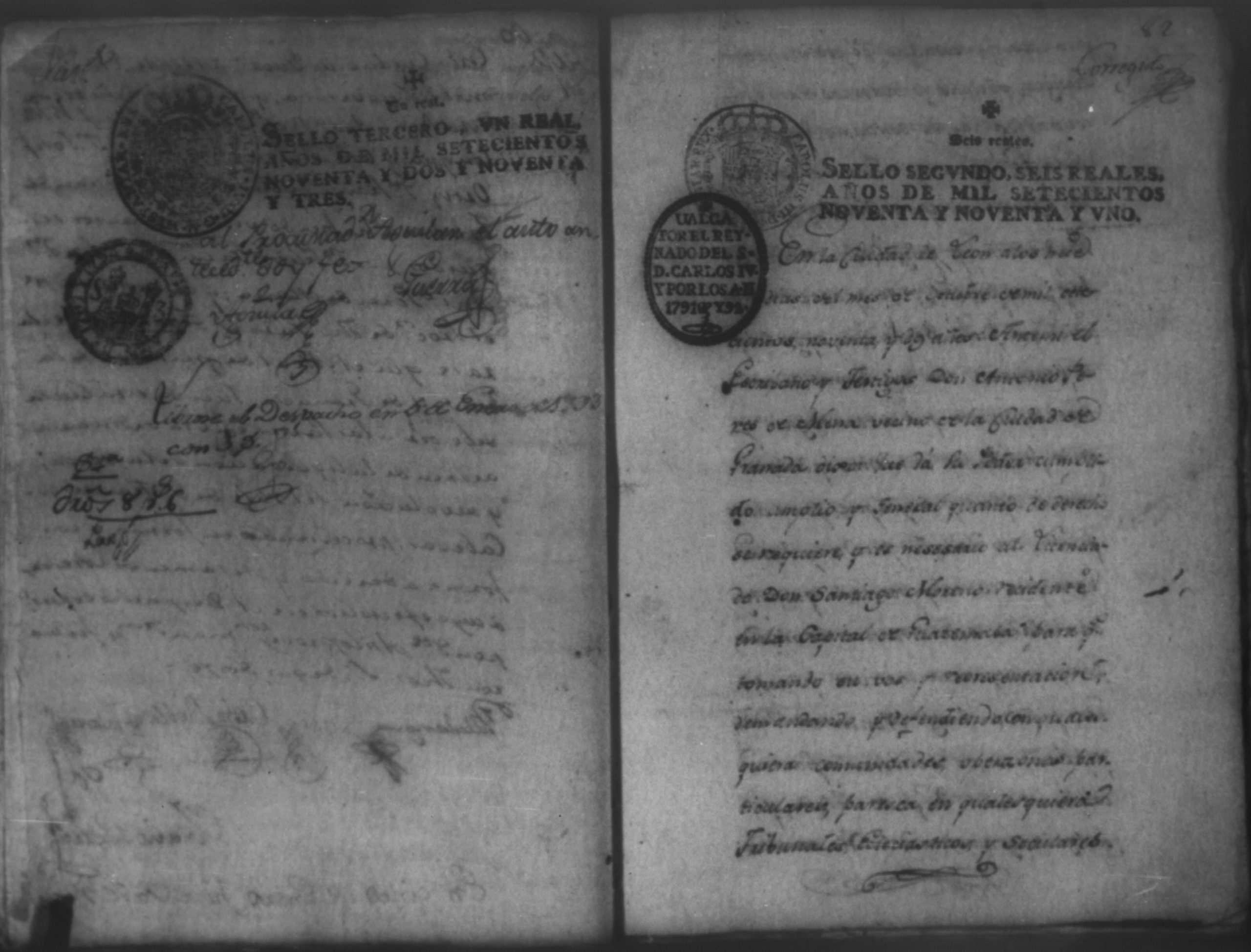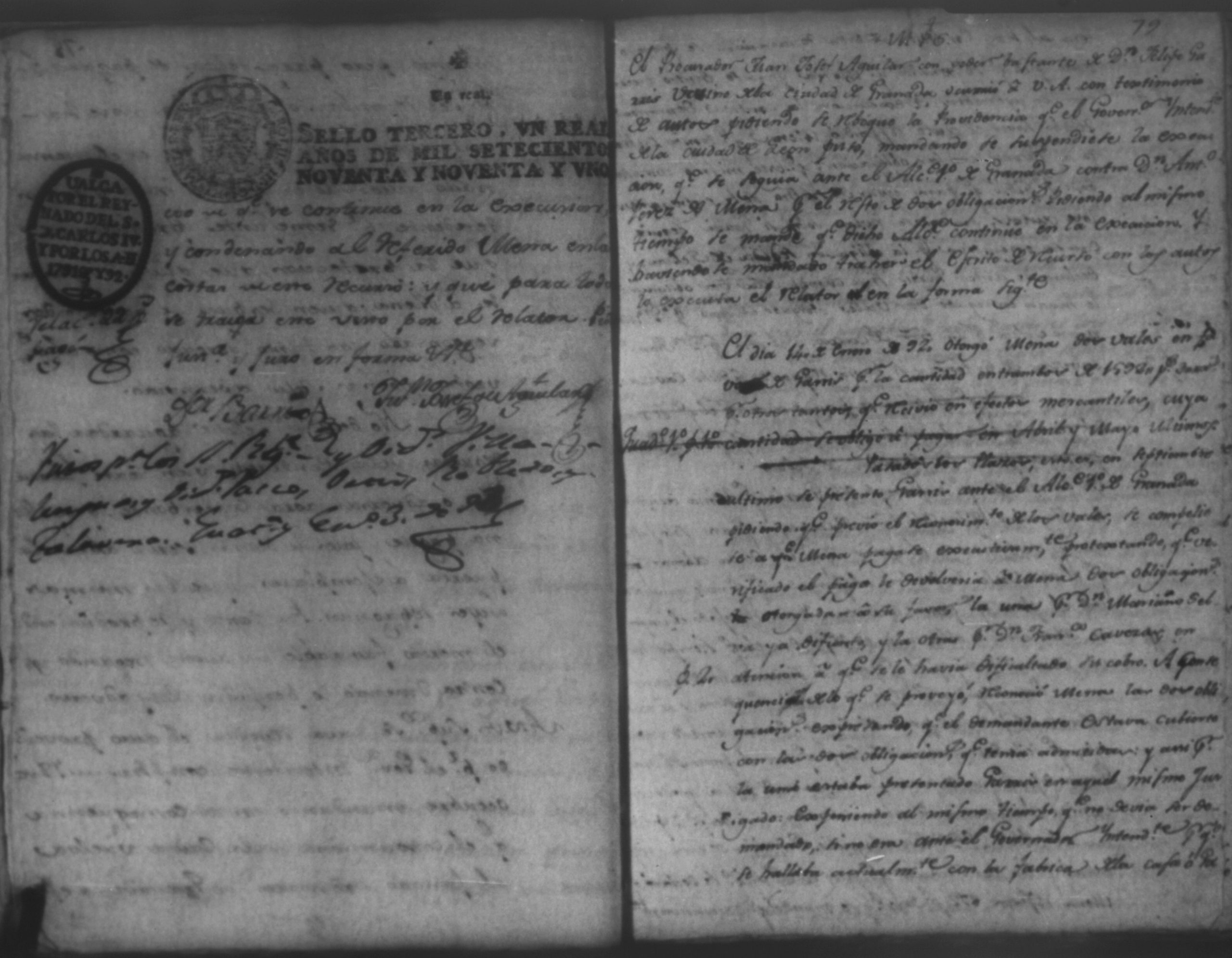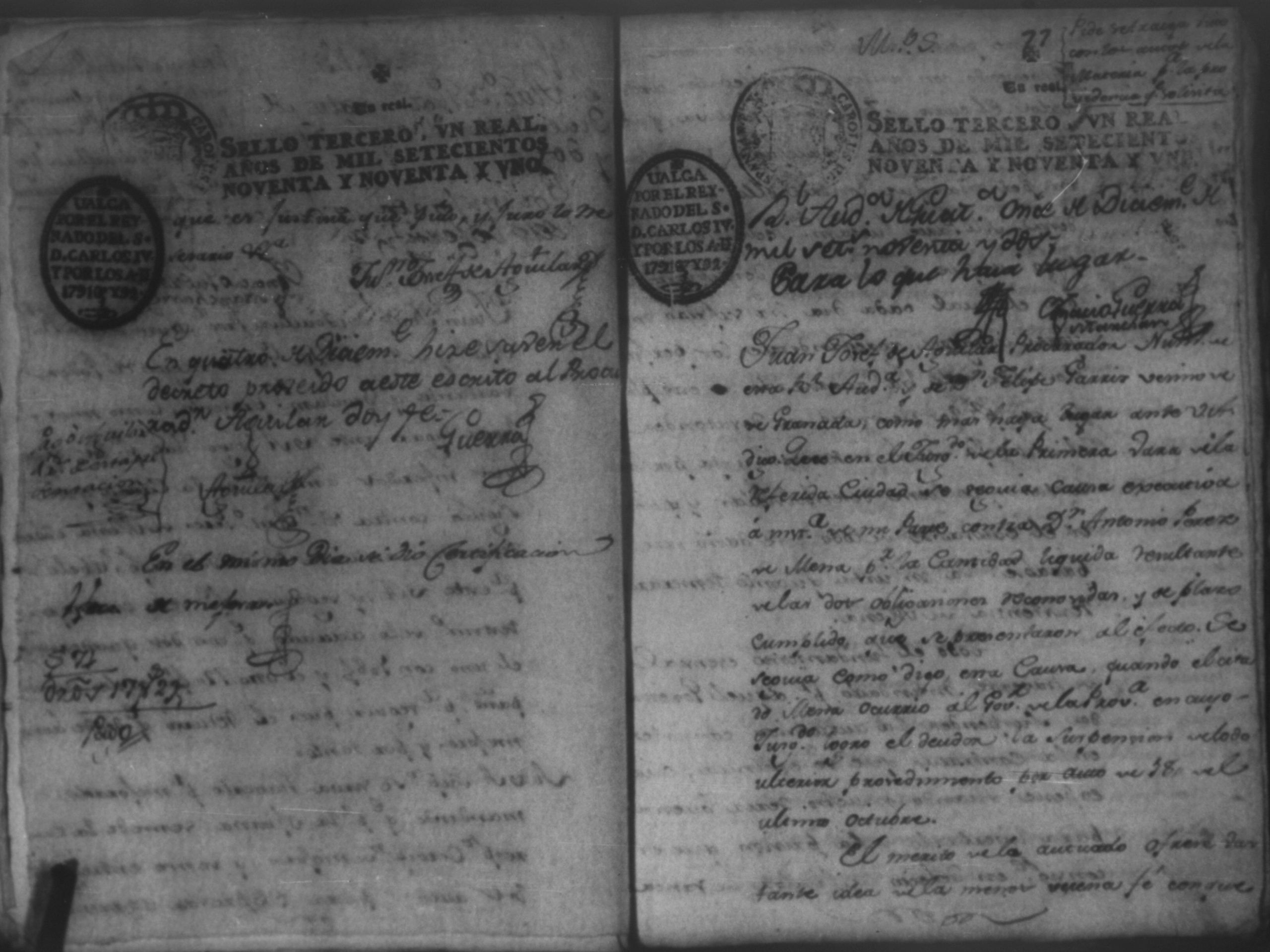 Temática: Audiencia León, 1793. Quaderno No. 2°. De los Autos que sigue don Felipe Garriz con don Antonio Mena, por cantidad de pesos. "[...] Pedido. Don Felipe de Garri del comercio de esta Provincia como mas haya lugar y en debida forma ante Vuestro Señor paresco y digo: Que hago presentacion de dos obligaciones otorgadas ambas á catorse de enero de esta año la primera de setecientos quarenta y tres pesos siete reales y la segunda de ochocientos quarenta y ochos pesos quatro reales por Don Antonio Perez Mena del comercio de esta ciudad... [por] Genero de ropa que tomó de mi tienda para el suministro de la suya, la primera cumplida ya en su plazo por Abril, y la segunda por maio de este mismo año y respecto á estas de Plazo vencido dichas obligaciones, á Vuestro Señor pido y suplico que haciendome por presentado con las referidas dos obligaciones reconocida la firma por Don Antonio Perez Mena se sirva mandar á este que dentro de tercero dia pague y satisfaga con el apercivimiento de la via efectiva, protestando como protesto [...]". (Extracto de los folios 1v. y 2)