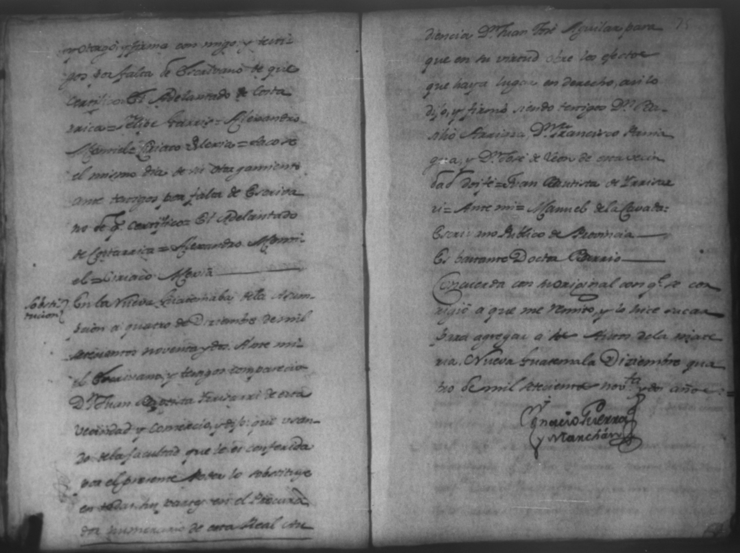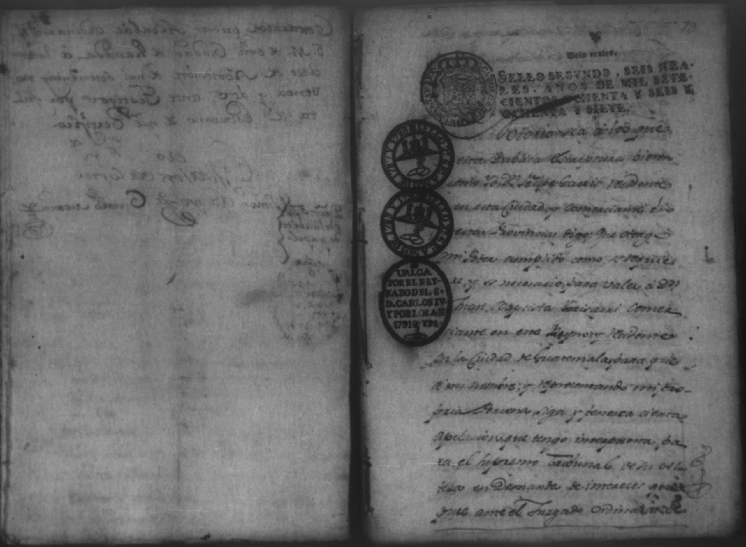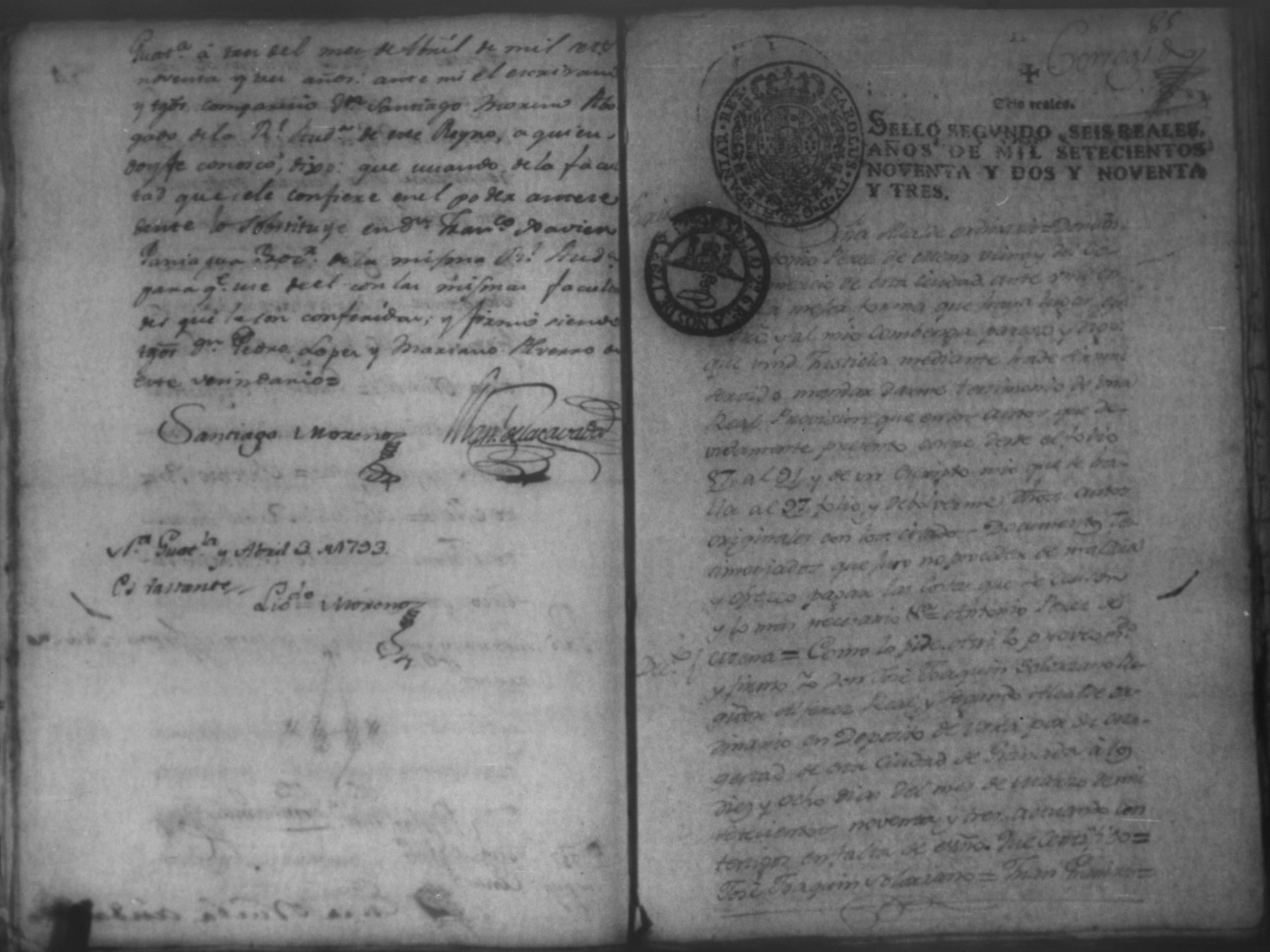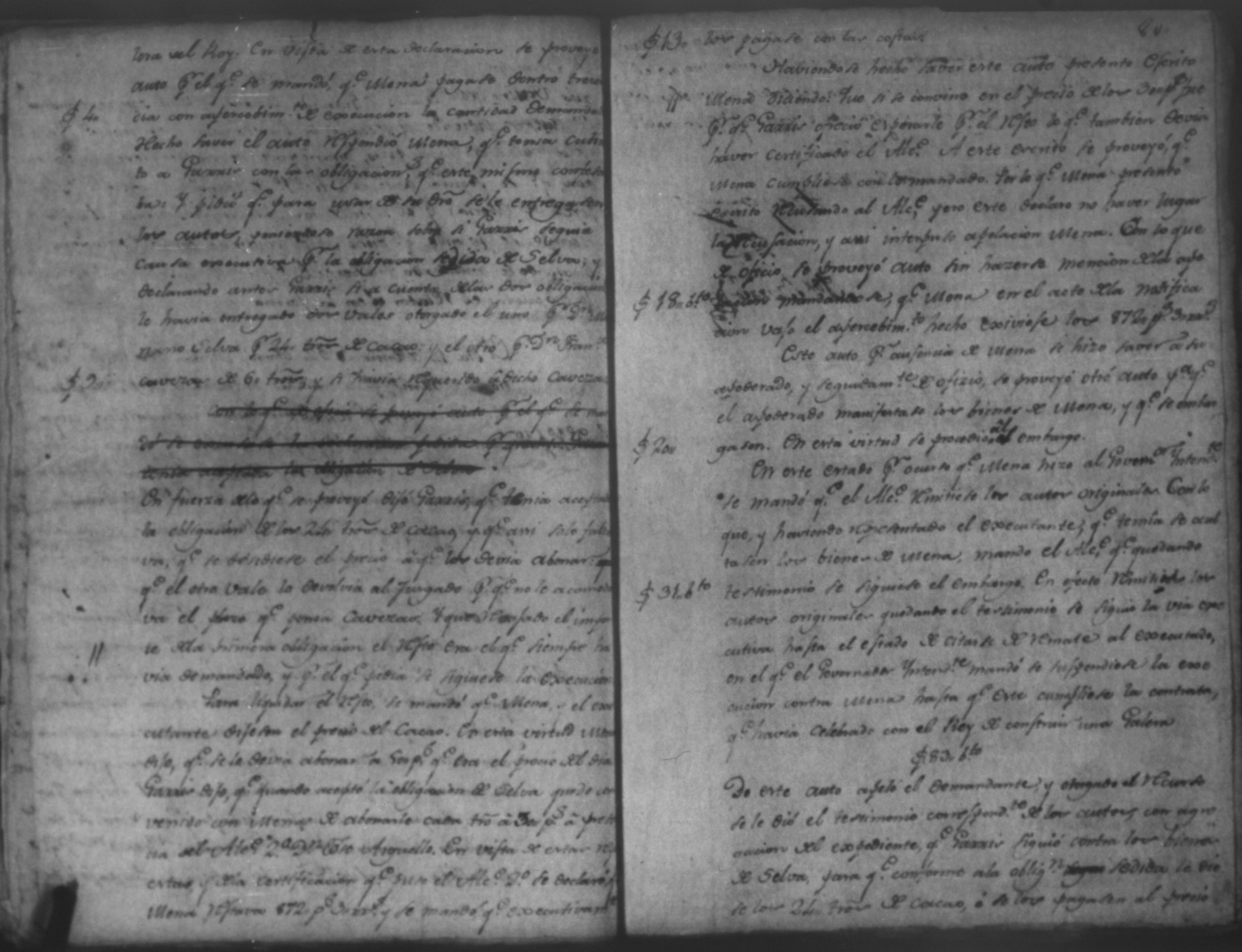 Temática: Audiencia León, 1793. Quaderno No. 2°. De los Autos que sigue don Felipe Garriz con don Antonio Mena, por cantidad de pesos. "[...] Pedido. Don Felipe de Garri del comercio de esta Provincia como mas haya lugar y en debida forma ante Vuestro Señor paresco y digo: Que hago presentacion de dos obligaciones otorgadas ambas á catorse de enero de esta año la primera de setecientos quarenta y tres pesos siete reales y la segunda de ochocientos quarenta y ochos pesos quatro reales por Don Antonio Perez Mena del comercio de esta ciudad... [por] Genero de ropa que tomó de mi tienda para el suministro de la suya, la primera cumplida ya en su plazo por Abril, y la segunda por maio de este mismo año y respecto á estas de Plazo vencido dichas obligaciones, á Vuestro Señor pido y suplico que haciendome por presentado con las referidas dos obligaciones reconocida la firma por Don Antonio Perez Mena se sirva mandar á este que dentro de tercero dia pague y satisfaga con el apercivimiento de la via efectiva, protestando como protesto [...]". (Extracto de los folios 1v. y 2)