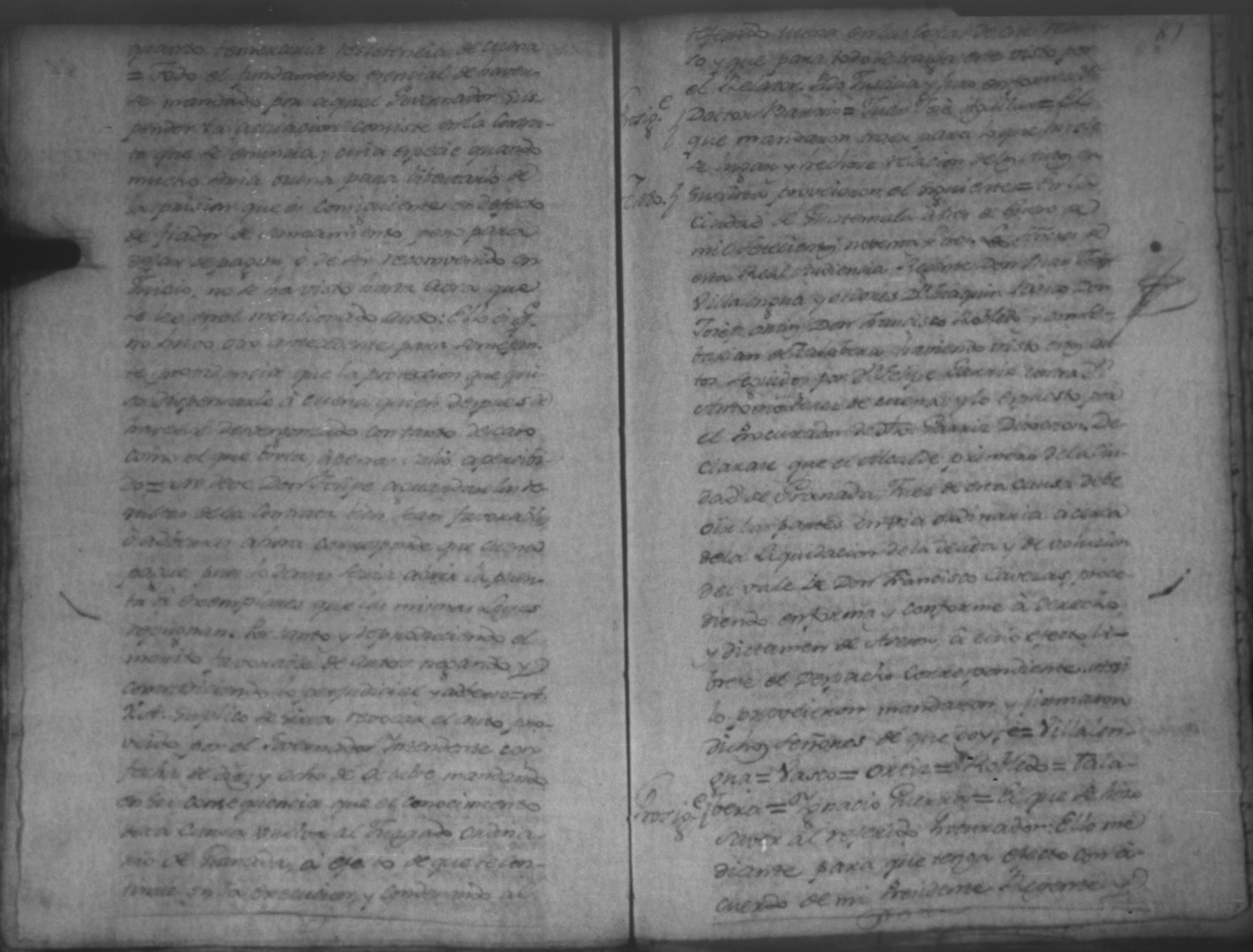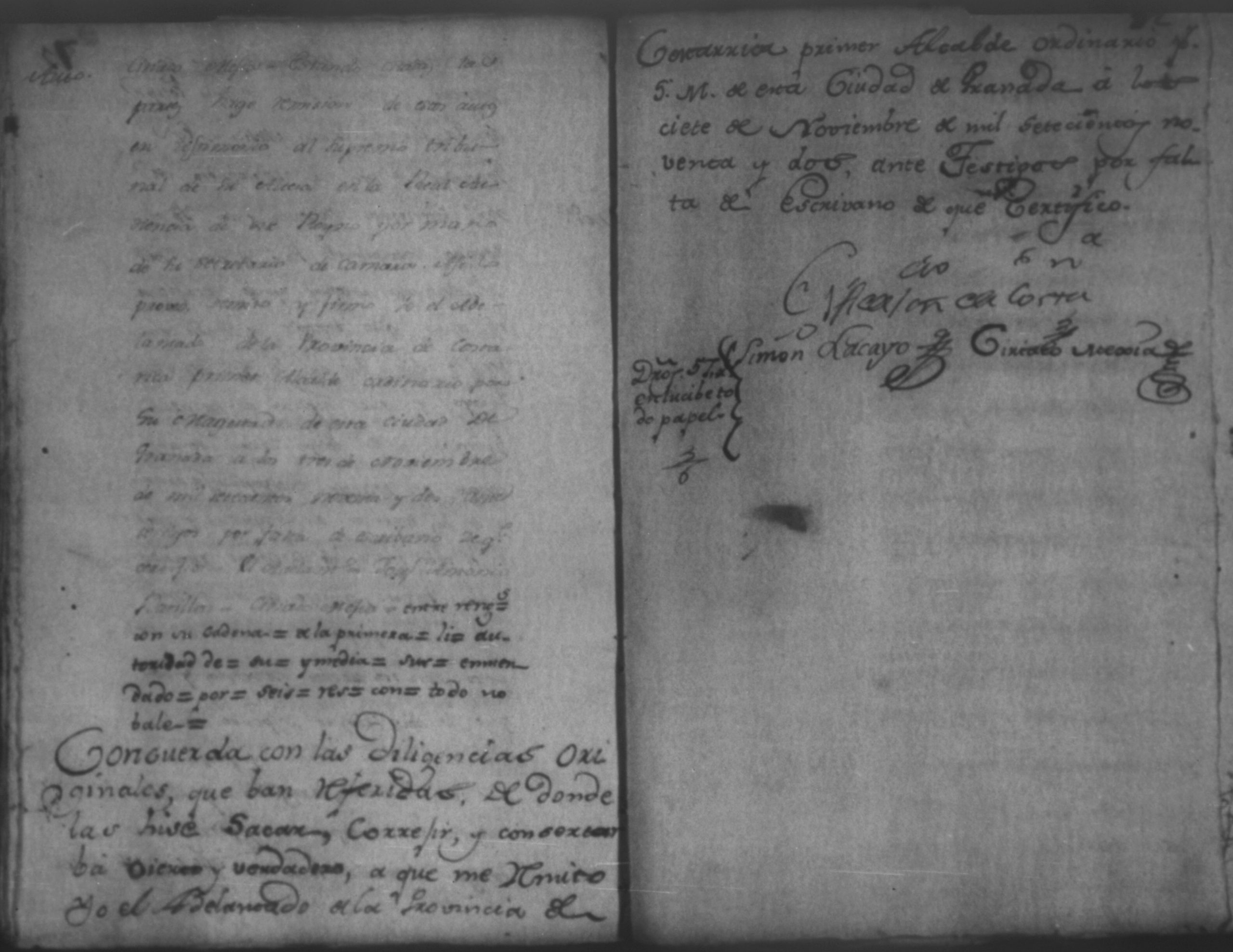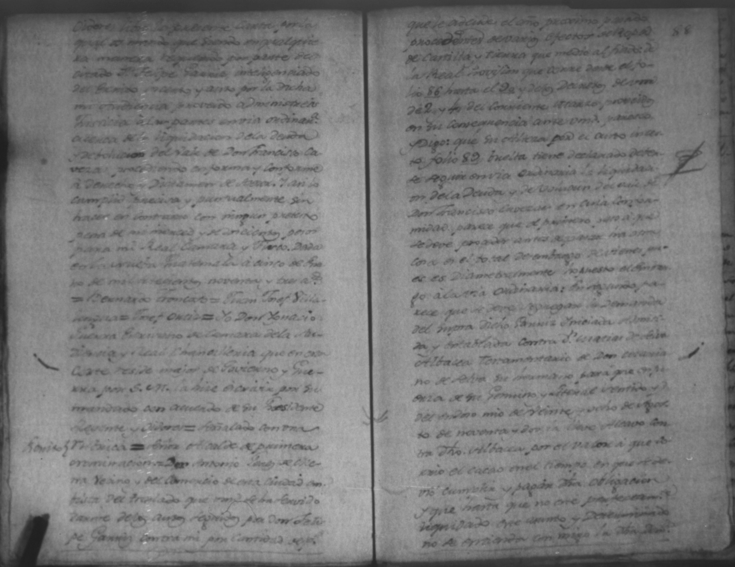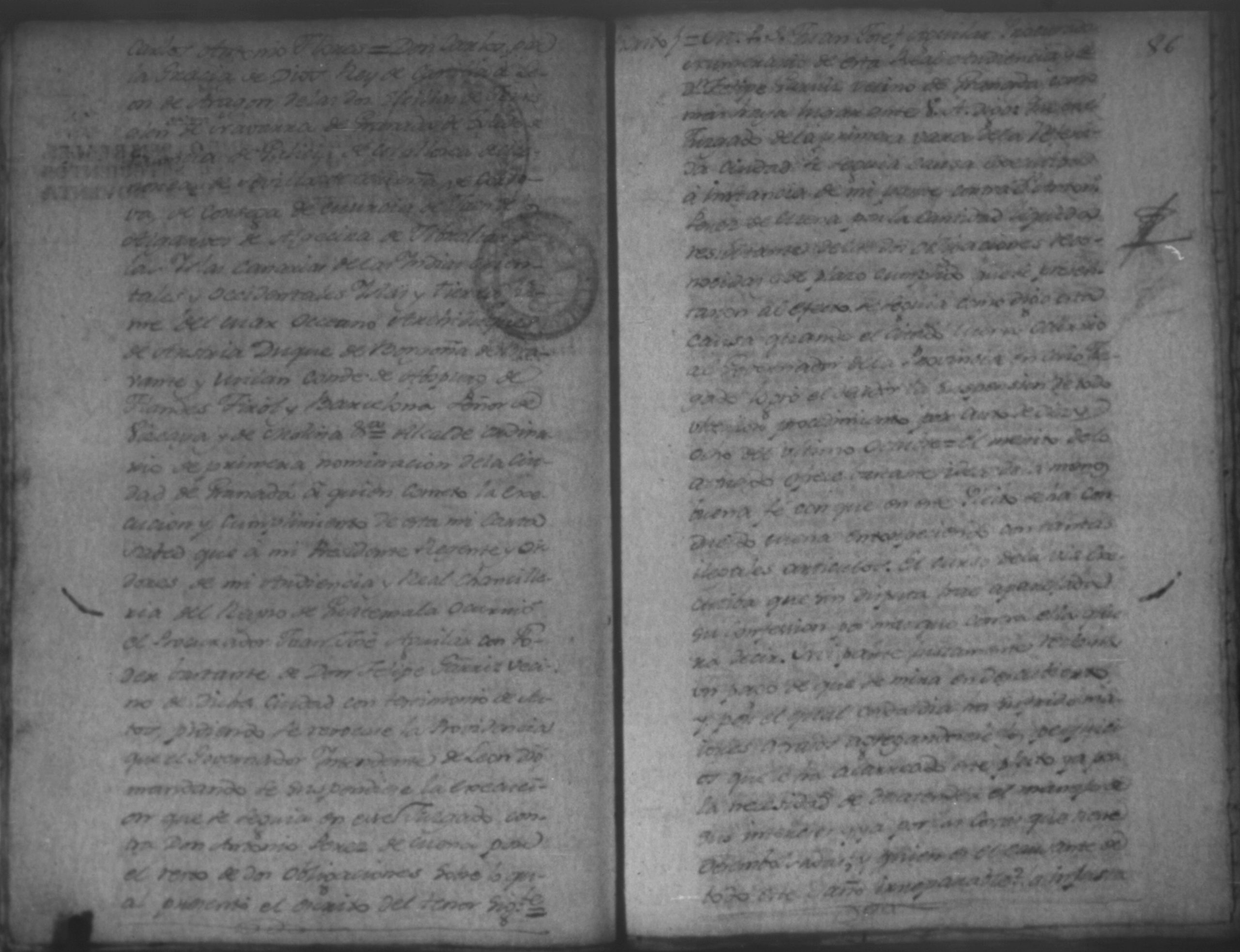 Temática: Audiencia León, 1793. Quaderno No. 2°. De los Autos que sigue don Felipe Garriz con don Antonio Mena, por cantidad de pesos. "[...] Pedido. Don Felipe de Garri del comercio de esta Provincia como mas haya lugar y en debida forma ante Vuestro Señor paresco y digo: Que hago presentacion de dos obligaciones otorgadas ambas á catorse de enero de esta año la primera de setecientos quarenta y tres pesos siete reales y la segunda de ochocientos quarenta y ochos pesos quatro reales por Don Antonio Perez Mena del comercio de esta ciudad... [por] Genero de ropa que tomó de mi tienda para el suministro de la suya, la primera cumplida ya en su plazo por Abril, y la segunda por maio de este mismo año y respecto á estas de Plazo vencido dichas obligaciones, á Vuestro Señor pido y suplico que haciendome por presentado con las referidas dos obligaciones reconocida la firma por Don Antonio Perez Mena se sirva mandar á este que dentro de tercero dia pague y satisfaga con el apercivimiento de la via efectiva, protestando como protesto [...]". (Extracto de los folios 1v. y 2)