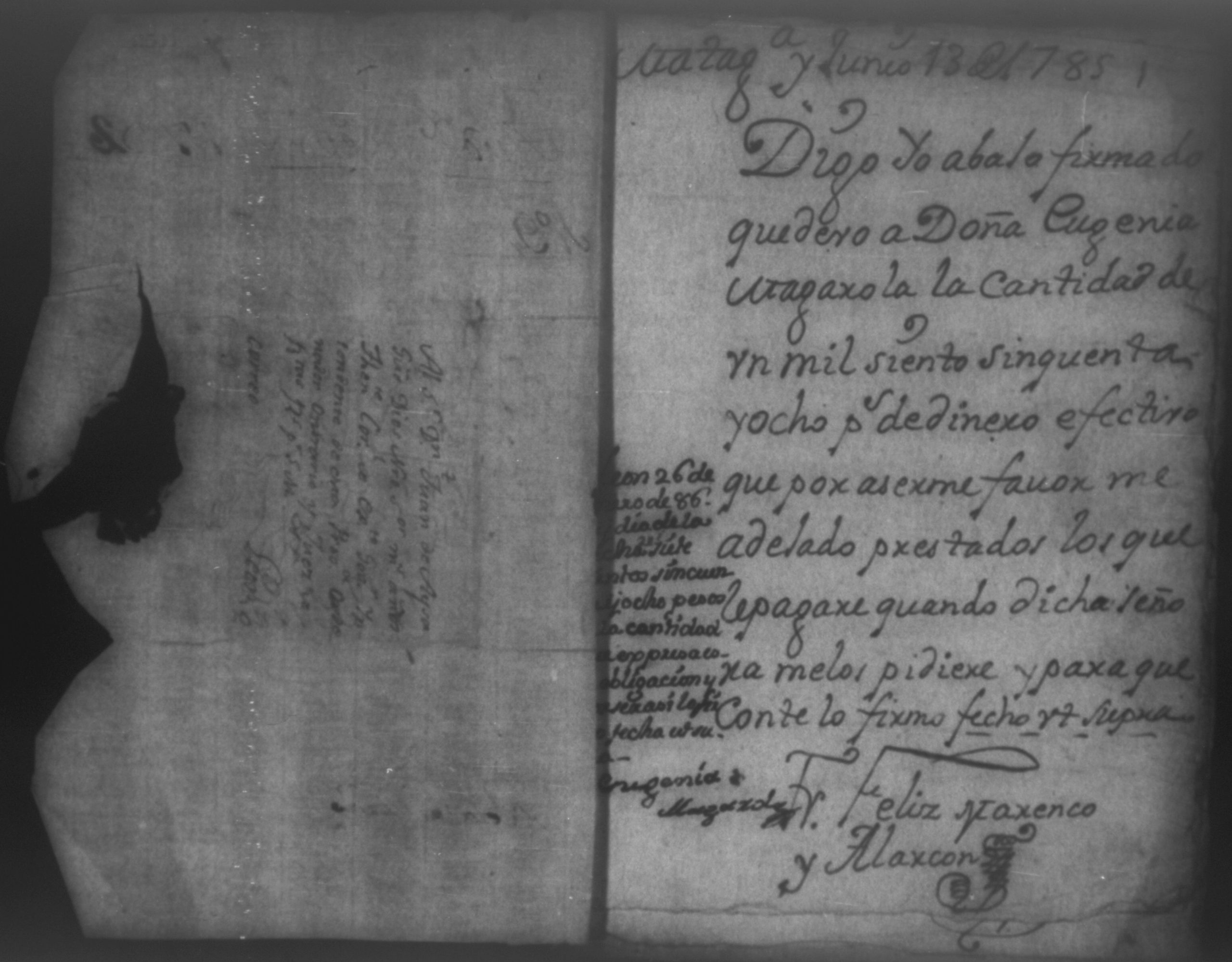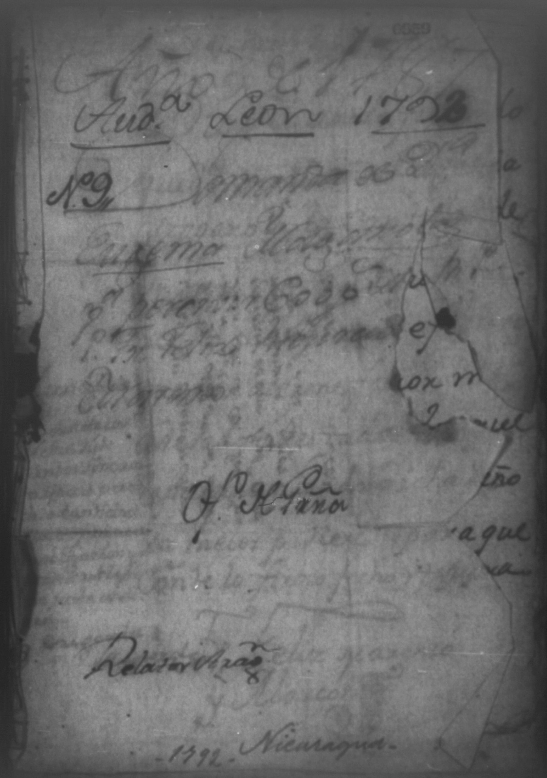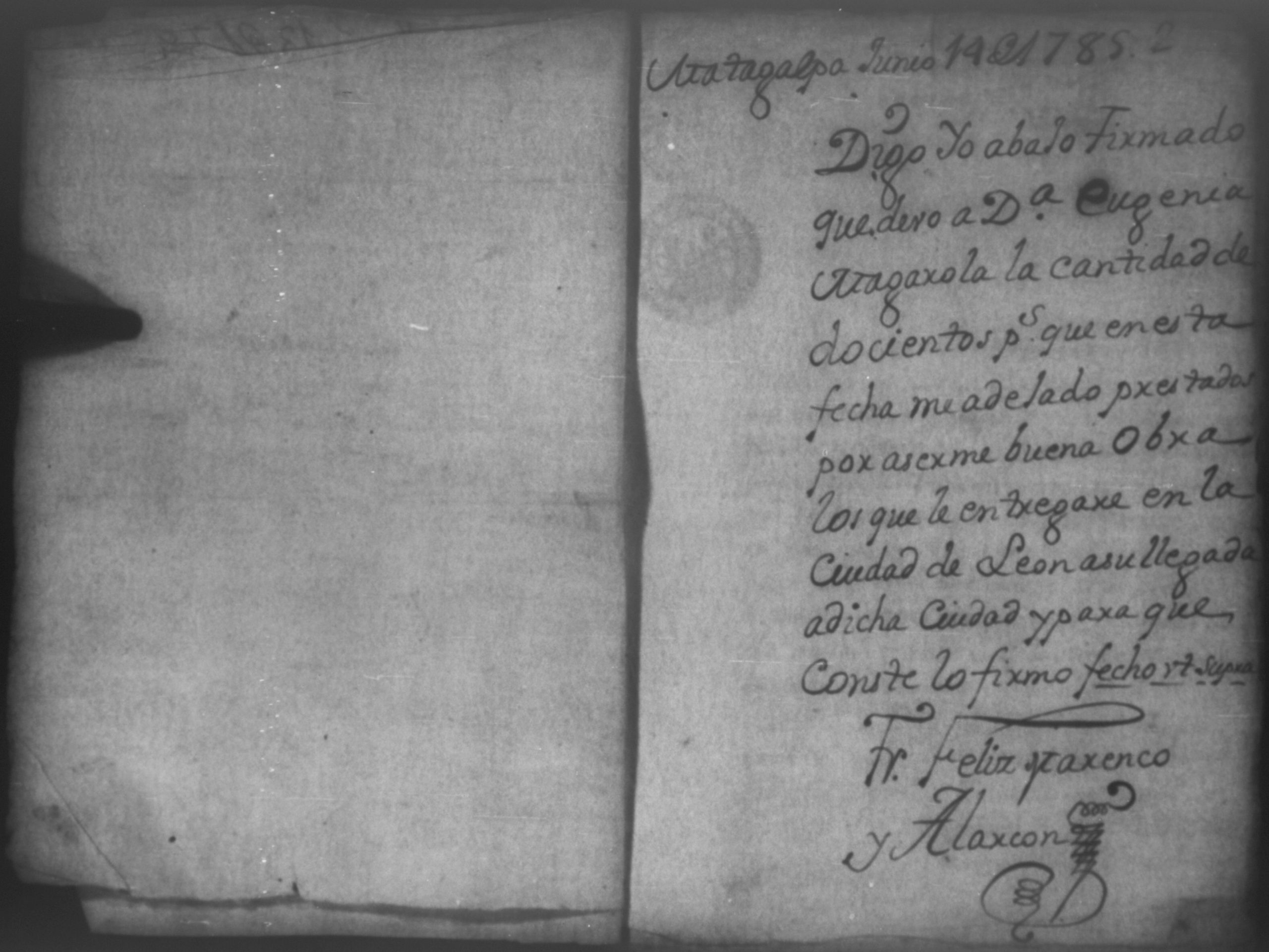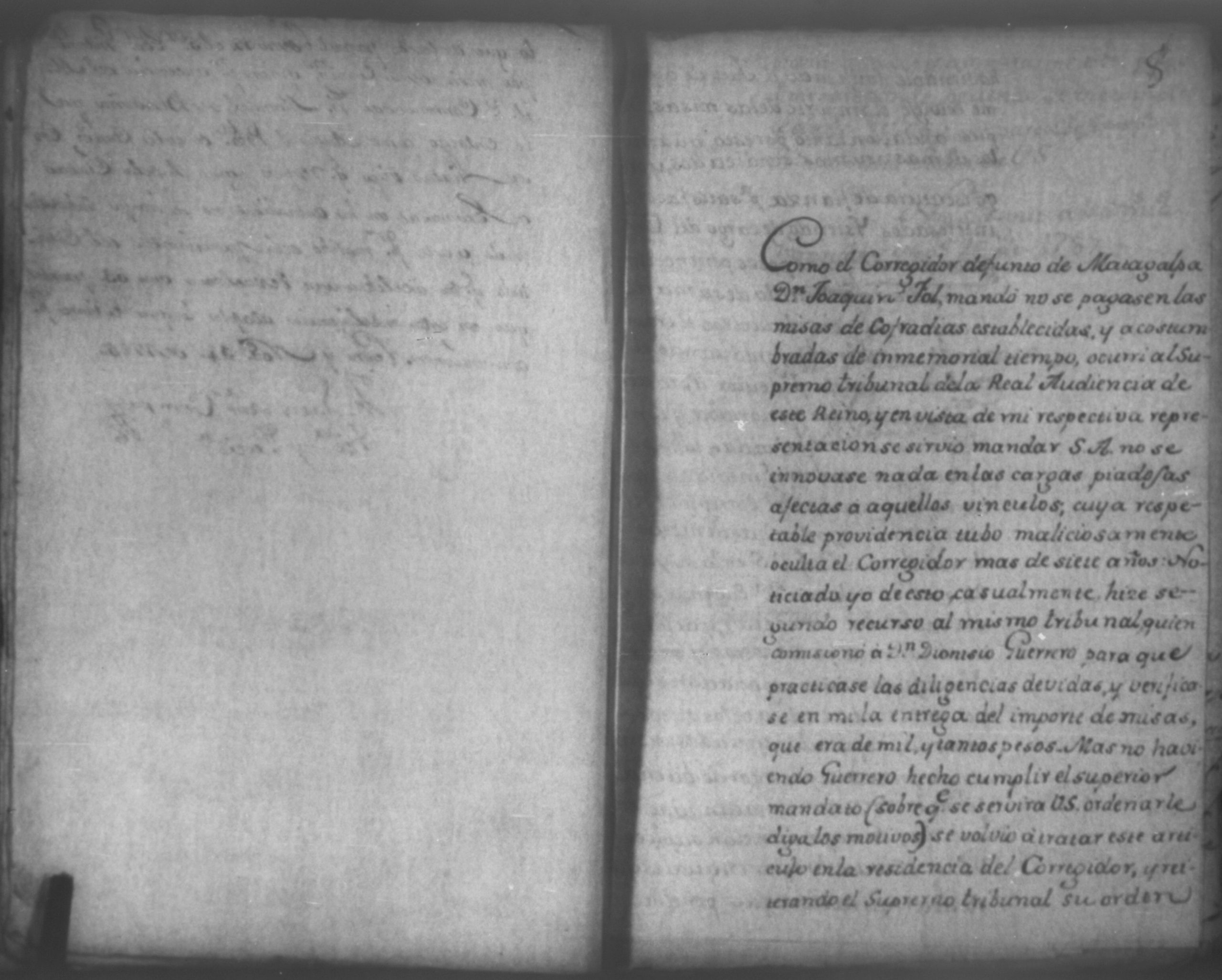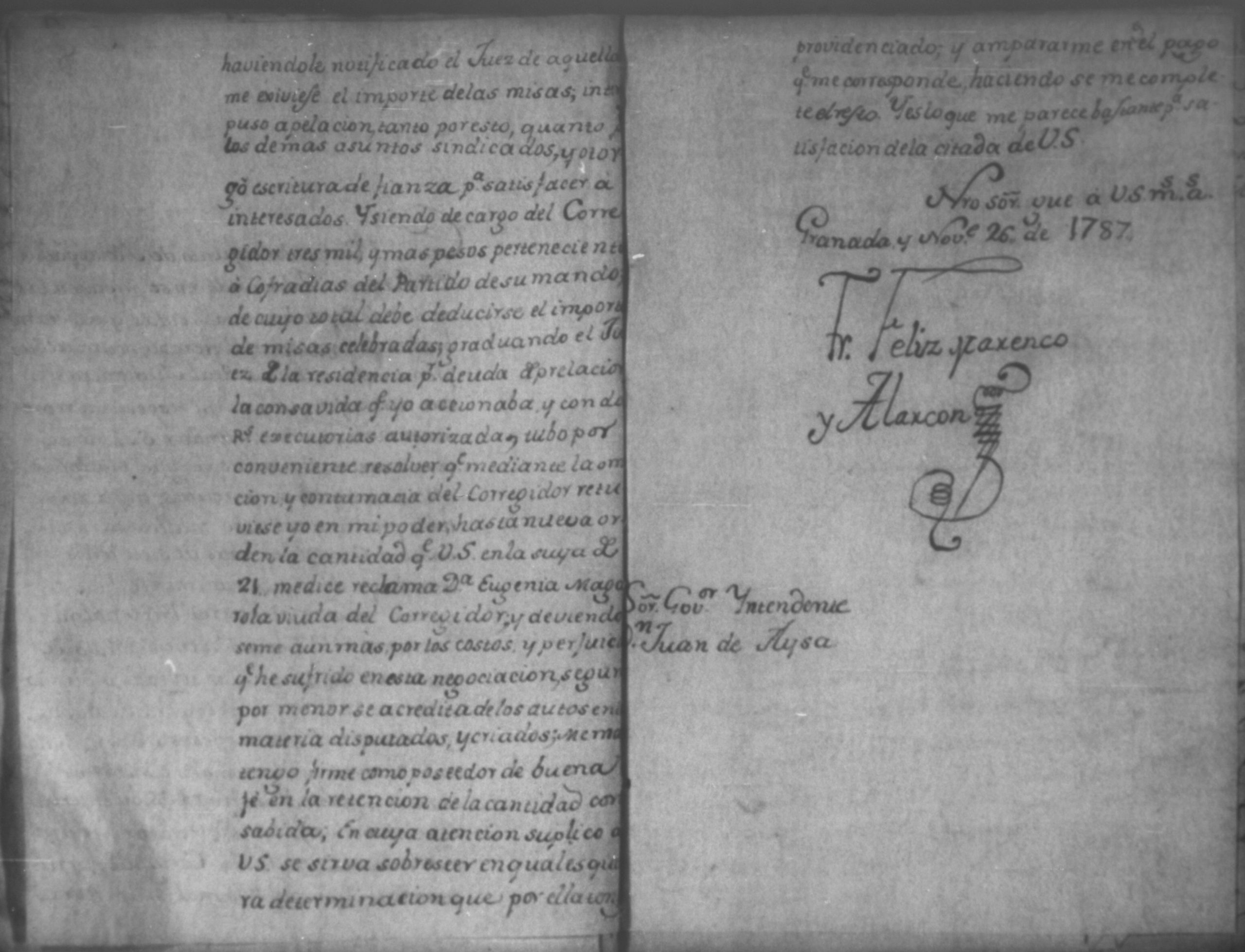 Temática: León, 1792. Demanda de doña Eugenia Magarola contra el Fray Feliz Narenco Alarcón, por la cantidad de 1158 pesos que le debe. El expediente contiene una reclamación del fray Narenco y Alarcón sobre el impago de misas de cofradía por parte del corregidor de Matagalpa, por ello, el fray justifica que debe ese dinero que reclama la señora Magarola. "Como el Corregidor defunto de Matagalpa Don Joaquin Fol, mandó no se pagasen las misas de Cofradias establecidas, y acostumbradas de inmemorial tiempo, ocurri al Supremo tribunal de la Real Audiencia de este Reino, y en vista de mi respectiva representacion se sirvio mandar a Su Alteza no se innovase nada en las cargas piadosas afectas a aquellaos vinculos, cuya respetable providencia tubo maliciosamente oculta el Corregidor mas de siete años: Noticiado yo de esto casualmente hize segundo recurso al mismo tribunal, quien comisionó a Don Dionisio Guerrero para que practicase las diligencias devidas, y verificase en mi la entrega del importe de misas, que era de mil, y tantos pesos. Mas no haviendo Guerrero hecho cumplir el superior mandato (sobre que se servira usted ordenarle diga los motivos) se volvio á tratar este articulo en la residencia del Corregidor, y reiterando el Supremo tribunal su orden haviendole notificado el Juez de aquiella me exiviese el importe de las misas, interpuso apelacion, tanto por esto, quanto por los demas asuntos sindicados, y otorgó escritura de la fianza para satisfacer a interesados. Y siendo de cargo del Corregidor tres mil y mas pesos pertenecientes á Cofradias del Partido de su mando: de cuyo total debe deducirse el importe de misas celebradas; graduando el Juez de la residencia por deuda de prelacion la consavida que yo accionaba [...]" (Extracto de los folios 8 y 8v.)