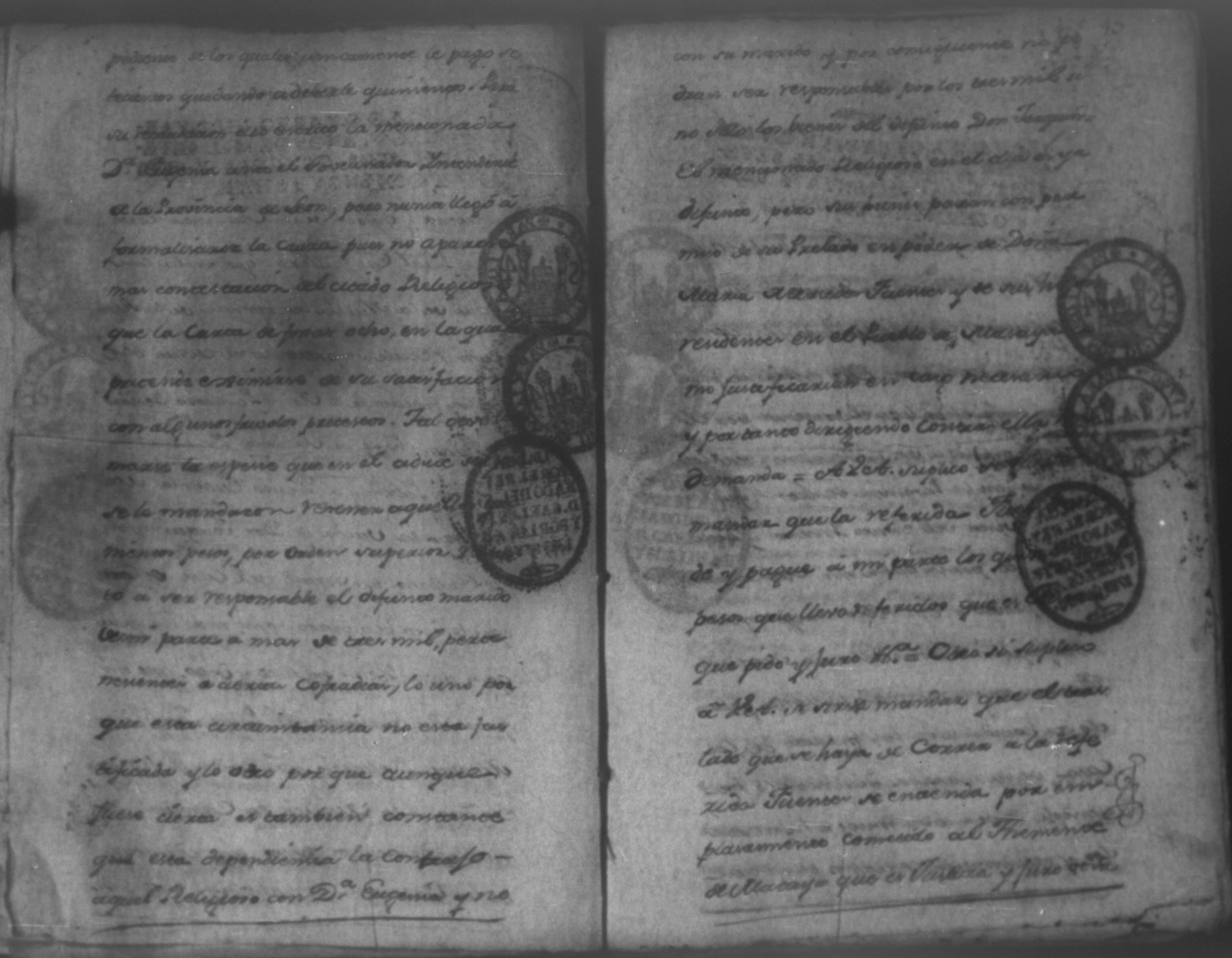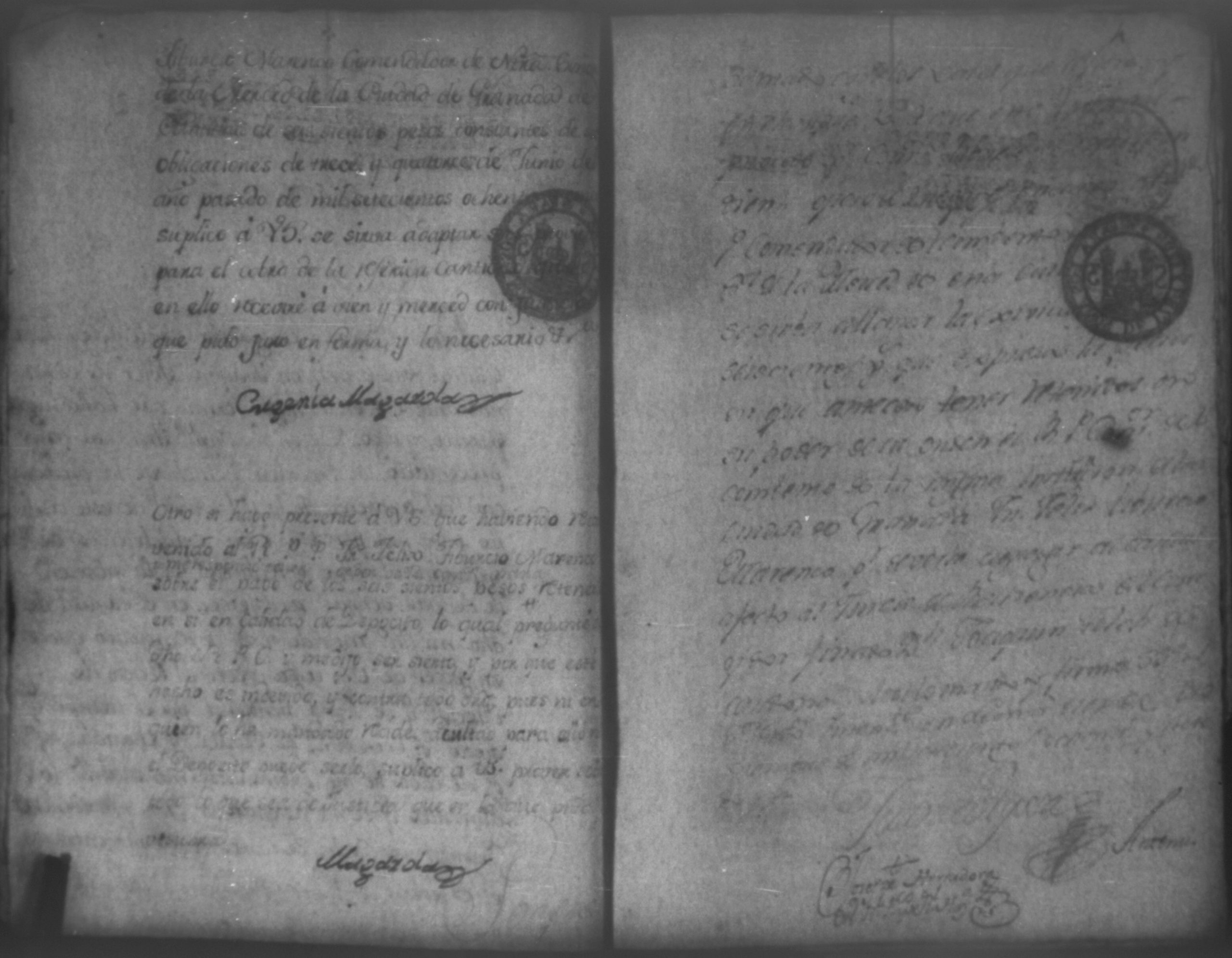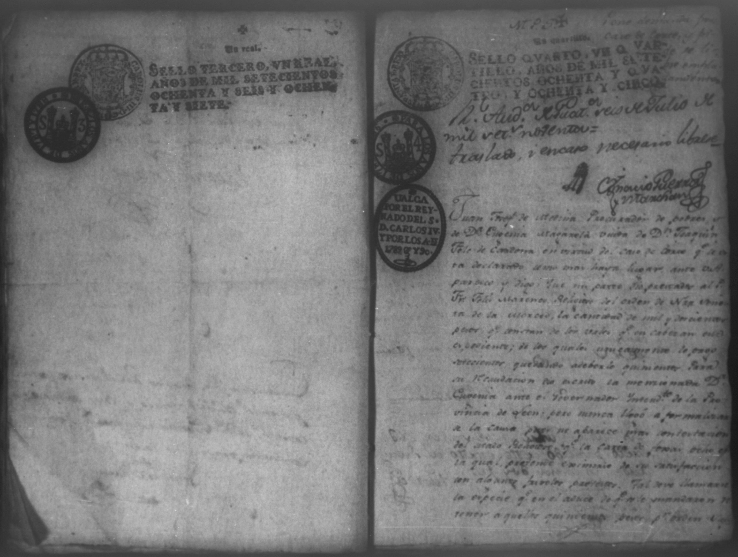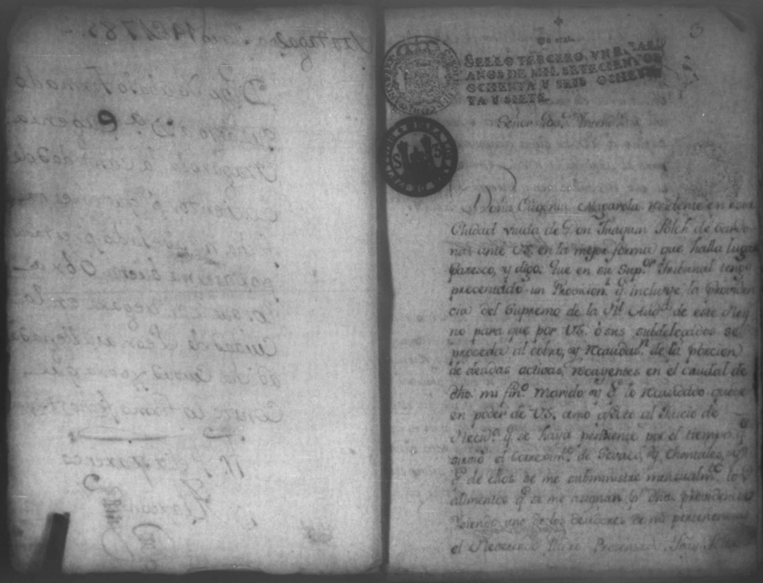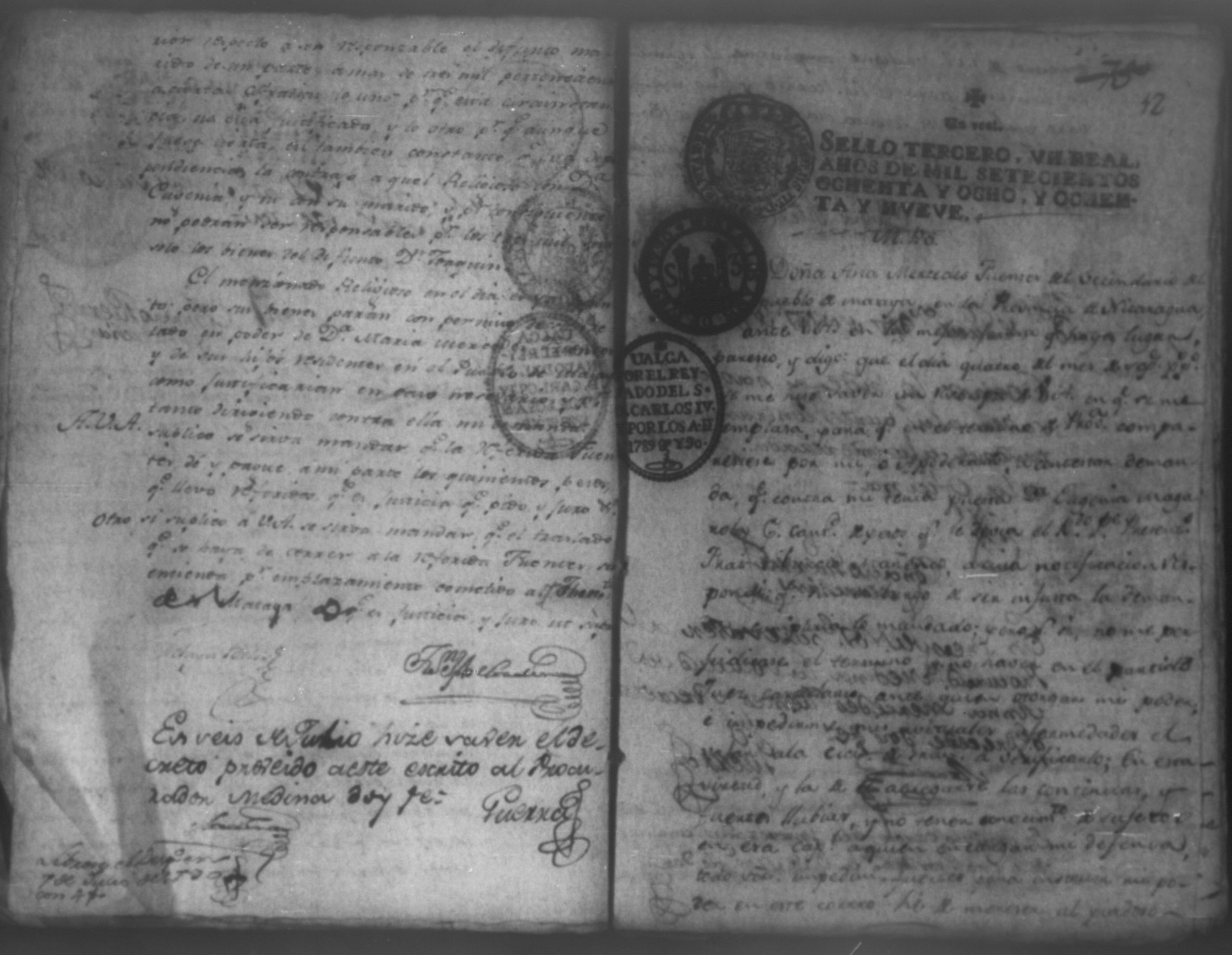 Temática: León, 1792. Demanda de doña Eugenia Magarola contra el Fray Feliz Narenco Alarcón, por la cantidad de 1158 pesos que le debe. El expediente contiene una reclamación del fray Narenco y Alarcón sobre el impago de misas de cofradía por parte del corregidor de Matagalpa, por ello, el fray justifica que debe ese dinero que reclama la señora Magarola. "Como el Corregidor defunto de Matagalpa Don Joaquin Fol, mandó no se pagasen las misas de Cofradias establecidas, y acostumbradas de inmemorial tiempo, ocurri al Supremo tribunal de la Real Audiencia de este Reino, y en vista de mi respectiva representacion se sirvio mandar a Su Alteza no se innovase nada en las cargas piadosas afectas a aquellaos vinculos, cuya respetable providencia tubo maliciosamente oculta el Corregidor mas de siete años: Noticiado yo de esto casualmente hize segundo recurso al mismo tribunal, quien comisionó a Don Dionisio Guerrero para que practicase las diligencias devidas, y verificase en mi la entrega del importe de misas, que era de mil, y tantos pesos. Mas no haviendo Guerrero hecho cumplir el superior mandato (sobre que se servira usted ordenarle diga los motivos) se volvio á tratar este articulo en la residencia del Corregidor, y reiterando el Supremo tribunal su orden haviendole notificado el Juez de aquiella me exiviese el importe de las misas, interpuso apelacion, tanto por esto, quanto por los demas asuntos sindicados, y otorgó escritura de la fianza para satisfacer a interesados. Y siendo de cargo del Corregidor tres mil y mas pesos pertenecientes á Cofradias del Partido de su mando: de cuyo total debe deducirse el importe de misas celebradas; graduando el Juez de la residencia por deuda de prelacion la consavida que yo accionaba [...]" (Extracto de los folios 8 y 8v.)