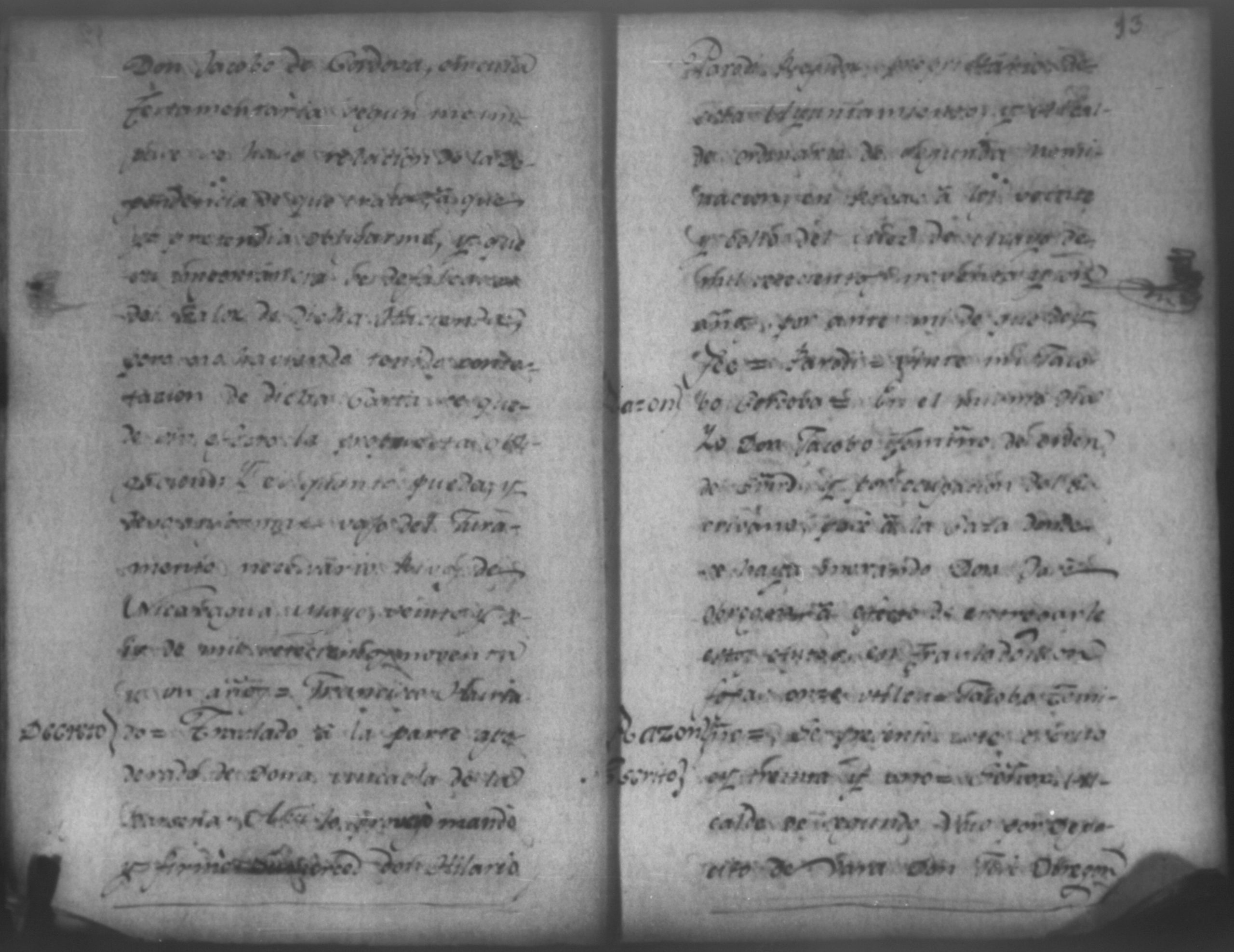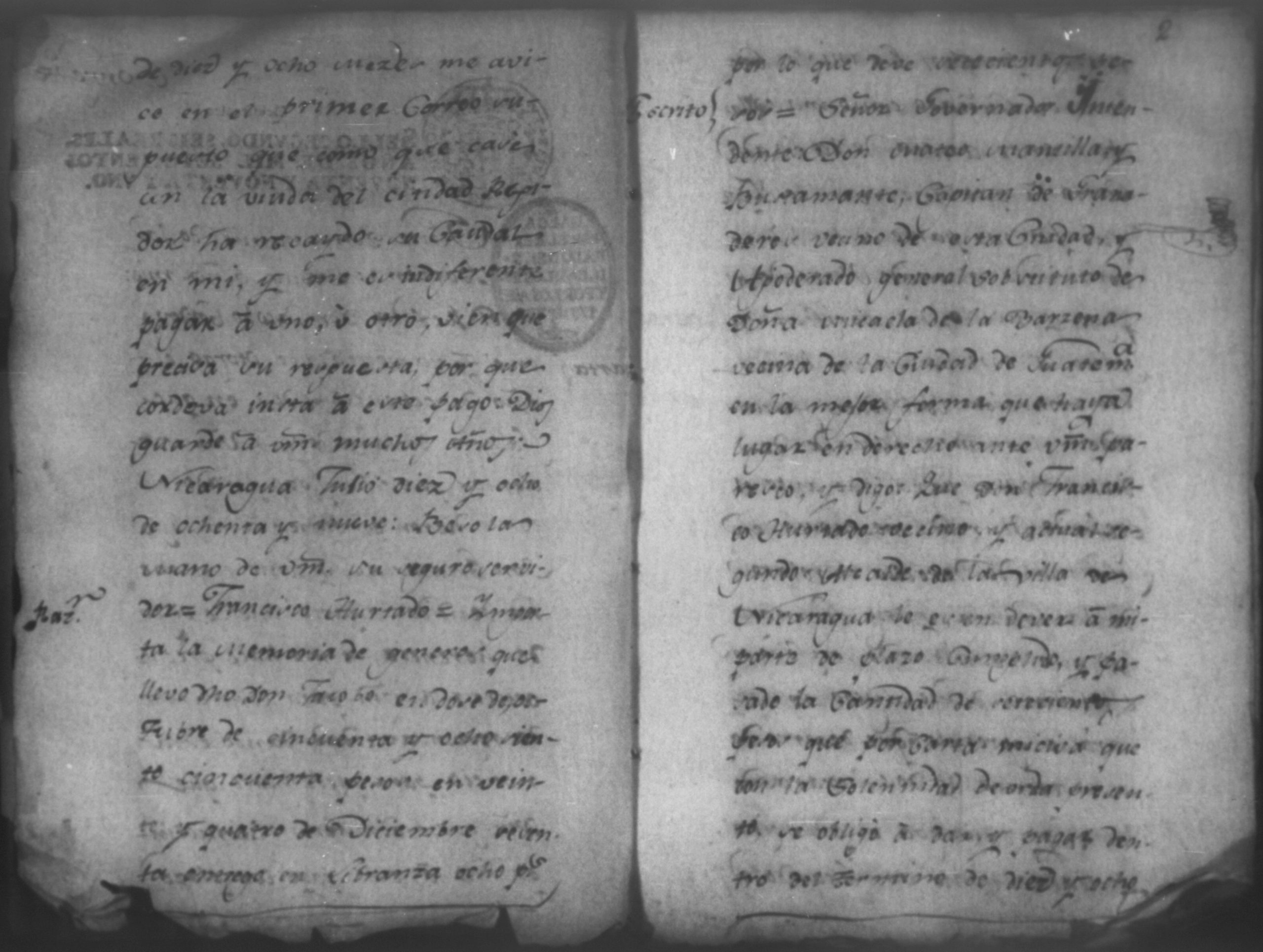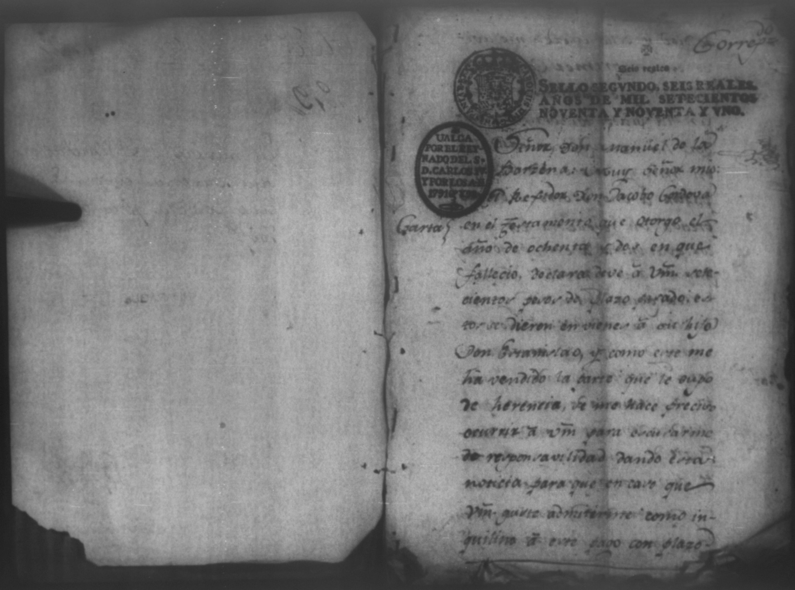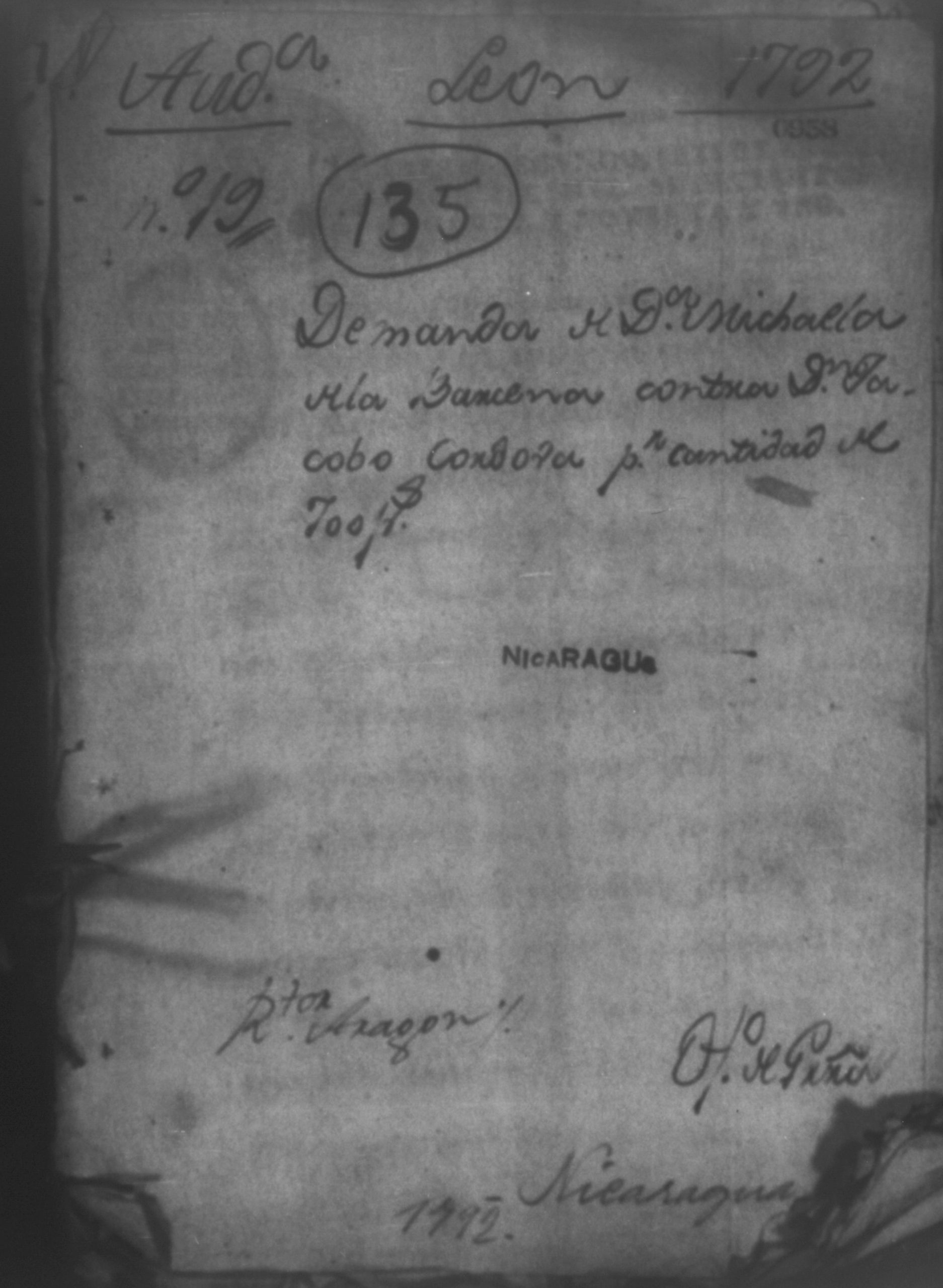 Temática: Audiencia de León, 1792. Demanda de Doña Michaela de la Barcena contra Don Jacobo Cordoba por cantidad de 700 pesos. "Señor Don Manuel de la Barzena: Muy Señor mio: El Rexidor Don Jacobo Cordoba en el Testamento que otorgo el año de ochenta y dos en que fallecio, declara deve á vuestra majestad setecientos pesos de plazo pasado; estos se dieron en vienes a su hijo Don Estanislao, y como este me ha vendido la parte que le supó de herencia, se me hace preciso ocurrir a vuestra majestad para escusarme de responsabilidad dando esta noticia para que en caso que vuestra majestad guste admitirme como inquilina á este pago con plazo de diez y ocho mezes me avice en el primer correo [...]" (Extracto de los folios 1 y 1v.)
